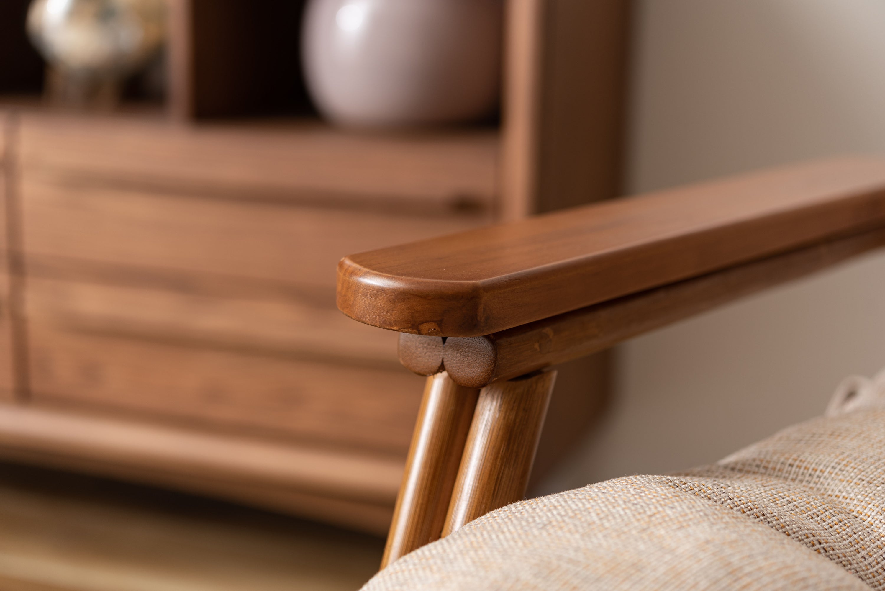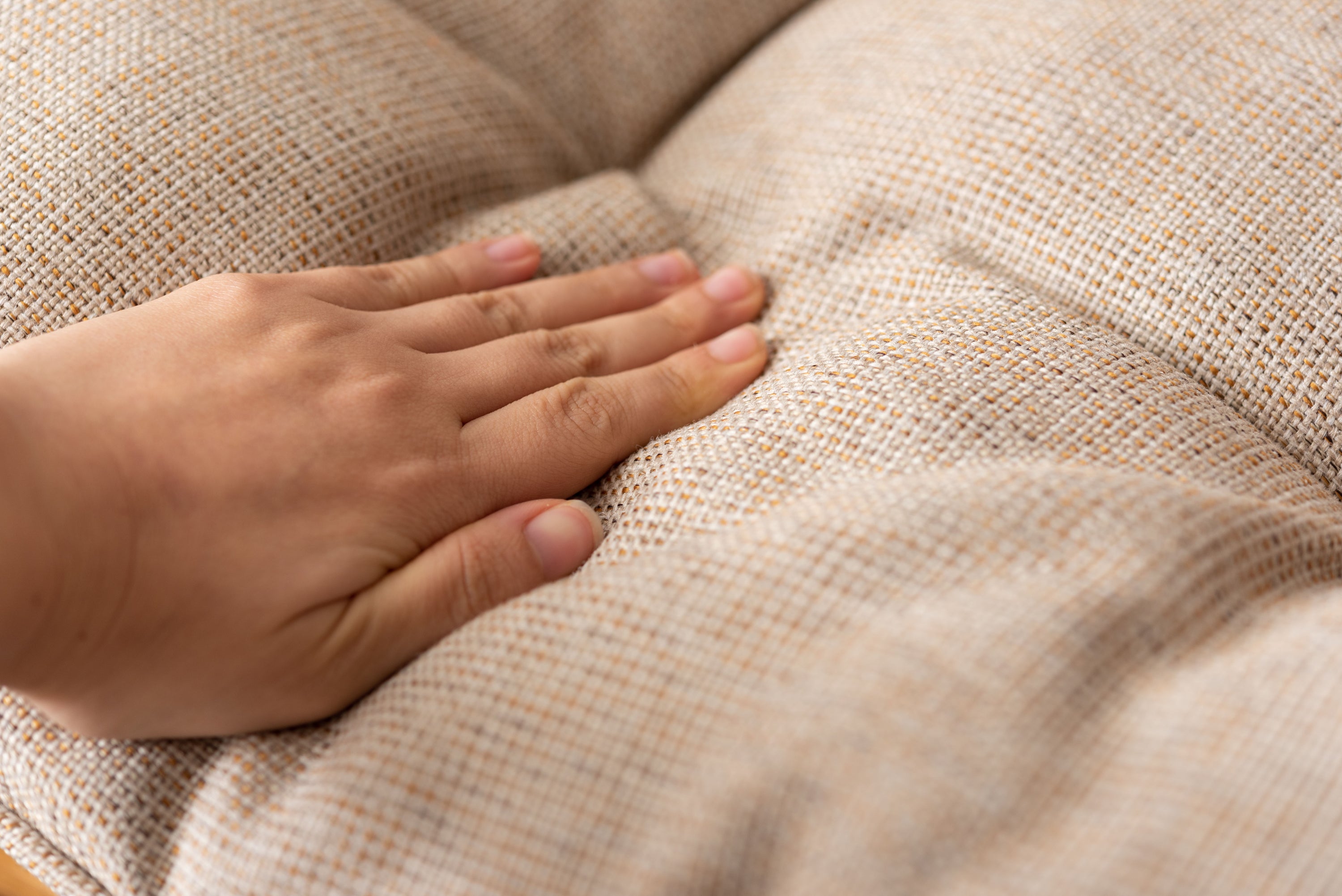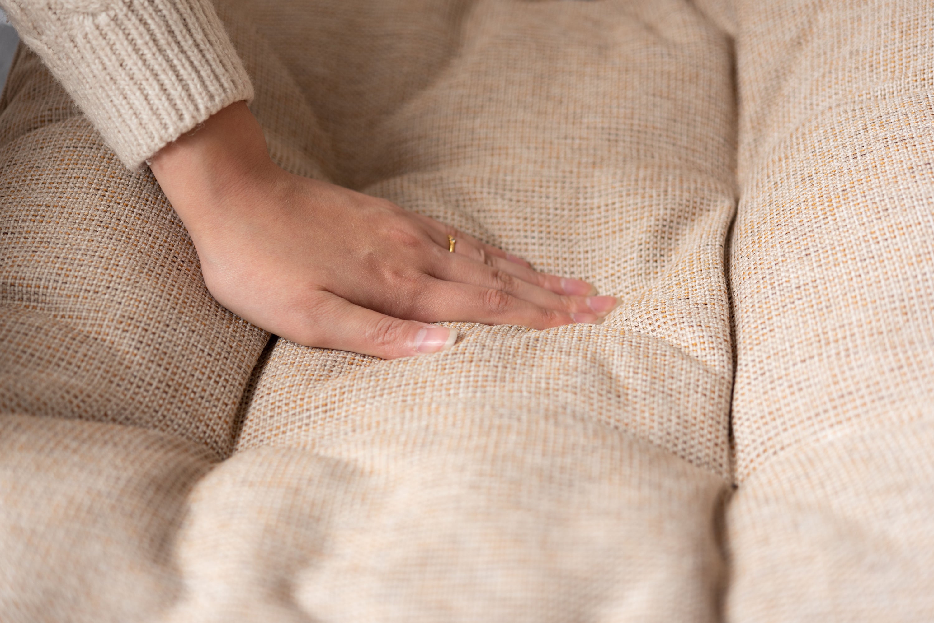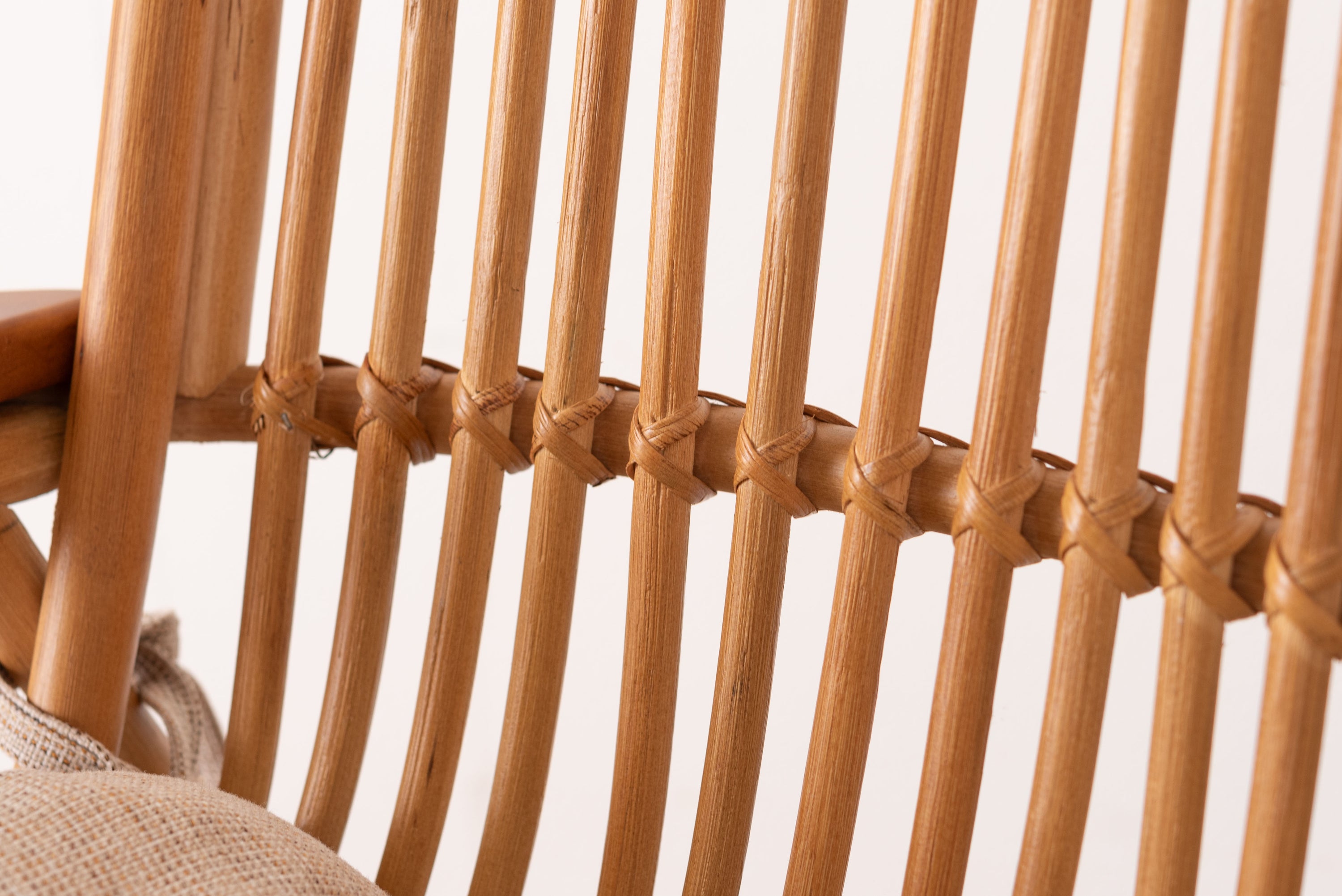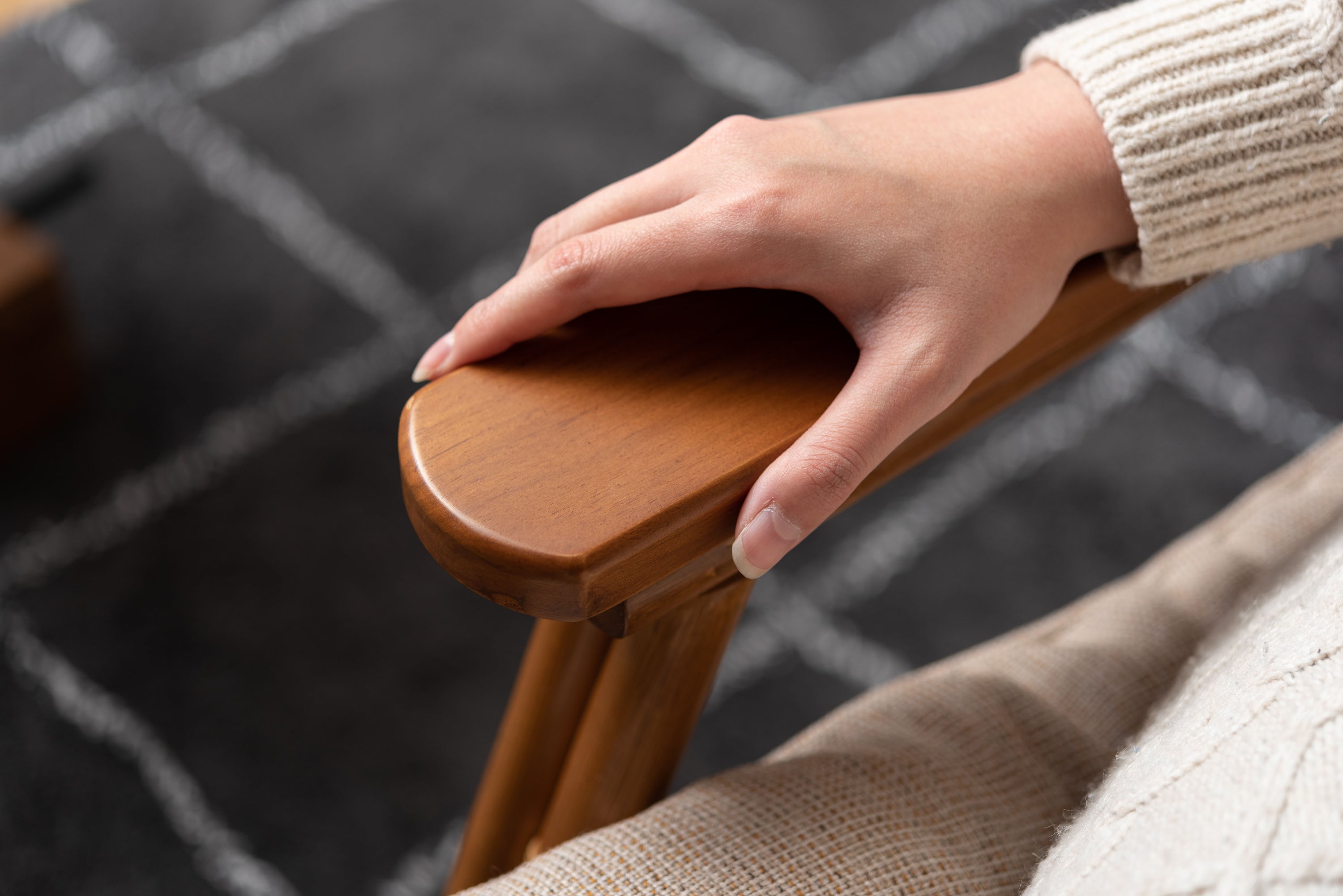 脚のカーブが美しい、天然木×ラタンのパーソナルチェア。ゆったりと座りやすい形状と、印象的なデザインが特徴です。肘掛けには天然木(チーク)を使用。天然木のぬくもりがしっかりと手に馴染みます。ラタン(籐)ならではの、しなやかで柔らかい曲線も魅力の一つです。背もたれには緩いカーブを掛けているので、ゆったりとくつろぐことができます。ほどよいクッション性のある座面クッションは取り外しが可能です。