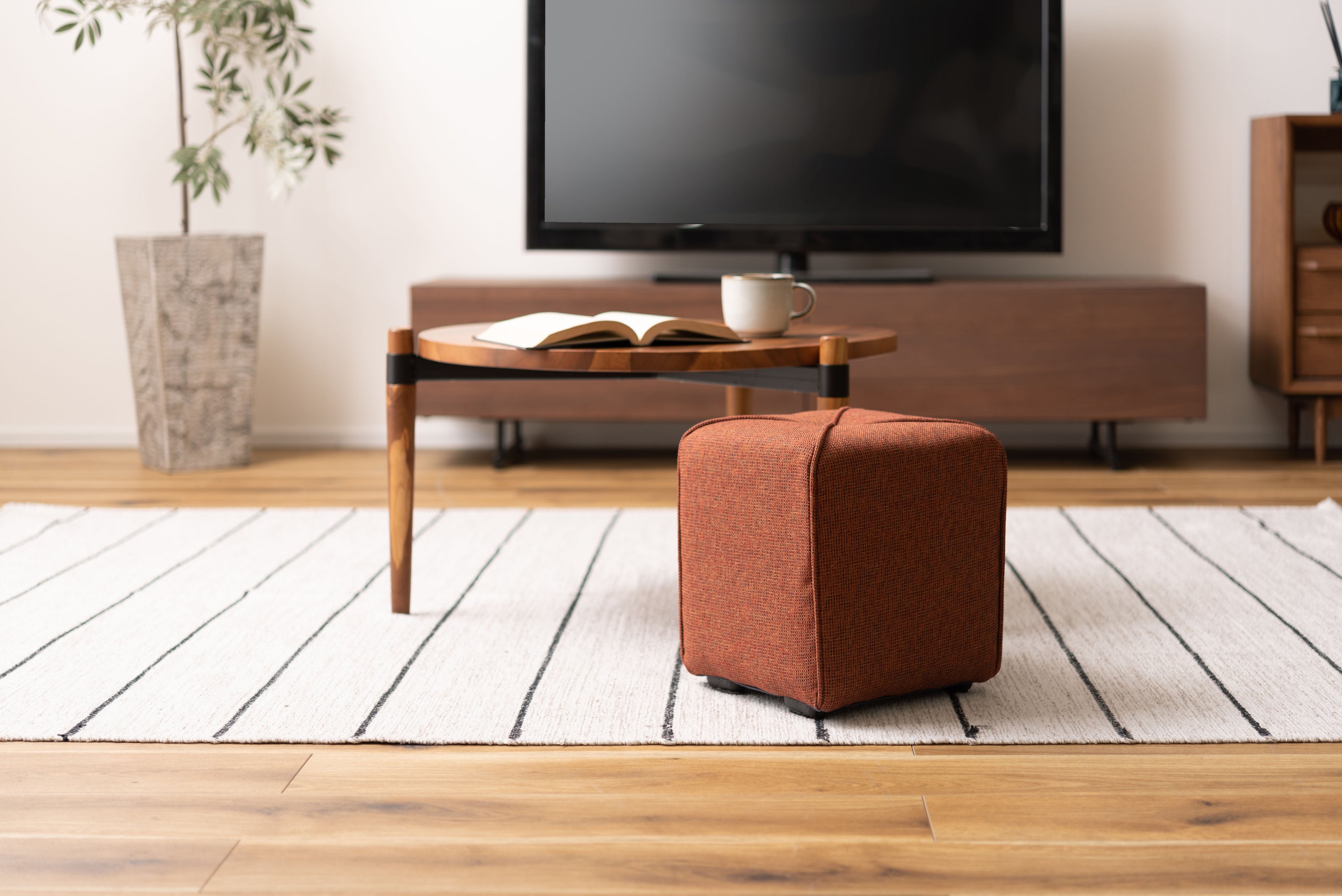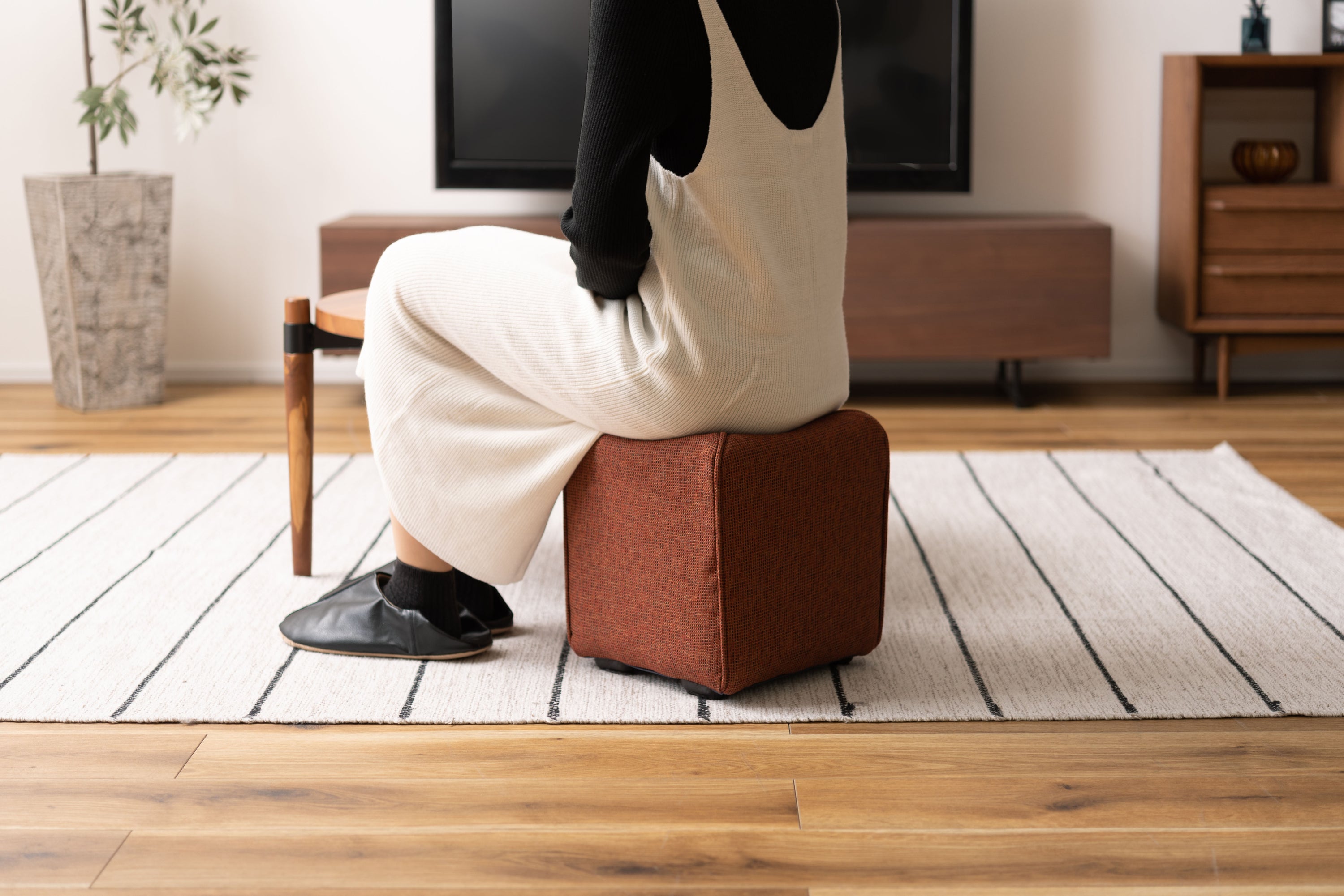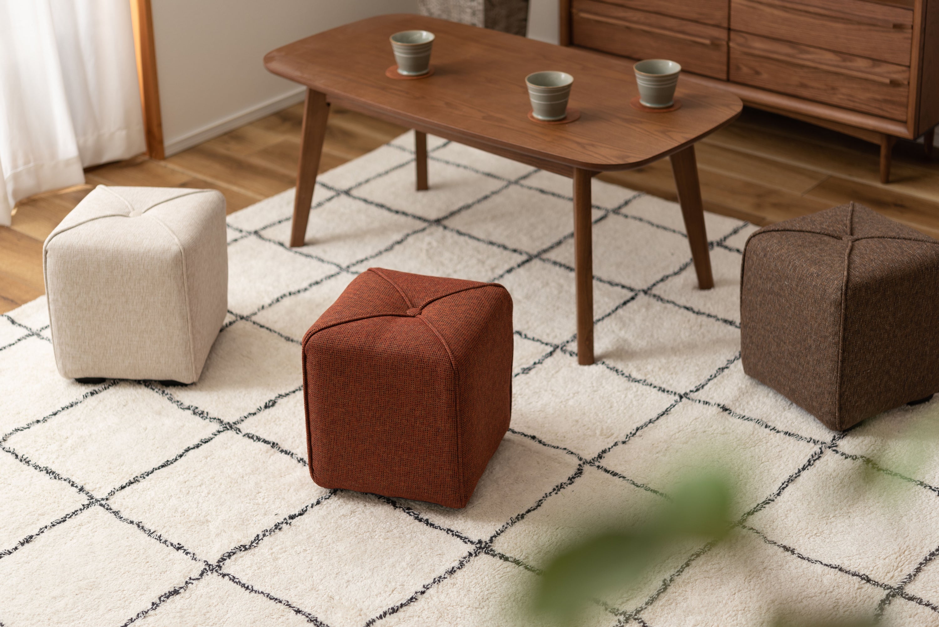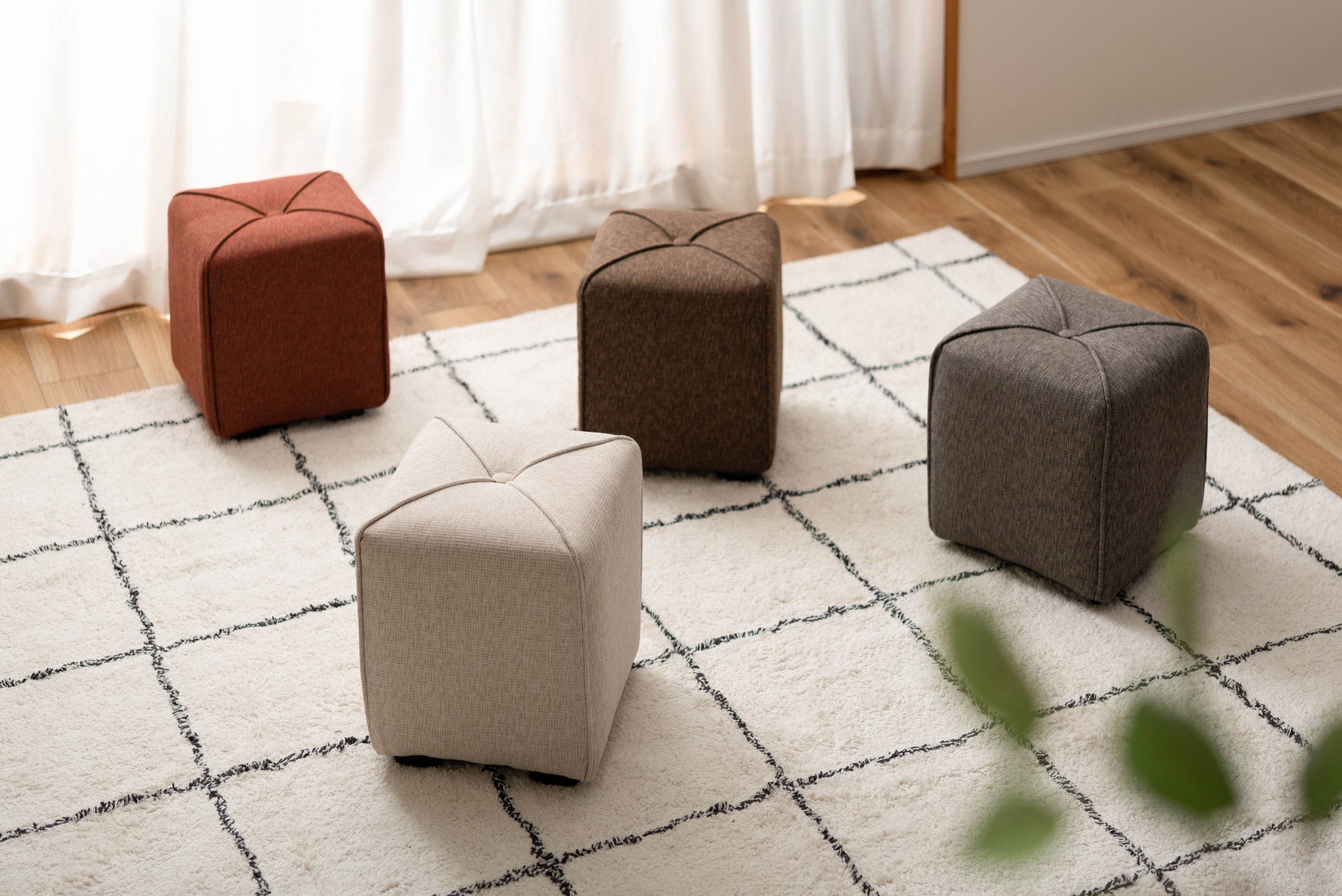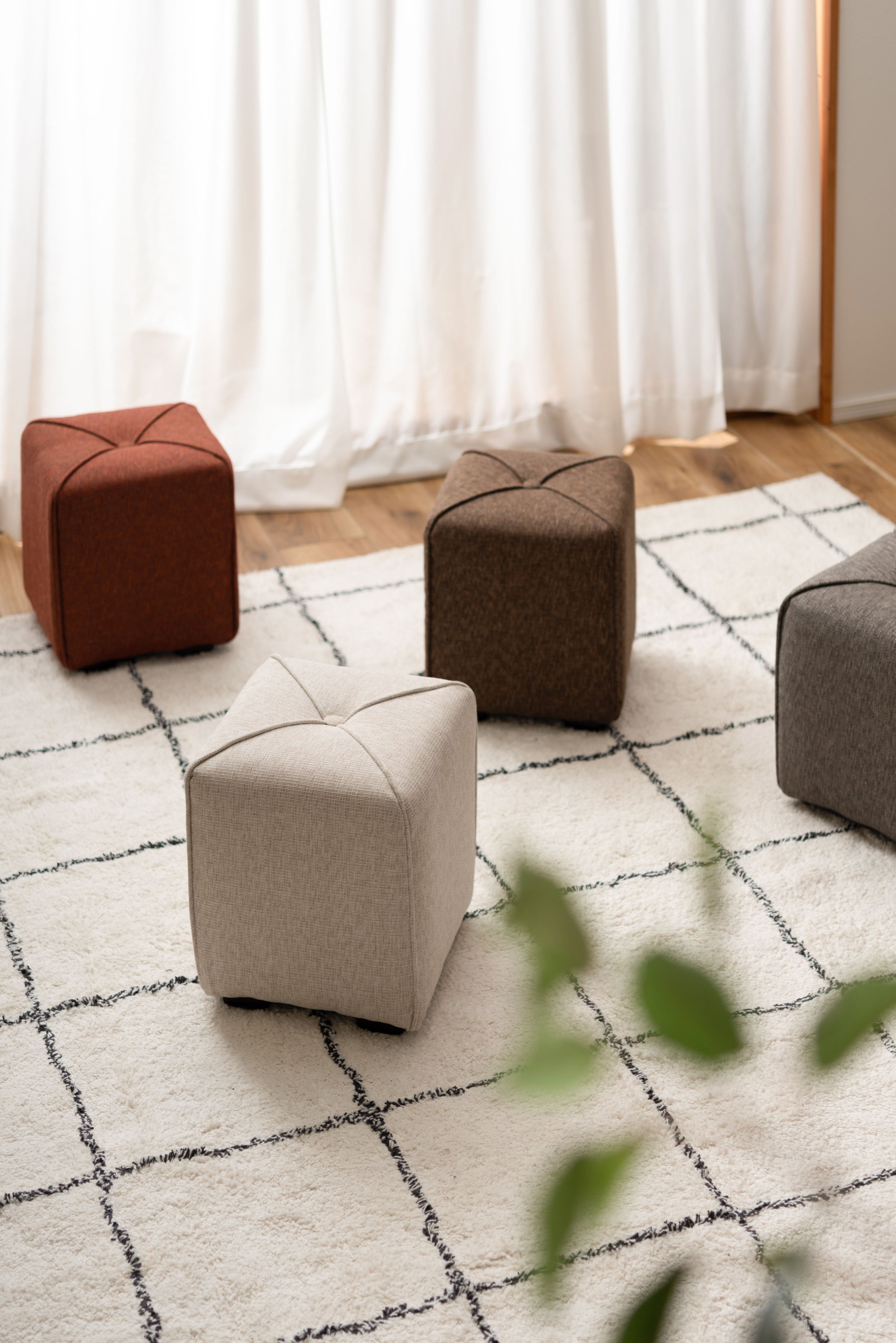 軽量で持ち運びカンタンなミニスツール。子供部屋や玄関など、お家のいろんな場所に馴染むサイズ。限られたスペースにも置ける使い勝手の良いスツール。ソファと合わせてオットマンとしても活躍。淡い色合いで優しい手触りのファブリックを使用。