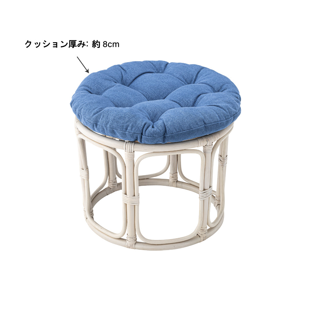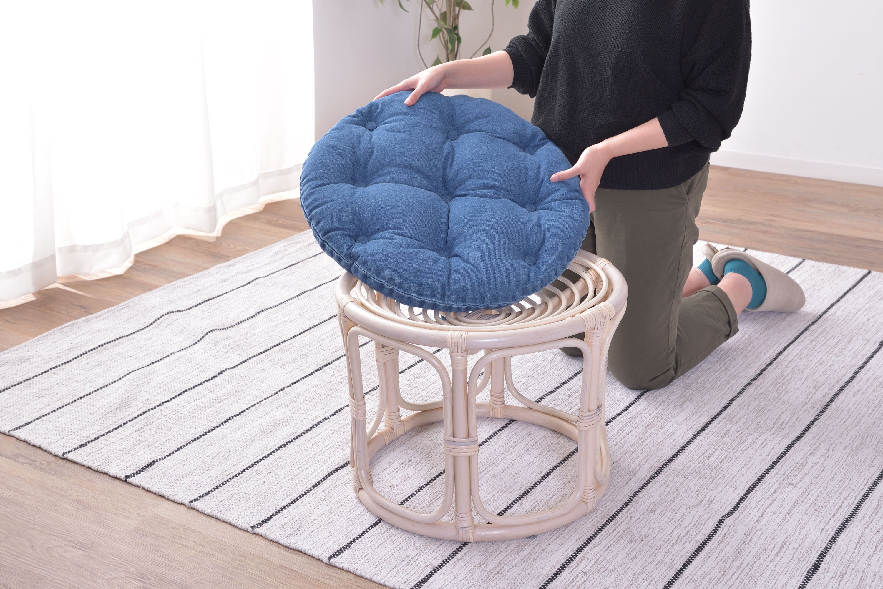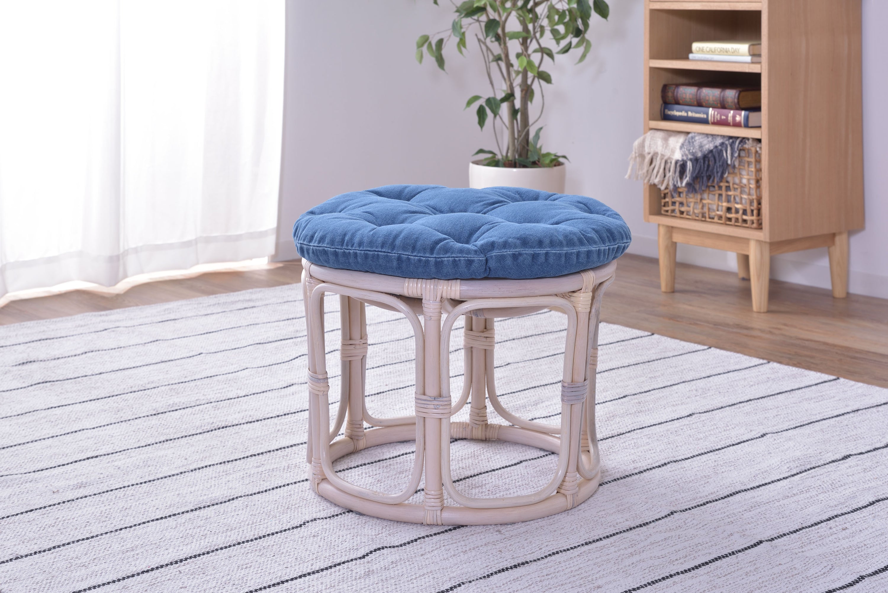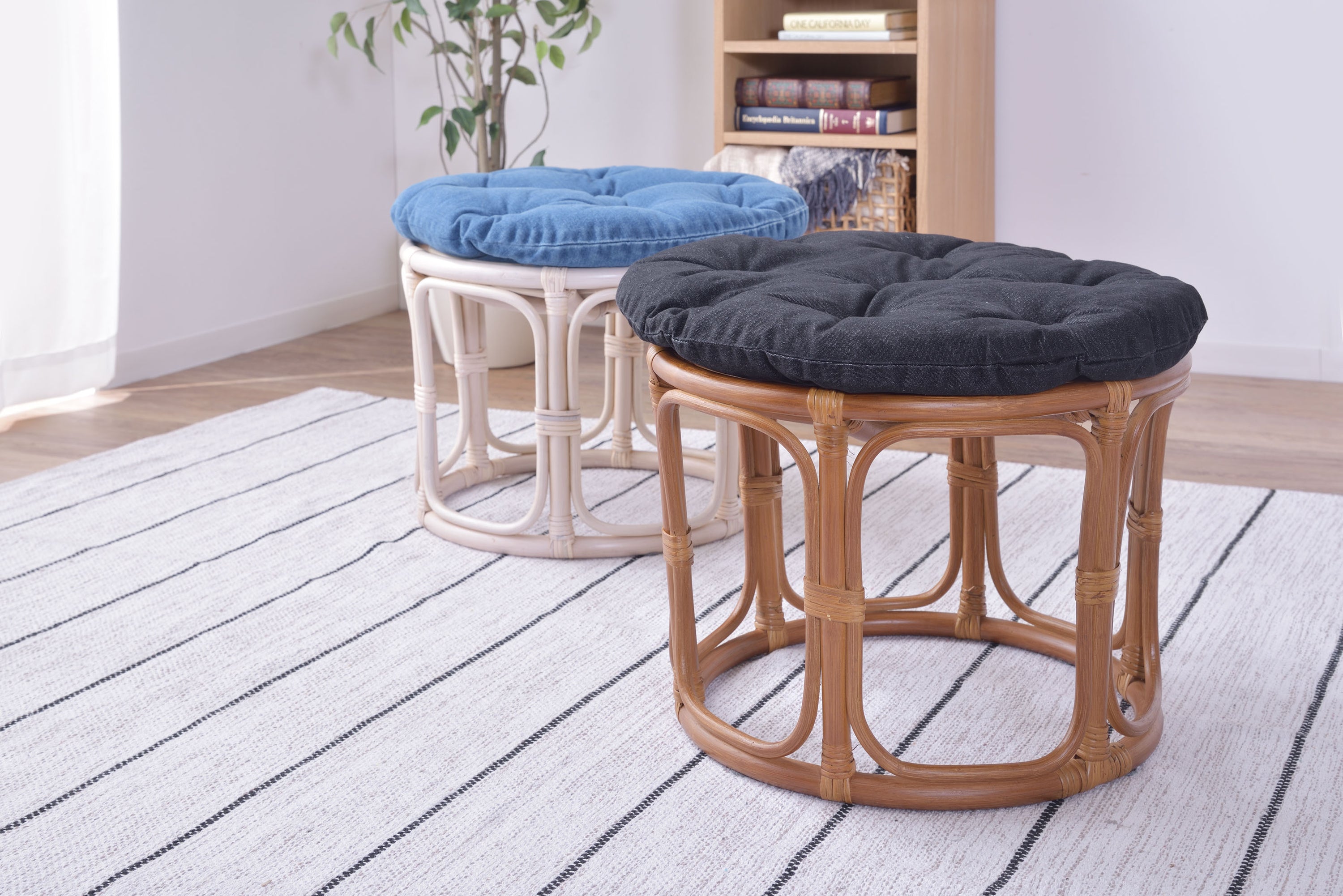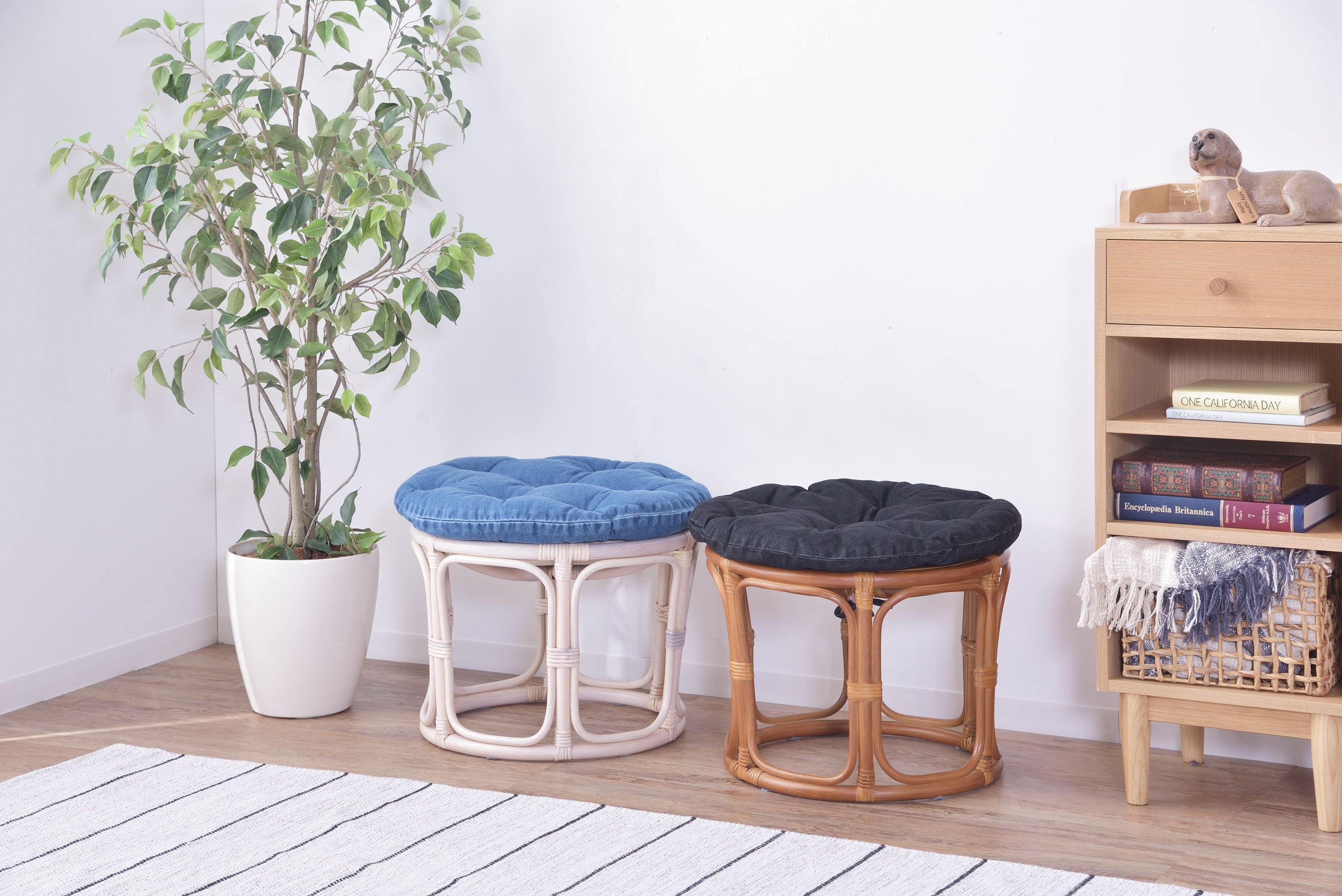 ラタンの脚とボリュームのあるクッションのマシュースツール。湾曲した底面が包み込むように支え、座り心地の良い設計です。コットンデニムとラタンの組み合わせは雰囲気のある空間を演出します。
