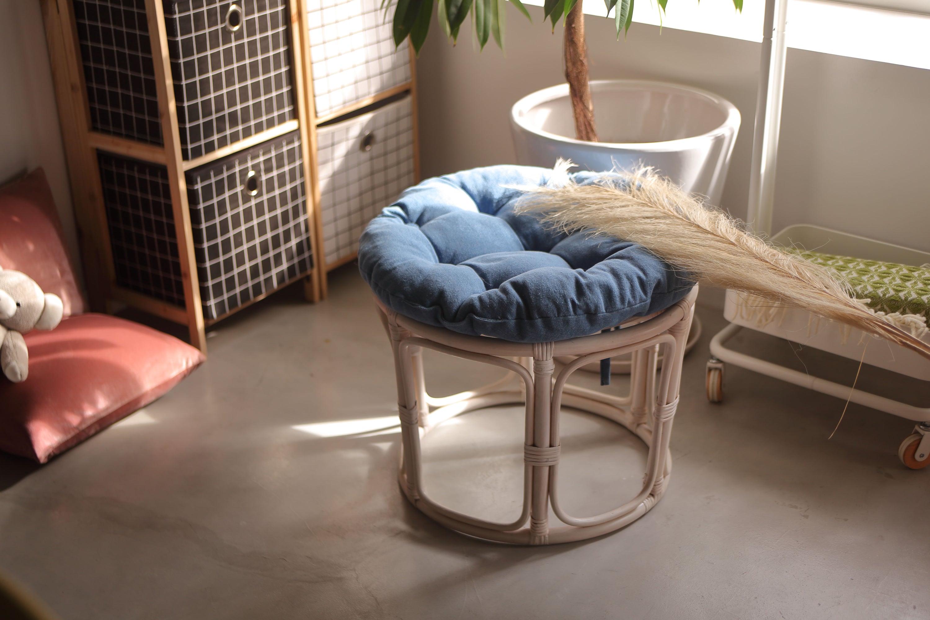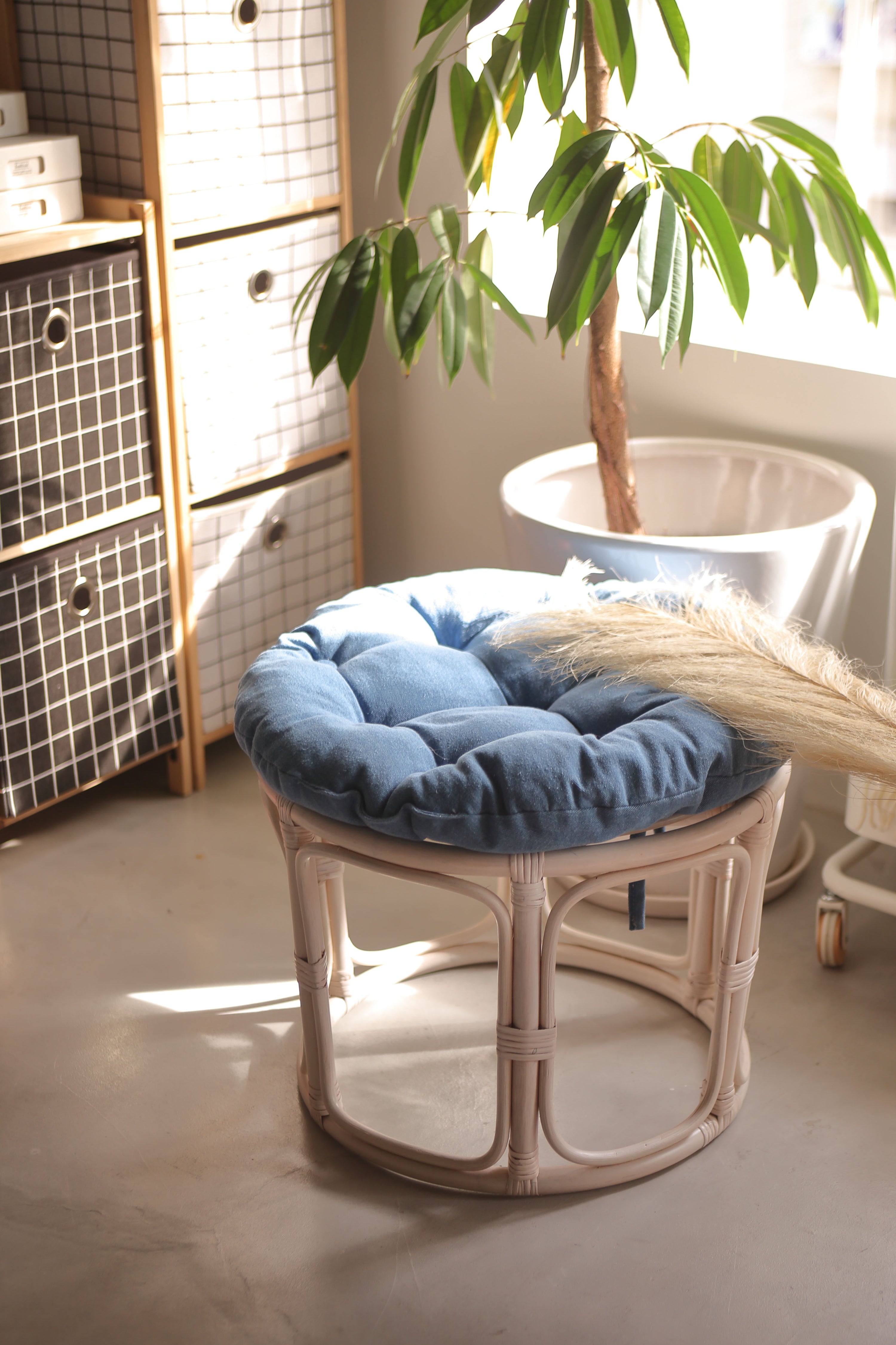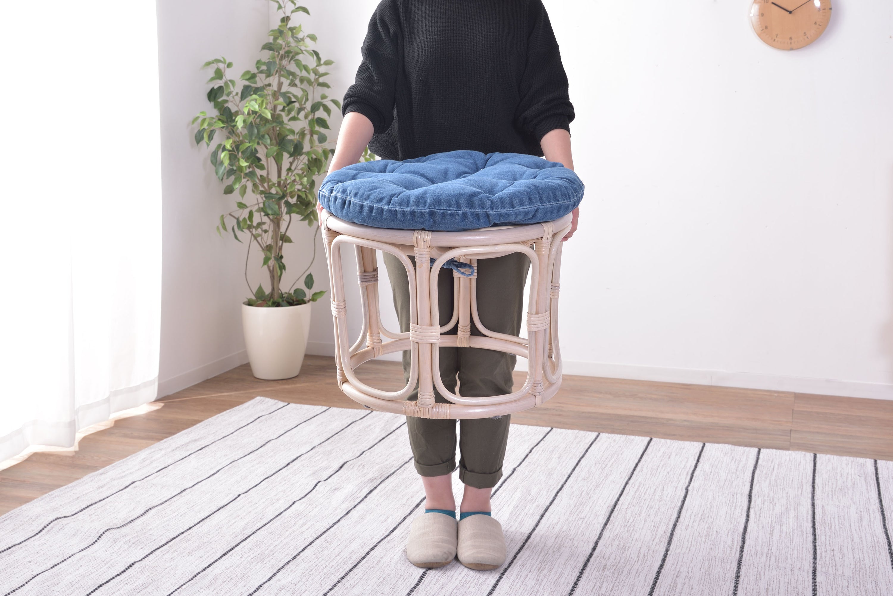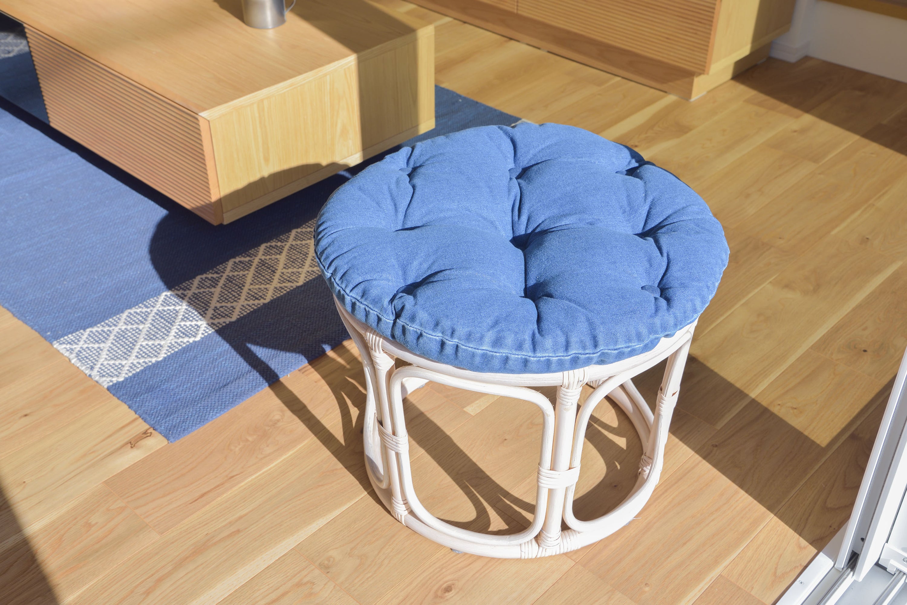 ラタンの脚とボリュームのあるクッションのマシュースツール。湾曲した底面が包み込むように支え、座り心地の良い設計です。コットンデニムとラタンの組み合わせは雰囲気のある空間を演出します。