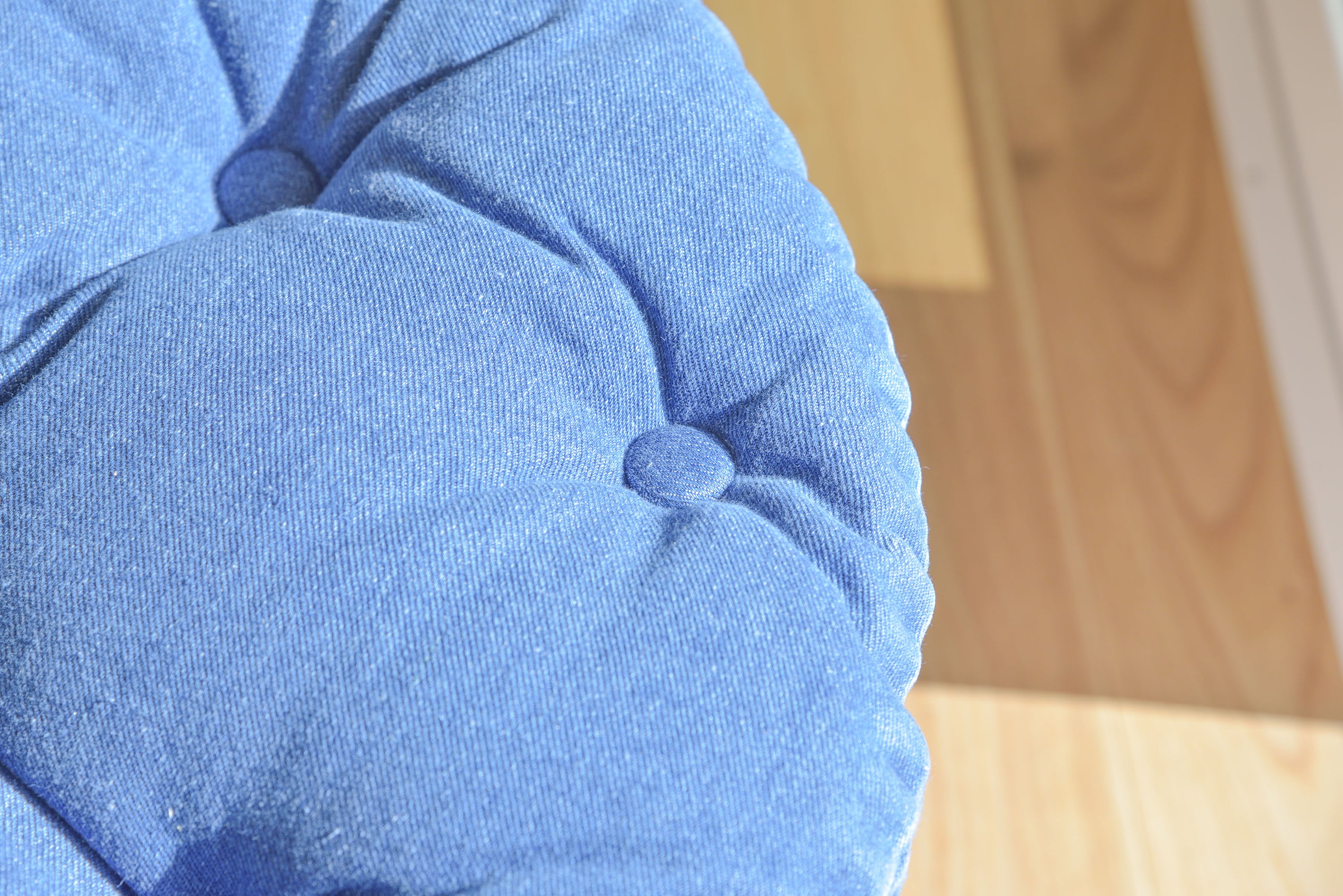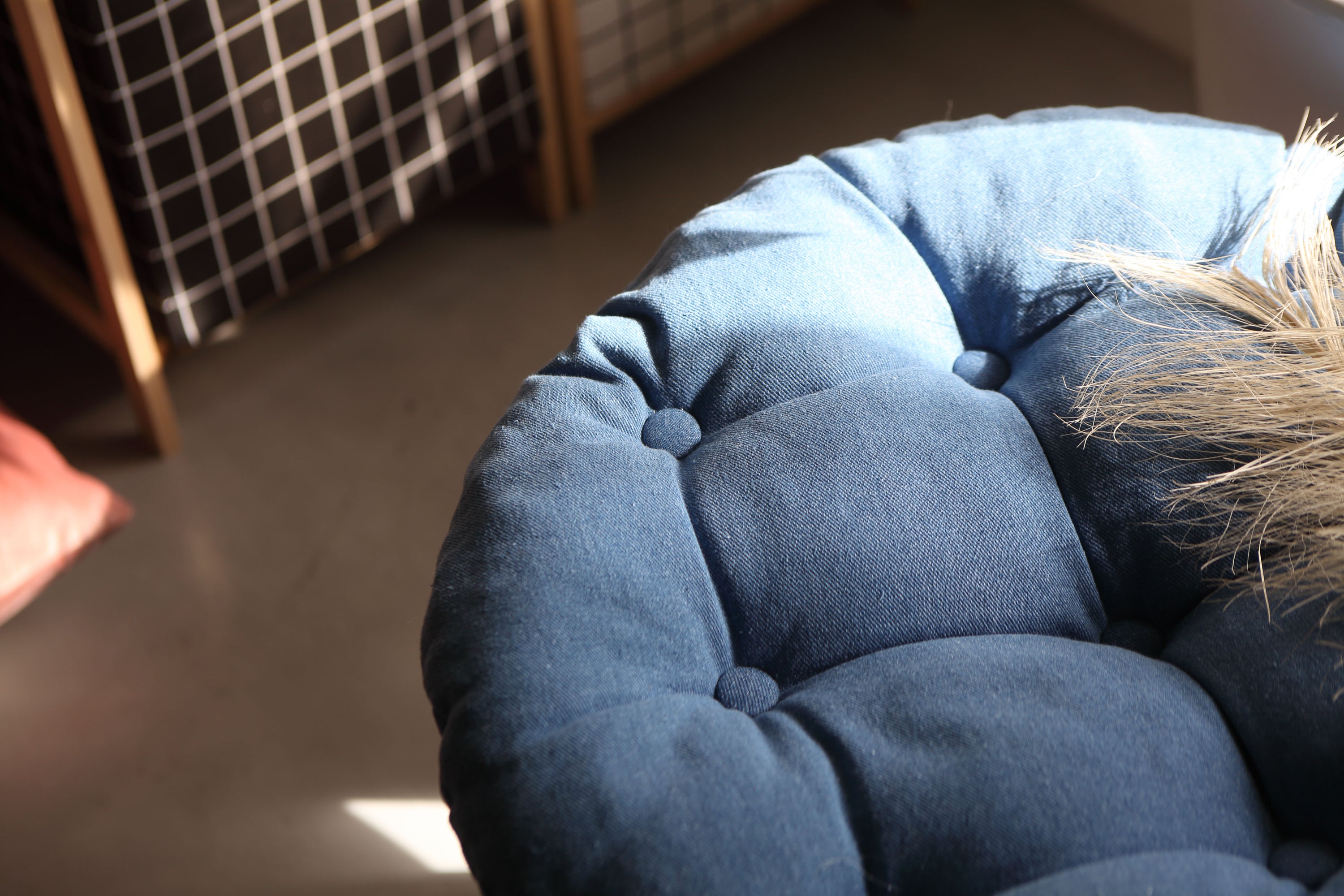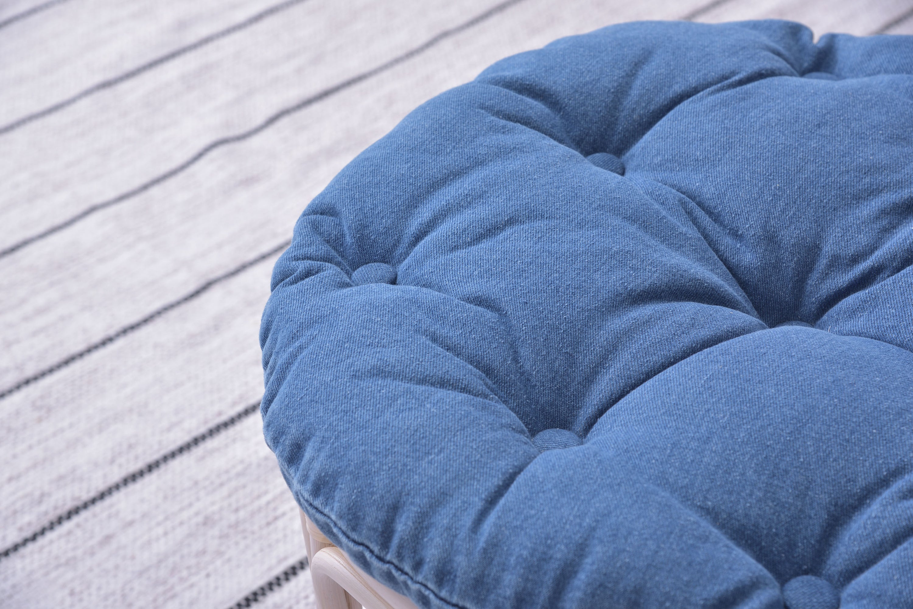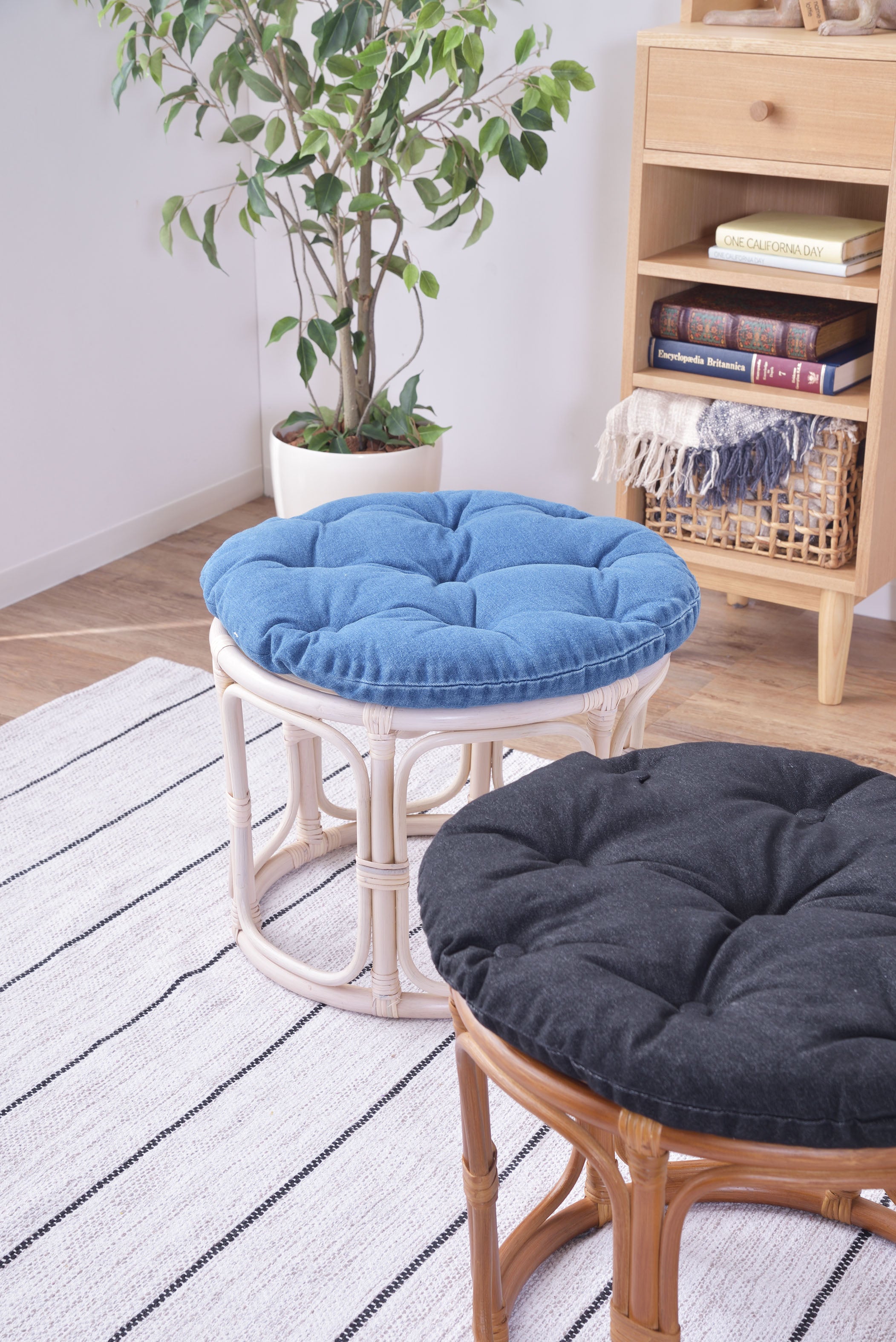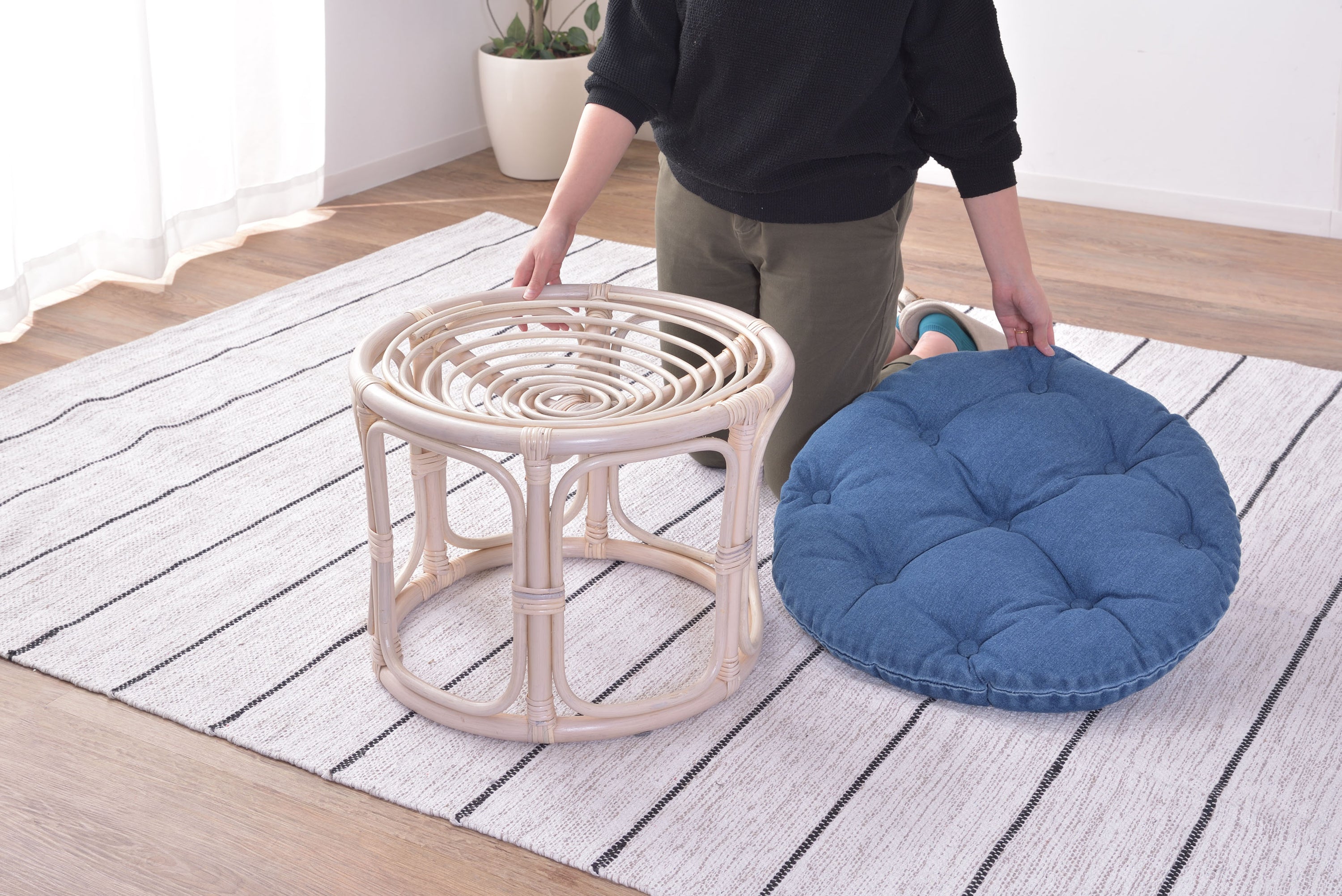 ラタンの脚とボリュームのあるクッションのマシュースツール。湾曲した底面が包み込むように支え、座り心地の良い設計です。コットンデニムとラタンの組み合わせは雰囲気のある空間を演出します。