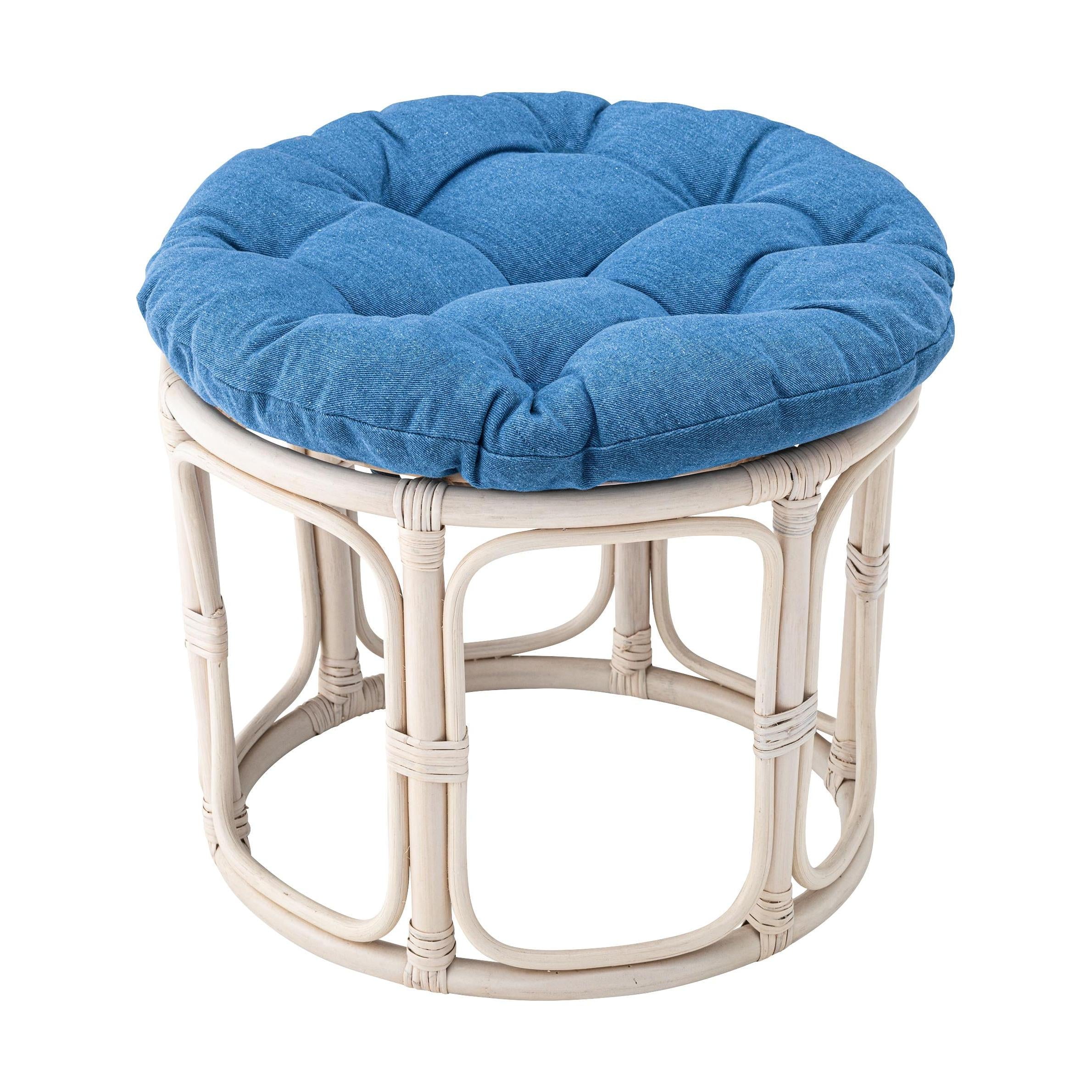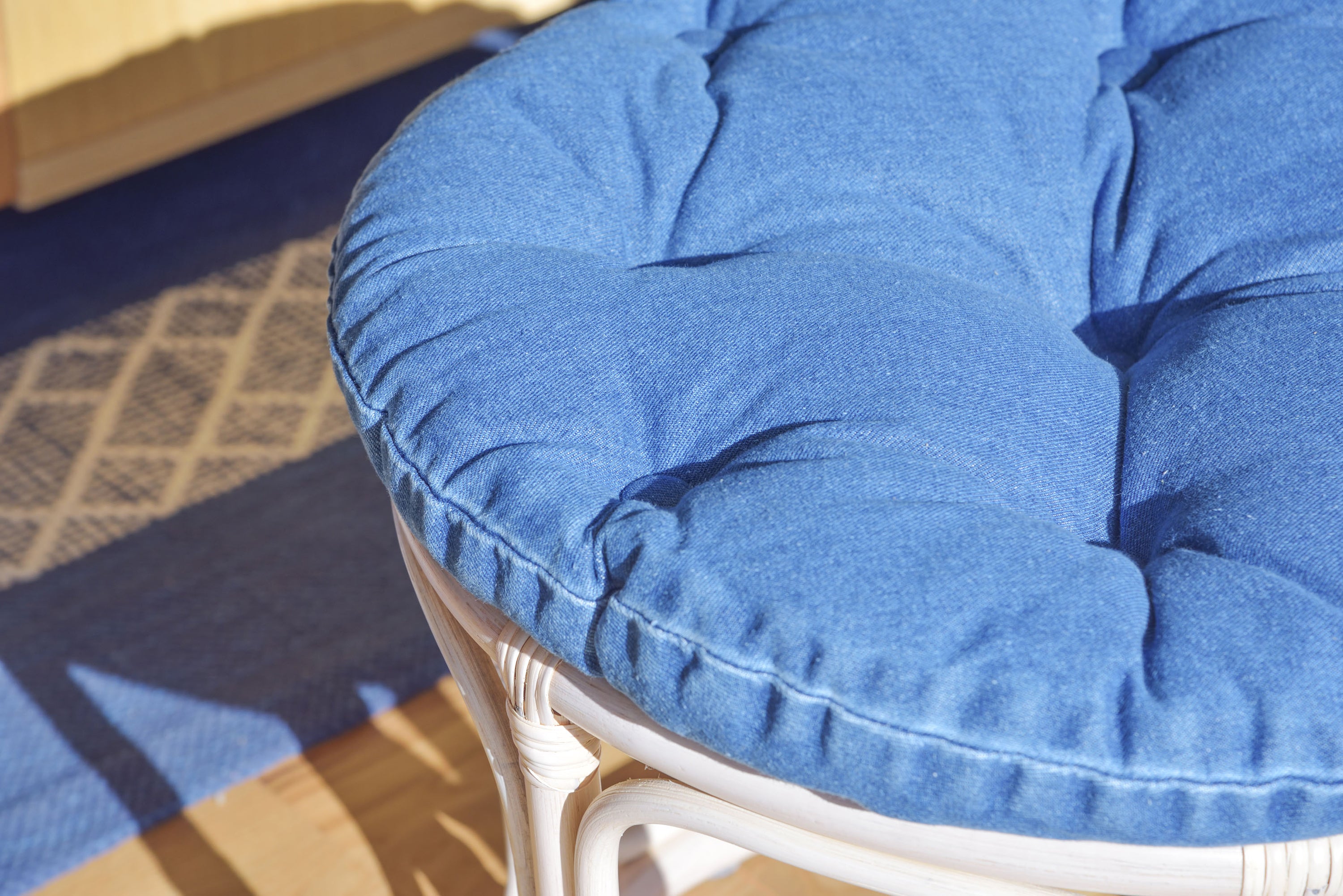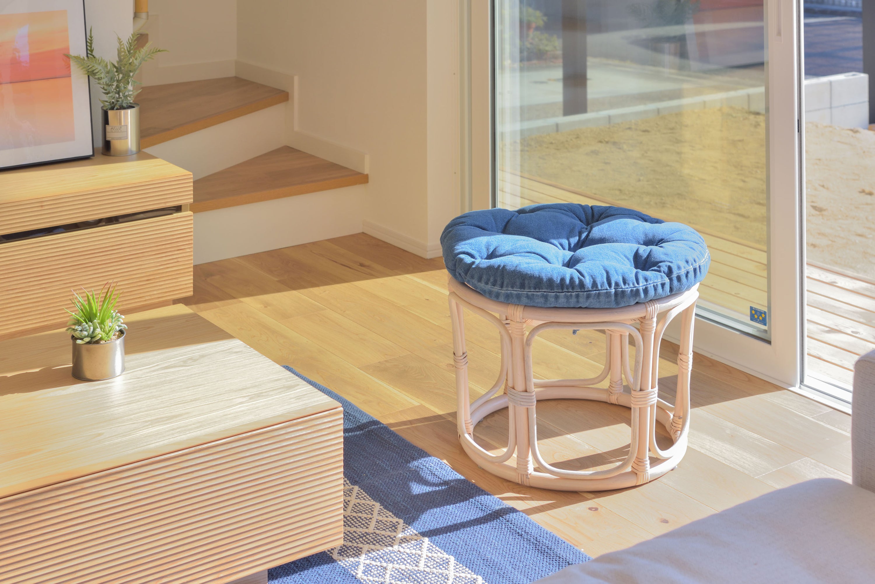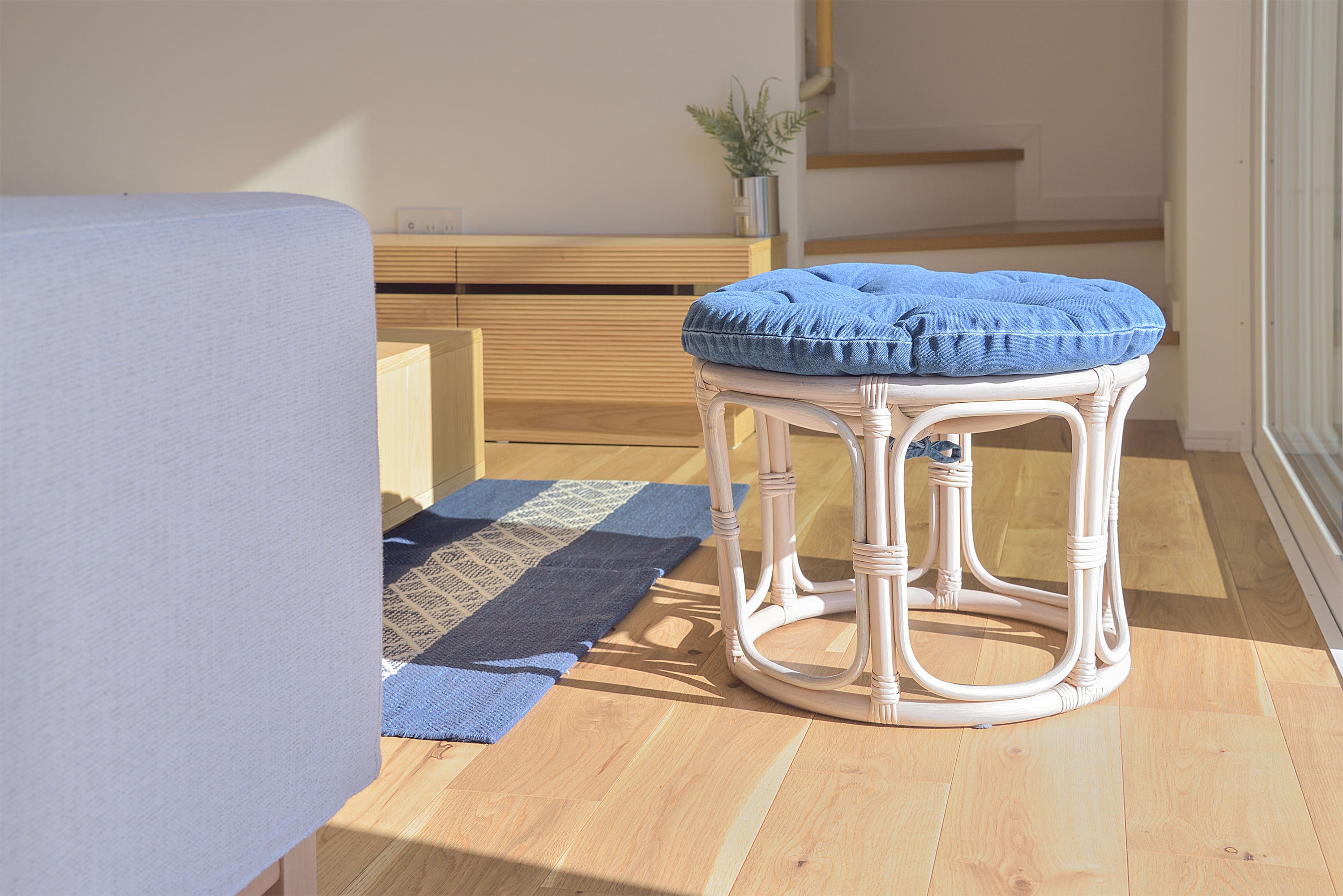 ラタンの脚とボリュームのあるクッションのマシュースツール。湾曲した底面が包み込むように支え、座り心地の良い設計です。コットンデニムとラタンの組み合わせは雰囲気のある空間を演出します。
