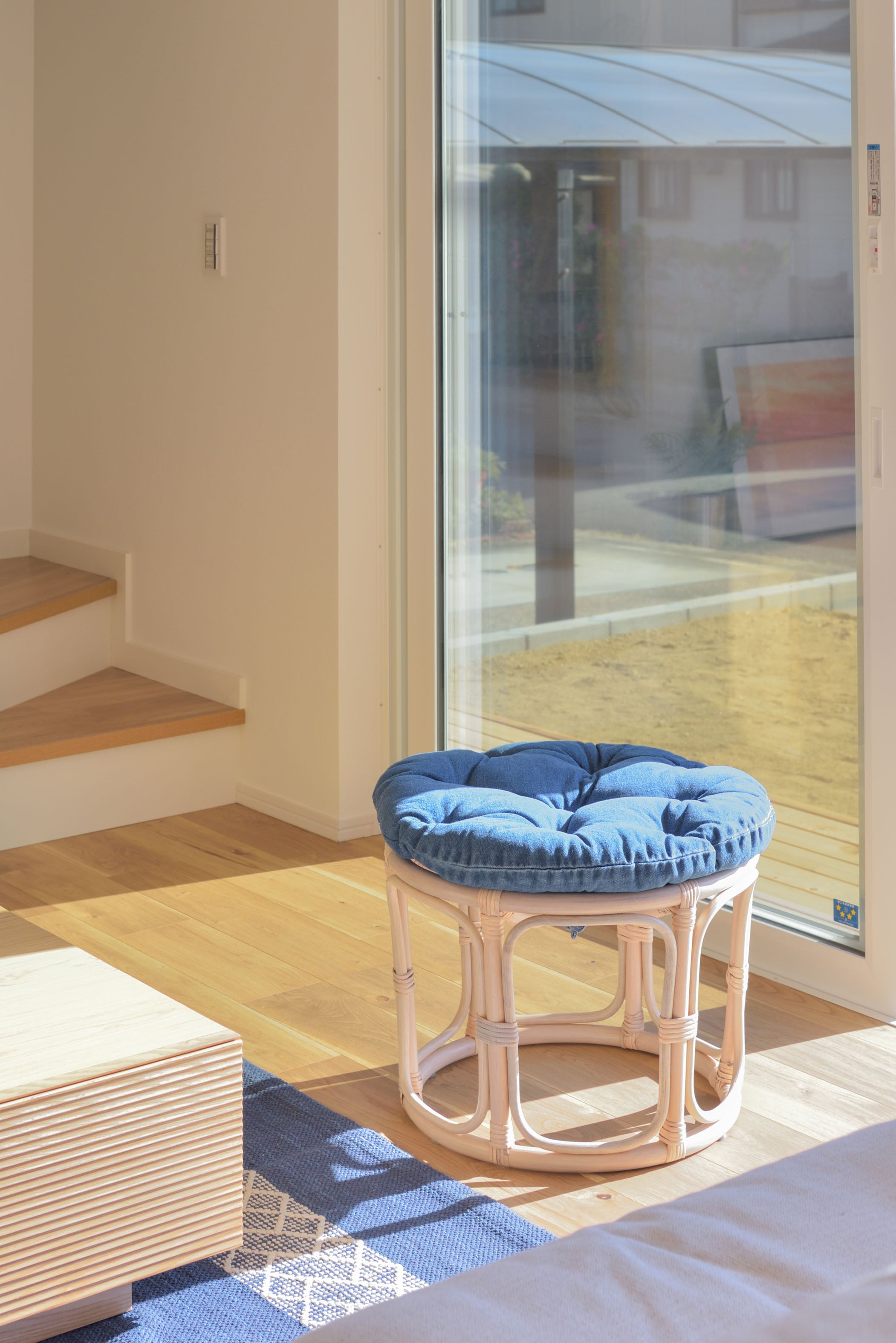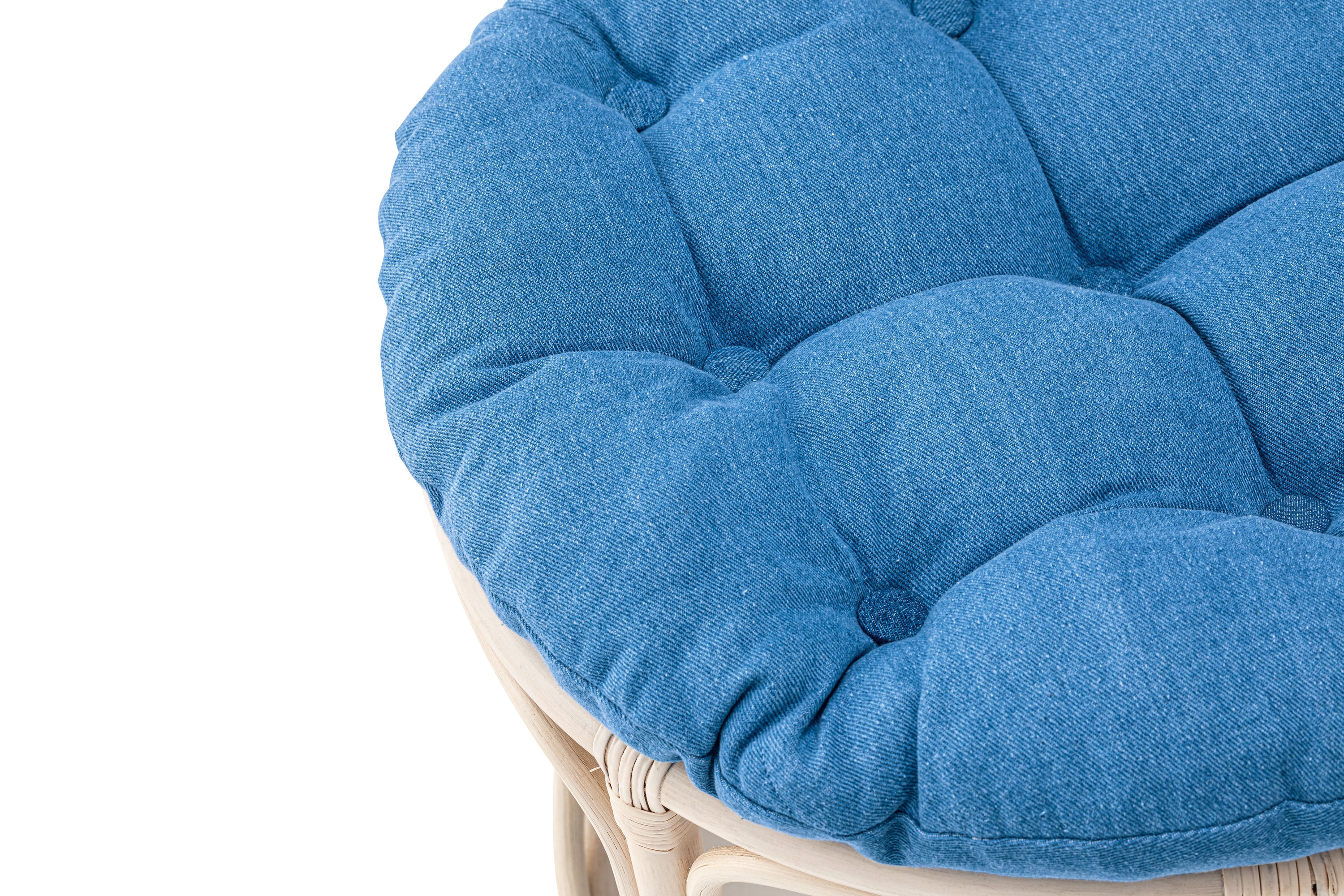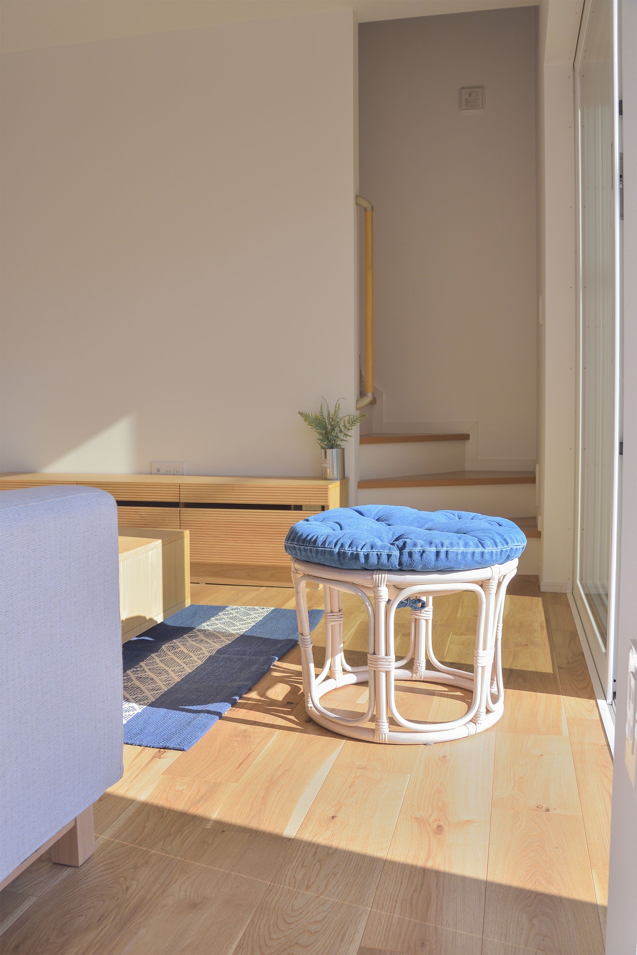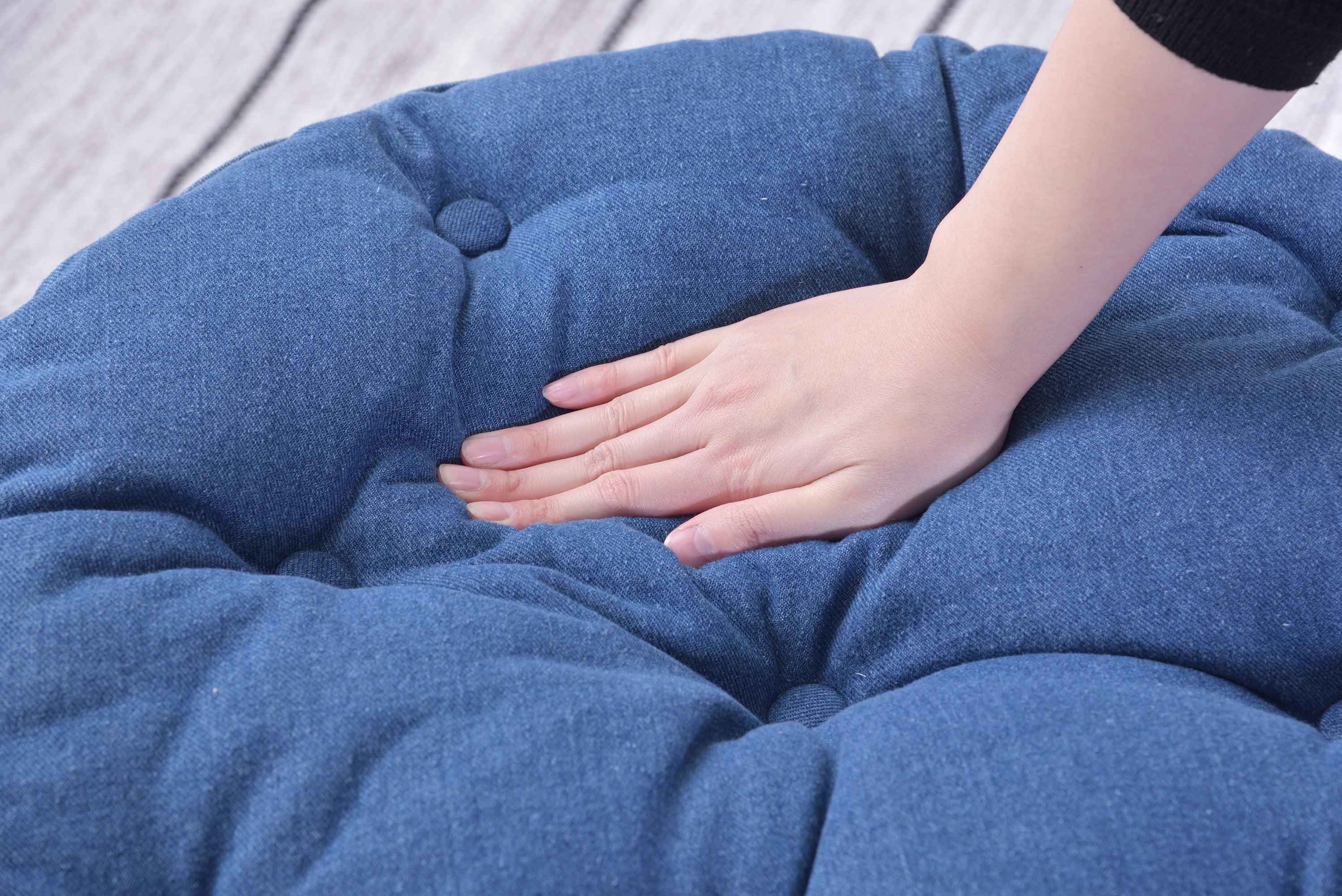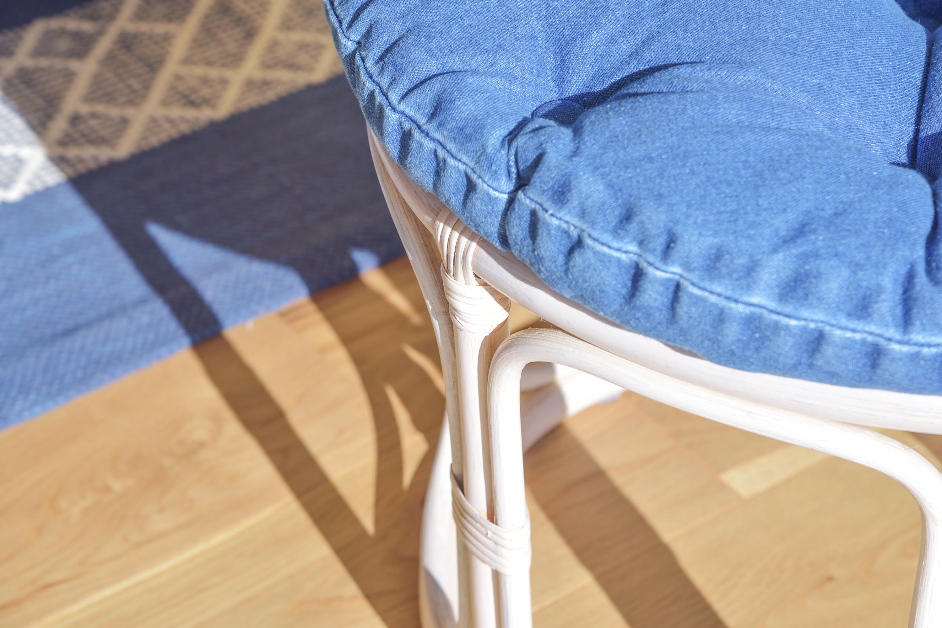 ラタンの脚とボリュームのあるクッションのマシュースツール。湾曲した底面が包み込むように支え、座り心地の良い設計です。コットンデニムとラタンの組み合わせは雰囲気のある空間を演出します。