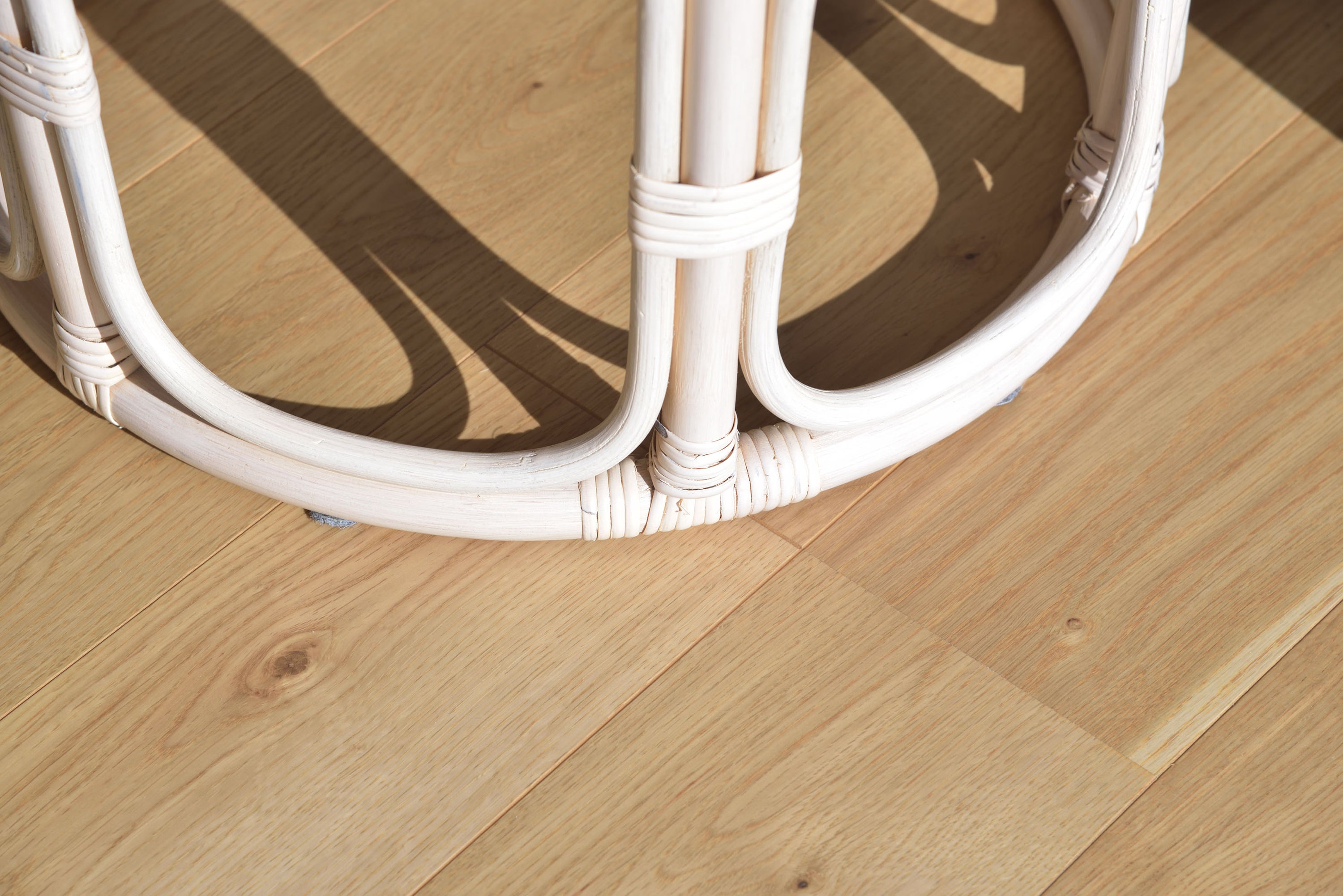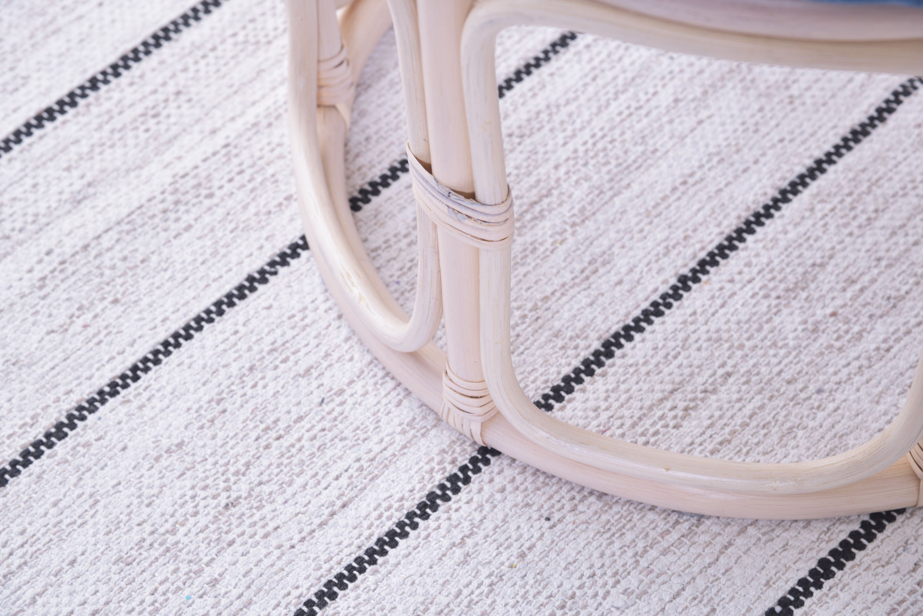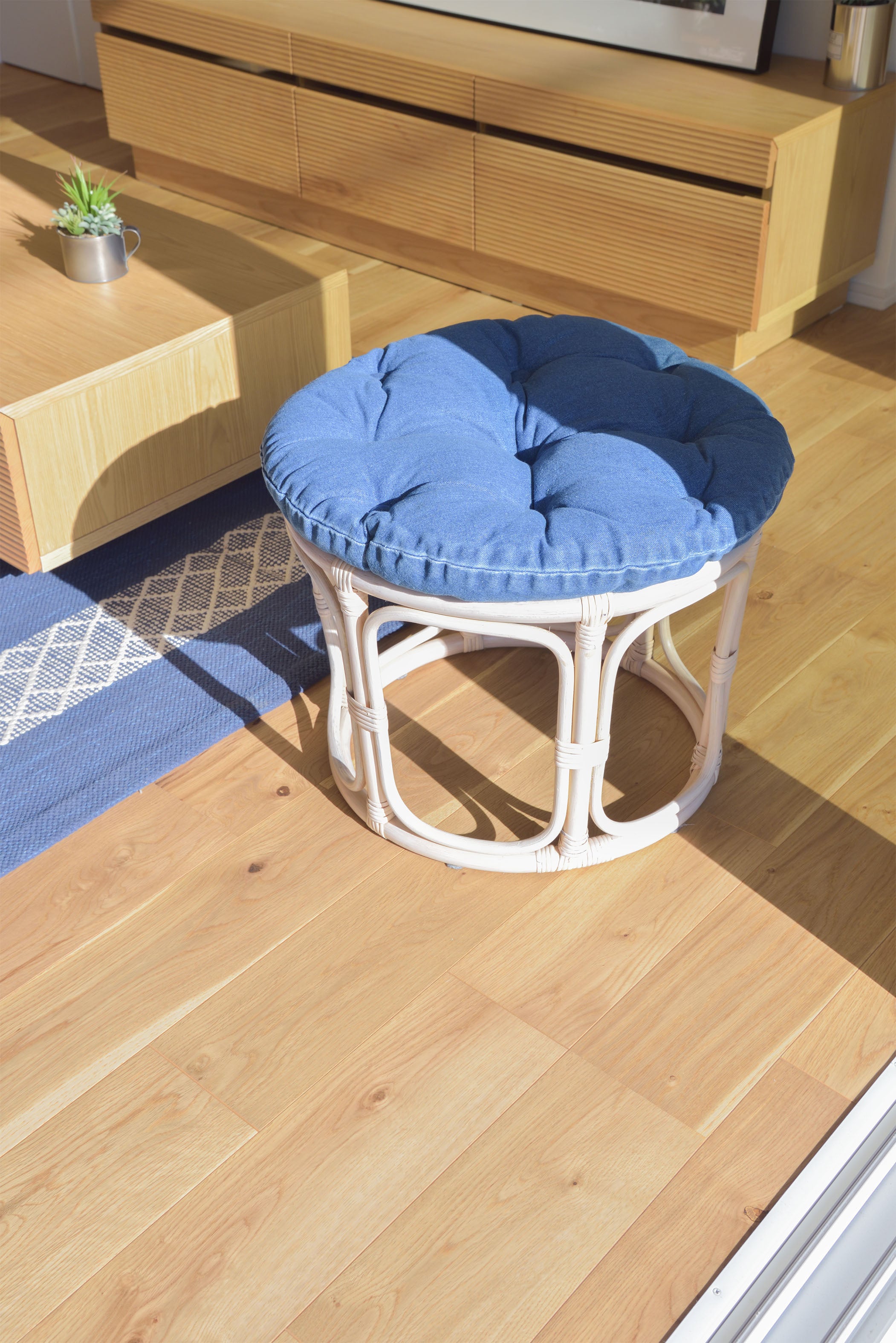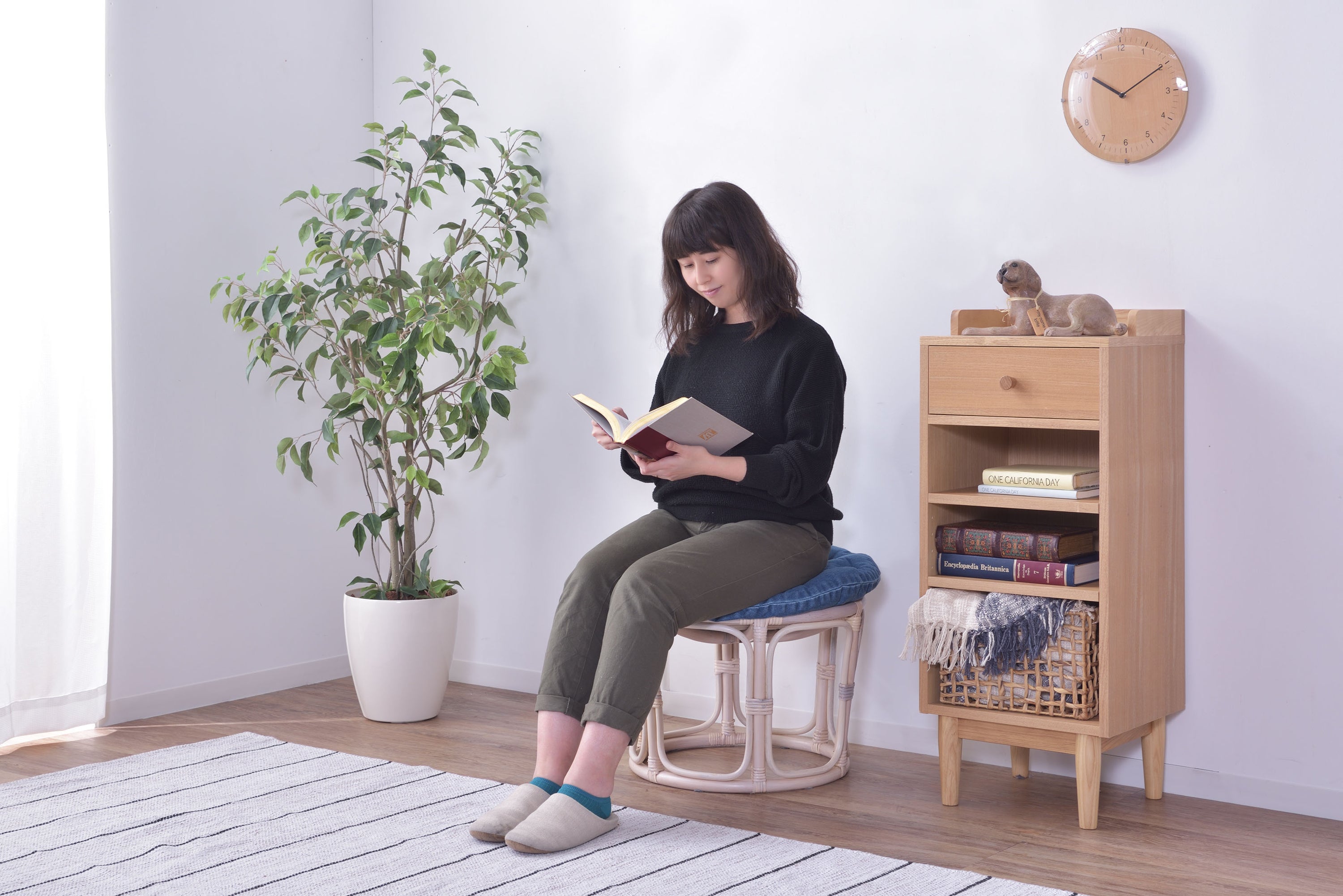 ラタンの脚とボリュームのあるクッションのマシュースツール。湾曲した底面が包み込むように支え、座り心地の良い設計です。コットンデニムとラタンの組み合わせは雰囲気のある空間を演出します。