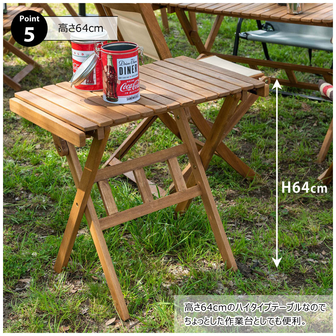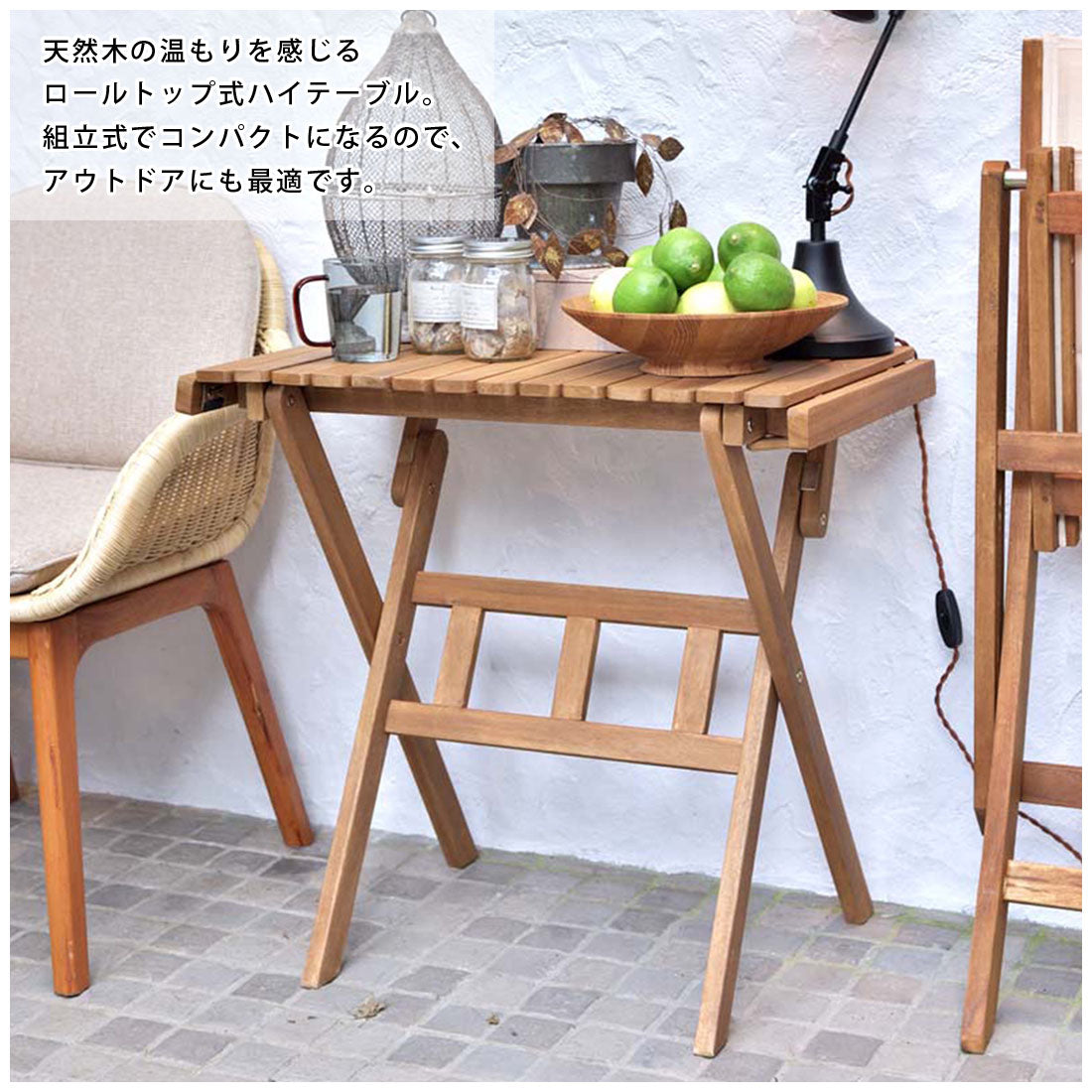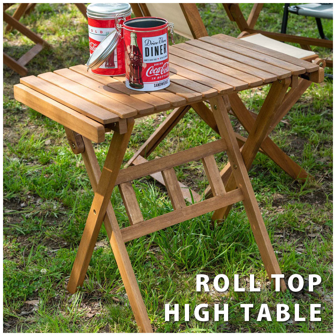 天然木の温もりを感じるロールトップ式ハイテーブル。 組立式でコンパクトになるので、アウトドア・キャンプにも最適。 アウトドアシーン以外に室内使用にもおすすめのテーブル。 来客用テーブルとしても優秀。 専用収納ケース付きで各部材をすっきり収納。持ち運びもかさばらずアウトドアに最適。 工具不要で簡単組立式なので準備にも手間取らず簡単にセット。 天然木(アカシア)にオイル仕上げで完成させた、風合いのあるテーブル。 高さ64cmのハイタイプテーブルなので、ちょっとした作業台としても便利。 玄関周りの多用途テーブルとして。 チェア横のサイドテーブルとして。