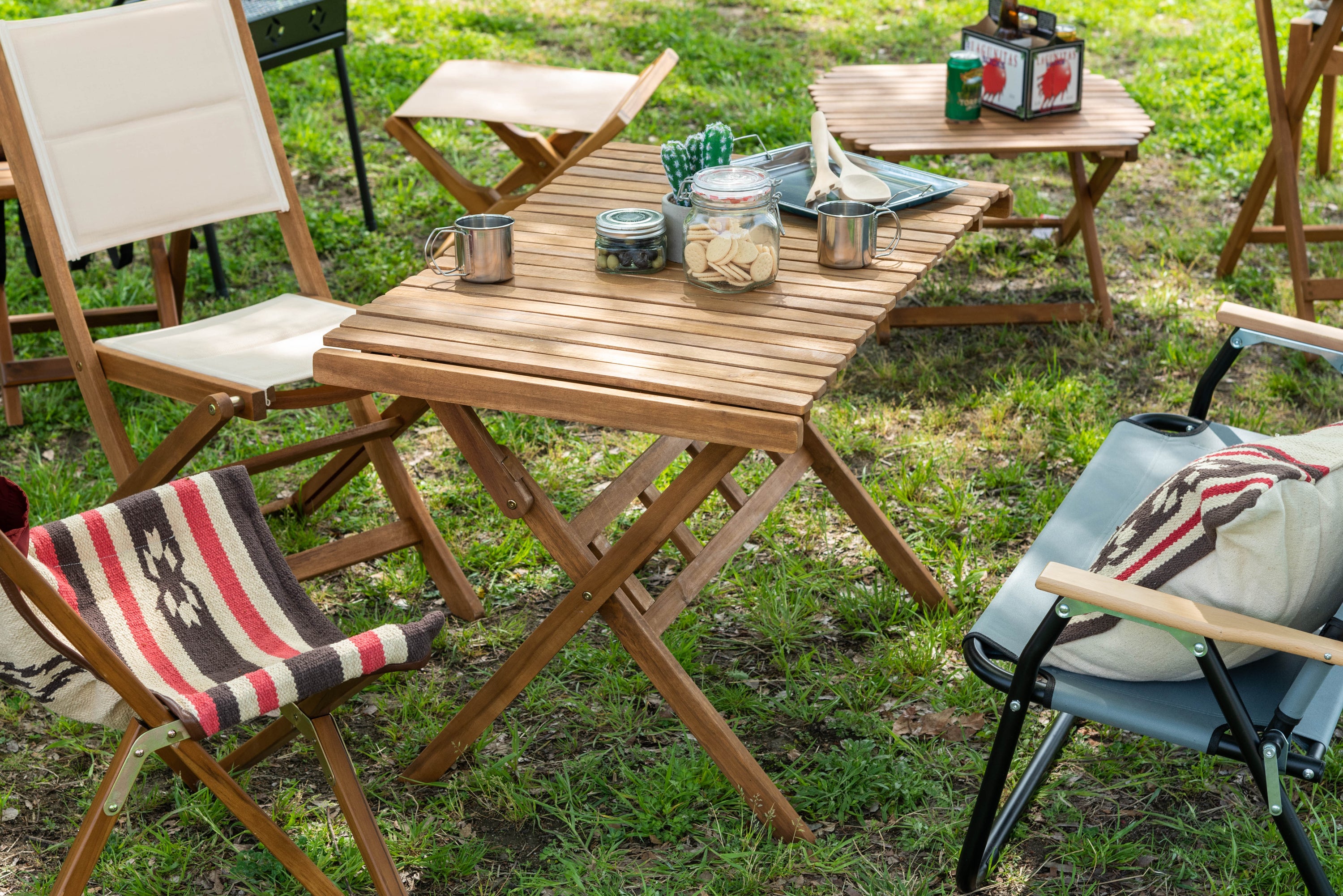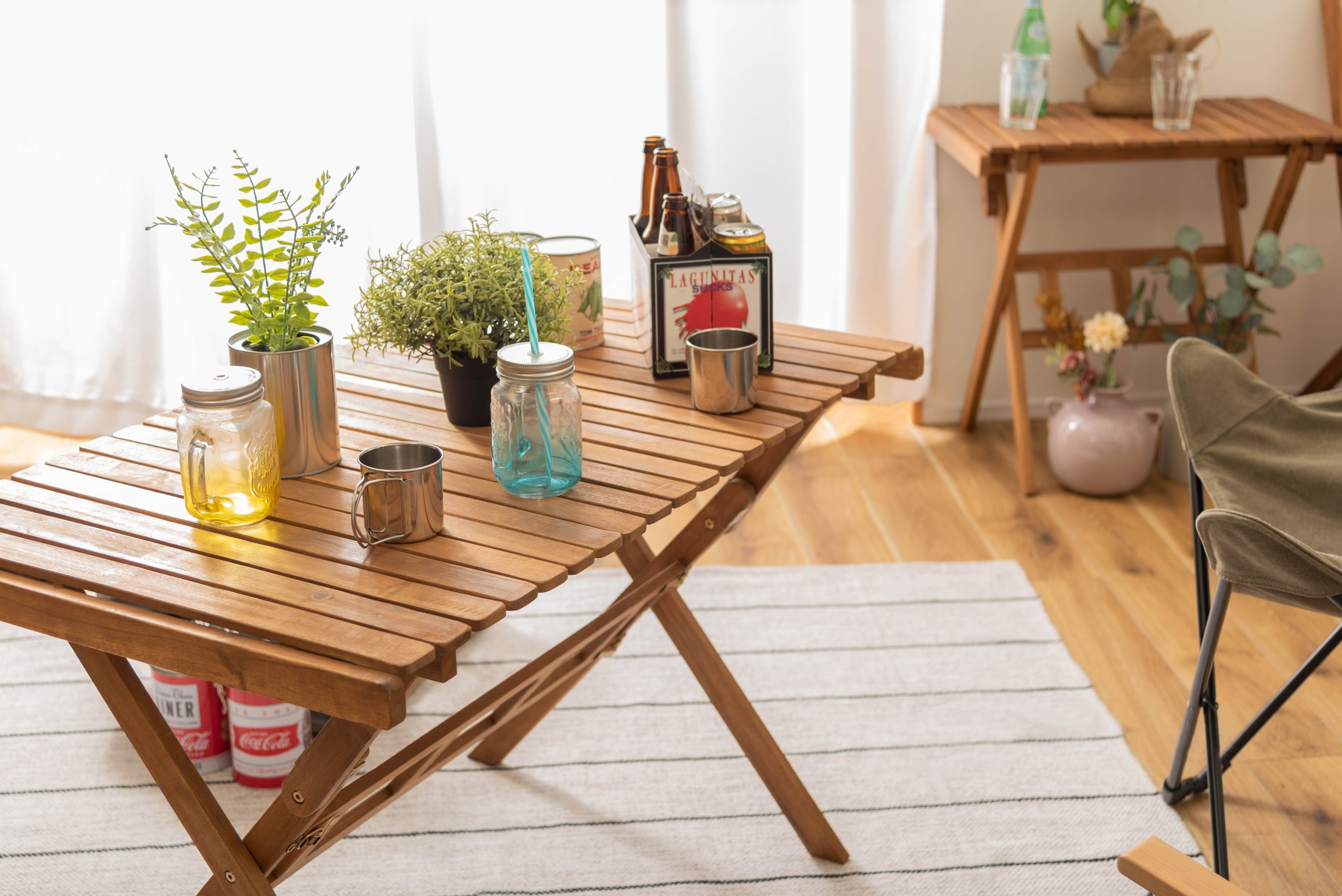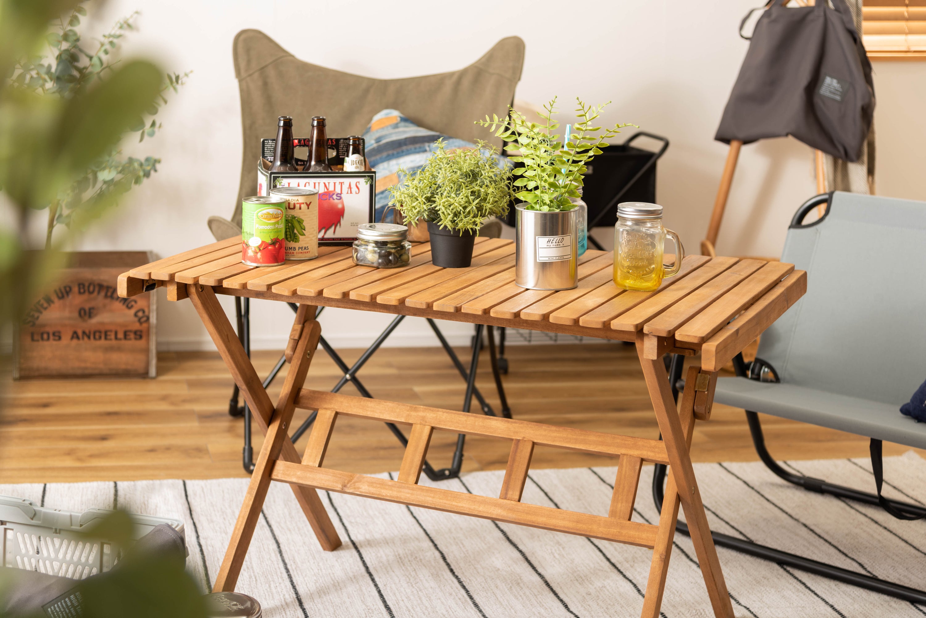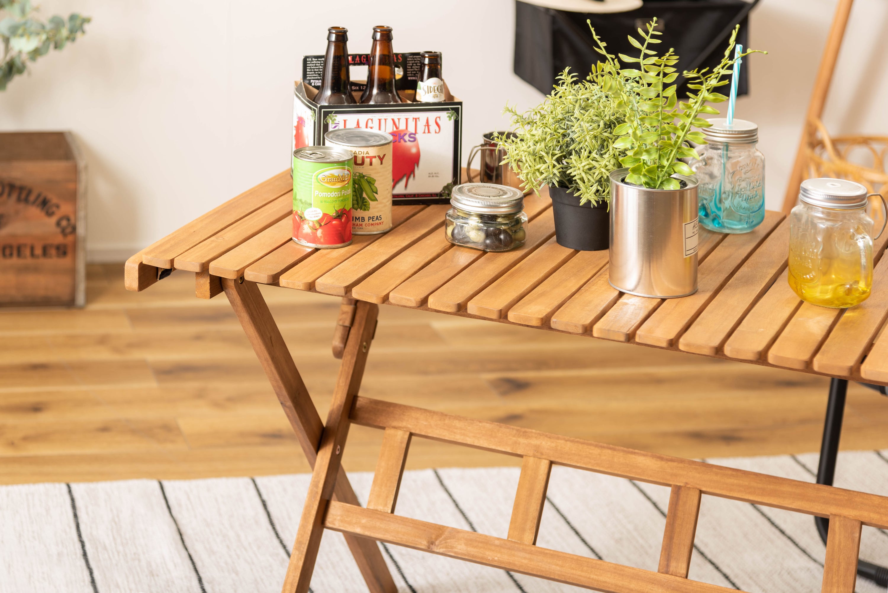 天然木の温もりを感じるロールトップ式ハイテーブル。 組立式でコンパクトになるので、アウトドア・キャンプにも最適。 アウトドアシーン以外に室内使用にもおすすめのテーブル。 来客用テーブルとしても優秀。 専用収納ケース付きで各部材をすっきり収納。持ち運びもかさばらずアウトドアに最適。 工具不要で簡単組立式なので準備にも手間取らず簡単にセット。 天然木(アカシア)にオイル仕上げで完成させた、風合いのあるテーブル。 高さ64cmのハイタイプテーブルなので、ちょっとした作業台としても便利。 ソファ前のハイテーブルとして。 来客時用のテーブルとして。