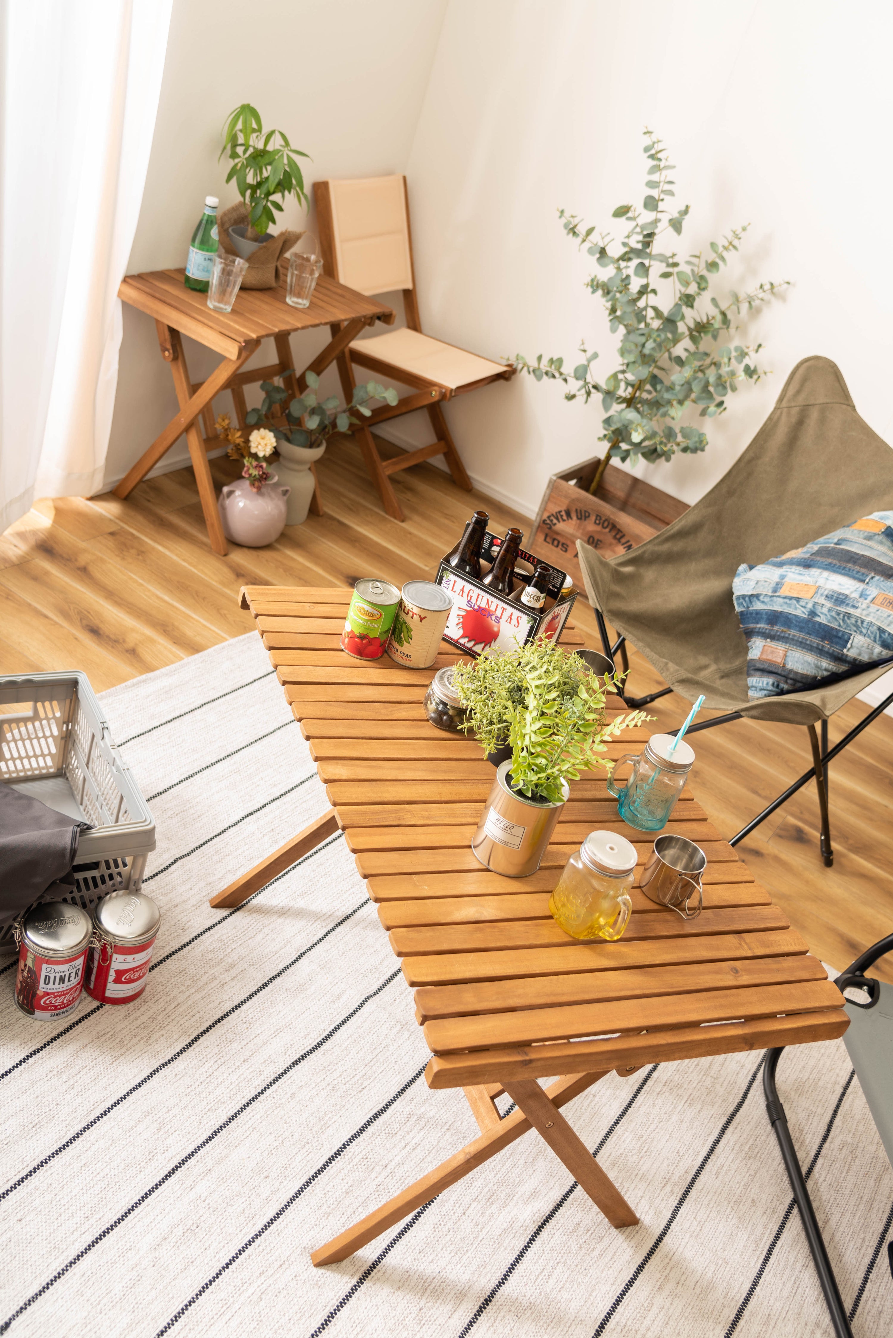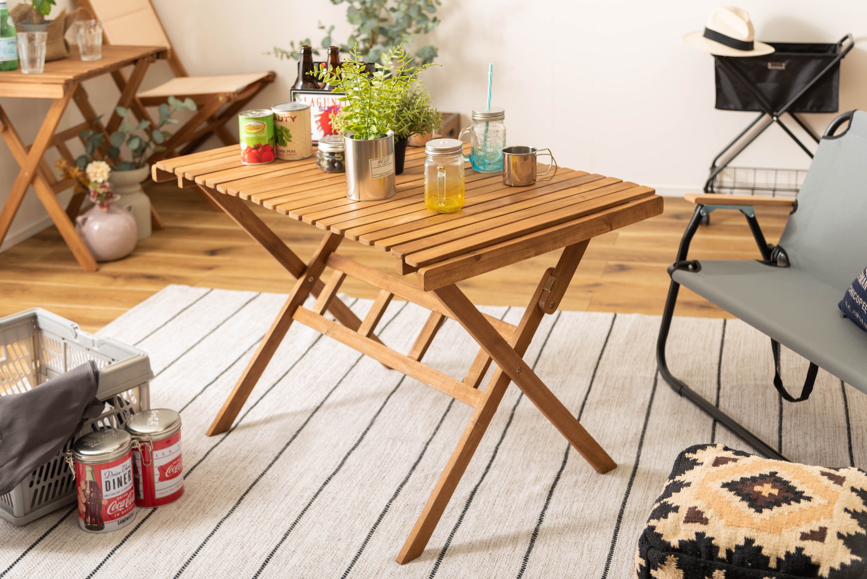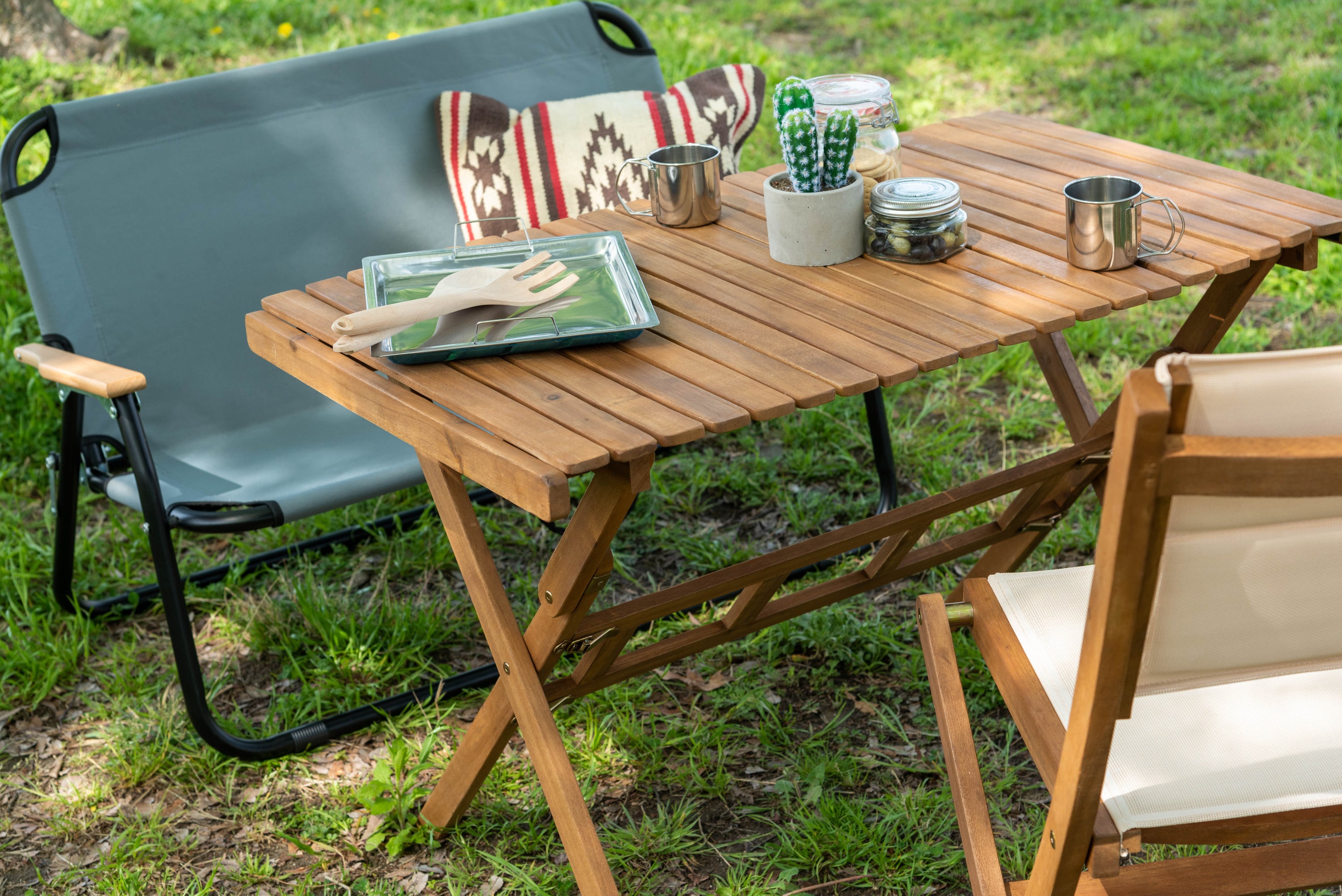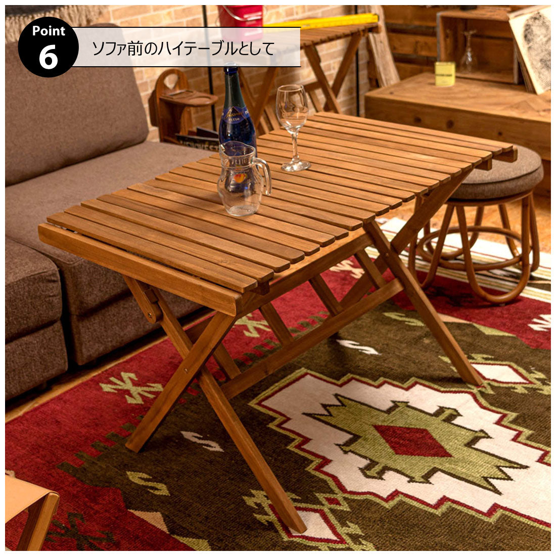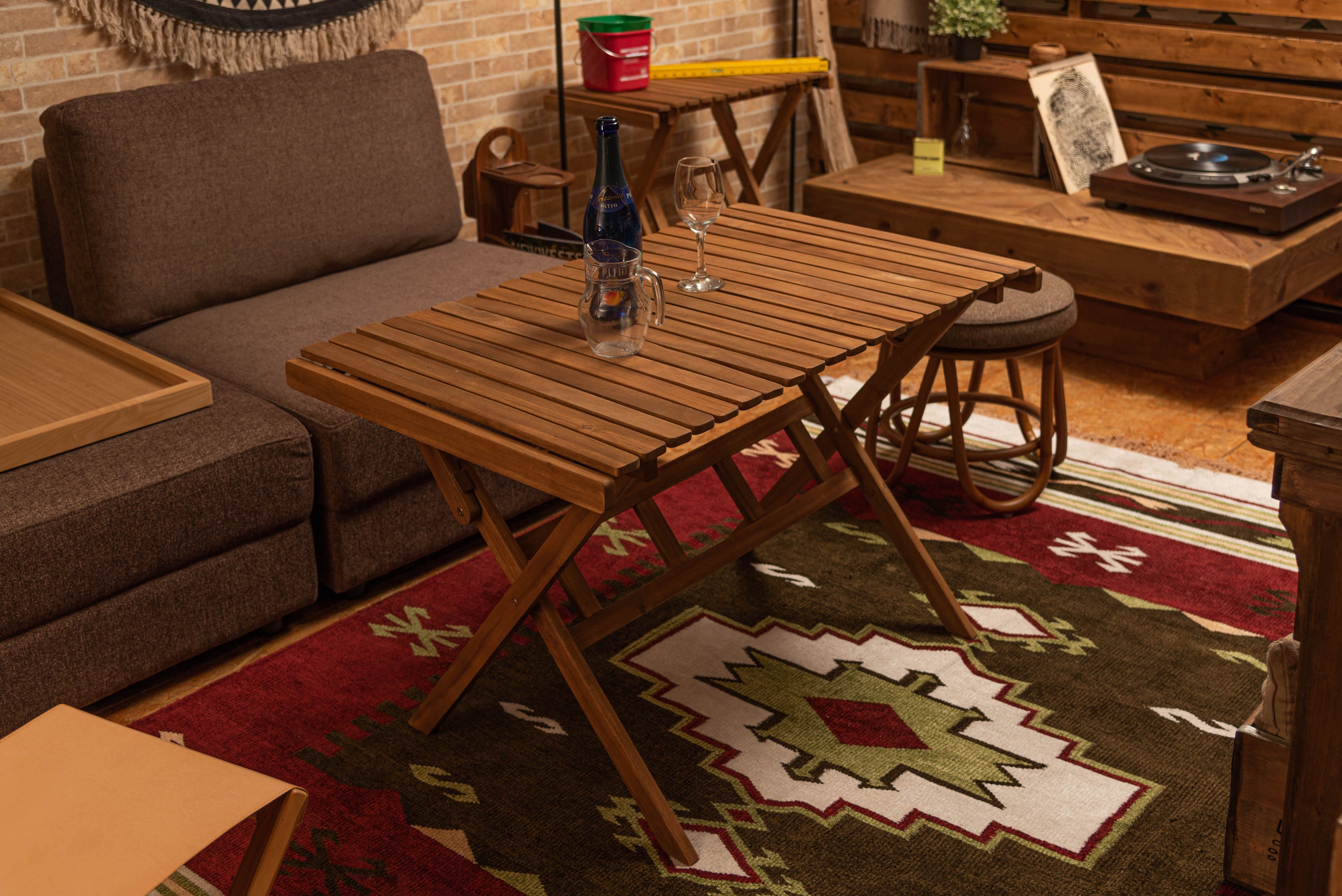 天然木の温もりを感じるロールトップ式ハイテーブル。 組立式でコンパクトになるので、アウトドア・キャンプにも最適。 アウトドアシーン以外に室内使用にもおすすめのテーブル。 来客用テーブルとしても優秀。 専用収納ケース付きで各部材をすっきり収納。持ち運びもかさばらずアウトドアに最適。 工具不要で簡単組立式なので準備にも手間取らず簡単にセット。 天然木(アカシア)にオイル仕上げで完成させた、風合いのあるテーブル。 高さ64cmのハイタイプテーブルなので、ちょっとした作業台としても便利。 ソファ前のハイテーブルとして。 来客時用のテーブルとして。