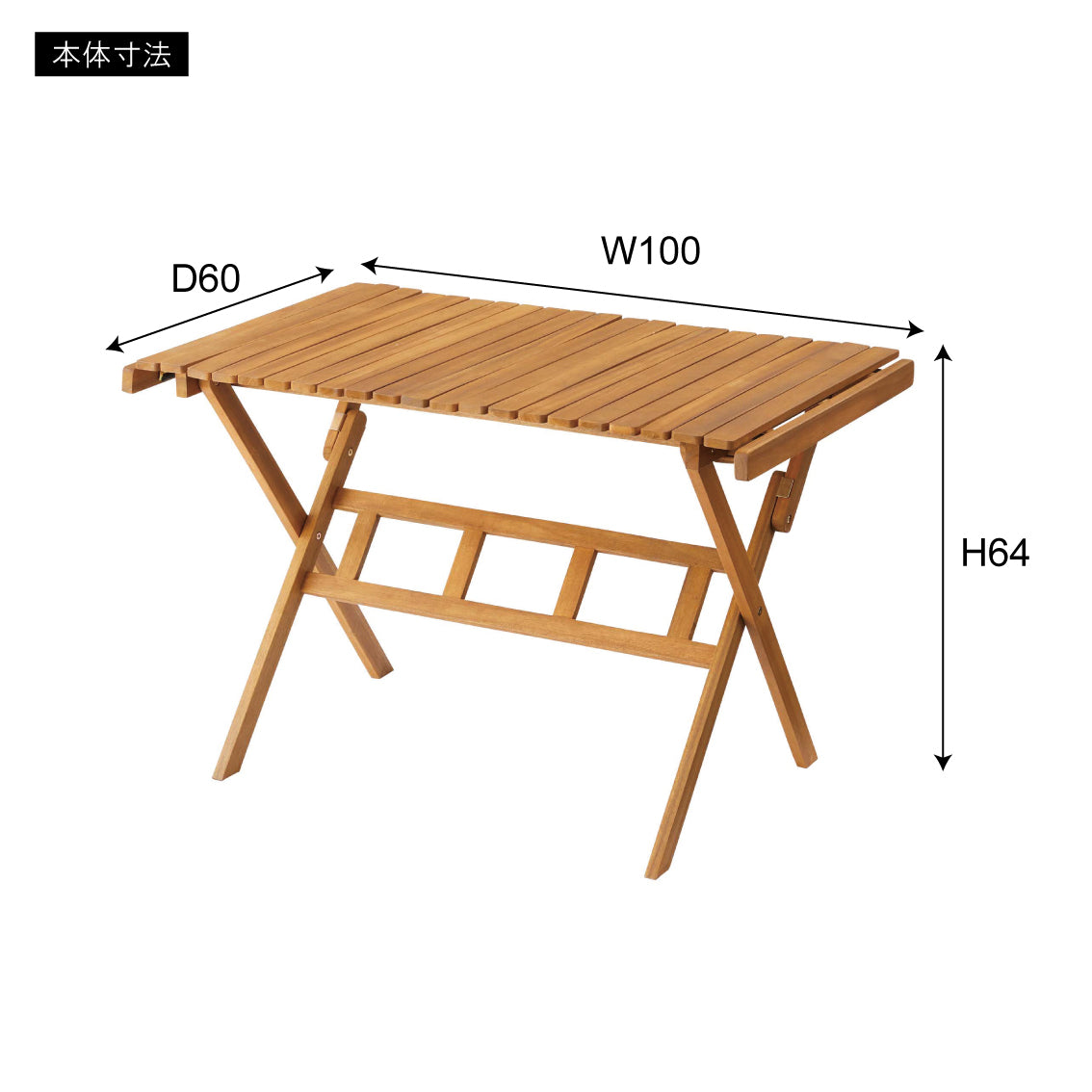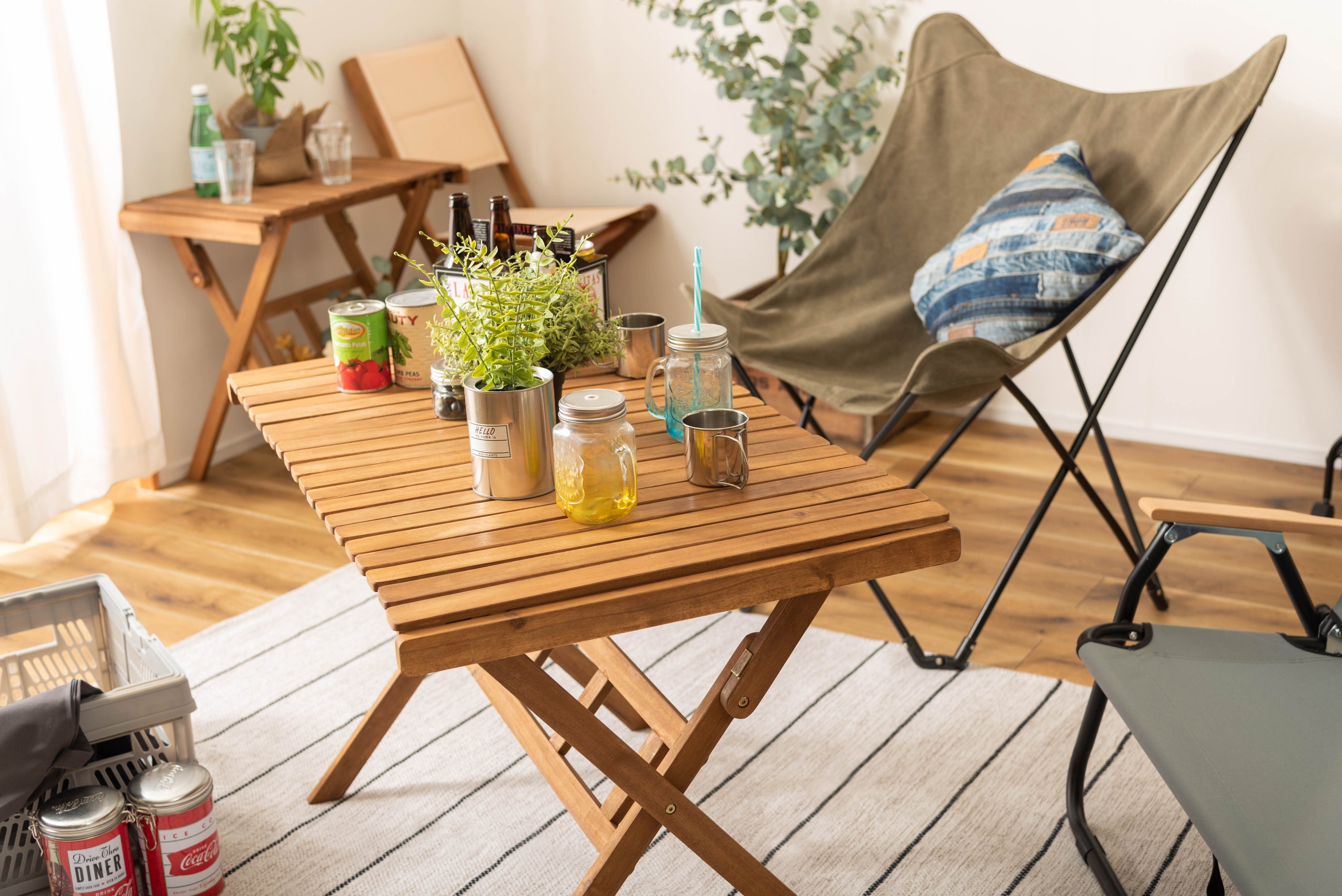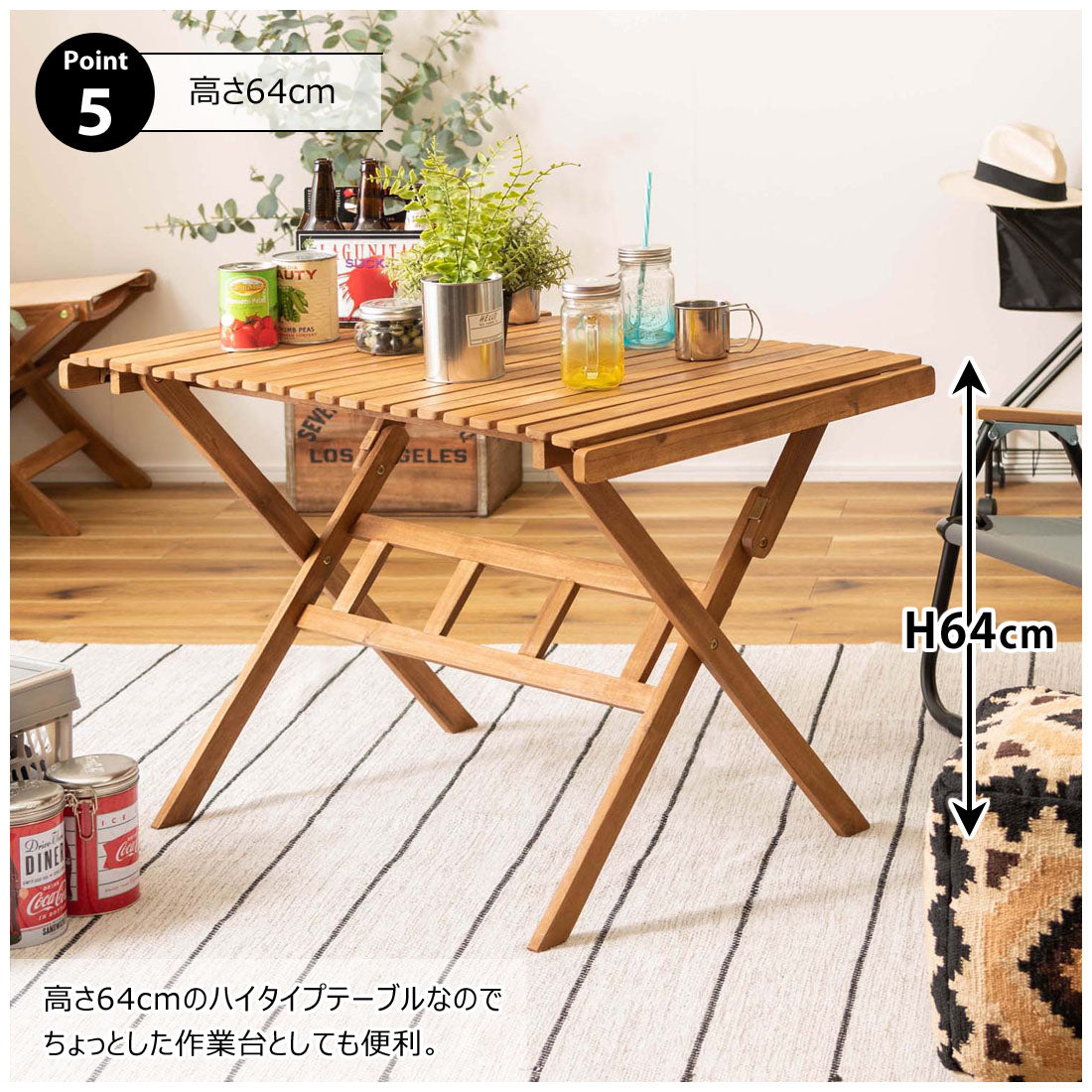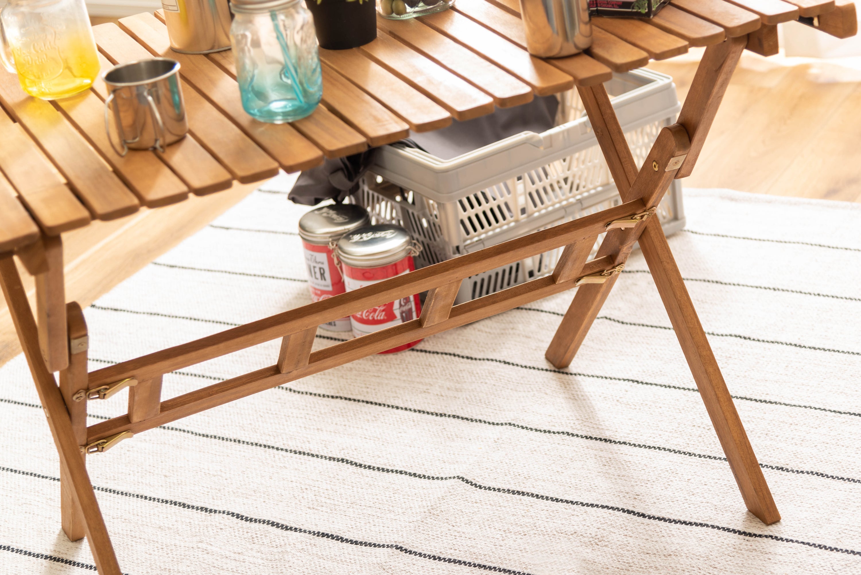 天然木の温もりを感じるロールトップ式ハイテーブル。 組立式でコンパクトになるので、アウトドア・キャンプにも最適。 アウトドアシーン以外に室内使用にもおすすめのテーブル。 来客用テーブルとしても優秀。 専用収納ケース付きで各部材をすっきり収納。持ち運びもかさばらずアウトドアに最適。 工具不要で簡単組立式なので準備にも手間取らず簡単にセット。 天然木(アカシア)にオイル仕上げで完成させた、風合いのあるテーブル。 高さ64cmのハイタイプテーブルなので、ちょっとした作業台としても便利。 ソファ前のハイテーブルとして。 来客時用のテーブルとして。