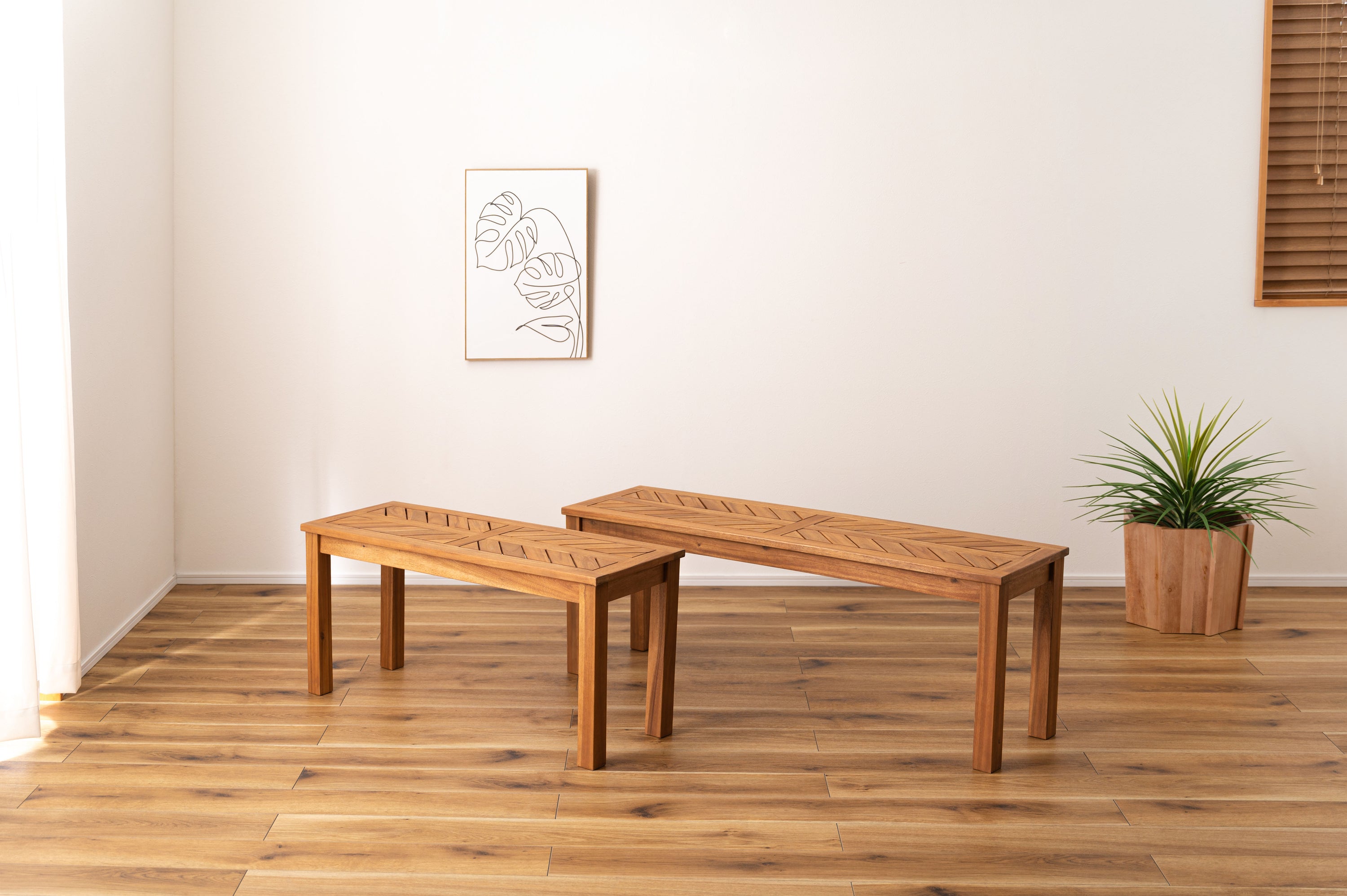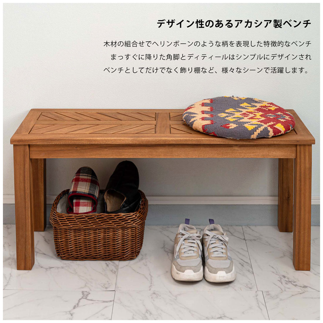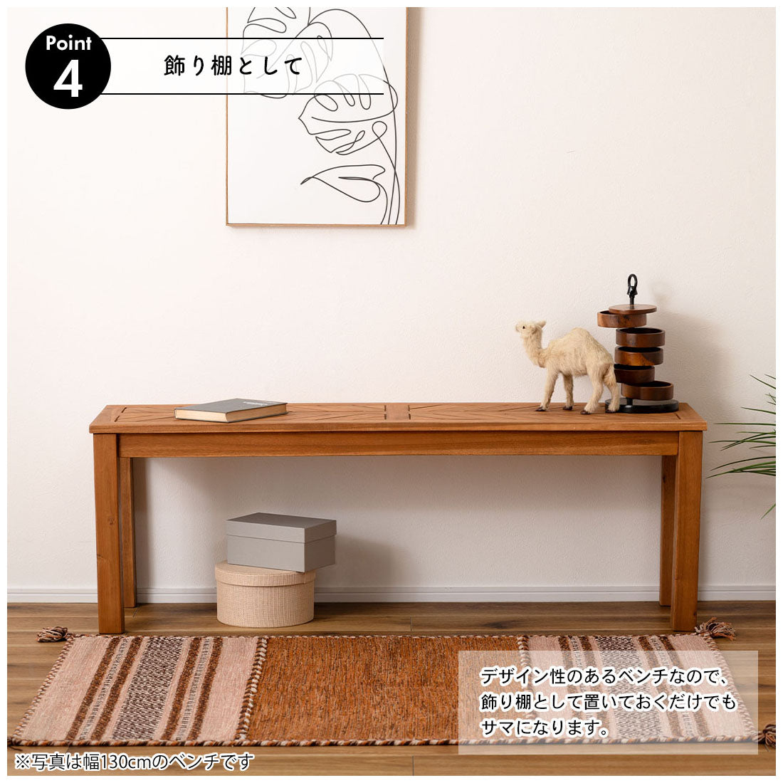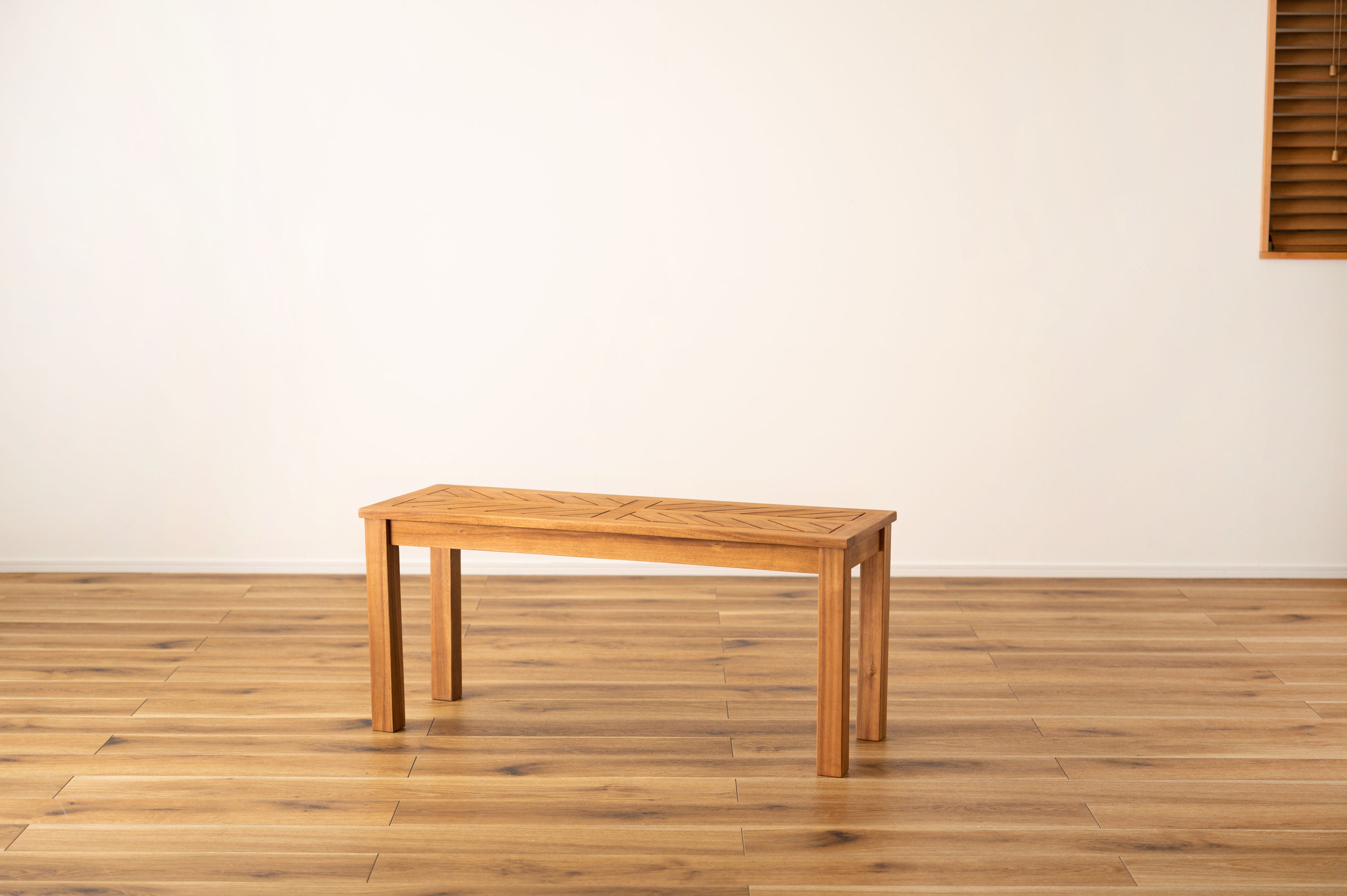 木材の組み合わせでヘリンボーンのような柄を表現した特徴的なベンチ。まっすぐに降りた角脚とディティールはシンプルにデザインされ、ベンチとしてだけでなく飾り棚など、様々なシーンで活躍。座面は、木材を組み合わせて作られたヘリンボーンのような柄が目を引きます。ゆったりと座れるサイズ感は、ダイニングベンチとして最適。エントランスの出入りの際の荷物置きや、靴を履く時のちょっと使いに。座面下も広く、収納ケースやボックス等を置くことも可能。デザイン性のあるベンチなので、飾り棚として置いておくだけでもサマになります。