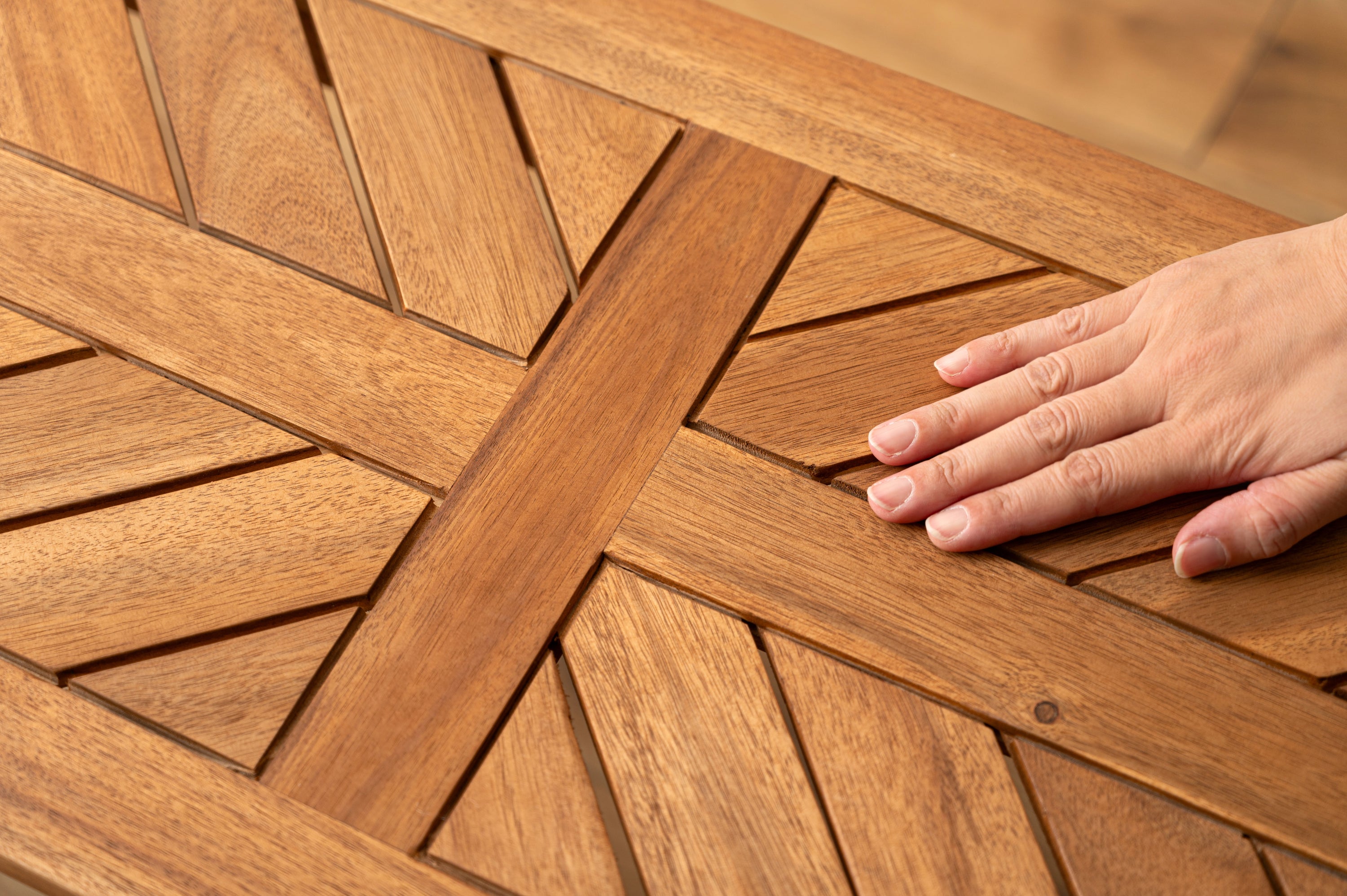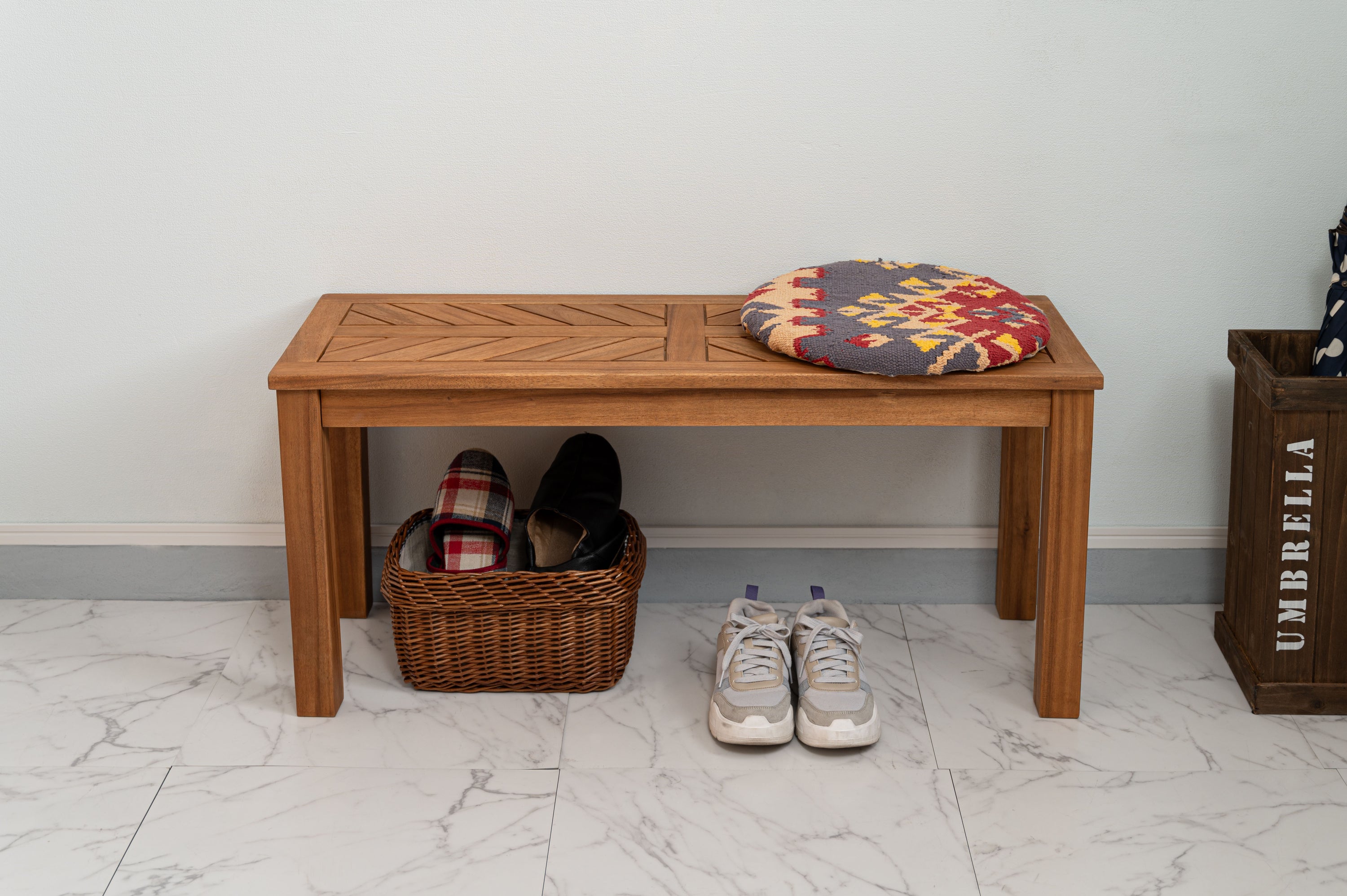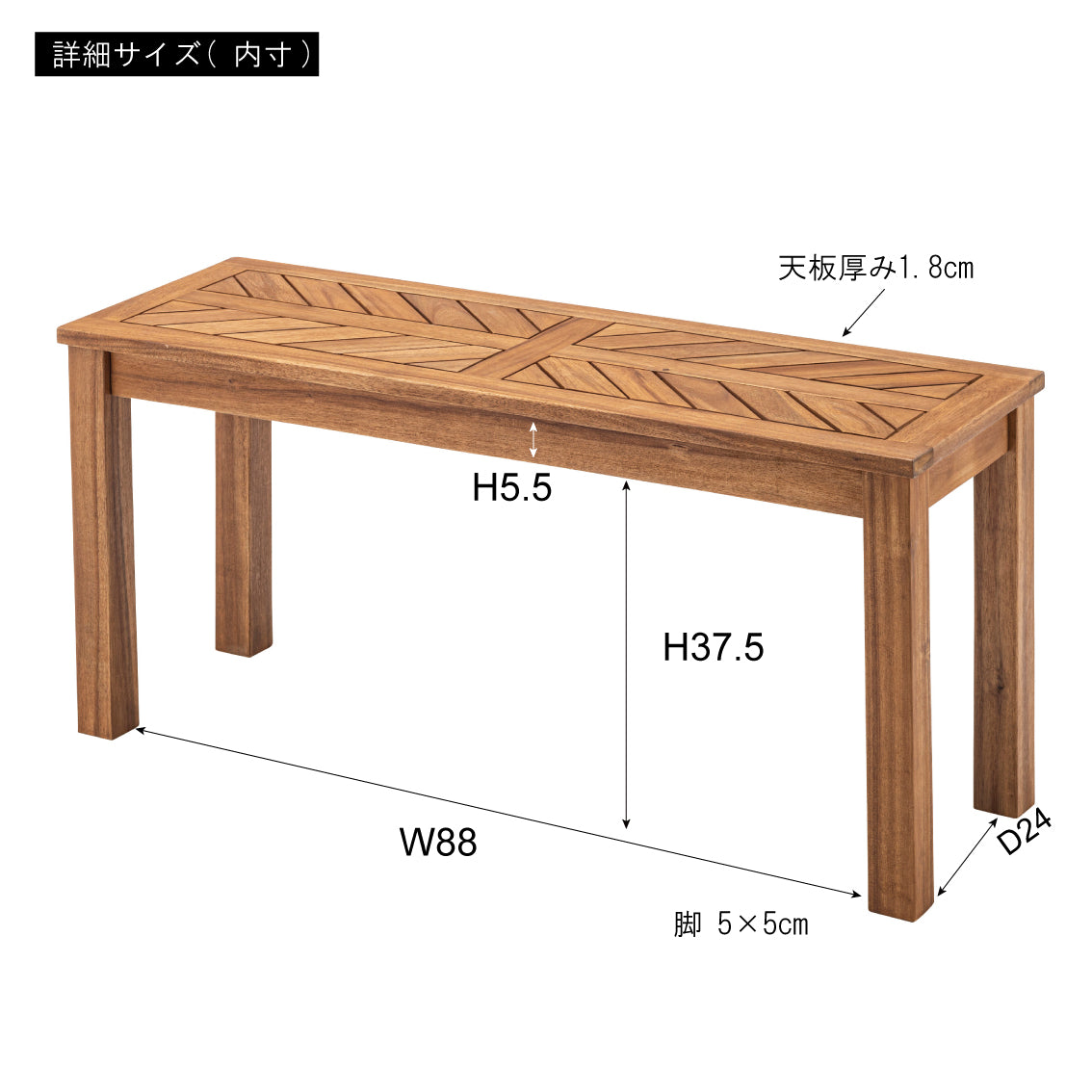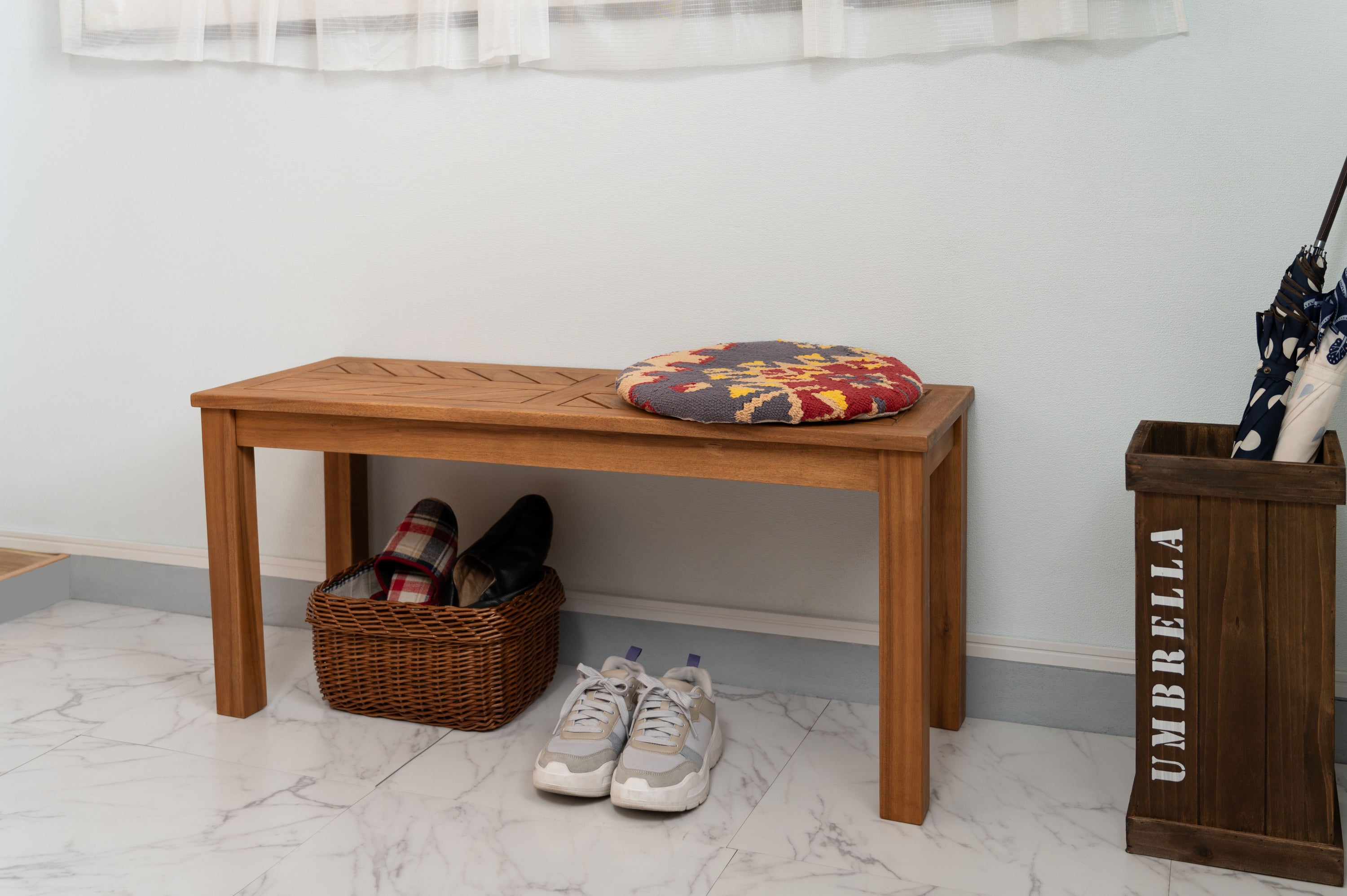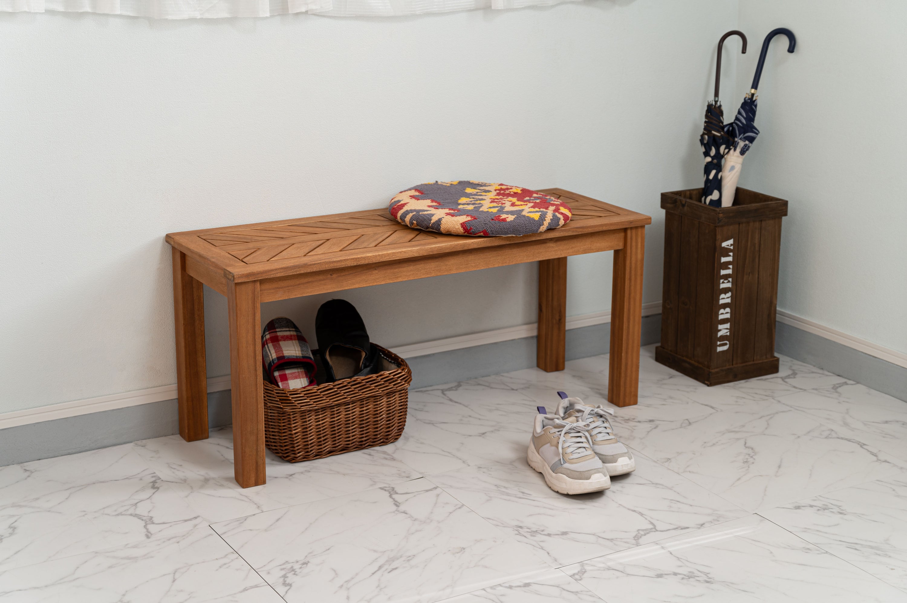 木材の組み合わせでヘリンボーンのような柄を表現した特徴的なベンチ。まっすぐに降りた角脚とディティールはシンプルにデザインされ、ベンチとしてだけでなく飾り棚など、様々なシーンで活躍。座面は、木材を組み合わせて作られたヘリンボーンのような柄が目を引きます。ゆったりと座れるサイズ感は、ダイニングベンチとして最適。エントランスの出入りの際の荷物置きや、靴を履く時のちょっと使いに。座面下も広く、収納ケースやボックス等を置くことも可能。デザイン性のあるベンチなので、飾り棚として置いておくだけでもサマになります。
