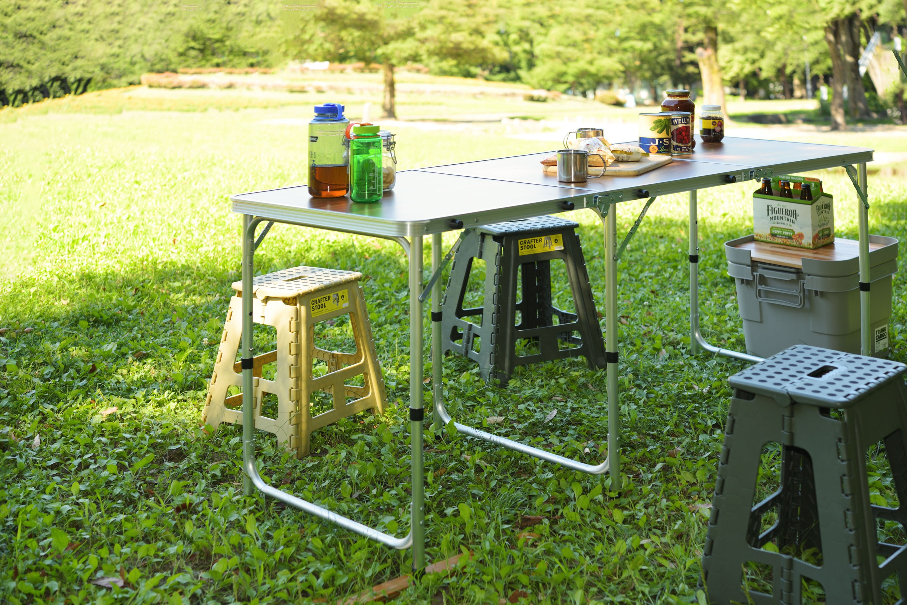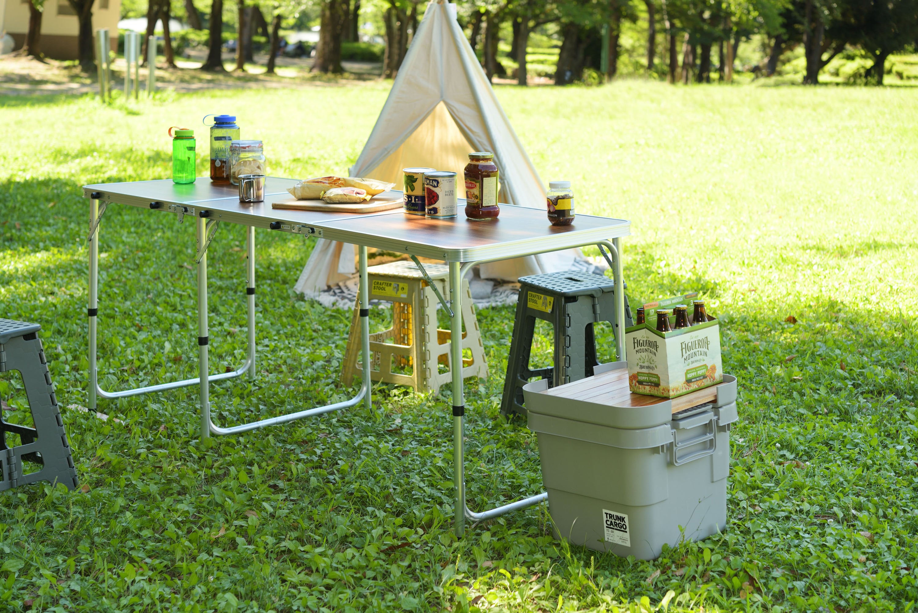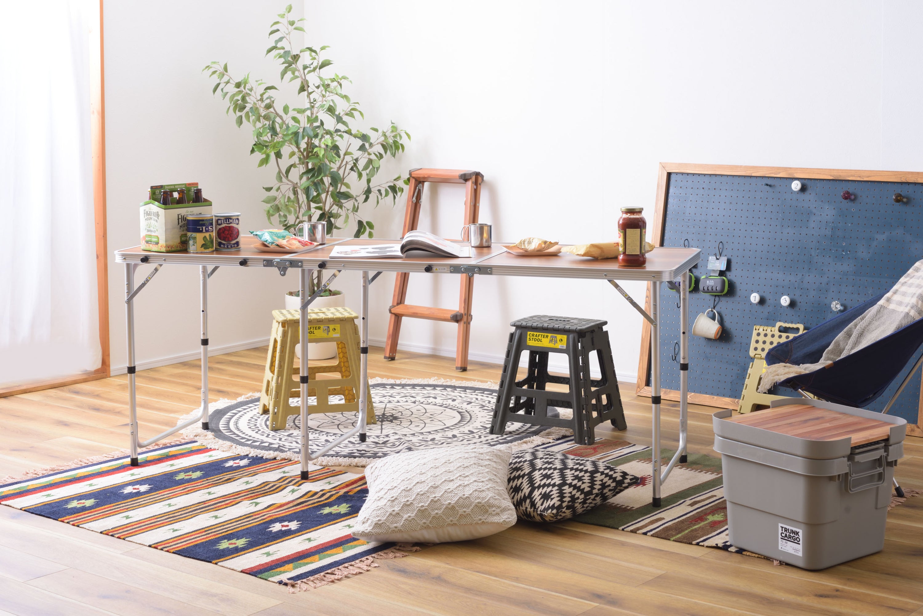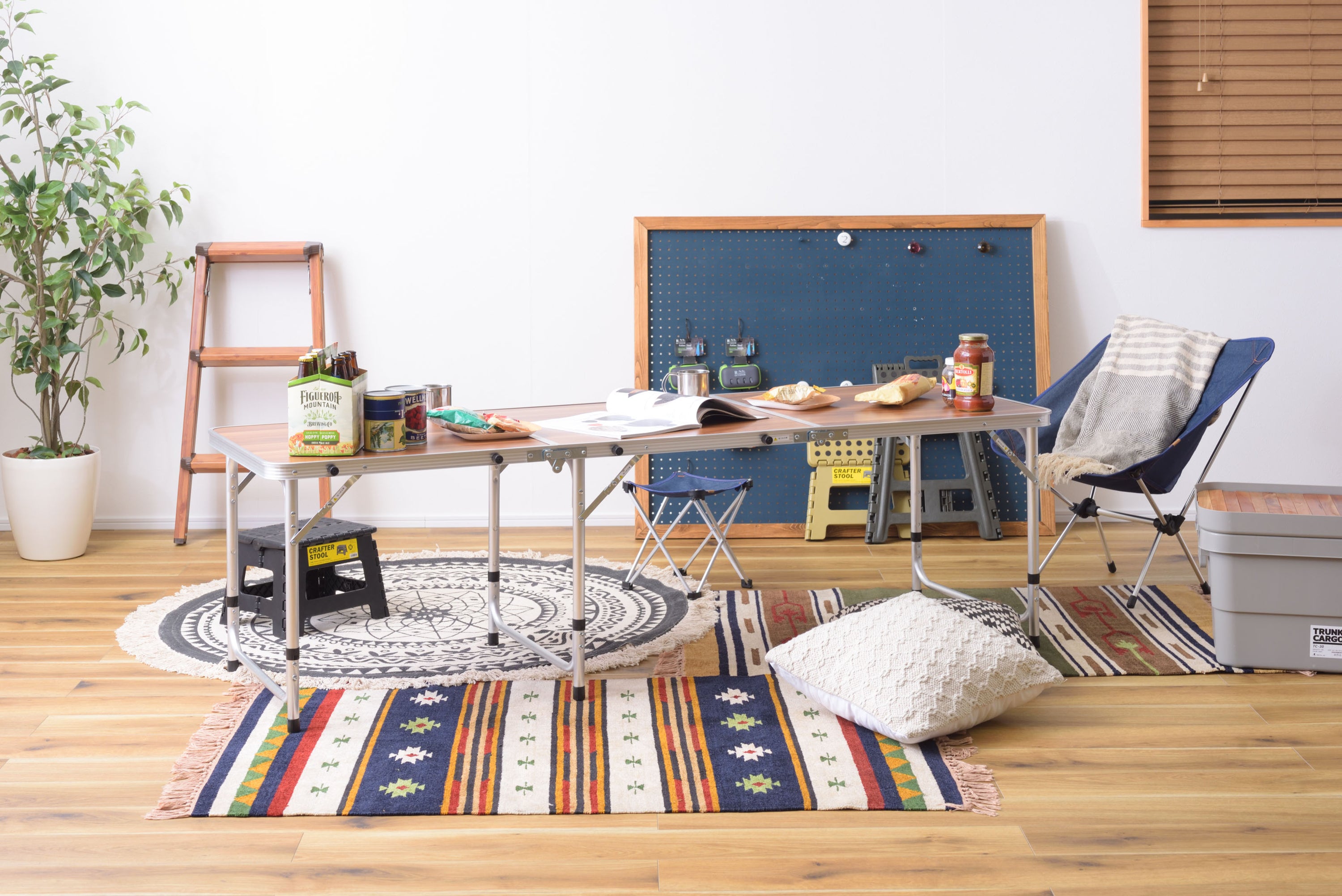 W180の大型フォールディングテーブル。 アウトドアはもちろん、ちょっとした会議や作業台、 イベントの受け付け用としても使えます。 3等分に折れ曲がりコンパクトになるので手軽に持ち運びができ、 場所を取らず収納ができます。高さも3段階調節ができますので 高さが異なるチェア、スツールなどに合わせることが可能です。
