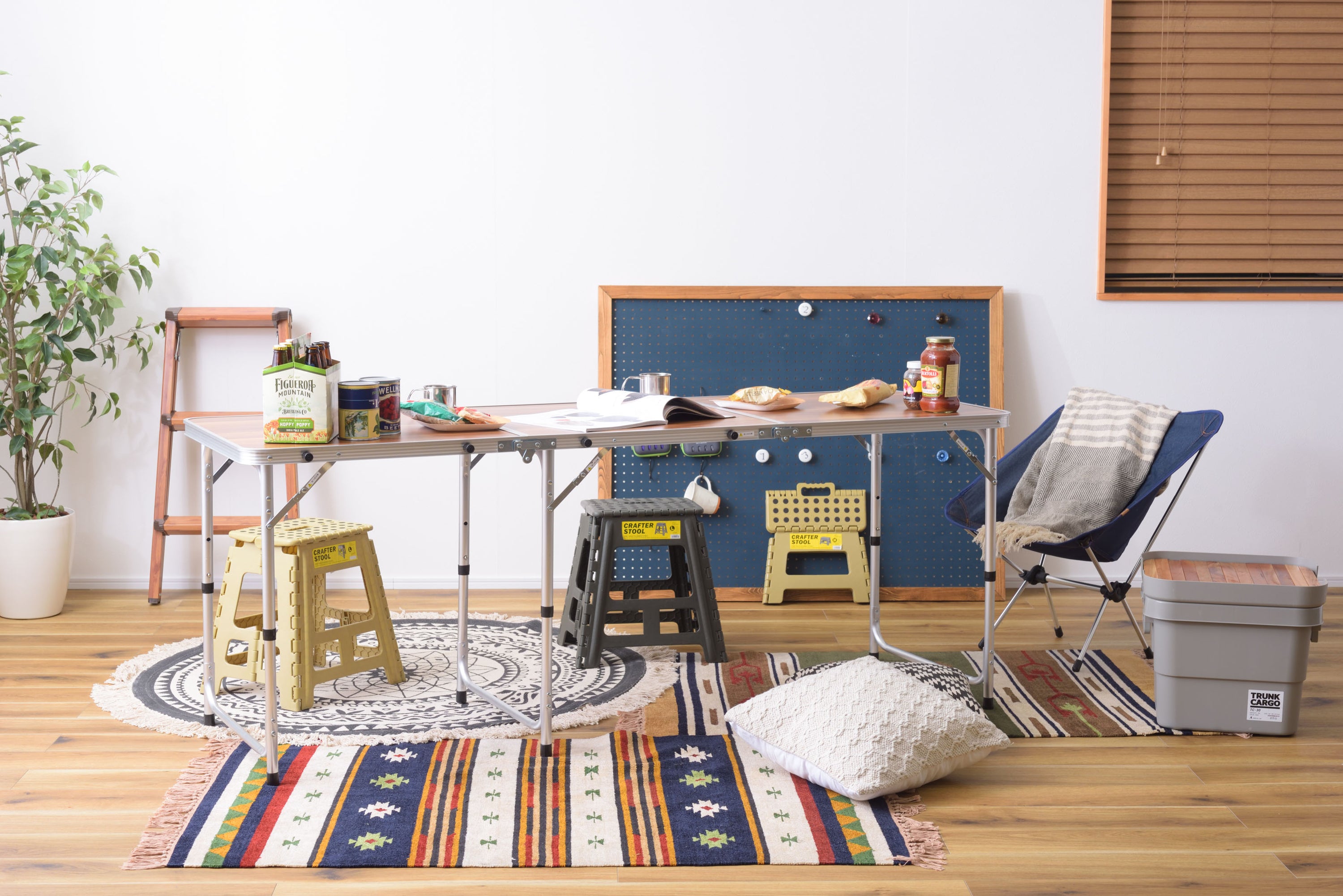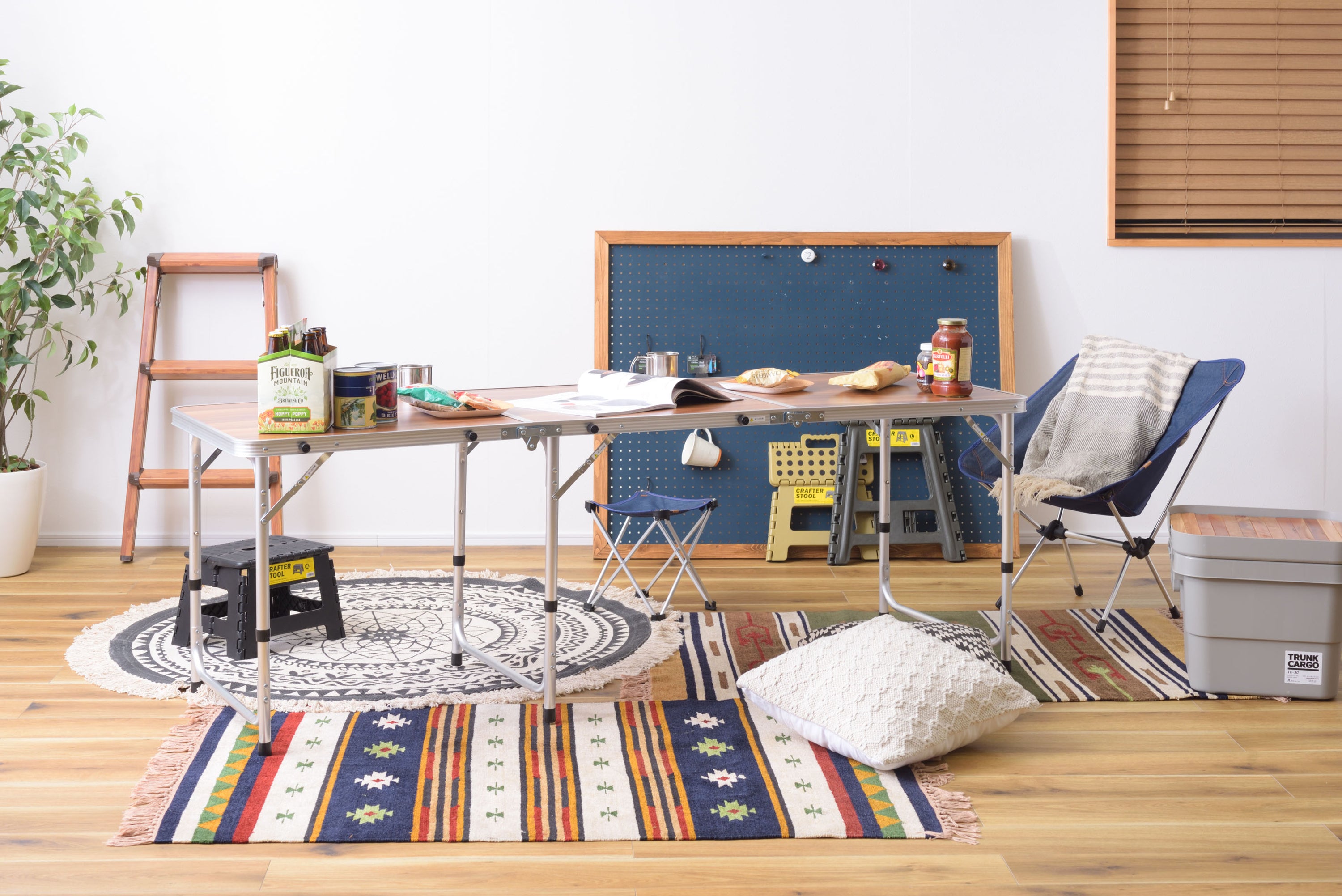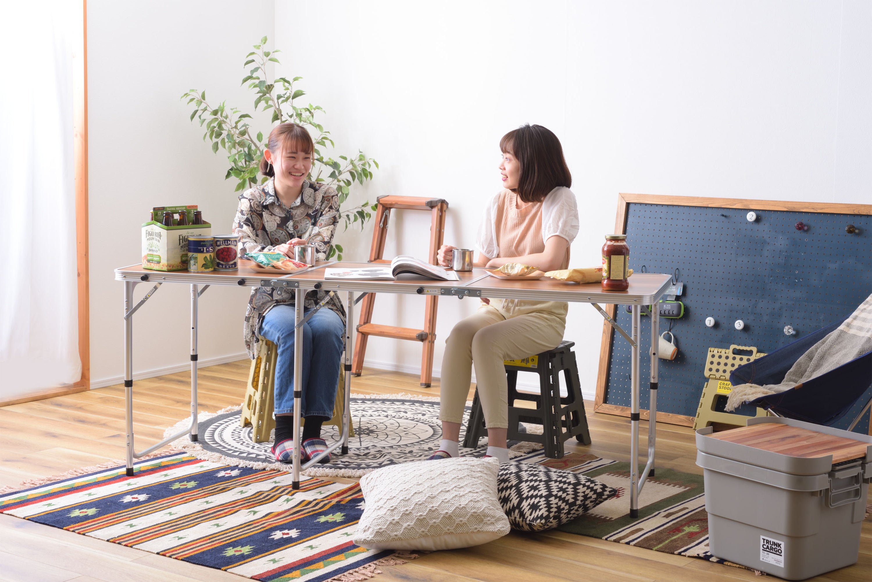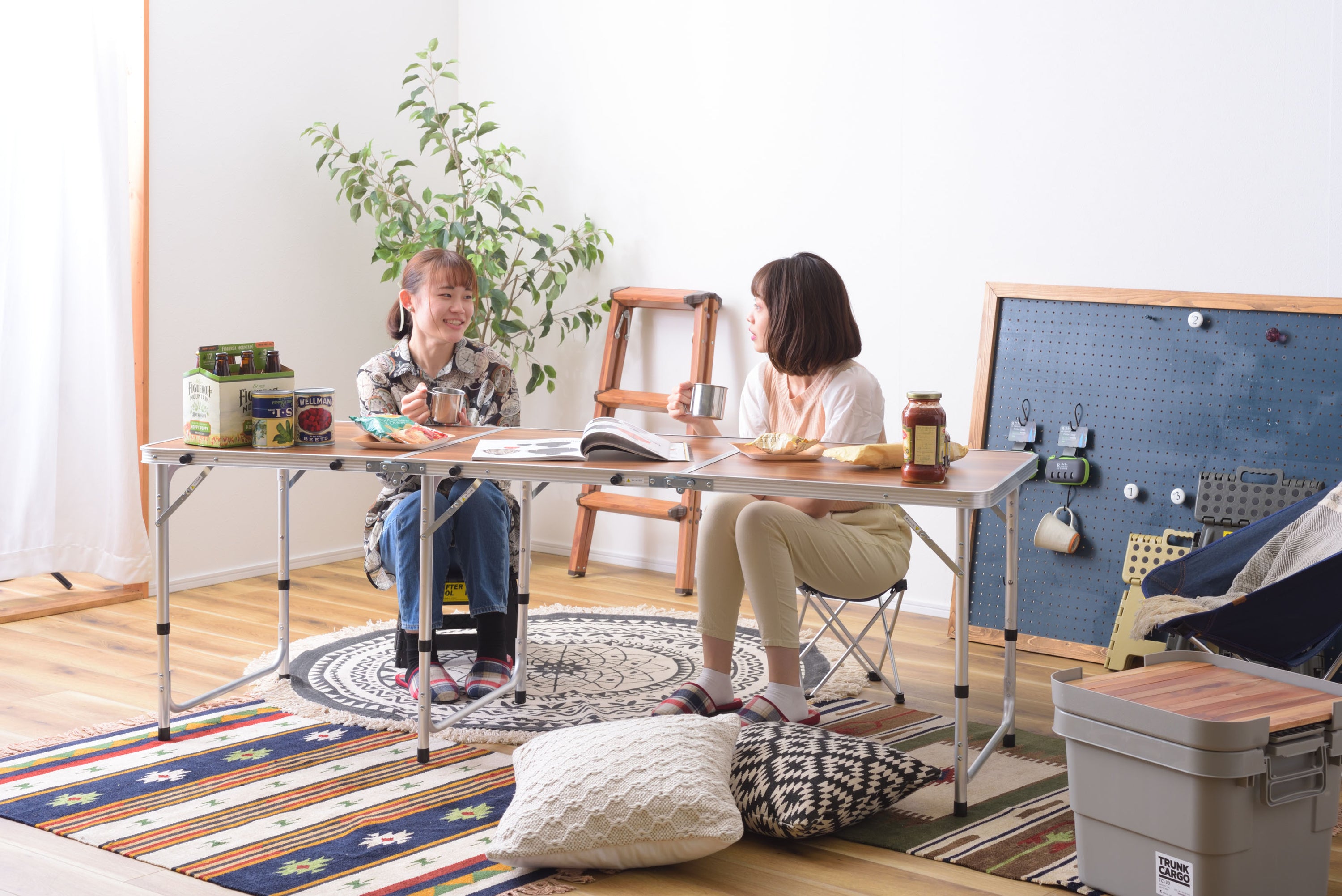 W180の大型フォールディングテーブル。 アウトドアはもちろん、ちょっとした会議や作業台、 イベントの受け付け用としても使えます。 3等分に折れ曲がりコンパクトになるので手軽に持ち運びができ、 場所を取らず収納ができます。高さも3段階調節ができますので 高さが異なるチェア、スツールなどに合わせることが可能です。