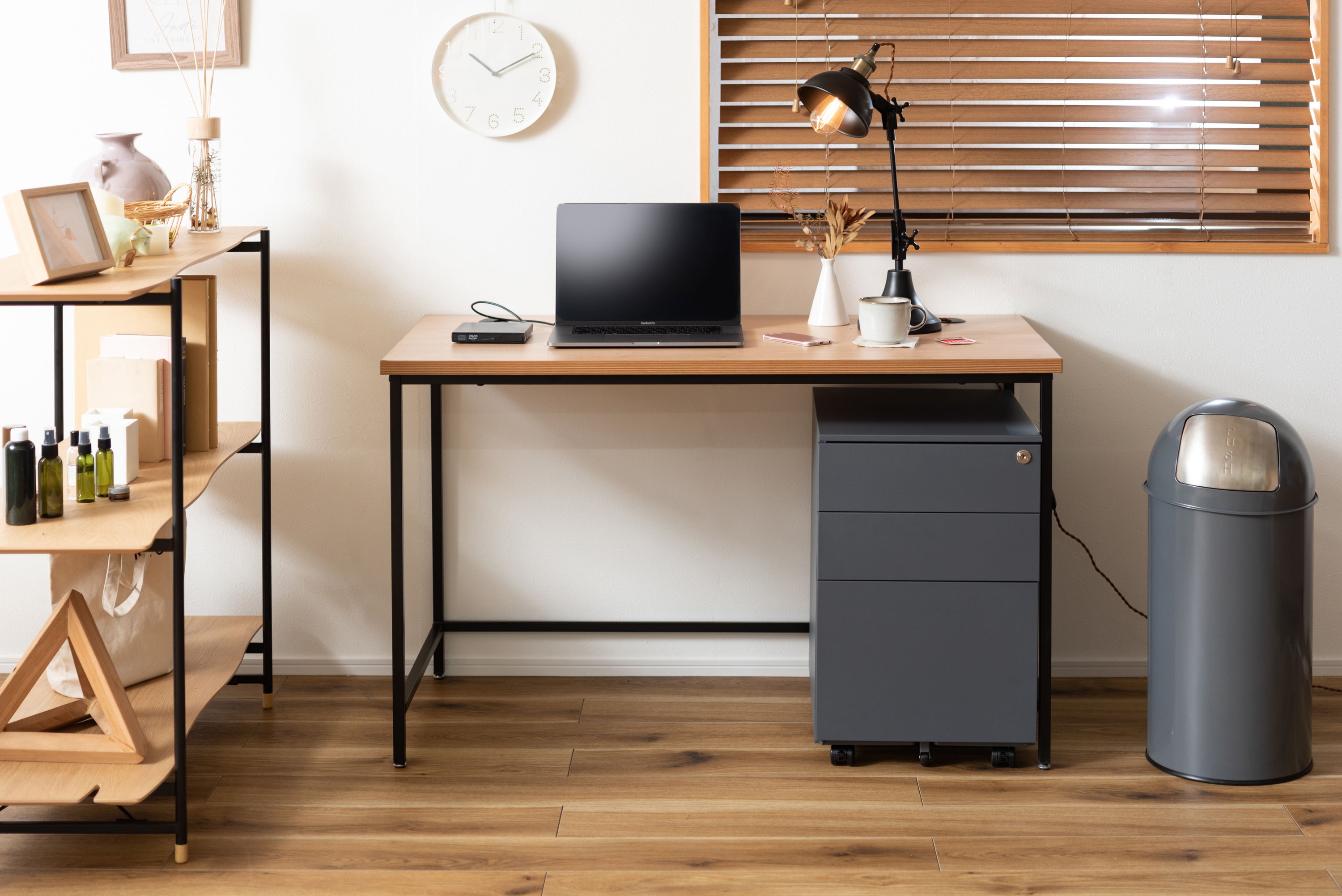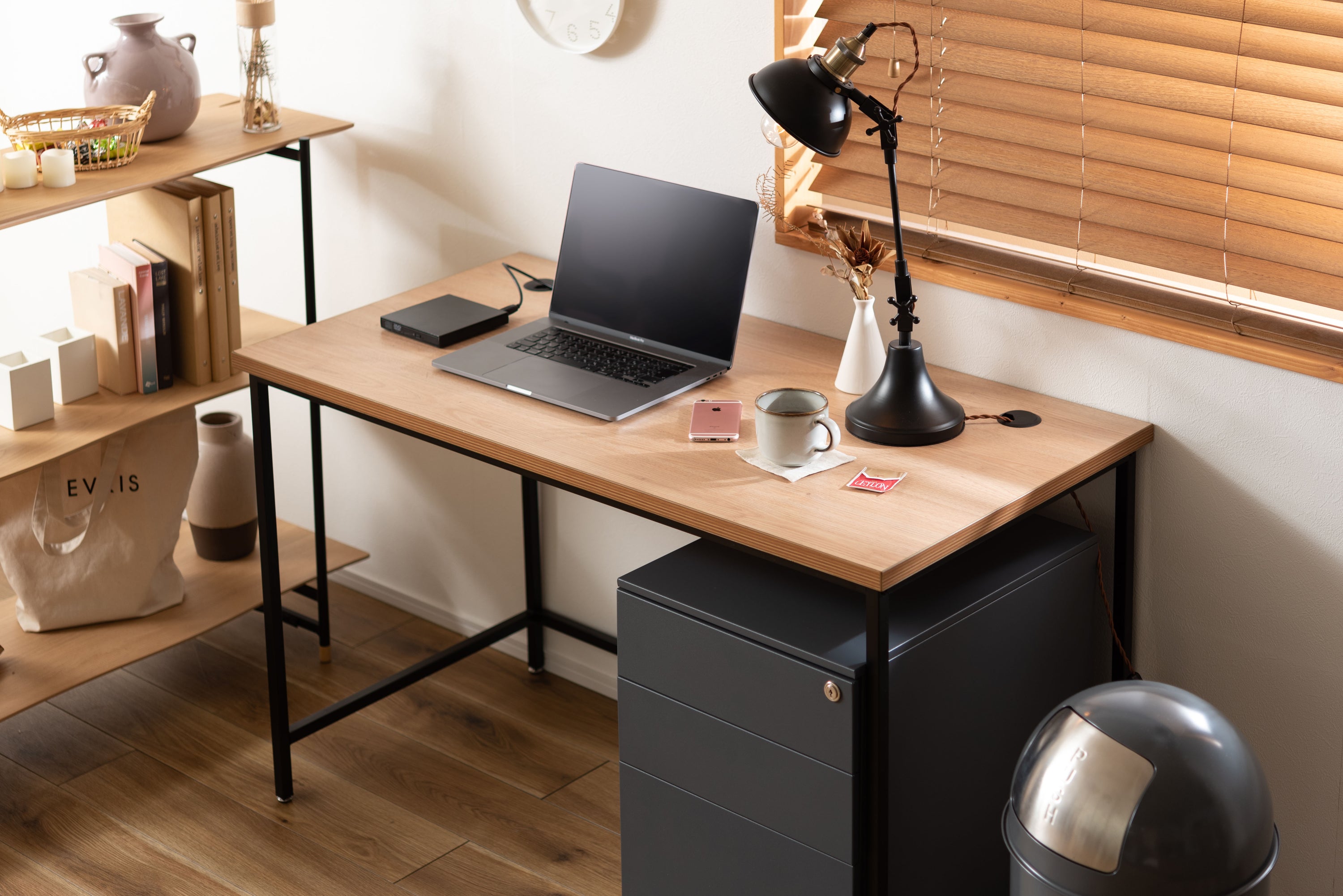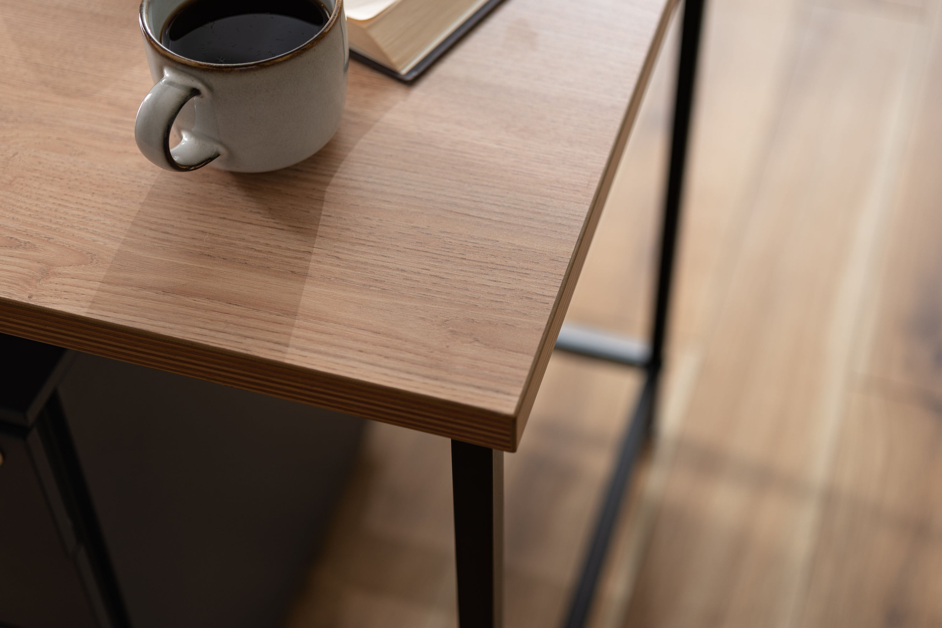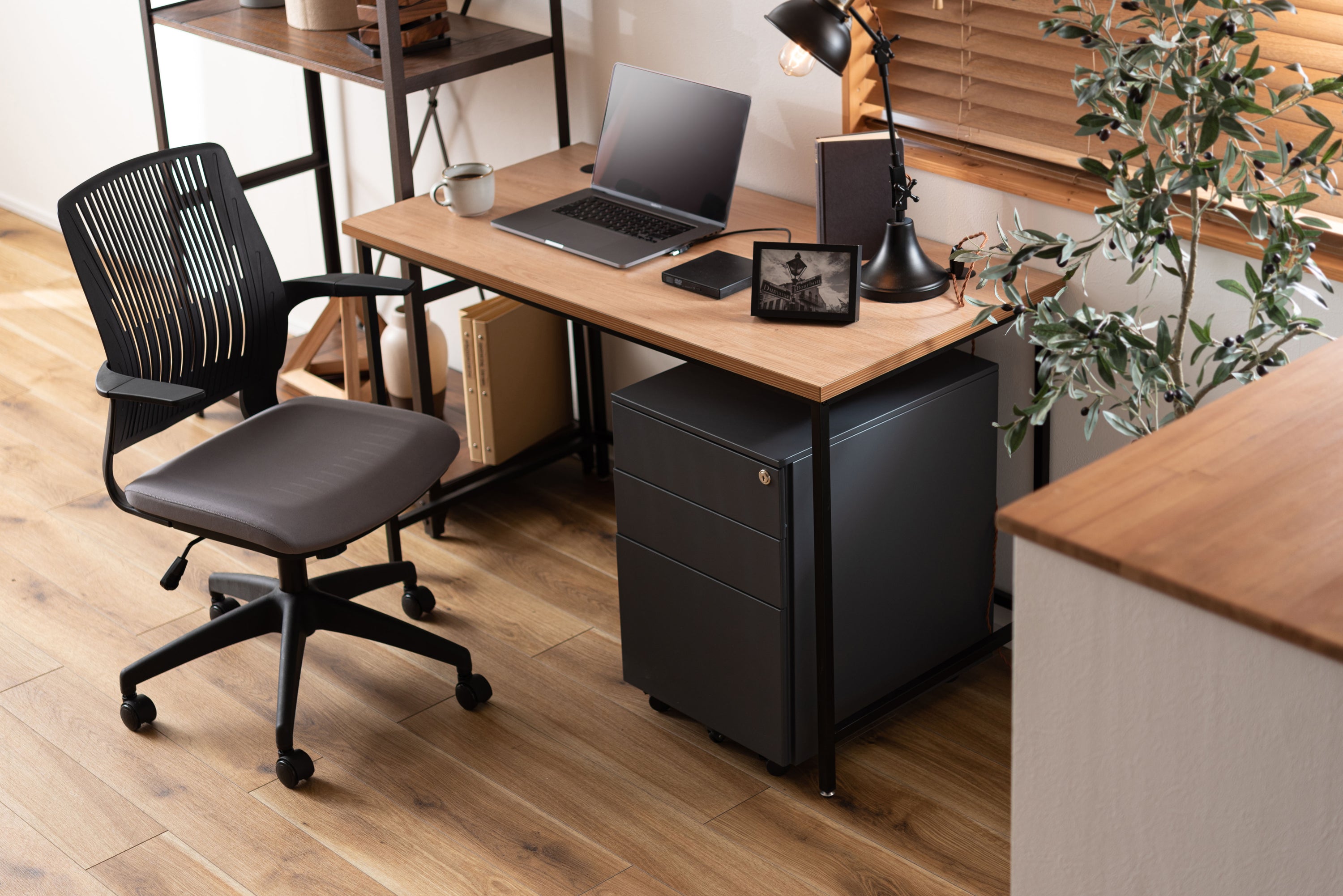 シンプルでスタイリッシュなデスクが登場。すっきりとしたデスクと鍵付きで多機能なワゴンの組み合わせで快適なオフィスライフを実現します。 デスクは強度の高い木目調のメラミンシートを採用。お手入れも簡単でいつでも清潔な状態をキープする事ができて安心です。フチ部分は積層合板のシートでアクセントを入れたこだわりデザイン。天板の左右にコード穴を付けてあるので、配線処理も楽に行なえます。
