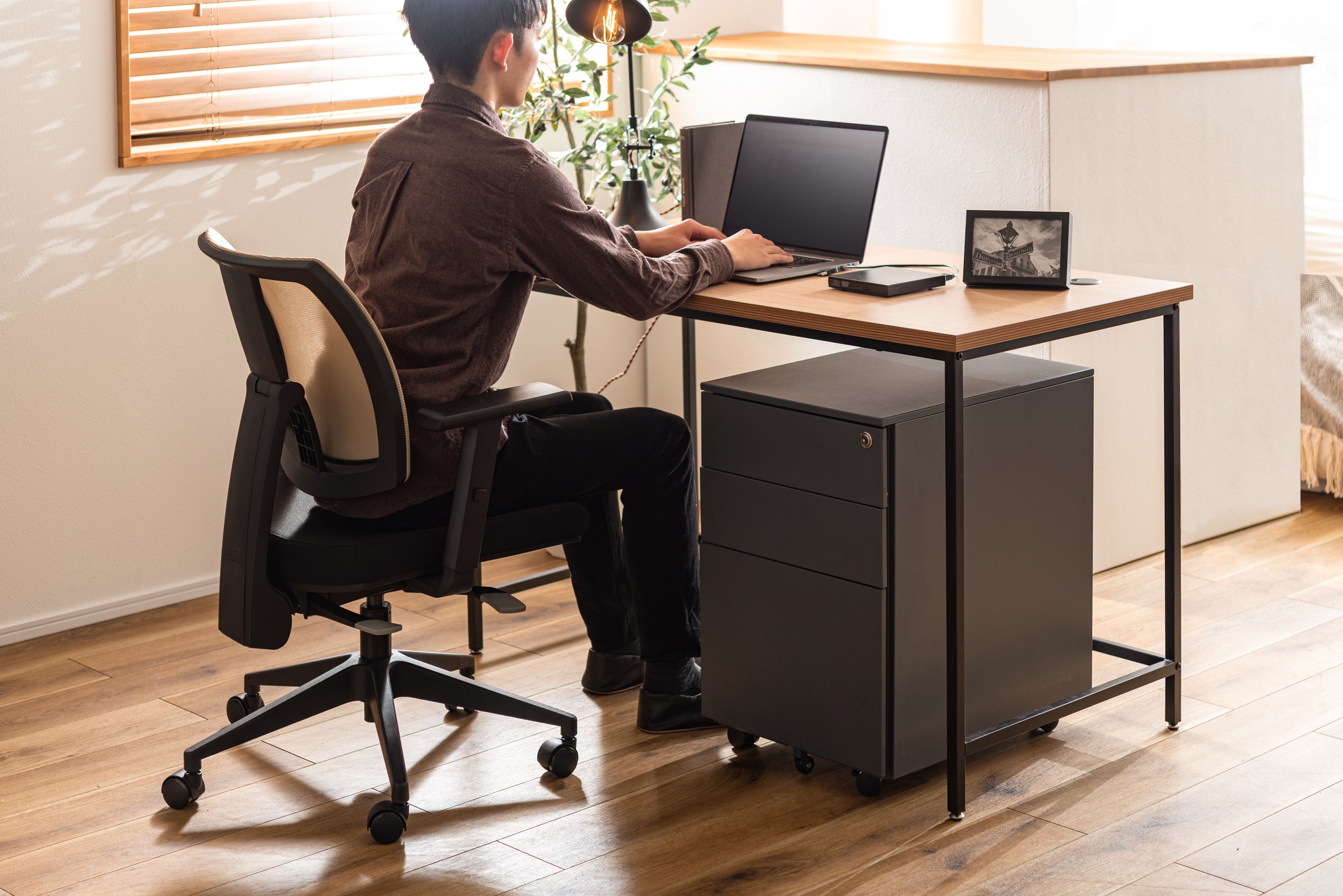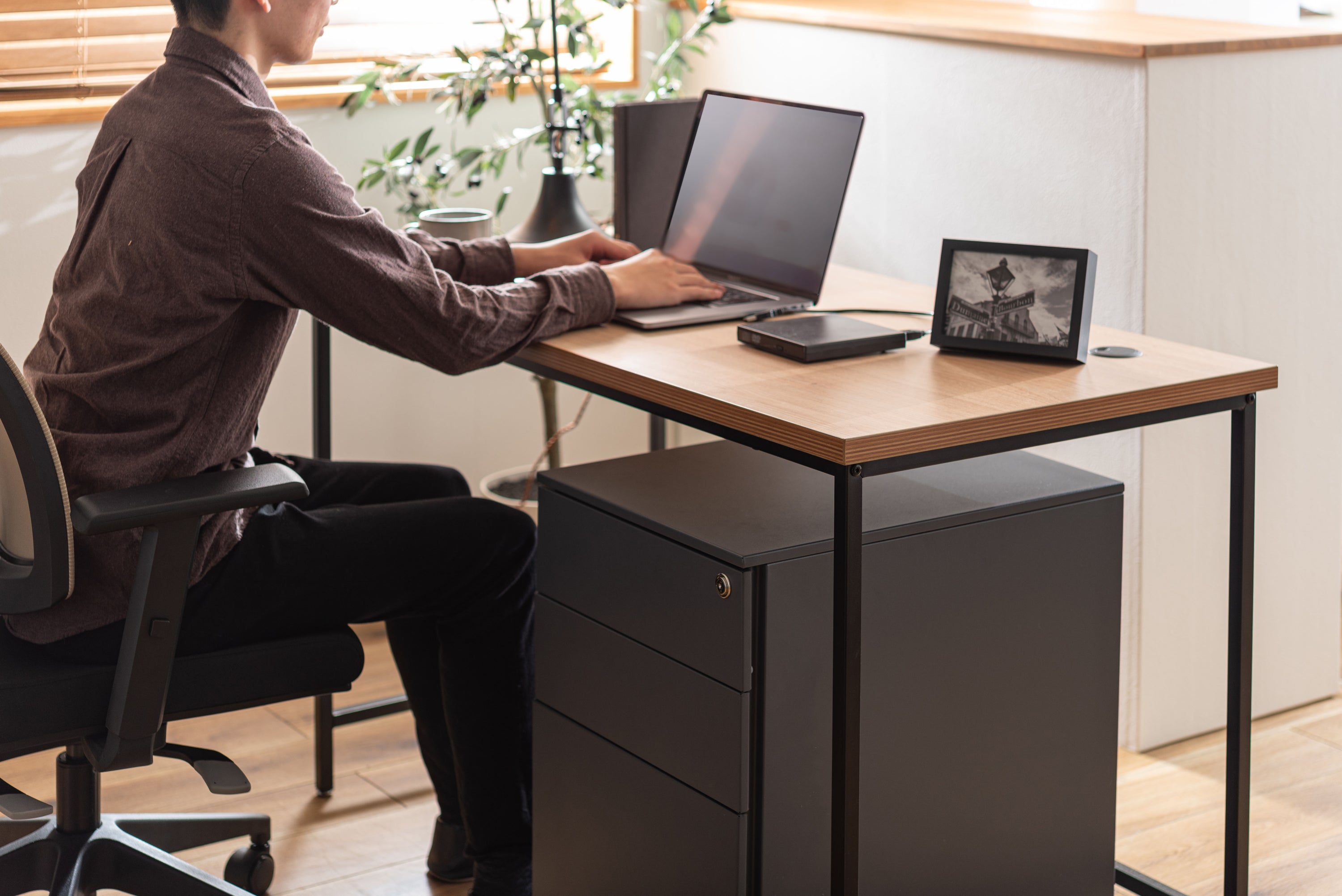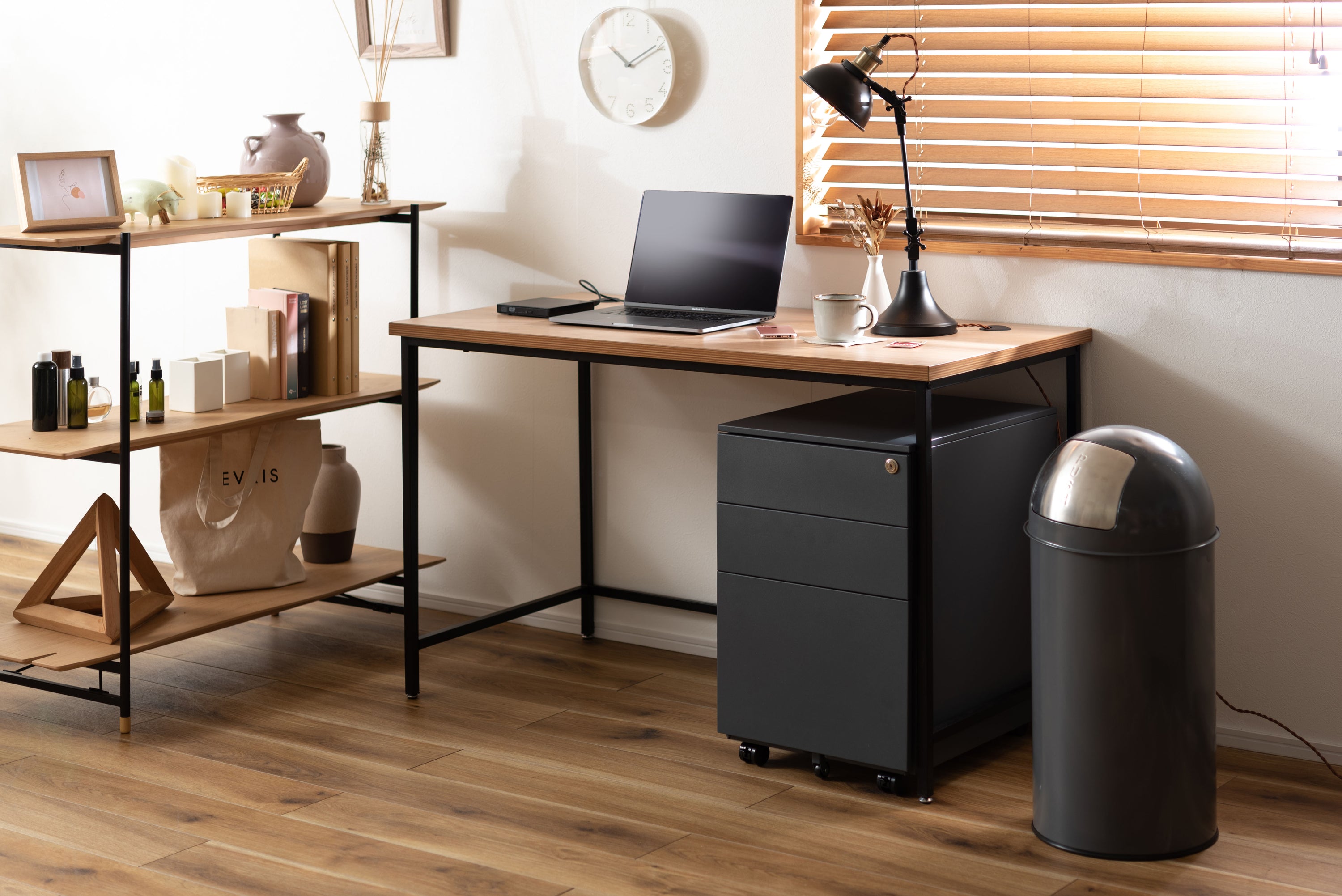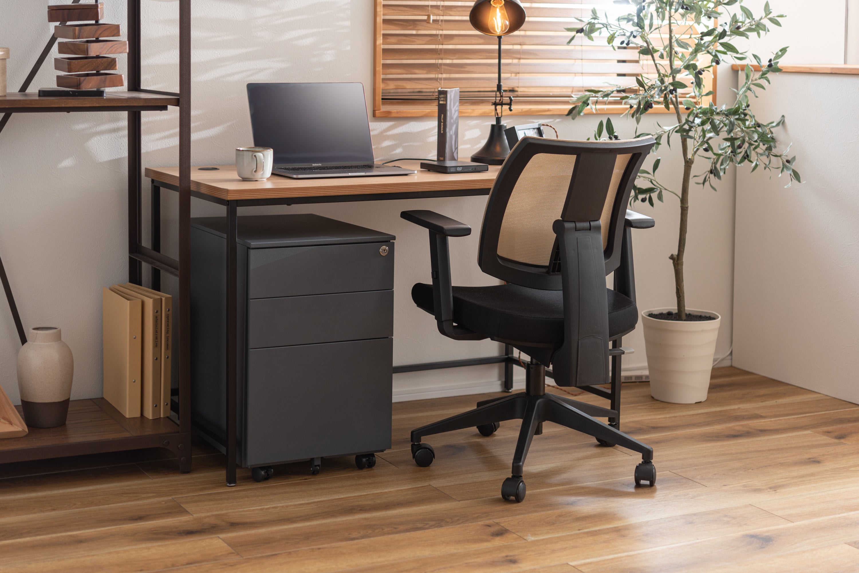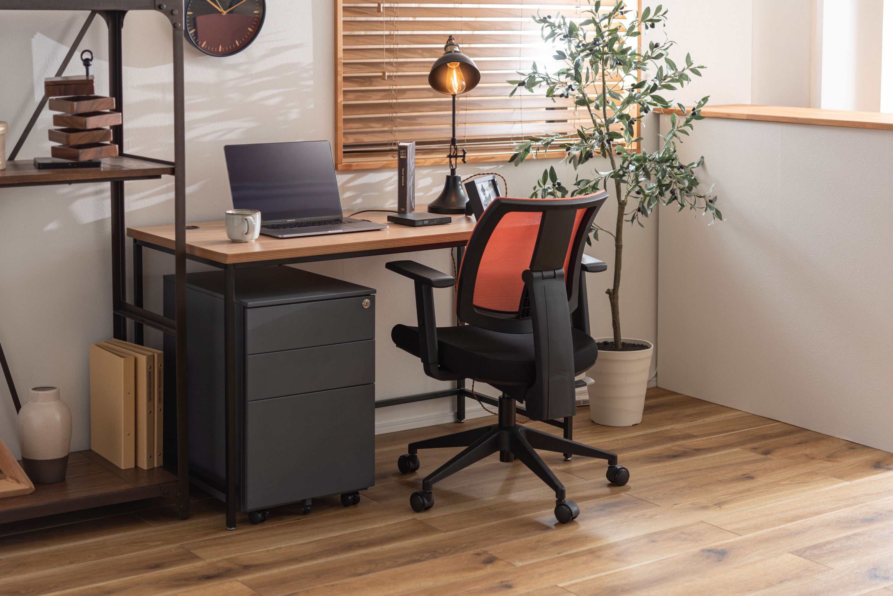シンプルでスタイリッシュなデスクが登場。すっきりとしたデスクと鍵付きで多機能なワゴンの組み合わせで快適なオフィスライフを実現します。 デスクは強度の高い木目調のメラミンシートを採用。お手入れも簡単でいつでも清潔な状態をキープする事ができて安心です。フチ部分は積層合板のシートでアクセントを入れたこだわりデザイン。天板の左右にコード穴を付けてあるので、配線処理も楽に行なえます。
