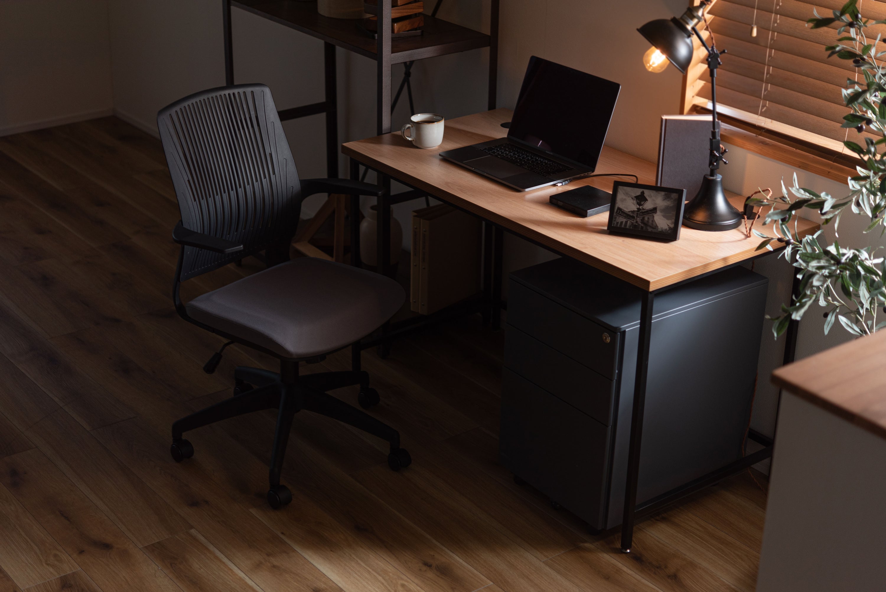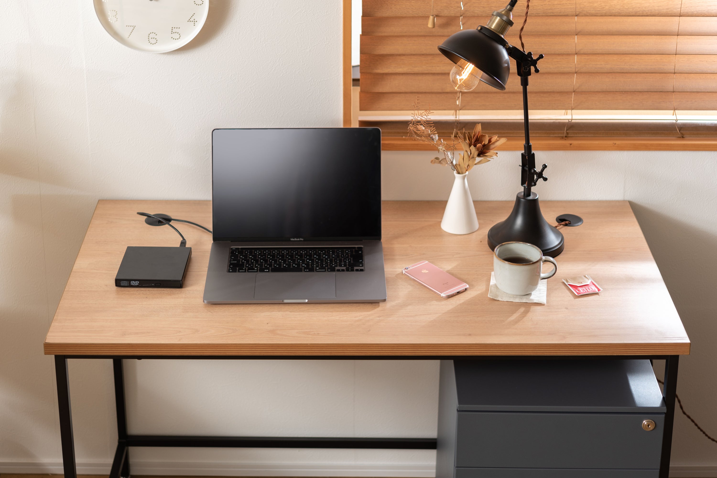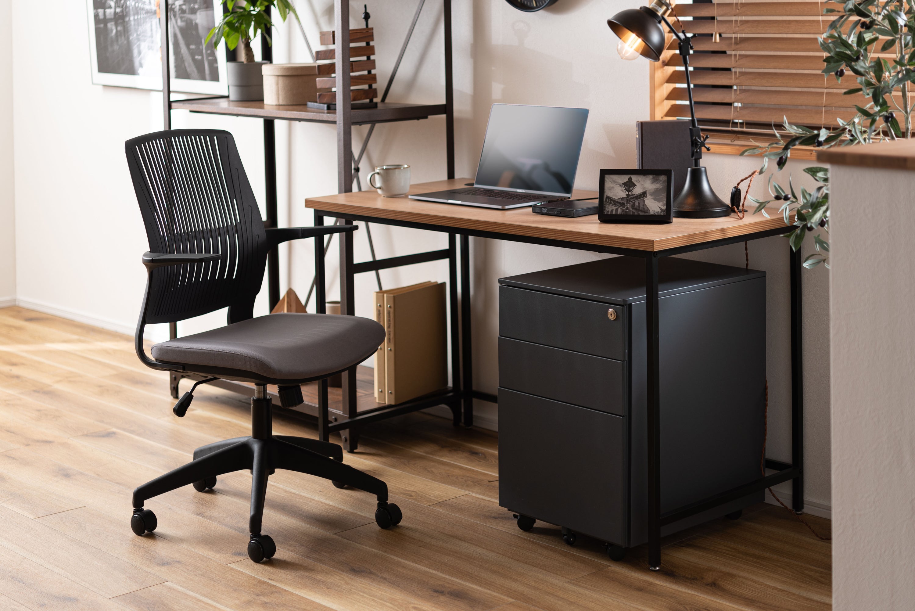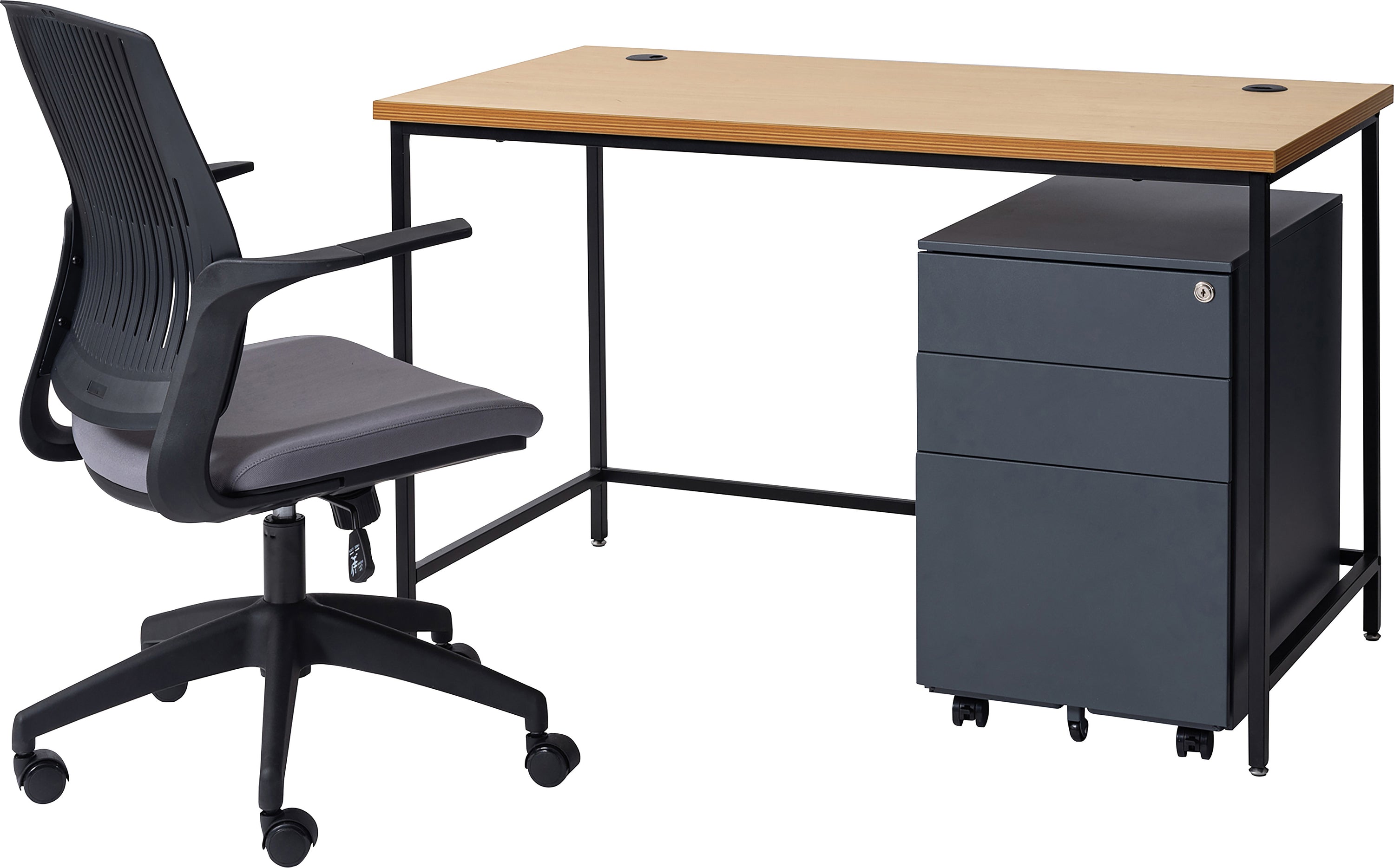 シンプルでスタイリッシュなデスクが登場。すっきりとしたデスクと鍵付きで多機能なワゴンの組み合わせで快適なオフィスライフを実現します。 デスクは強度の高い木目調のメラミンシートを採用。お手入れも簡単でいつでも清潔な状態をキープする事ができて安心です。フチ部分は積層合板のシートでアクセントを入れたこだわりデザイン。天板の左右にコード穴を付けてあるので、配線処理も楽に行なえます。