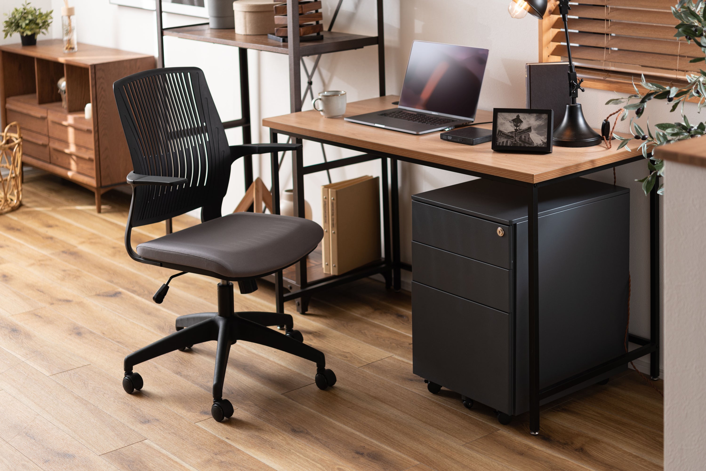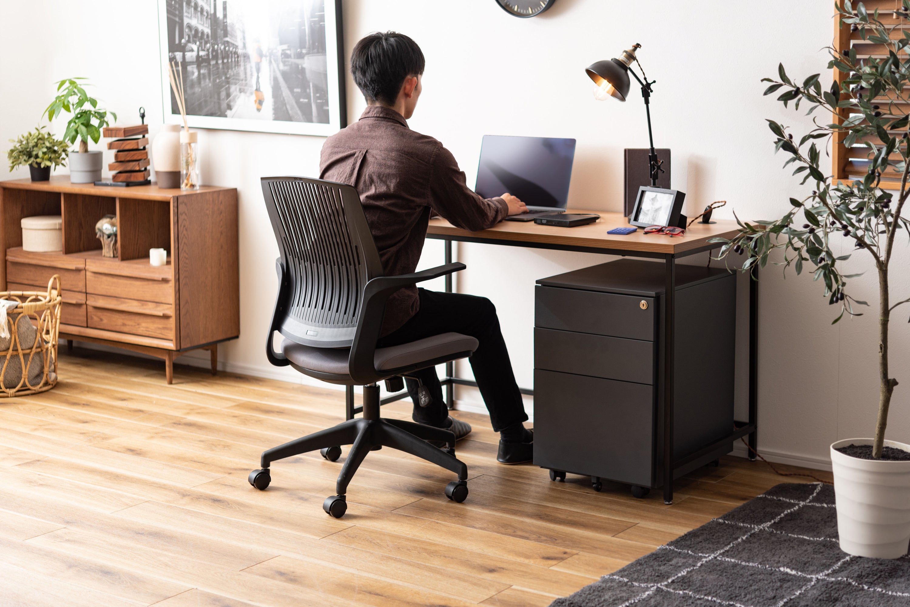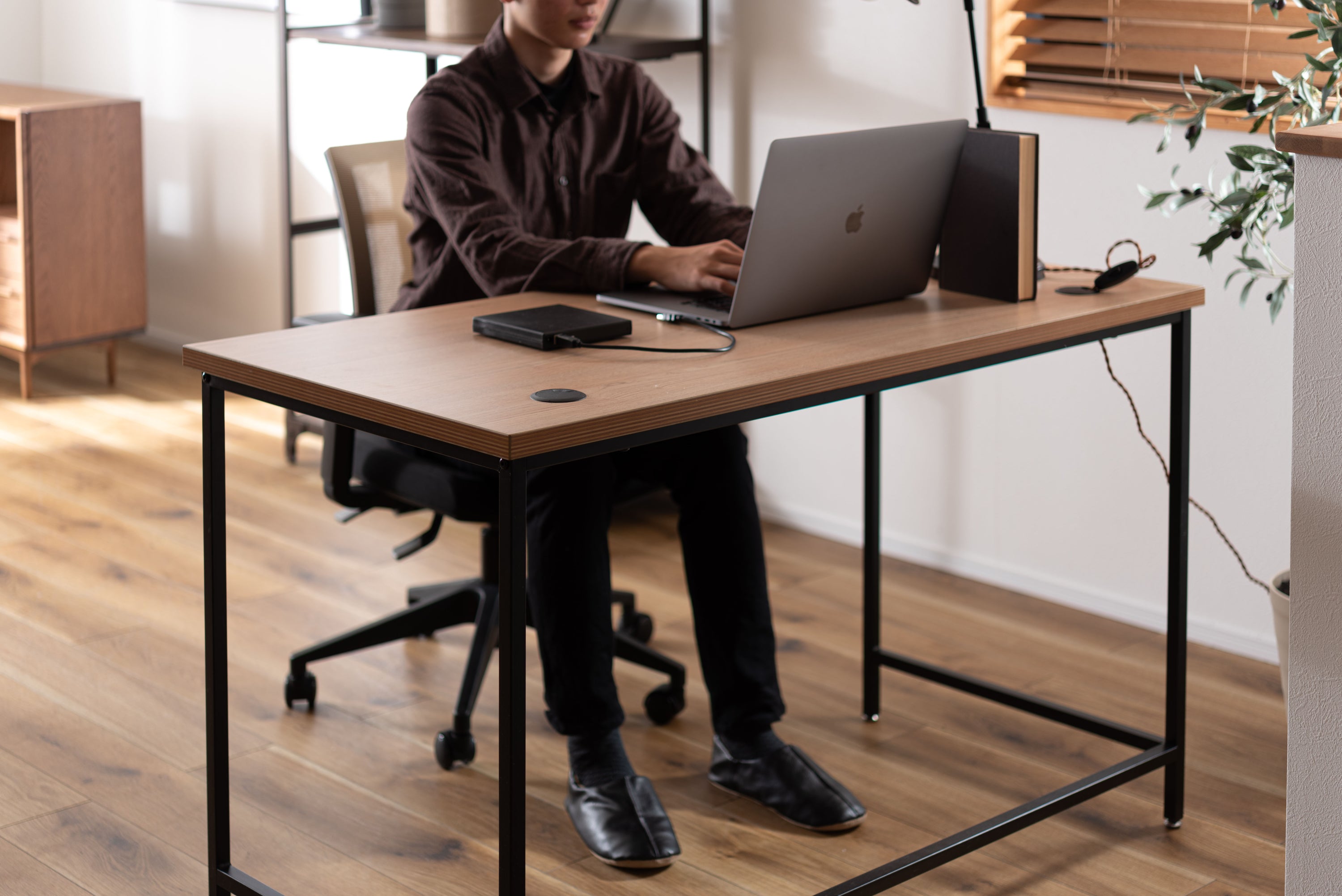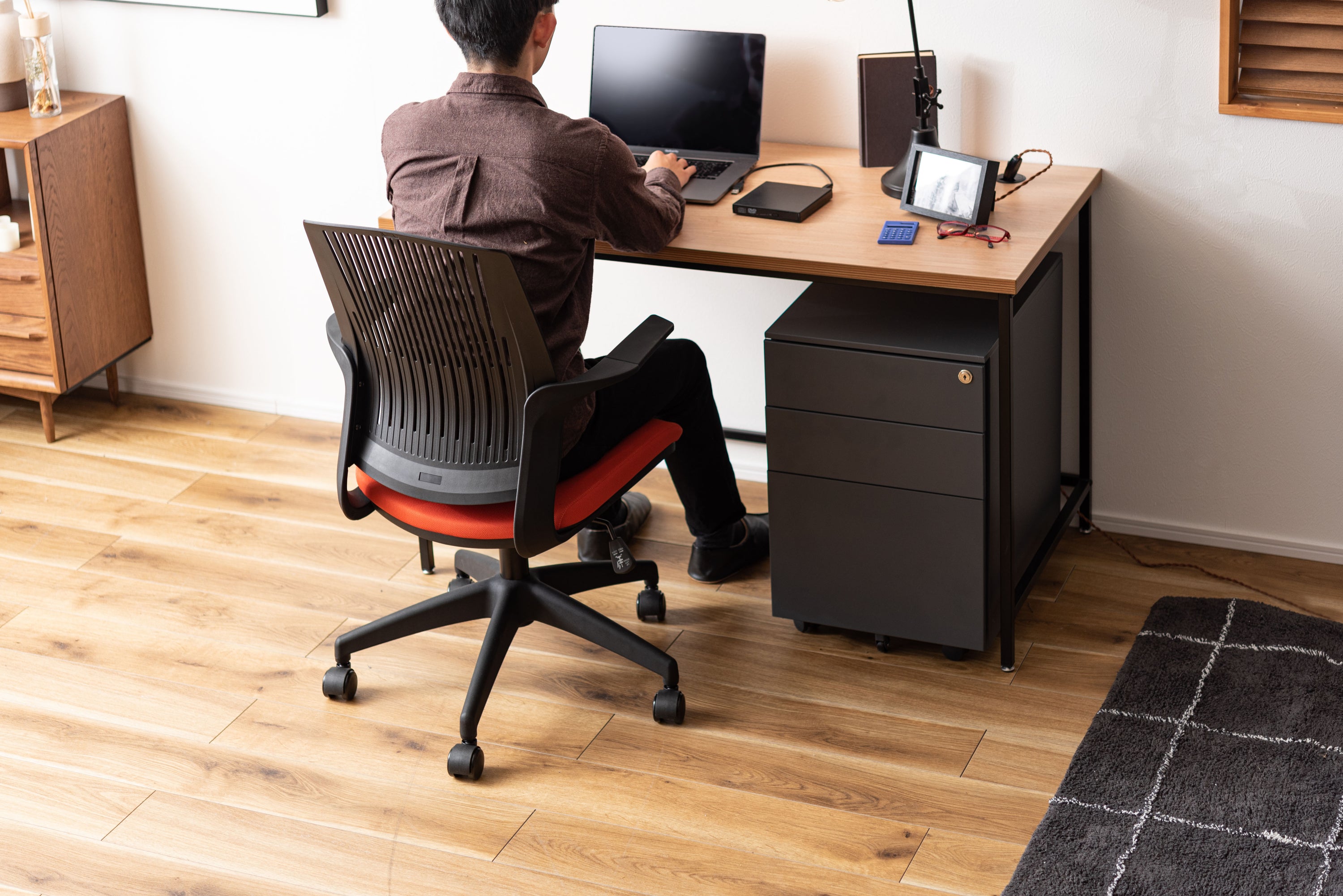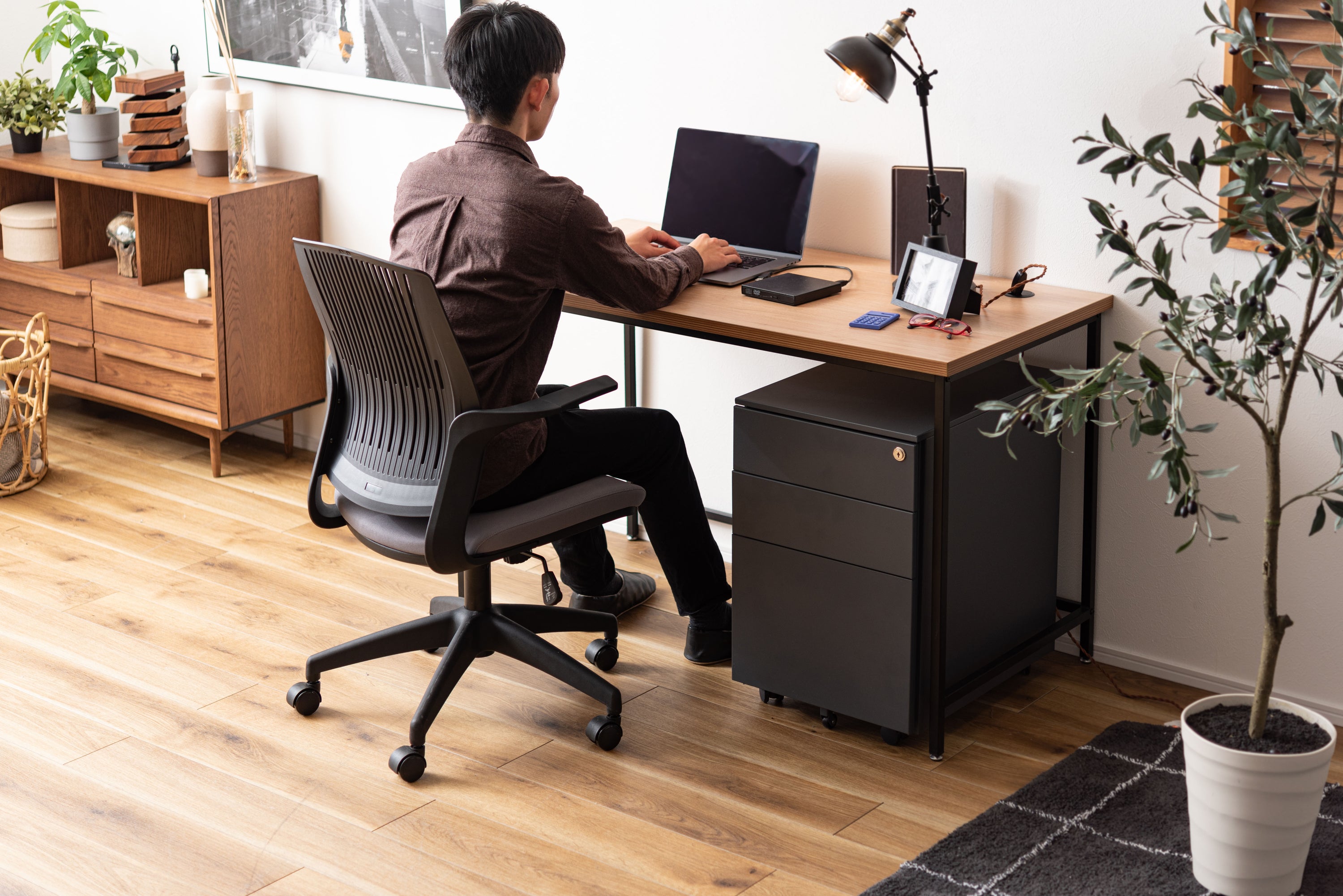 シンプルでスタイリッシュなデスクが登場。すっきりとしたデスクと鍵付きで多機能なワゴンの組み合わせで快適なオフィスライフを実現します。 デスクは強度の高い木目調のメラミンシートを採用。お手入れも簡単でいつでも清潔な状態をキープする事ができて安心です。フチ部分は積層合板のシートでアクセントを入れたこだわりデザイン。天板の左右にコード穴を付けてあるので、配線処理も楽に行なえます。