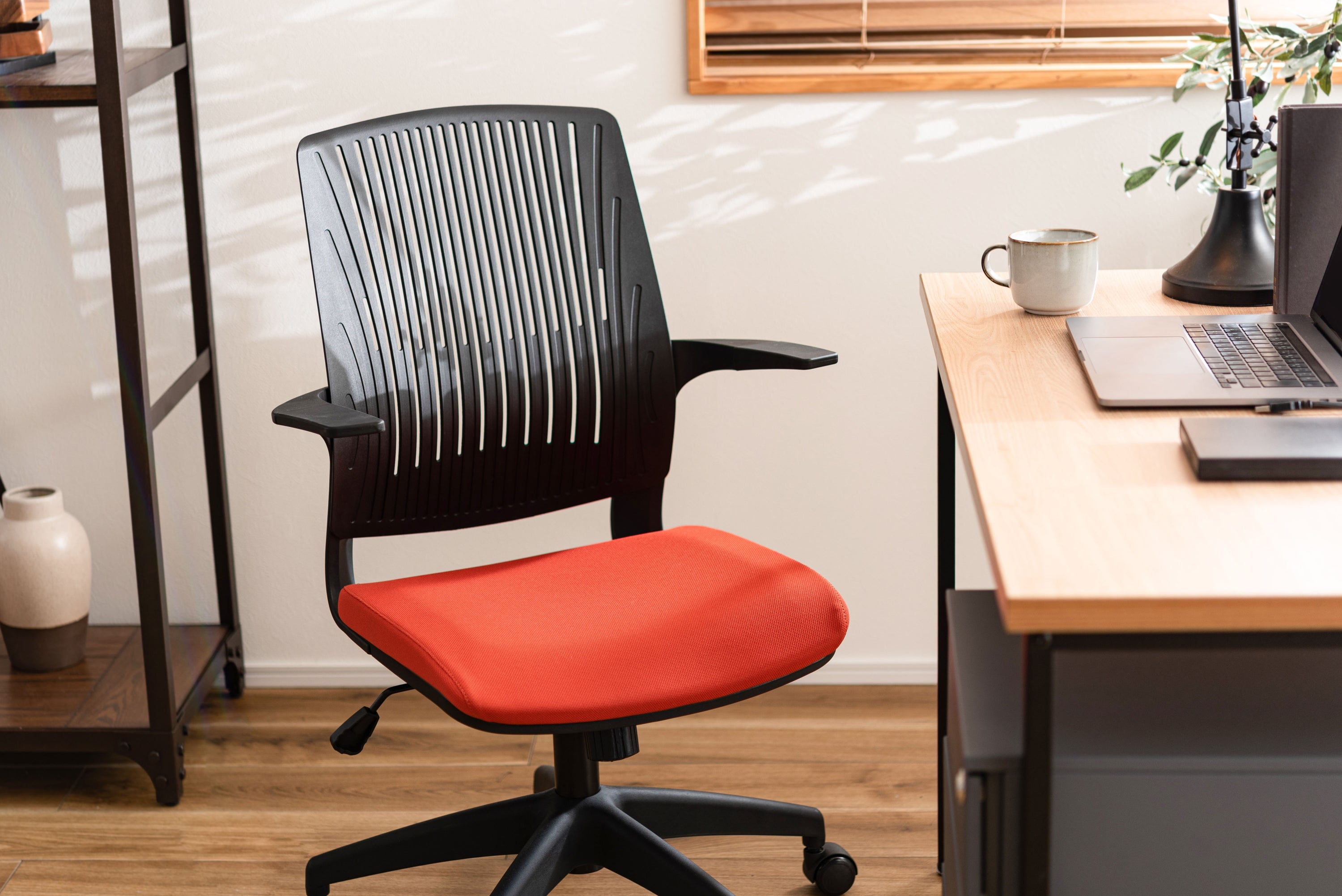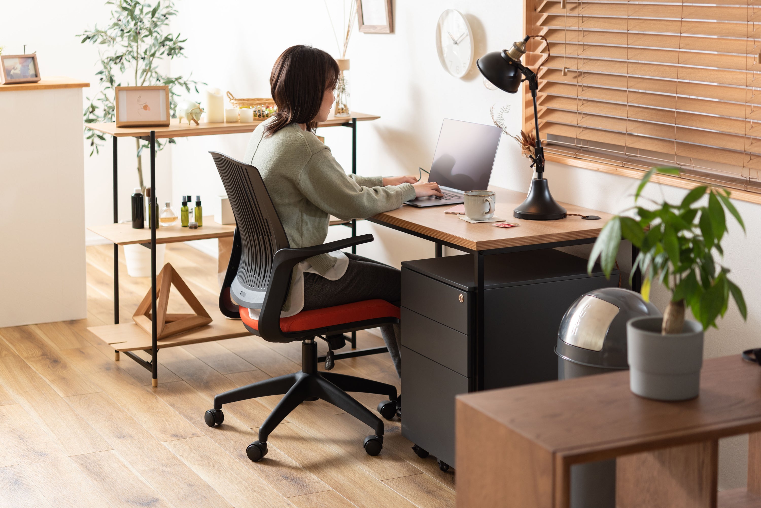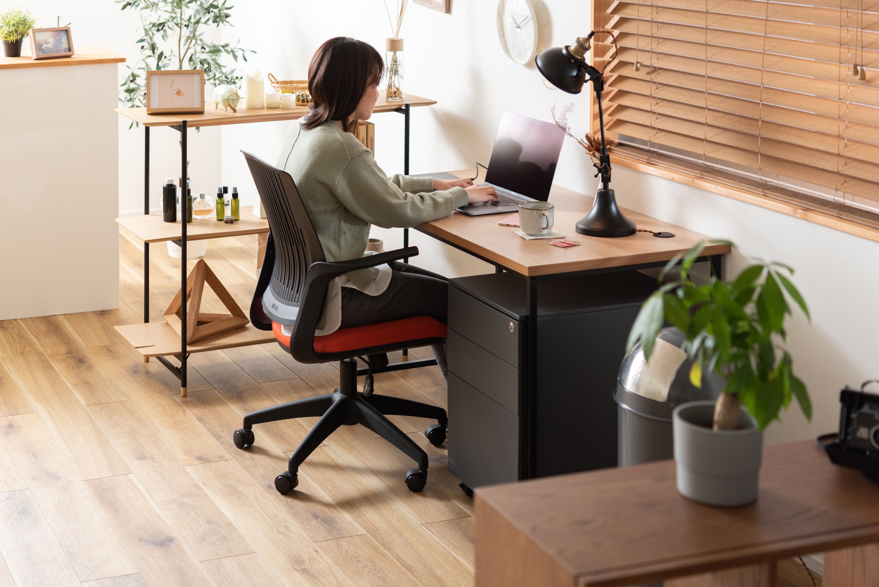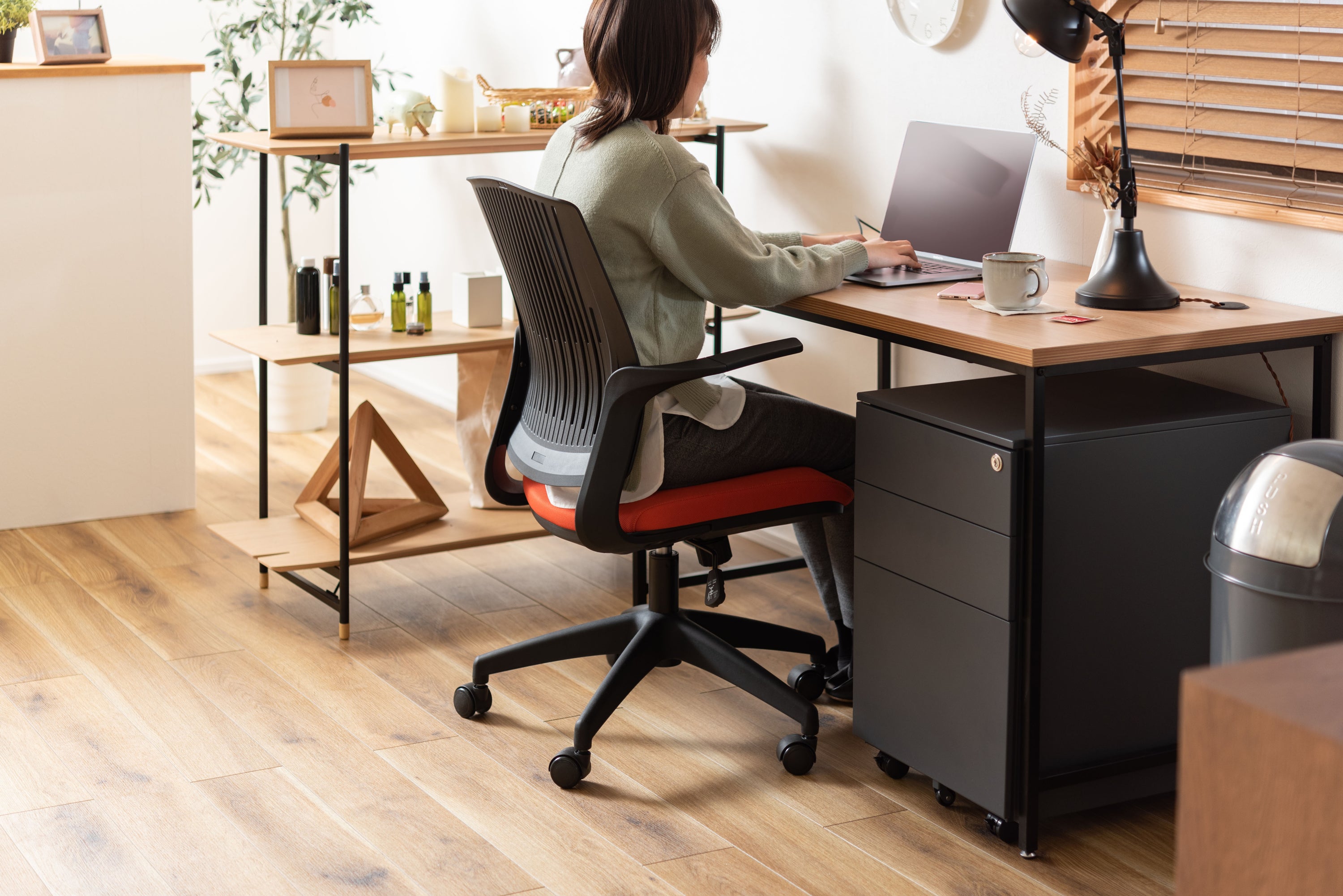 背もたれが背中に合わせて形状が変わるオフィスチェア。背もたれの特殊加工により座りながら背中をぐっと反らせることができるので、作業中にストレッチ&リフレッシュができます。カラーリングもブラックフレームベースで3色、ホワイトフレームベースで3色の合計6色のラインナップなので、様々なテイストに合わせる事ができます。