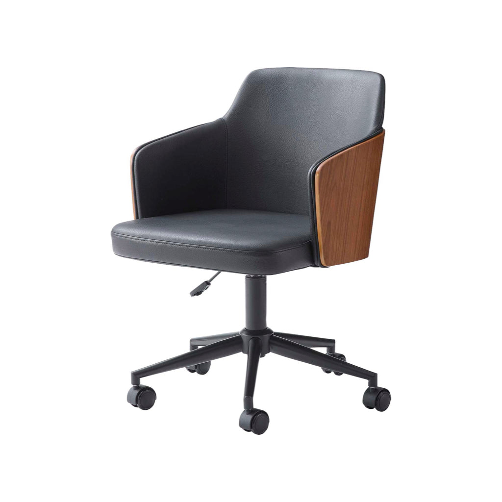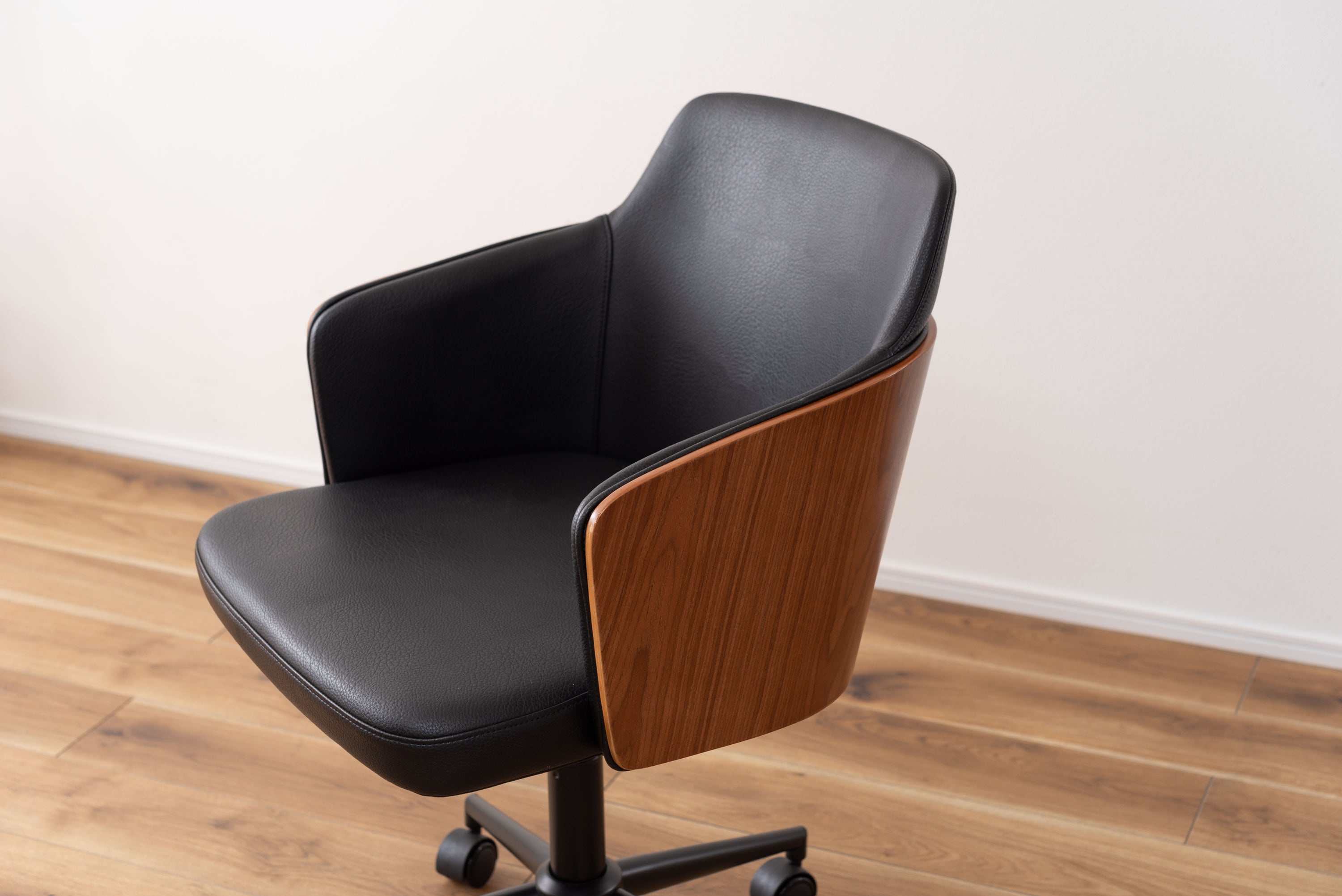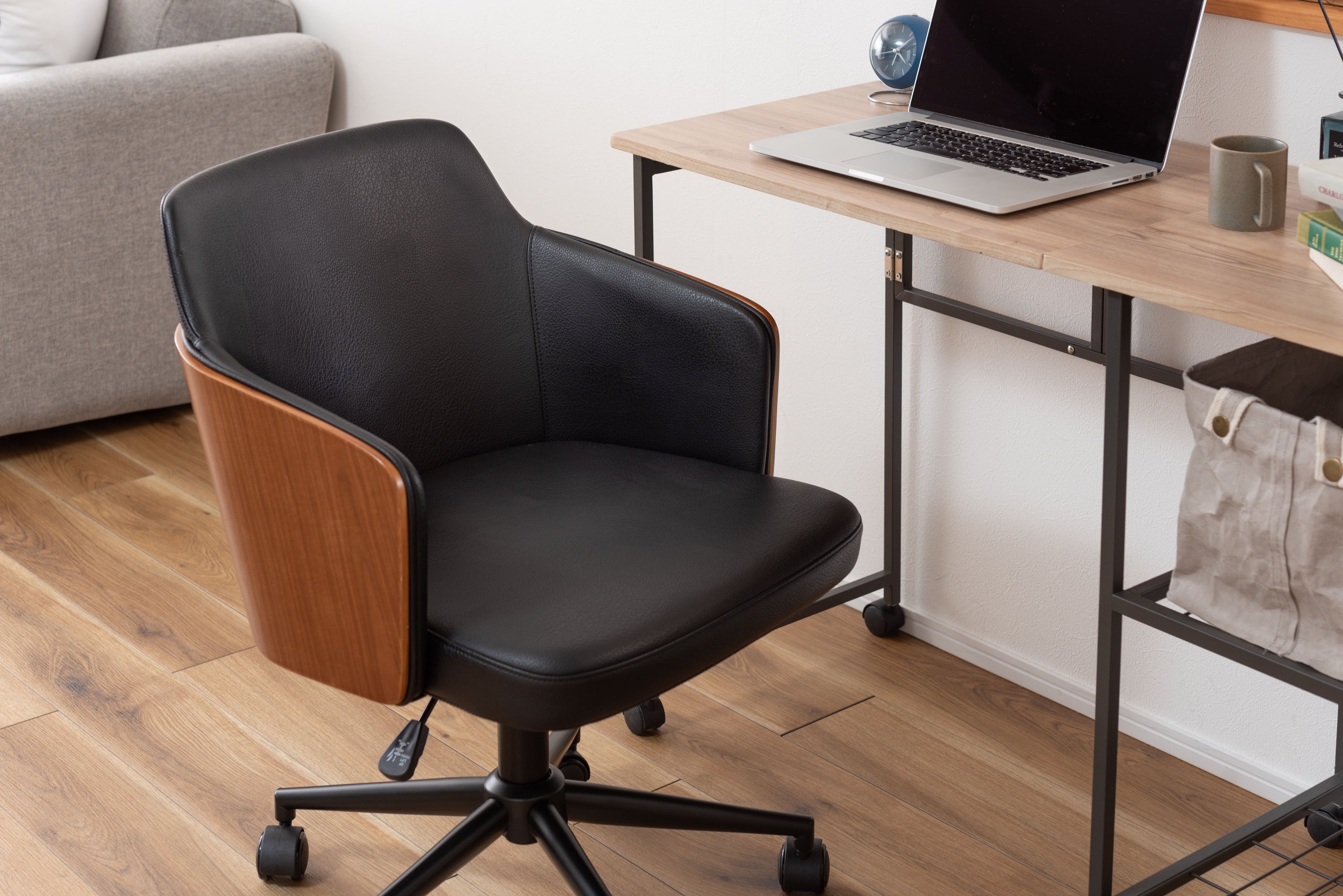 オフィスや自宅で活躍する、ソフトレザー×木目調のデスクチェア。包み込むような形状の背もたれが体にフィットし、ゆったりと快適な座り心地。ソフトレザーを使用した品のあるデザインが様々なお部屋に馴染み、シンプルでモダンな空間を演出。座面にソフトレザーを使用。クッション性が高く、座っていても疲れにくい仕様。腰から背中の中ほどまで支える背もたれは、包み込むような形状で背中にしっかりとフィット。座面の高さは46cmから55cmまでの昇降が可能。身長や使用用途に合わせて、昇降レバーで簡単に調整。キャスター付きでお掃除の際も簡単に移動。座面は回転式なので座ったまま向きを変えられます。肘掛けから背面に掛けて、美しい木目と滑らかな曲線が際立つ「天然木化粧合板」を採用。