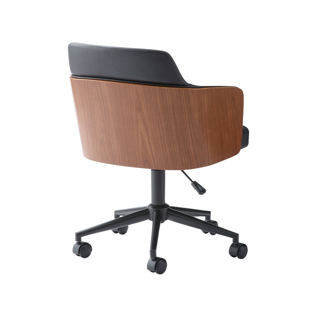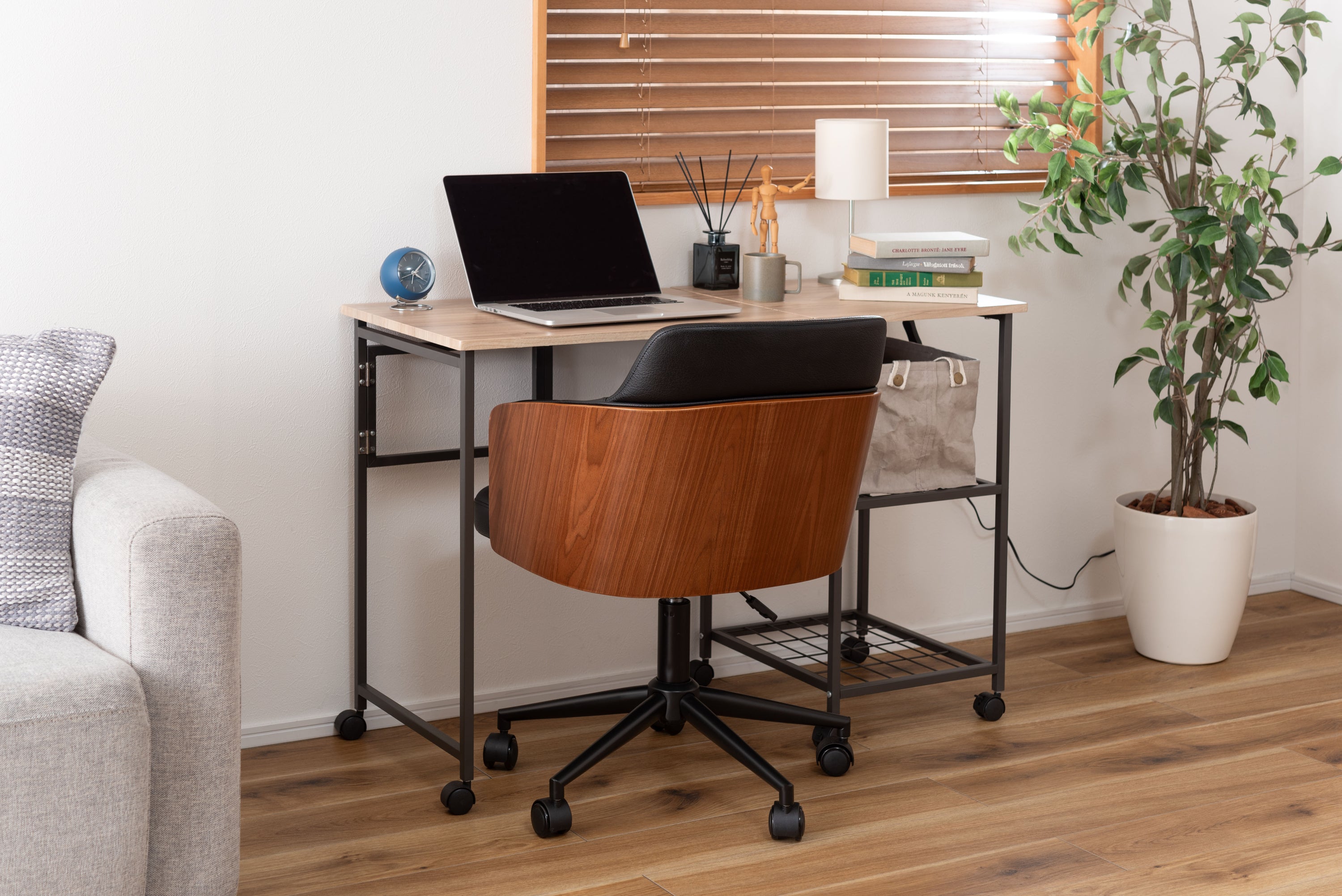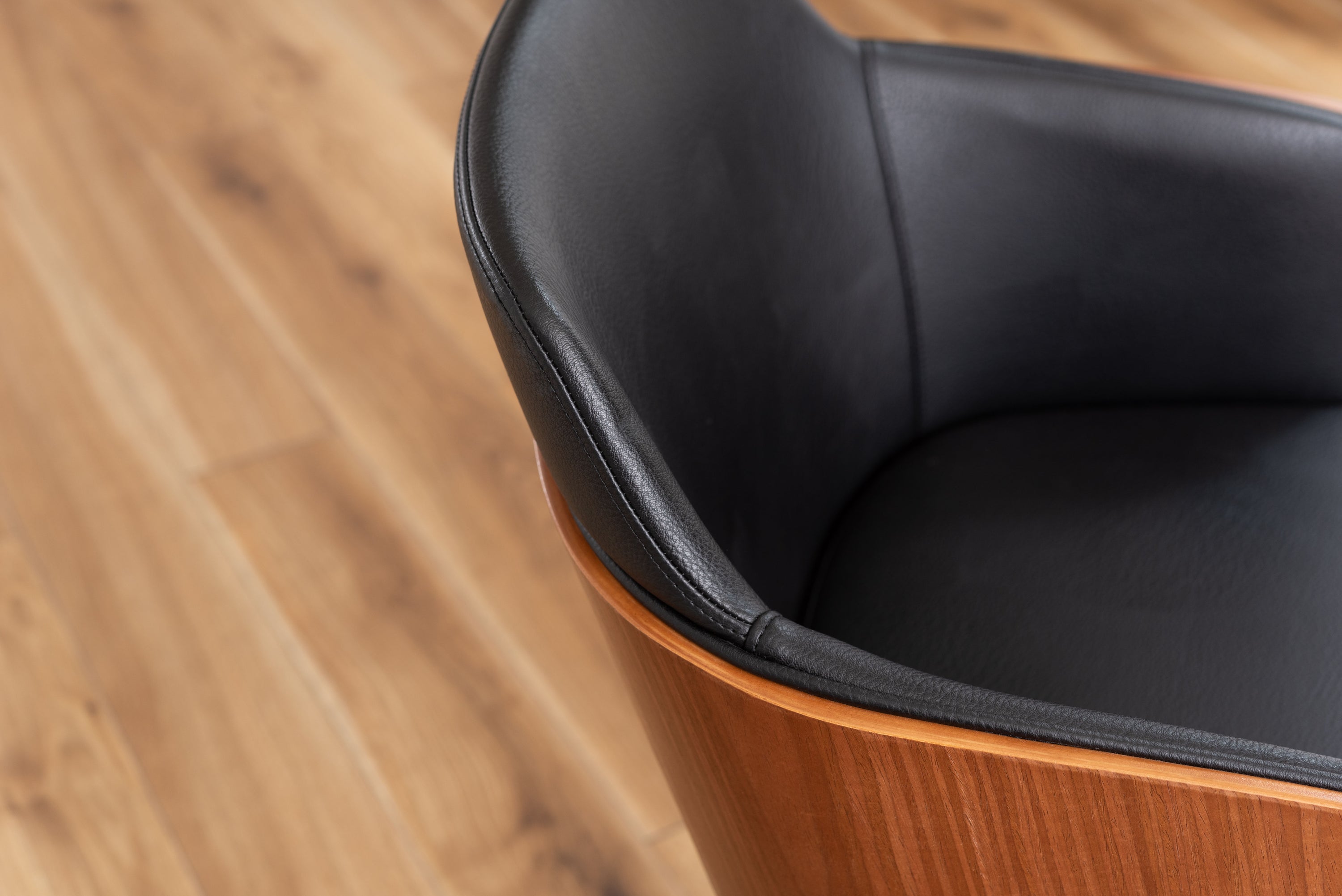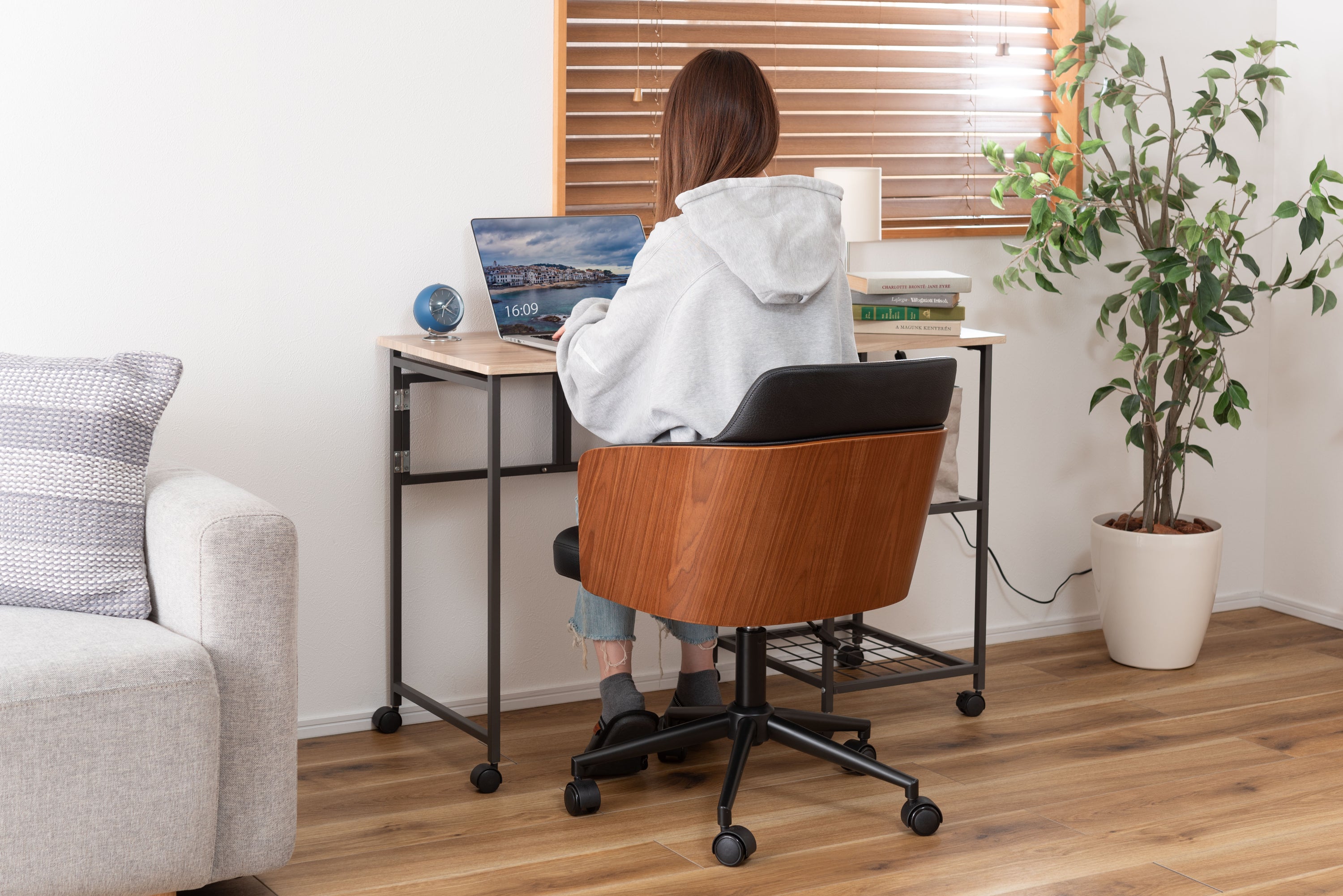 オフィスや自宅で活躍する、ソフトレザー×木目調のデスクチェア。包み込むような形状の背もたれが体にフィットし、ゆったりと快適な座り心地。ソフトレザーを使用した品のあるデザインが様々なお部屋に馴染み、シンプルでモダンな空間を演出。座面にソフトレザーを使用。クッション性が高く、座っていても疲れにくい仕様。腰から背中の中ほどまで支える背もたれは、包み込むような形状で背中にしっかりとフィット。座面の高さは46cmから55cmまでの昇降が可能。身長や使用用途に合わせて、昇降レバーで簡単に調整。キャスター付きでお掃除の際も簡単に移動。座面は回転式なので座ったまま向きを変えられます。肘掛けから背面に掛けて、美しい木目と滑らかな曲線が際立つ「天然木化粧合板」を採用。