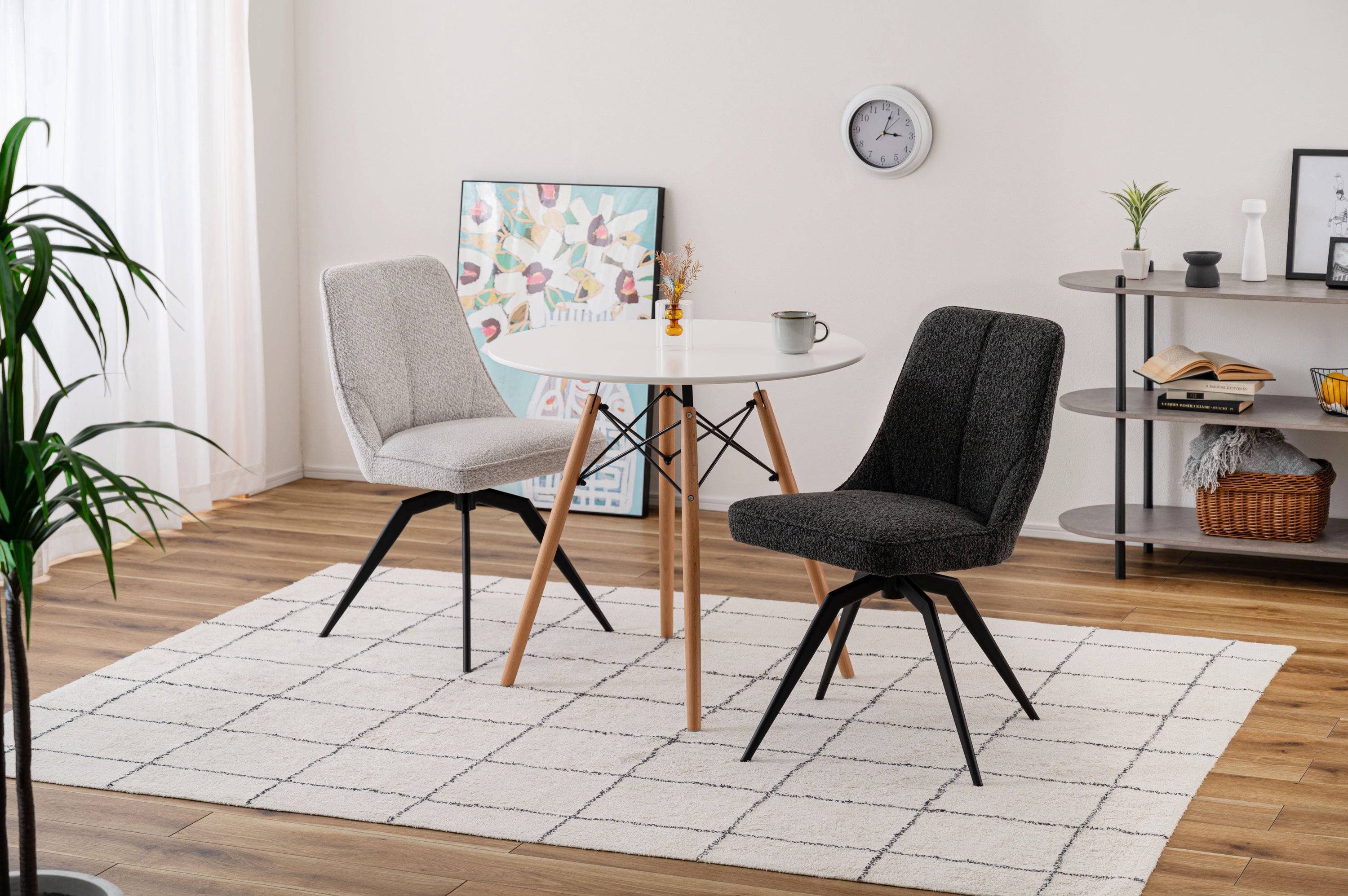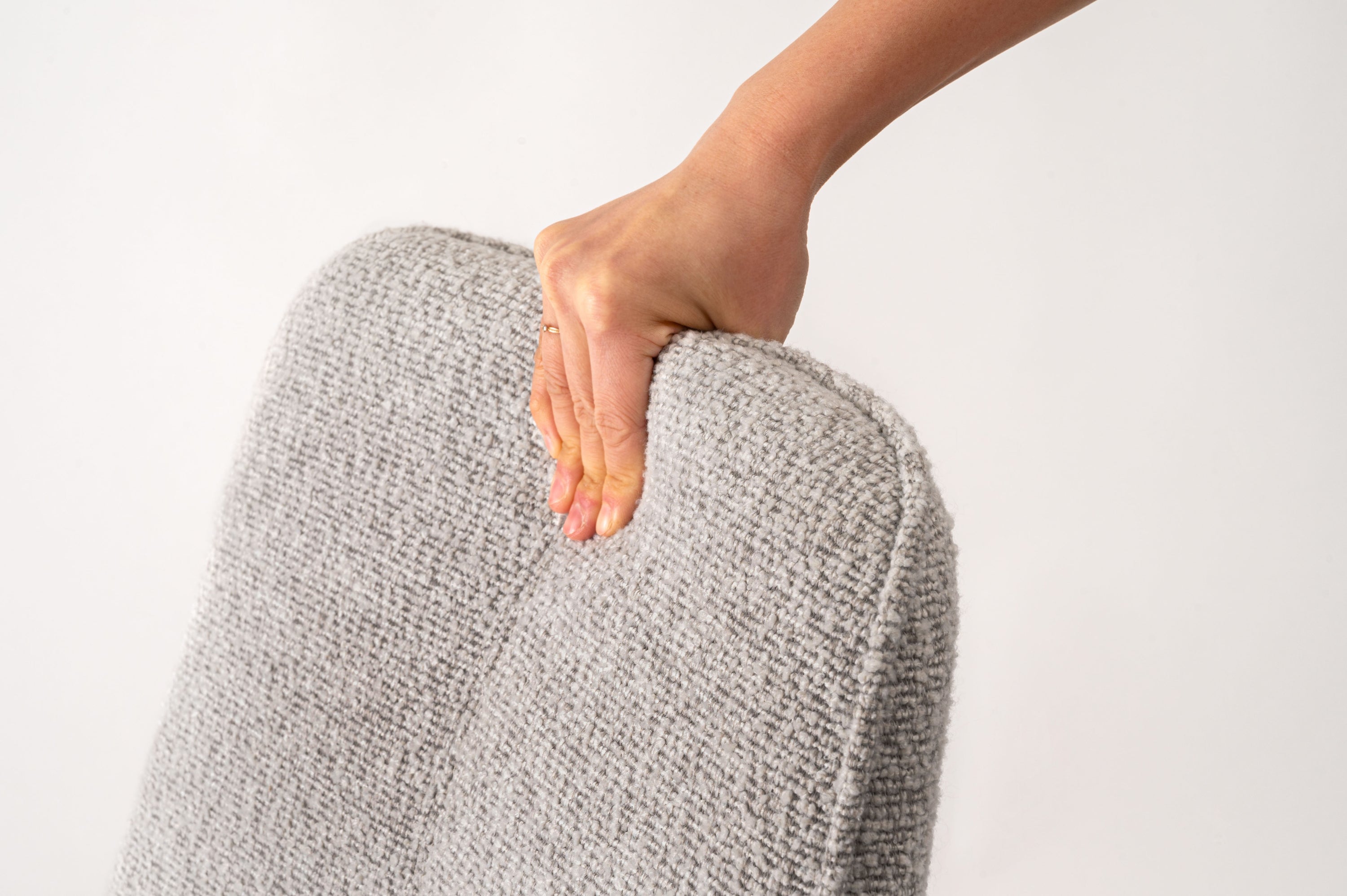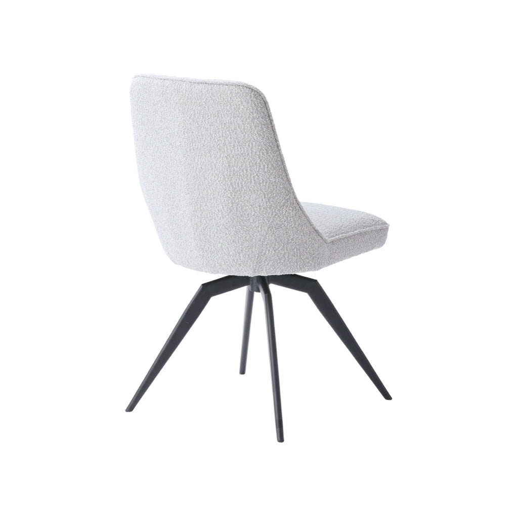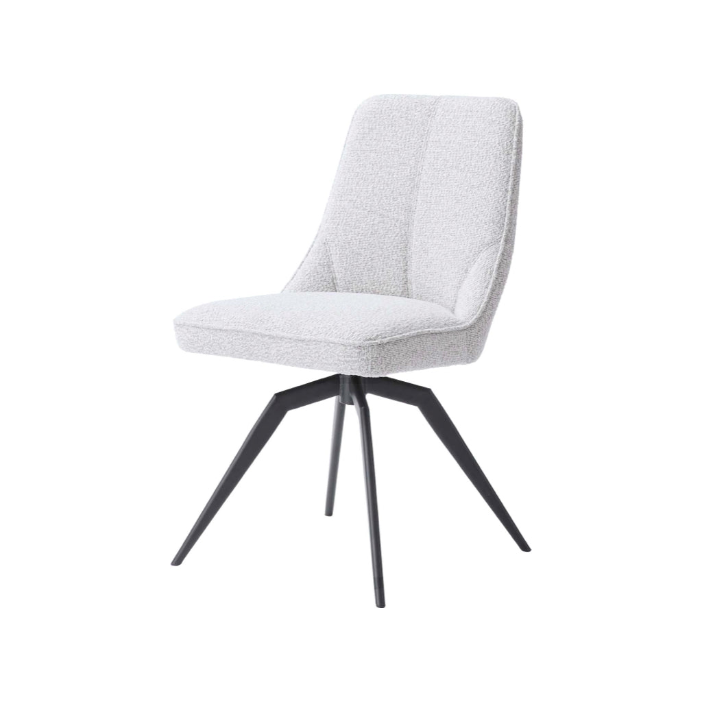 立体的で動きのあるファブリックを採用し、シンプルで洗練された印象の回転チェア。座面が360°回転式なので、テーブルへの出入りの動作がスムーズに。ゆるやかに湾曲した背もたれが、優しく包み込むように身体にフィット。柔らかすぎず固すぎない、程よいクッション性の座面。細身のスチール脚が全体のイメージを引き締め、スタイリッシュさを演出。