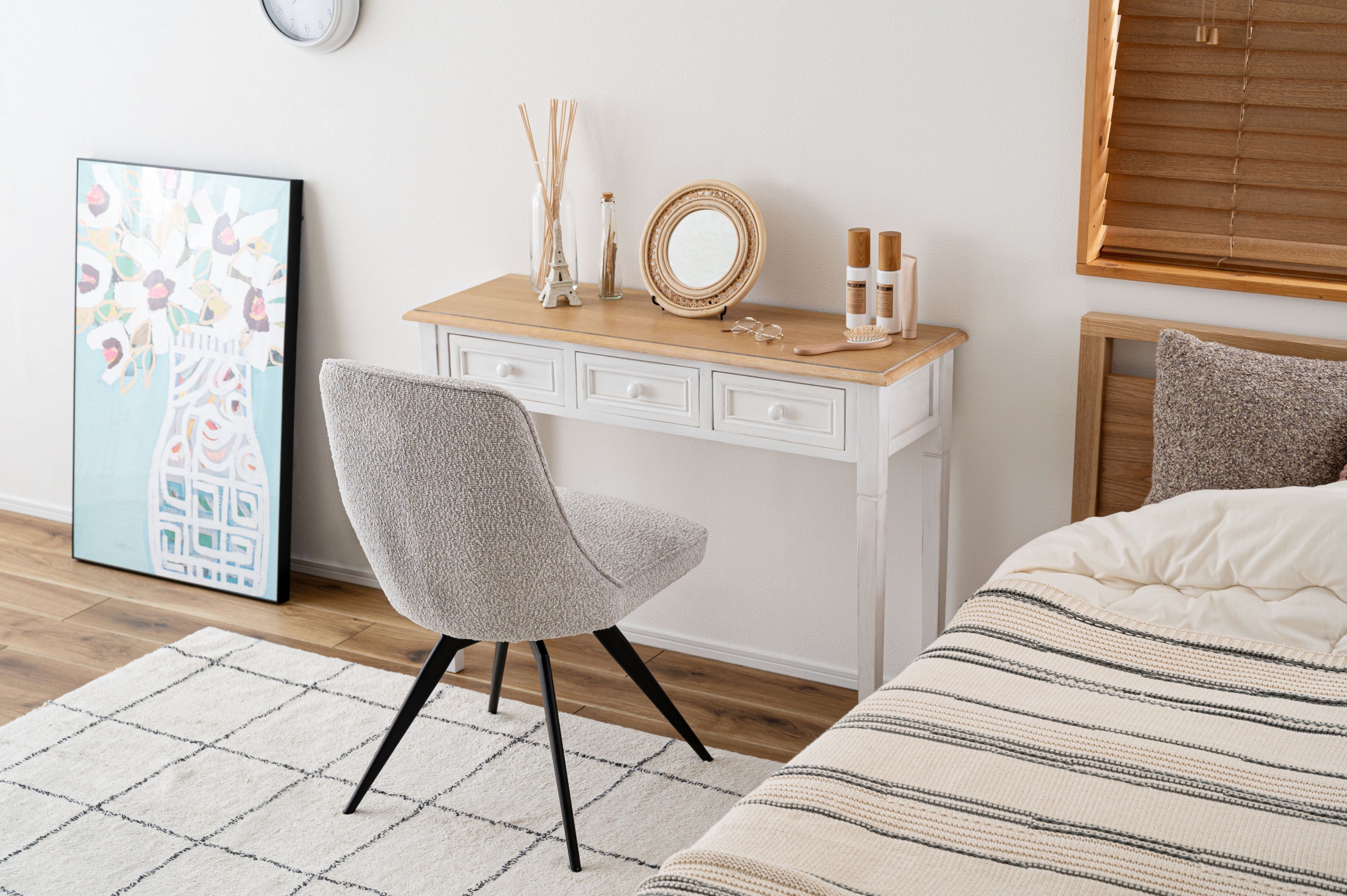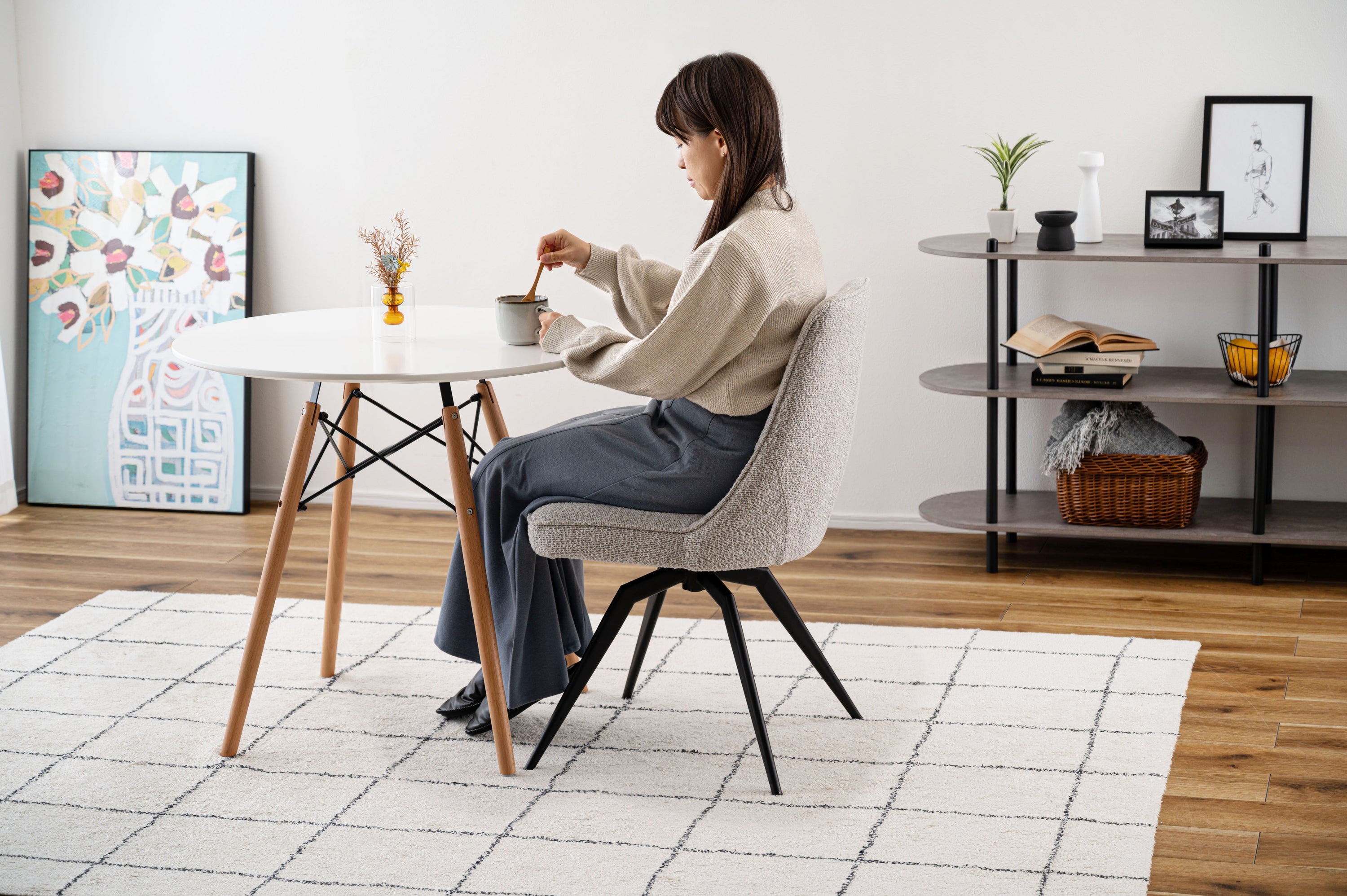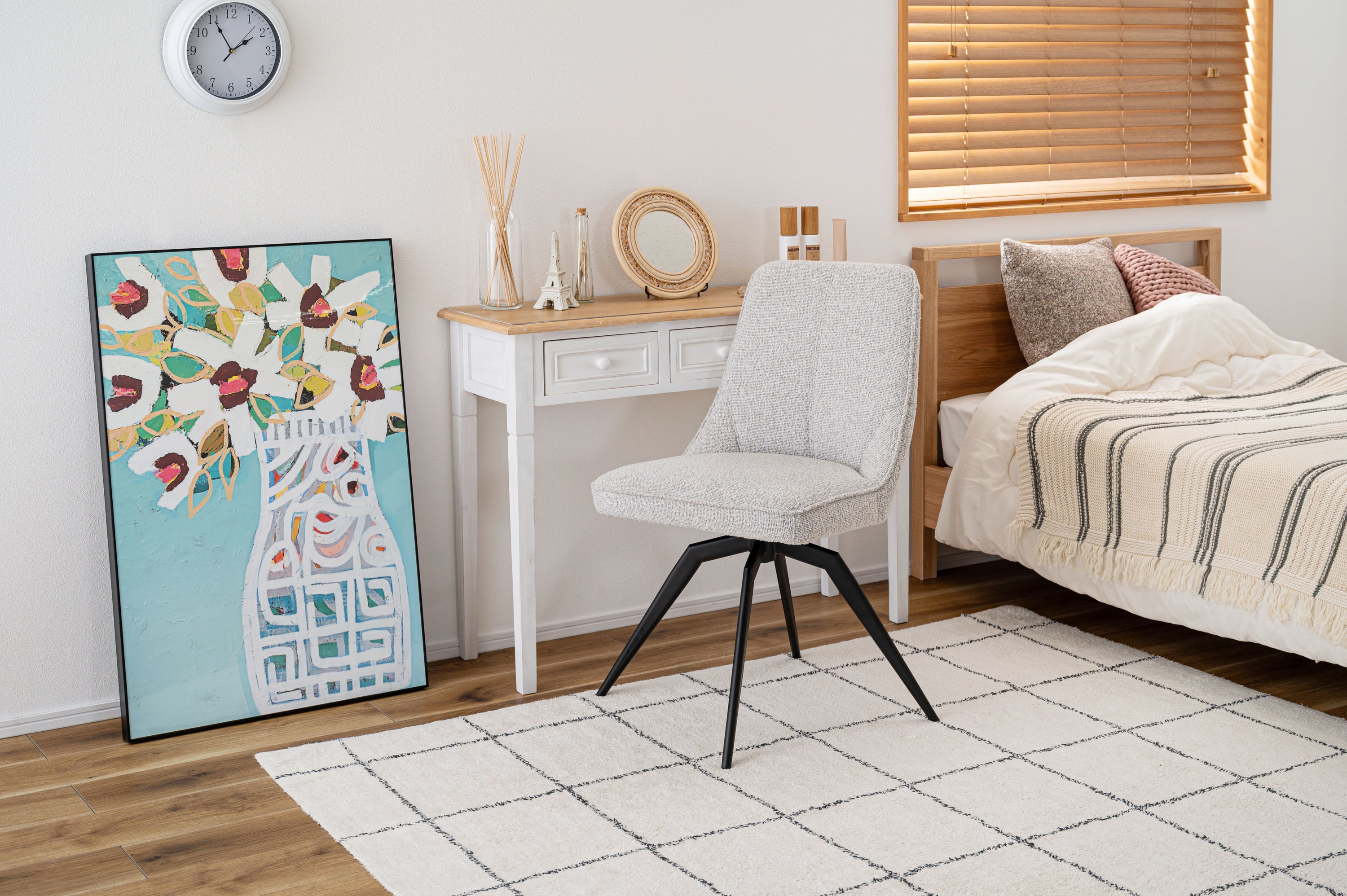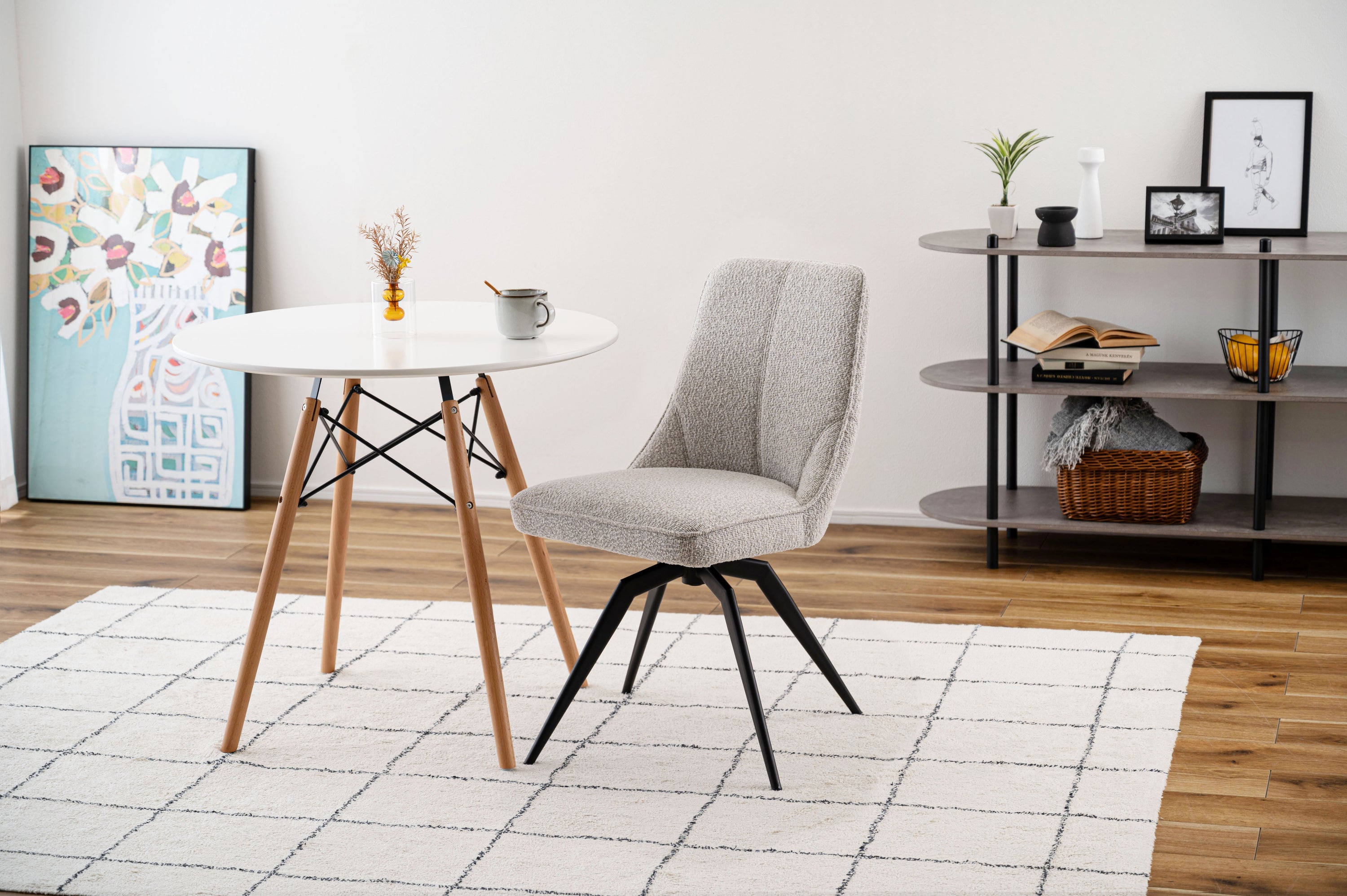 立体的で動きのあるファブリックを採用し、シンプルで洗練された印象の回転チェア。座面が360°回転式なので、テーブルへの出入りの動作がスムーズに。ゆるやかに湾曲した背もたれが、優しく包み込むように身体にフィット。柔らかすぎず固すぎない、程よいクッション性の座面。細身のスチール脚が全体のイメージを引き締め、スタイリッシュさを演出。