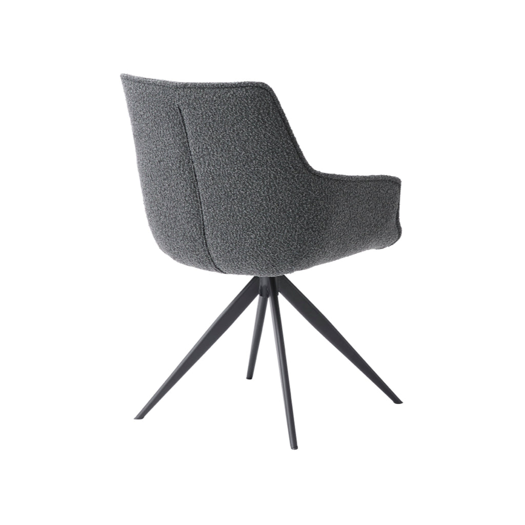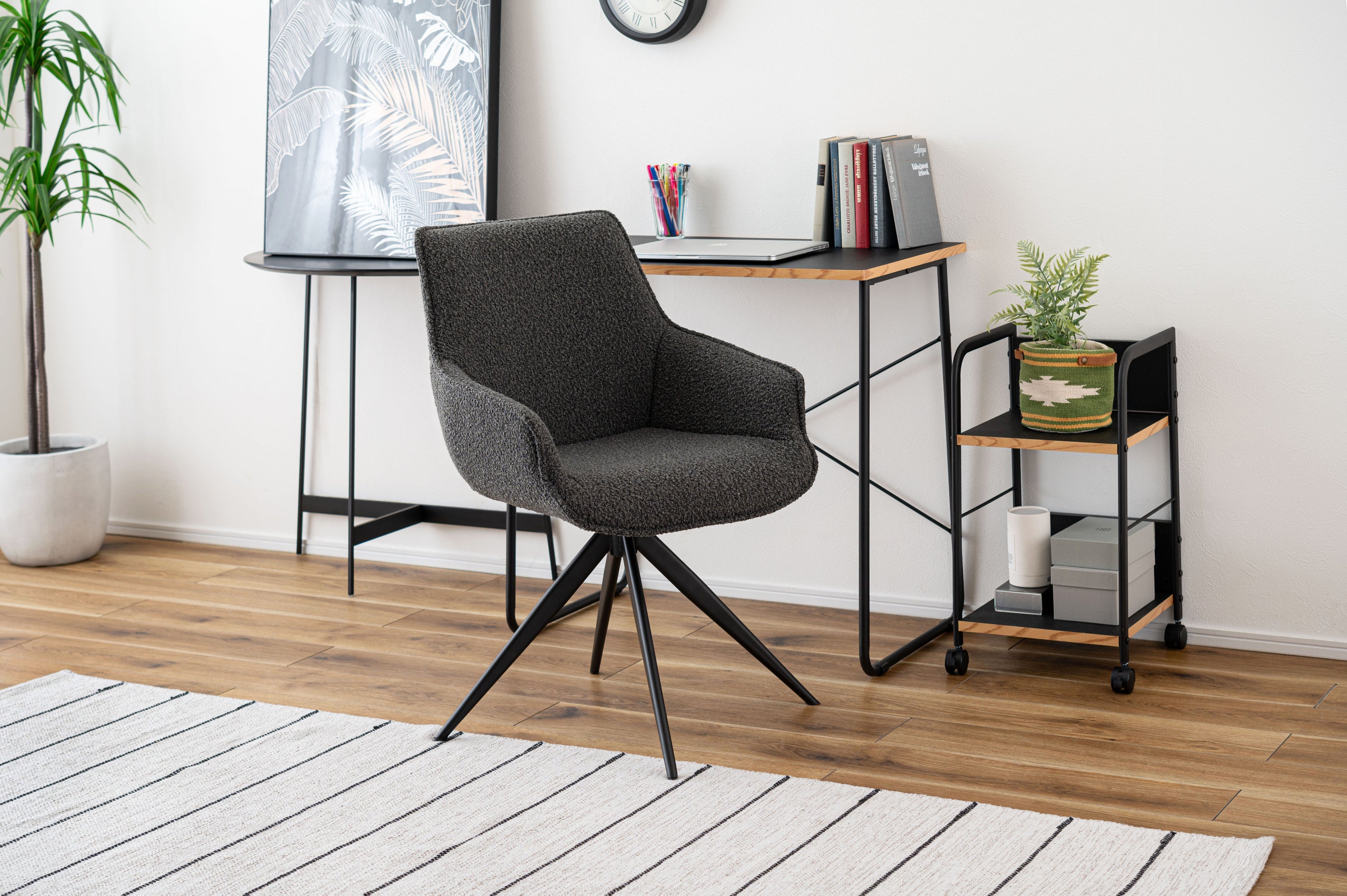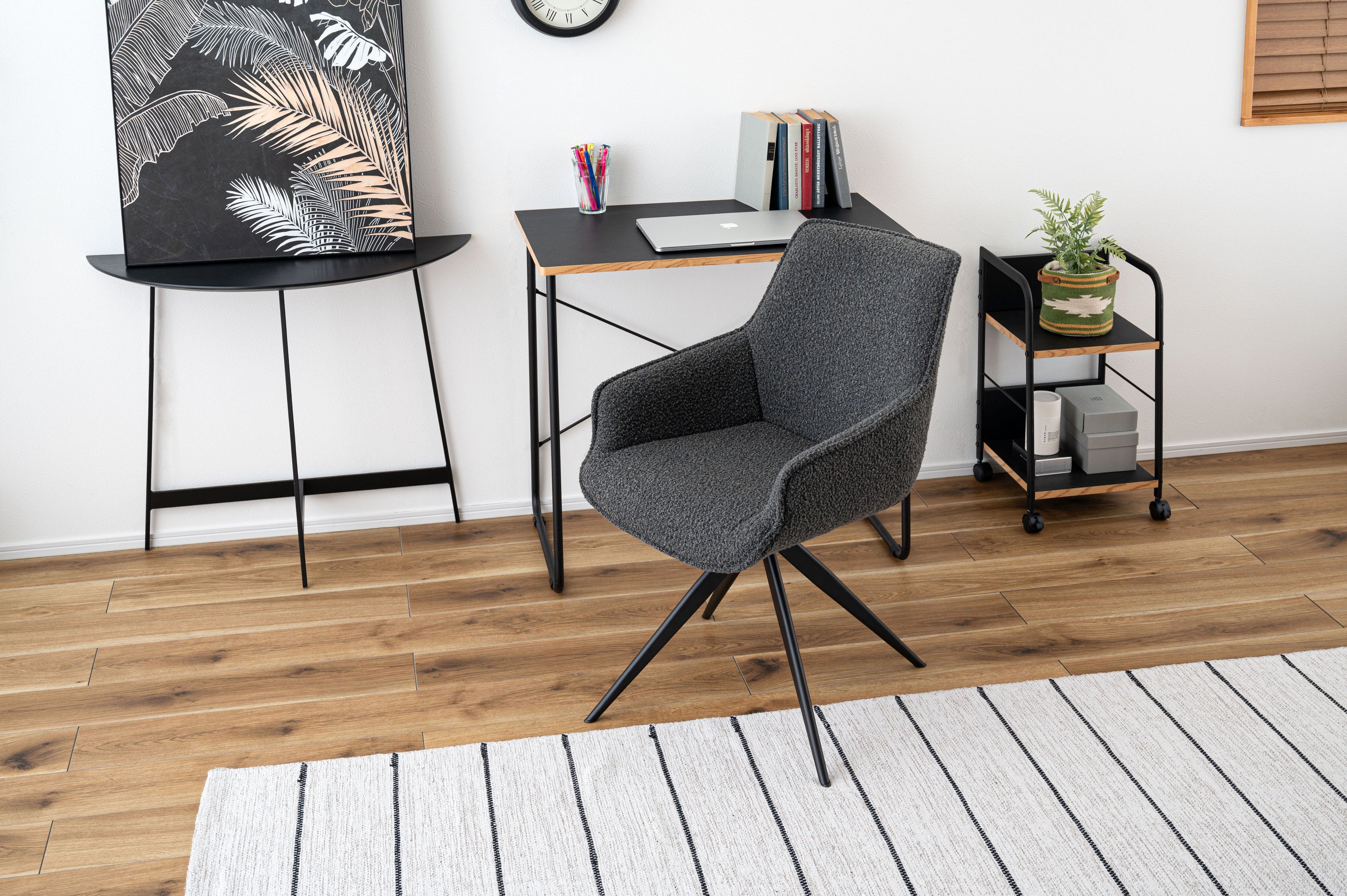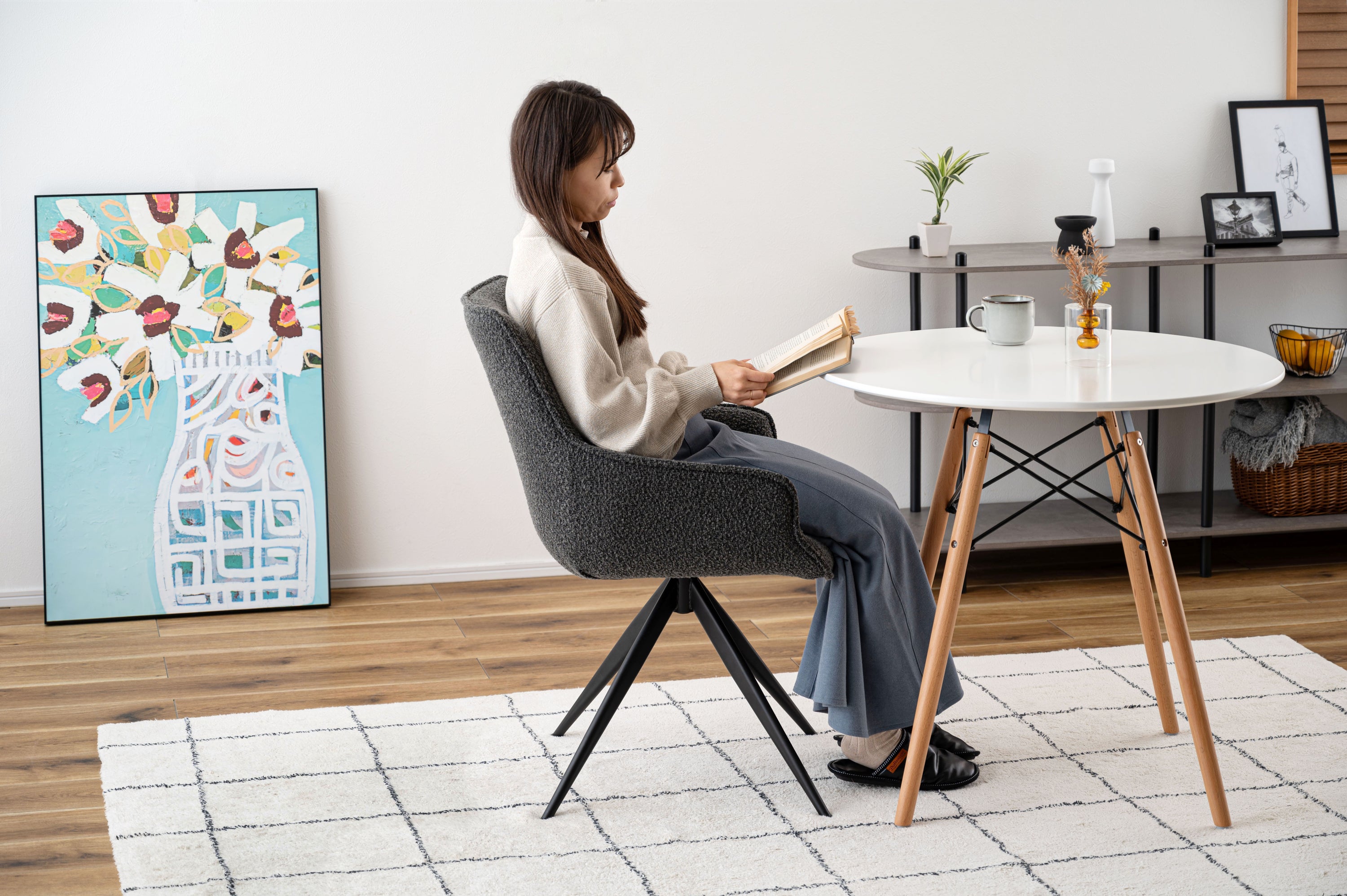 立体的で動きのあるファブリックを採用し、シンプルで洗練された印象の回転チェア。座面が360°回転式なので、テーブルへの出入りの動作がスムーズに。ゆるやかに湾曲した背もたれが、優しく包み込むように身体にフィット。柔らかすぎず固すぎない、程よいクッション性の座面。細身のスチール脚が全体のイメージを引き締め、スタイリッシュさを演出。