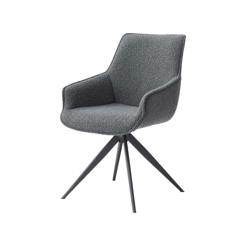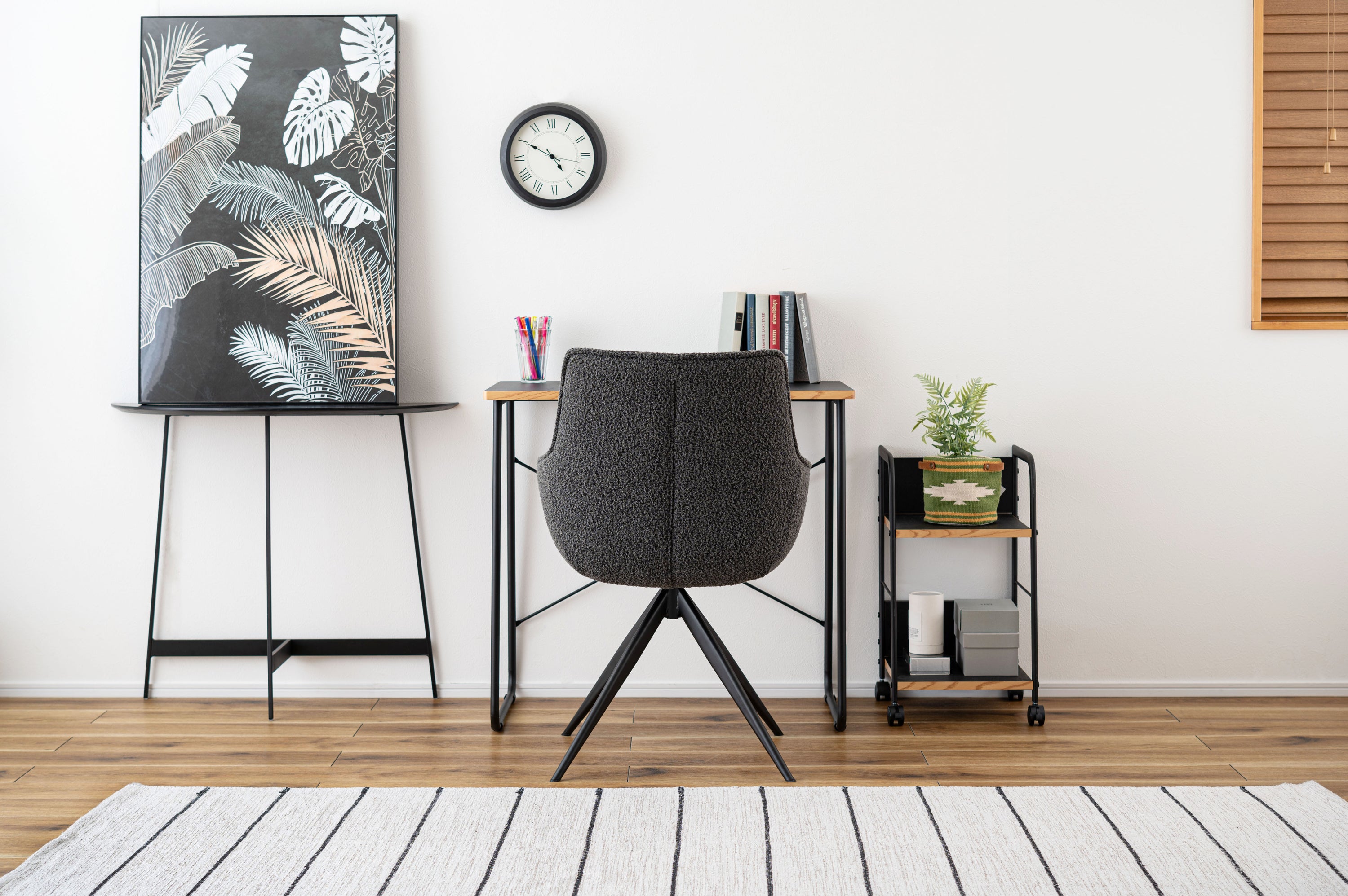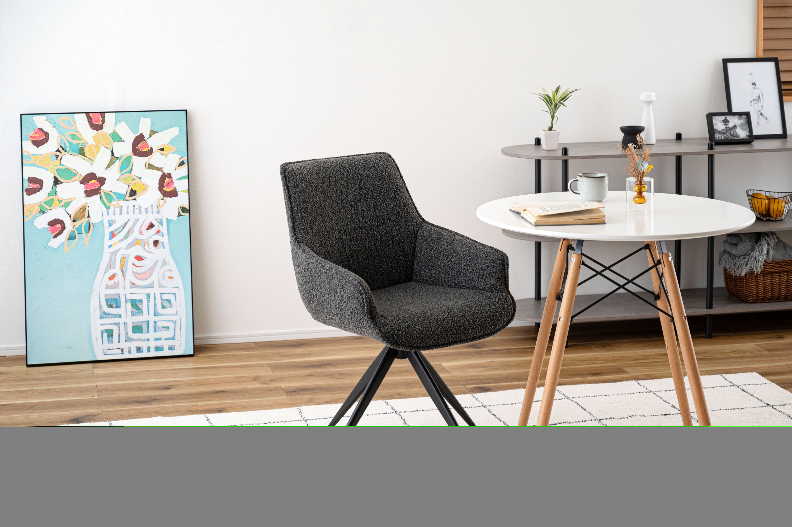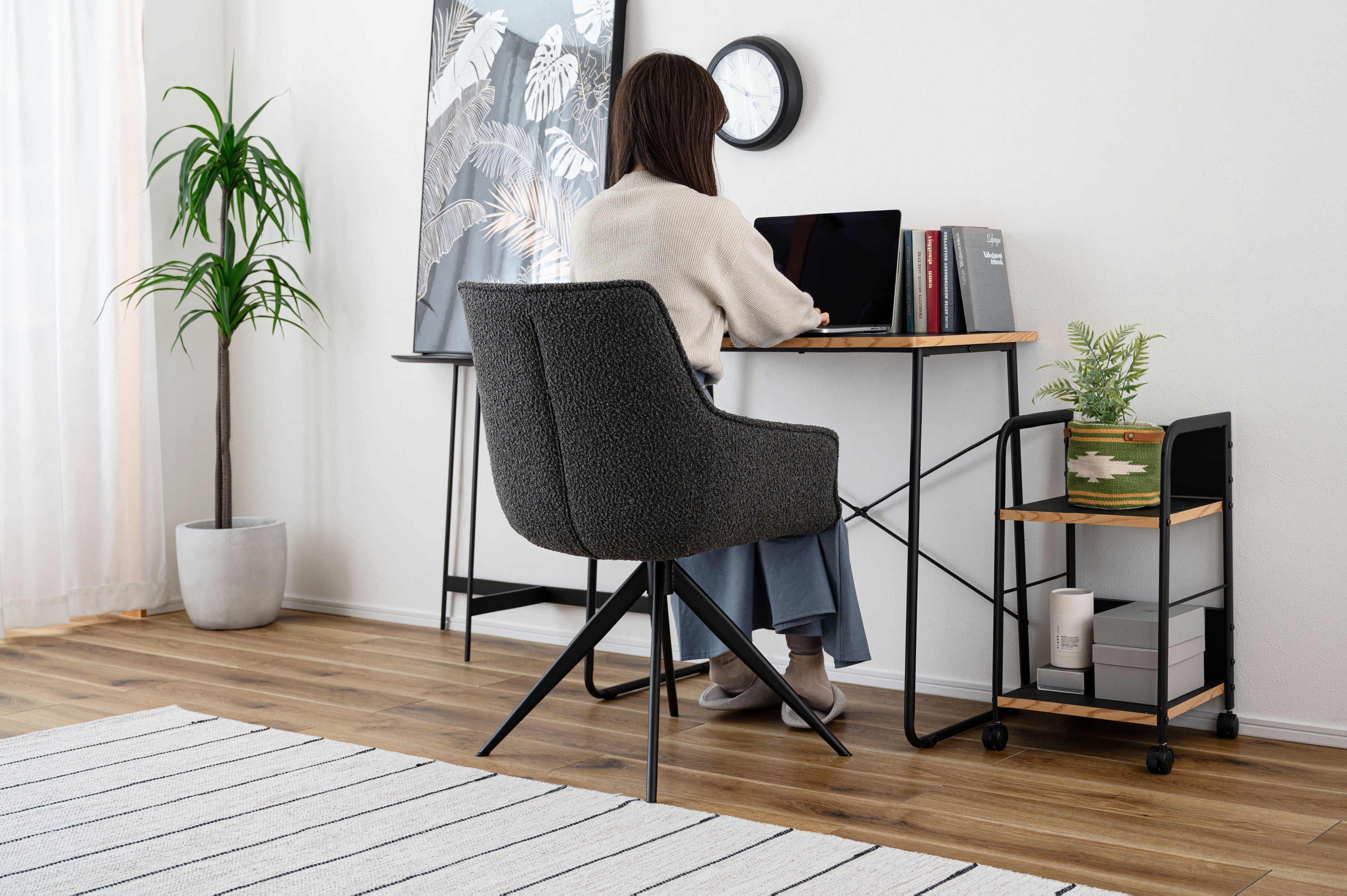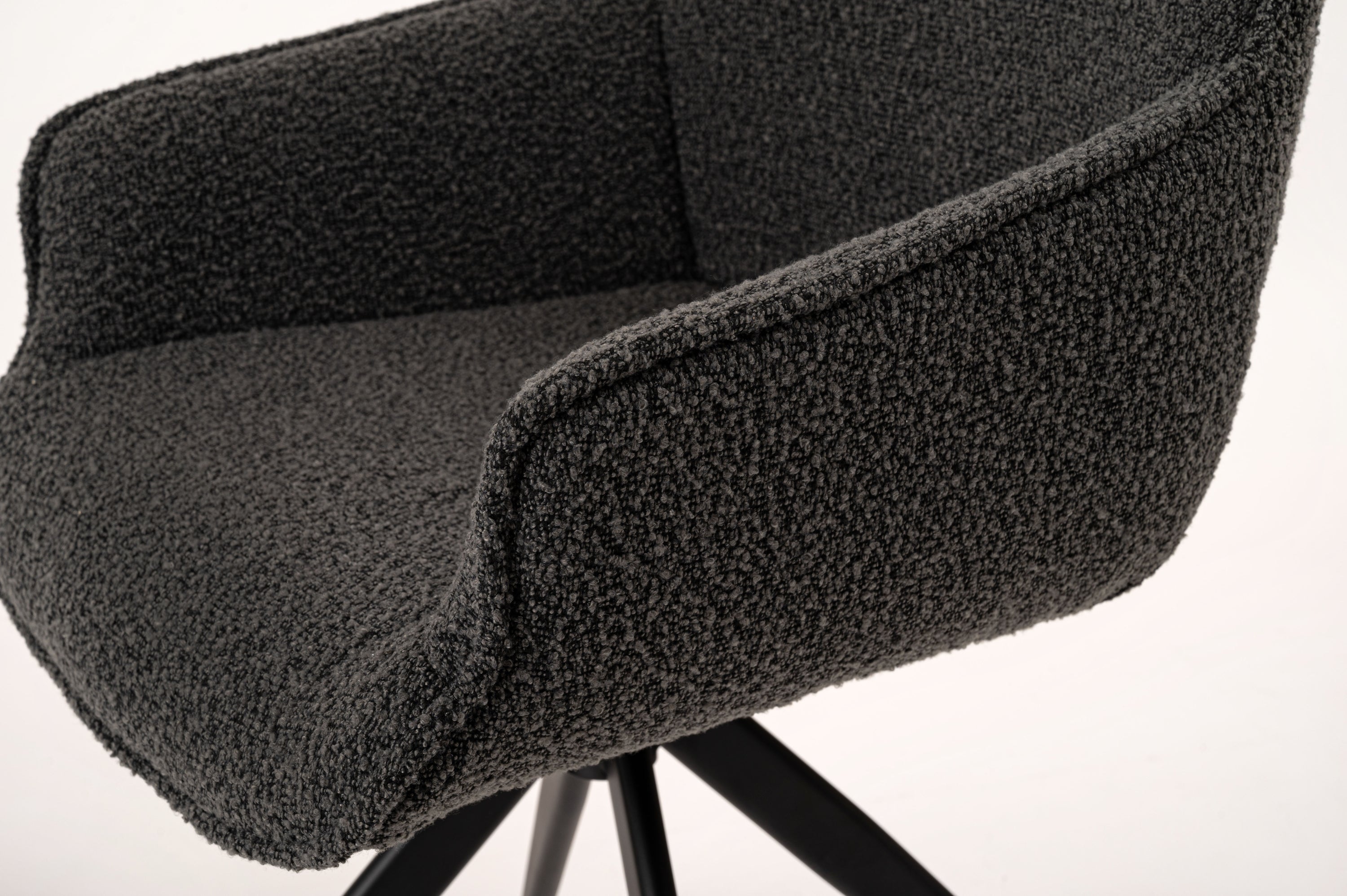 立体的で動きのあるファブリックを採用し、シンプルで洗練された印象の回転チェア。座面が360°回転式なので、テーブルへの出入りの動作がスムーズに。ゆるやかに湾曲した背もたれが、優しく包み込むように身体にフィット。柔らかすぎず固すぎない、程よいクッション性の座面。細身のスチール脚が全体のイメージを引き締め、スタイリッシュさを演出。