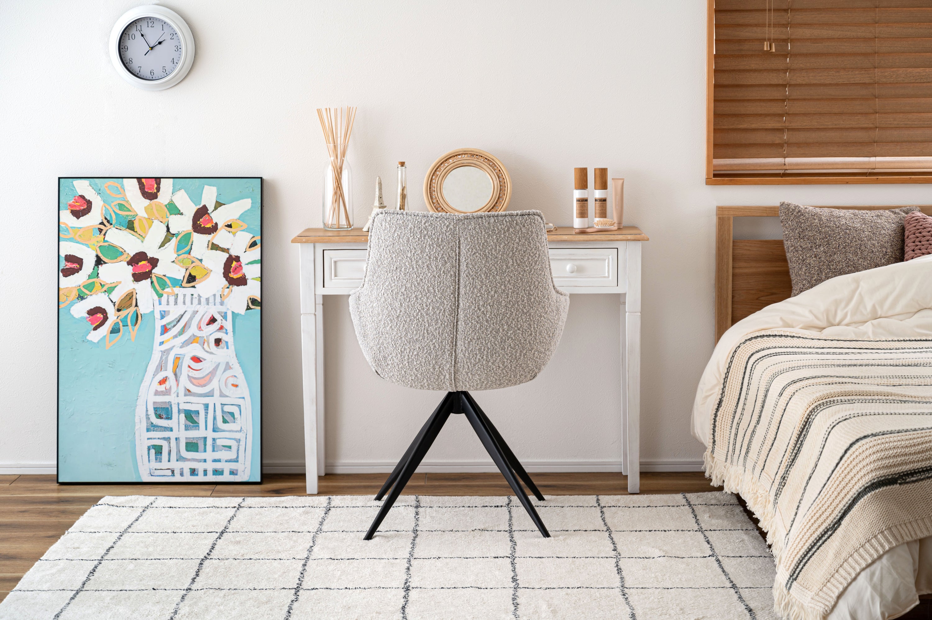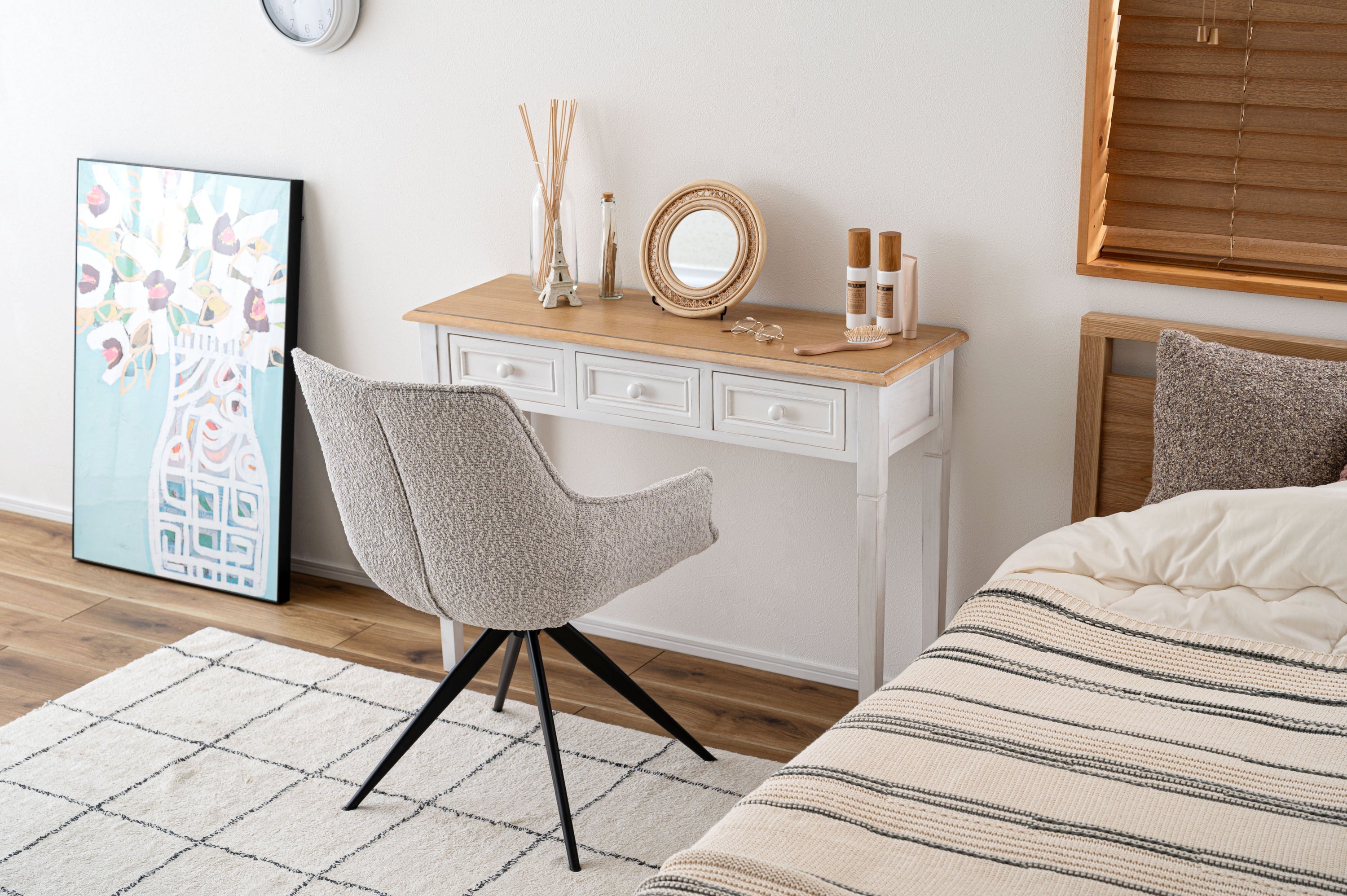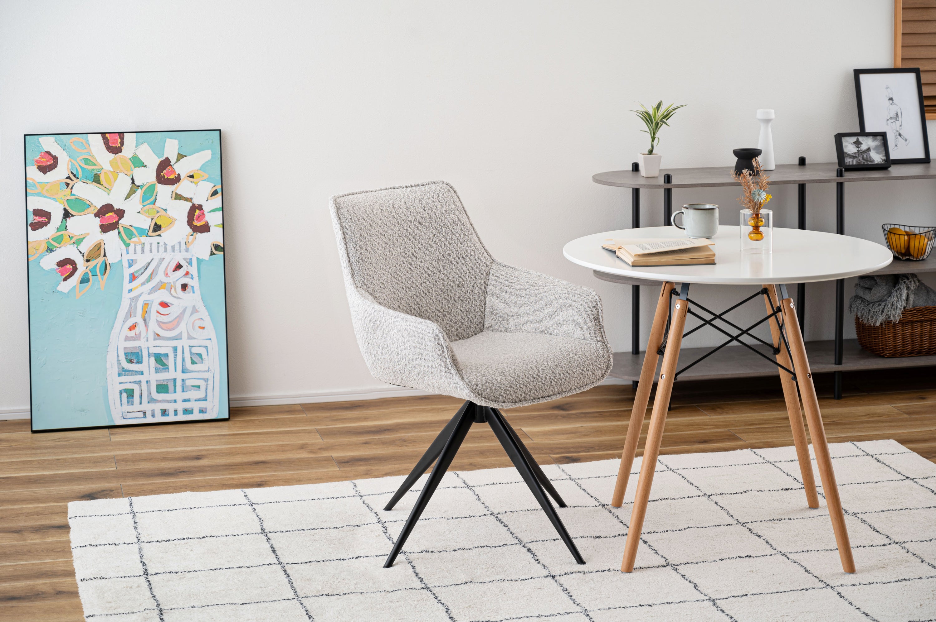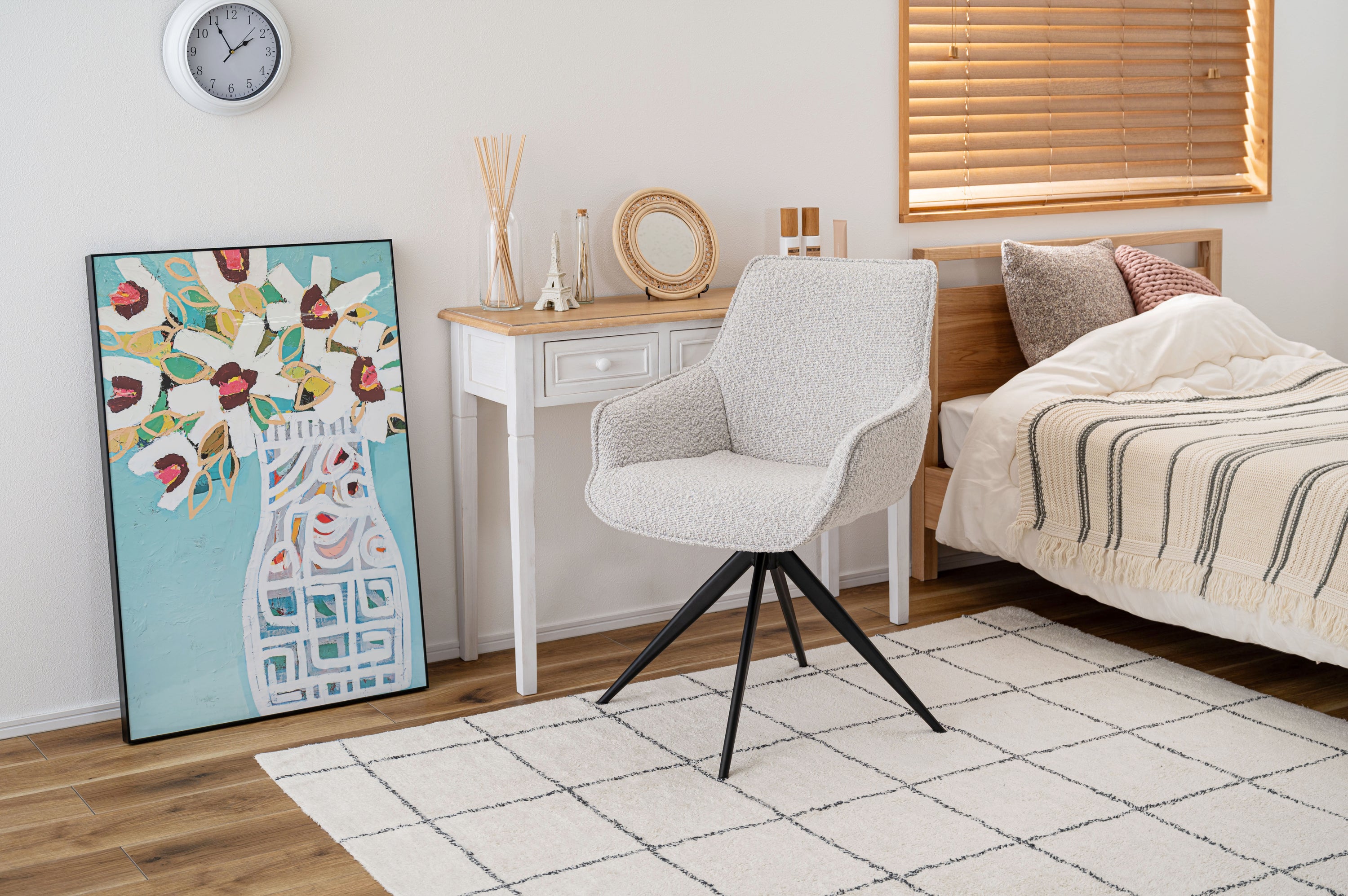 立体的で動きのあるファブリックを採用し、シンプルで洗練された印象の回転チェア。座面が360°回転式なので、テーブルへの出入りの動作がスムーズに。ゆるやかに湾曲した背もたれが、優しく包み込むように身体にフィット。柔らかすぎず固すぎない、程よいクッション性の座面。細身のスチール脚が全体のイメージを引き締め、スタイリッシュさを演出。