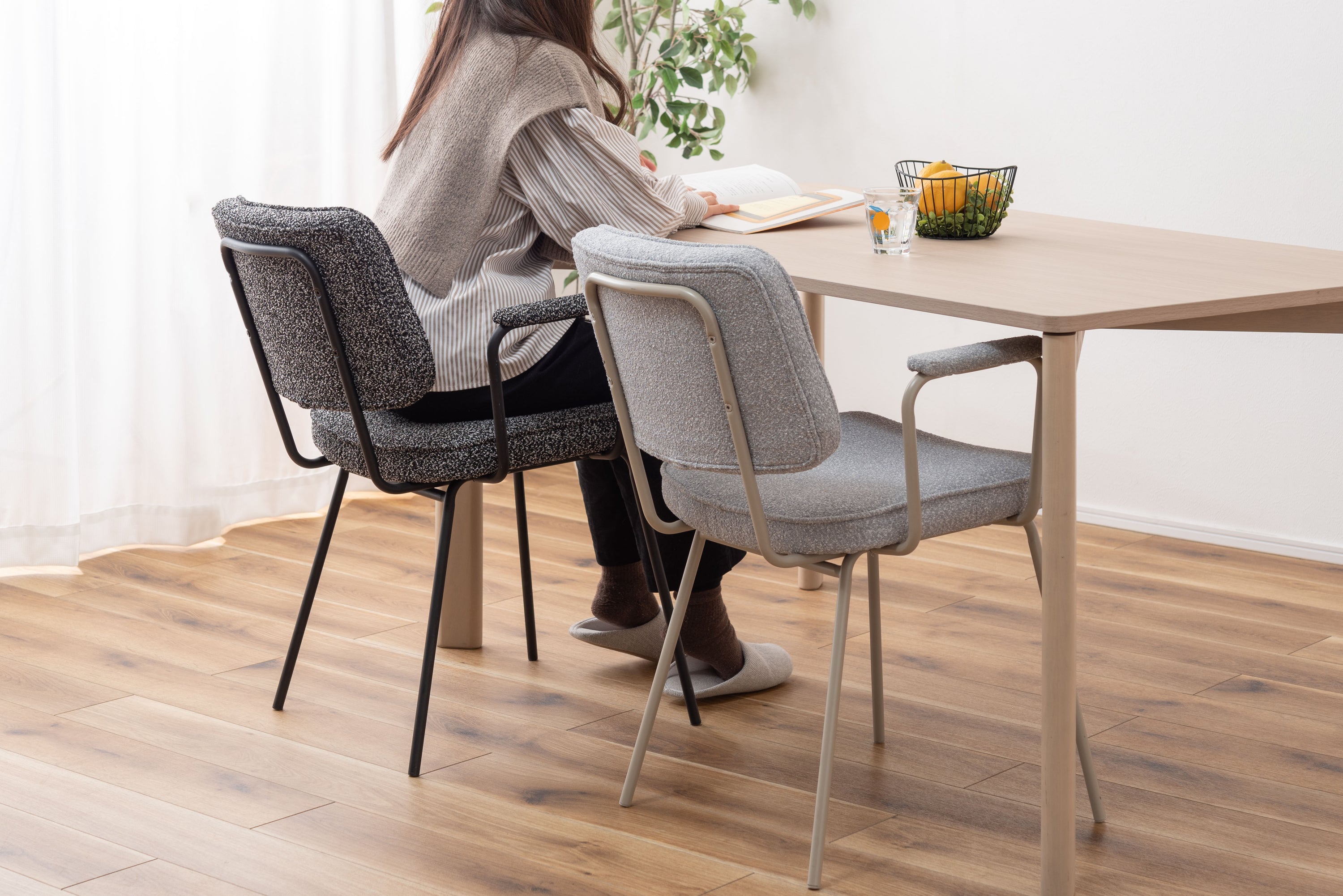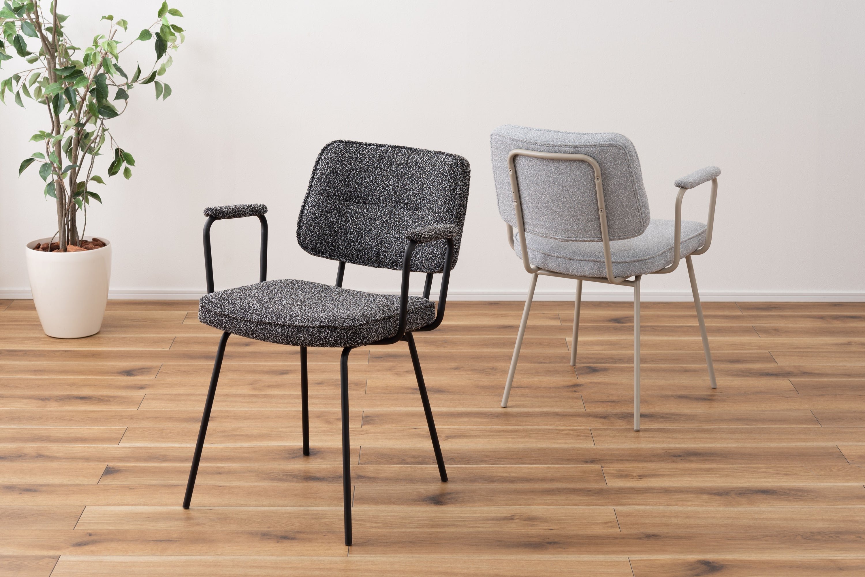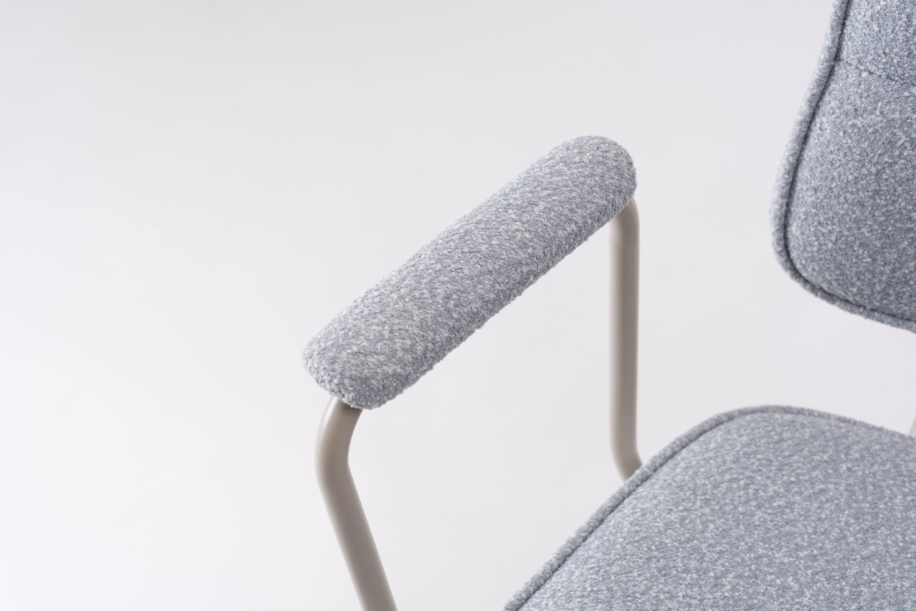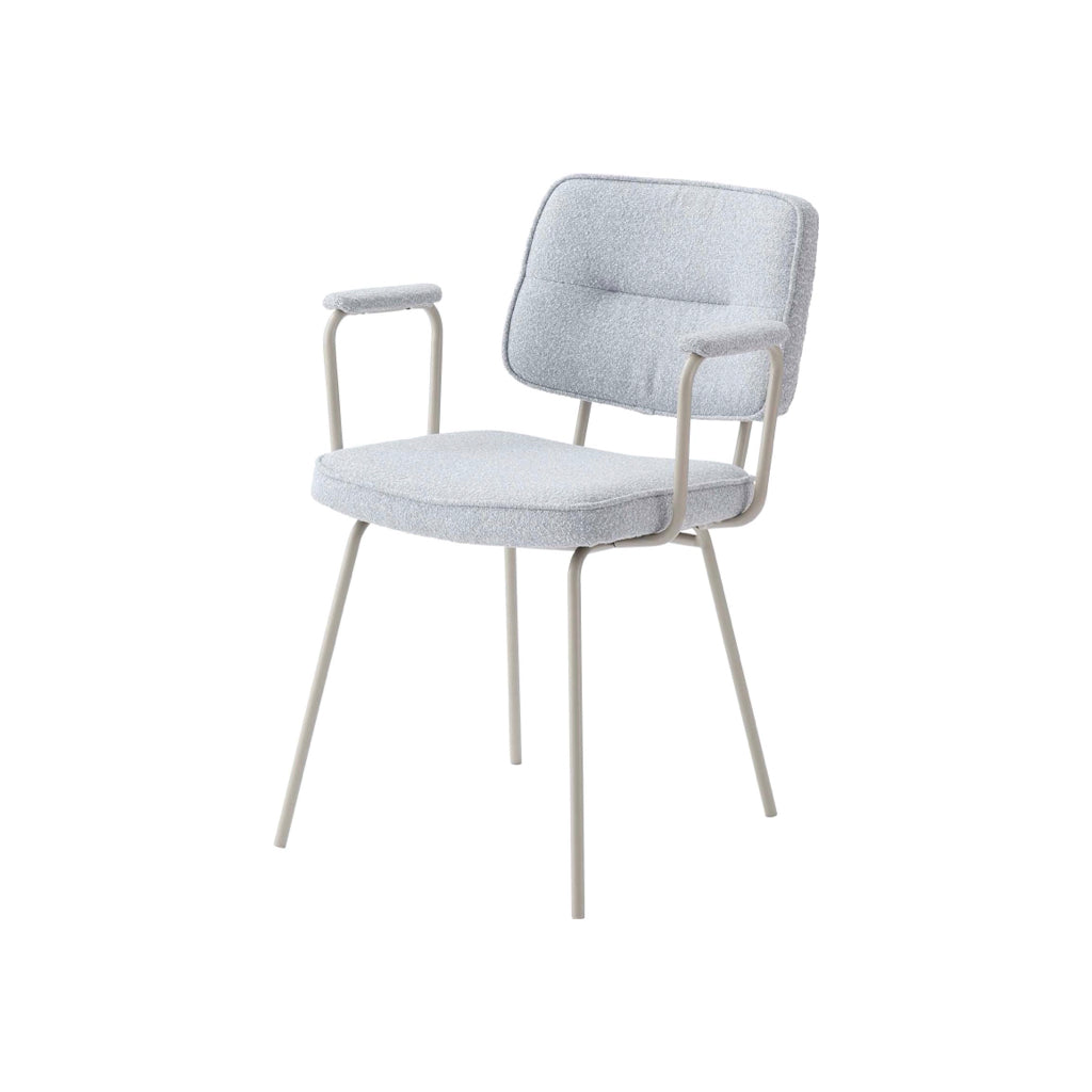 アーム部分に特徴的なデザインを施したチェア。ファブリックには混色のブークレ生地を使用し、表情のあるデザインに仕上げました。デザイン性と使いやすさ、快適さを兼ね備えたアイテムです。