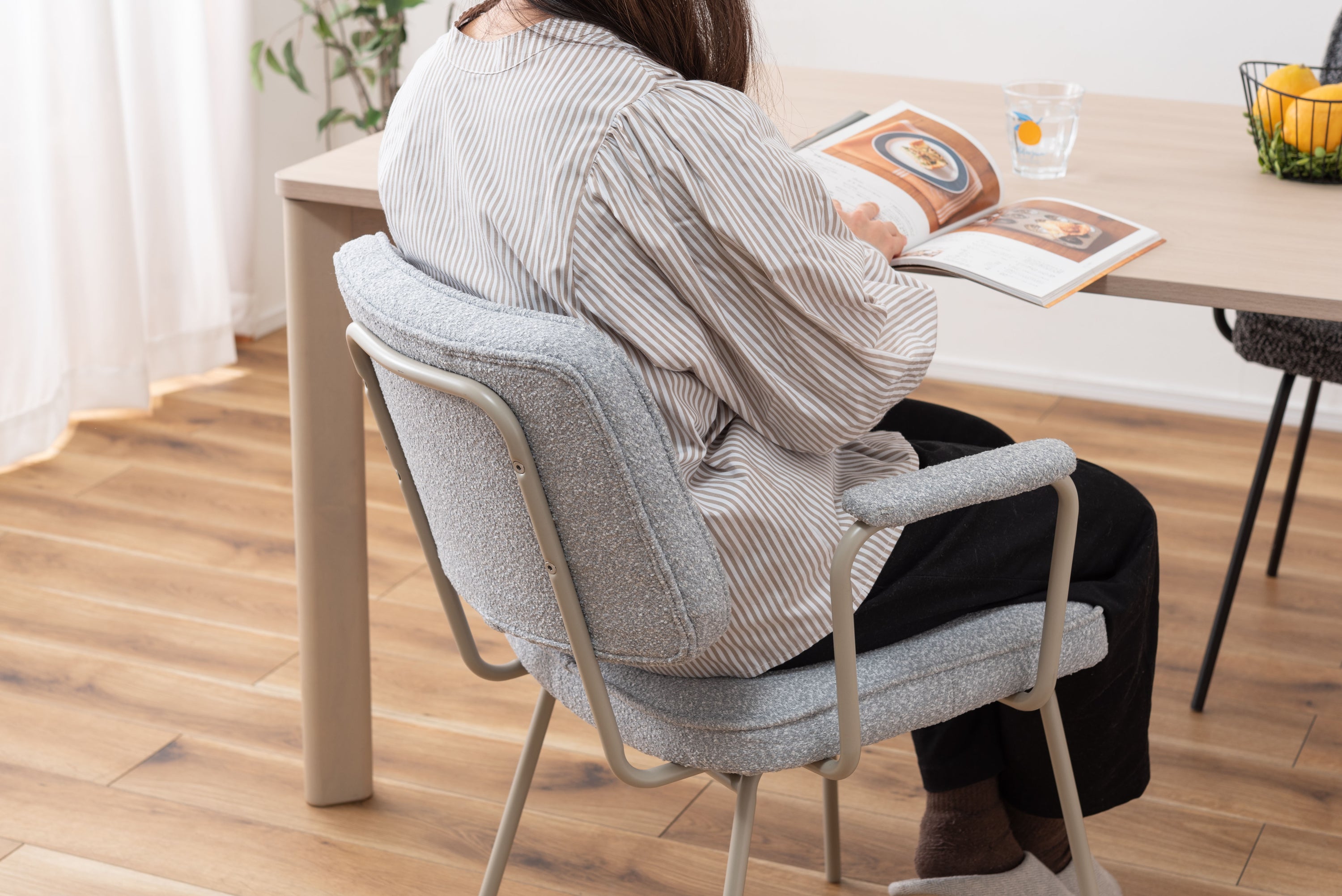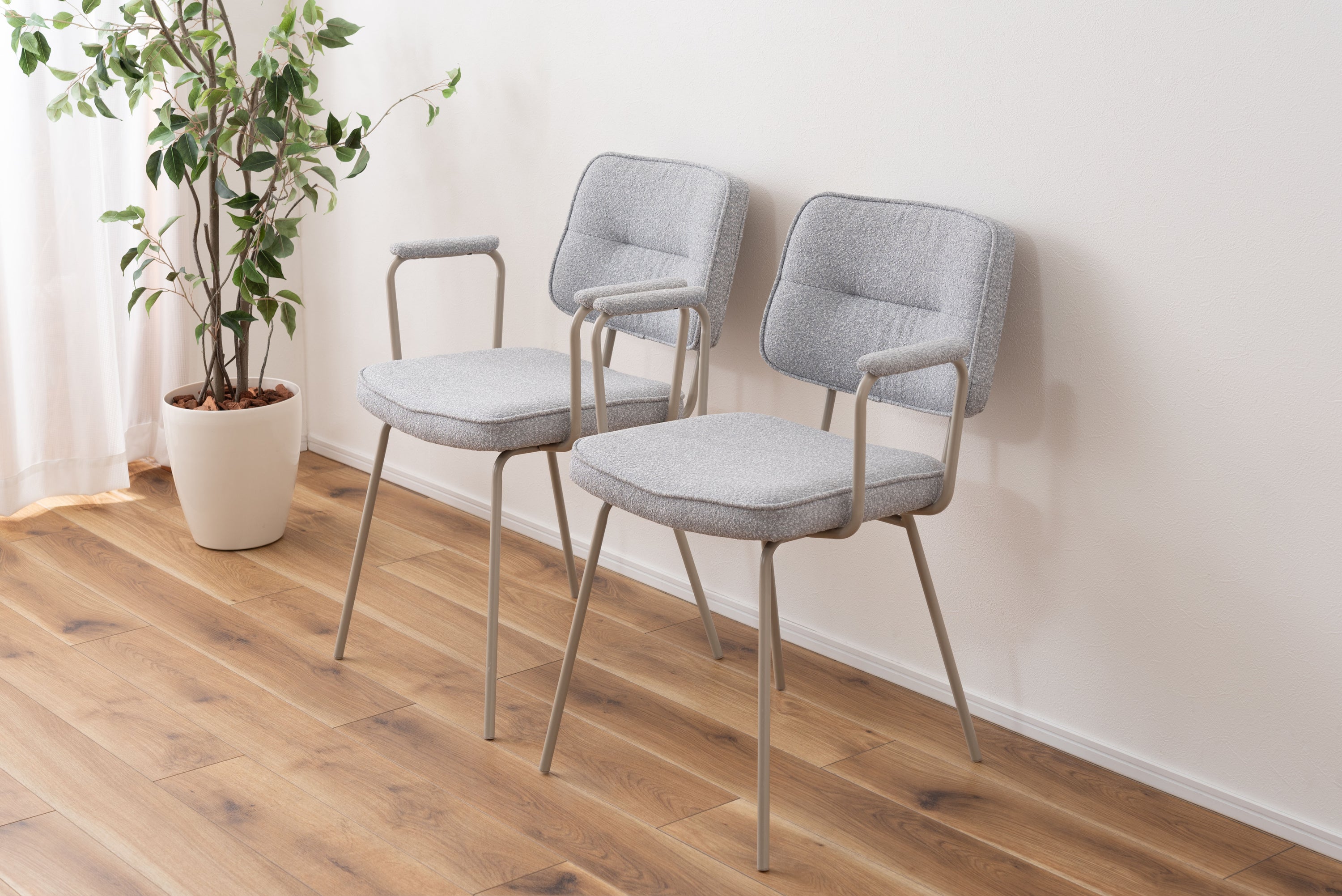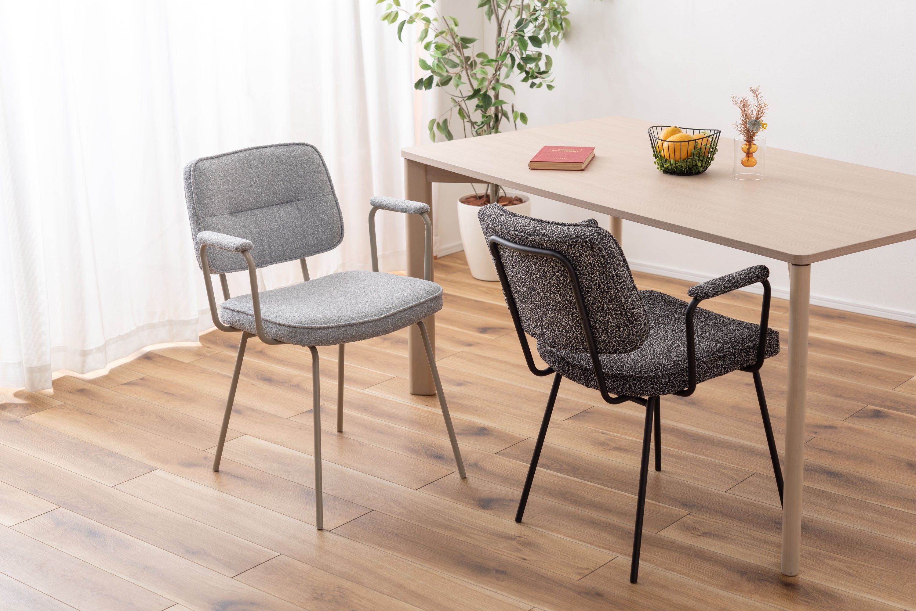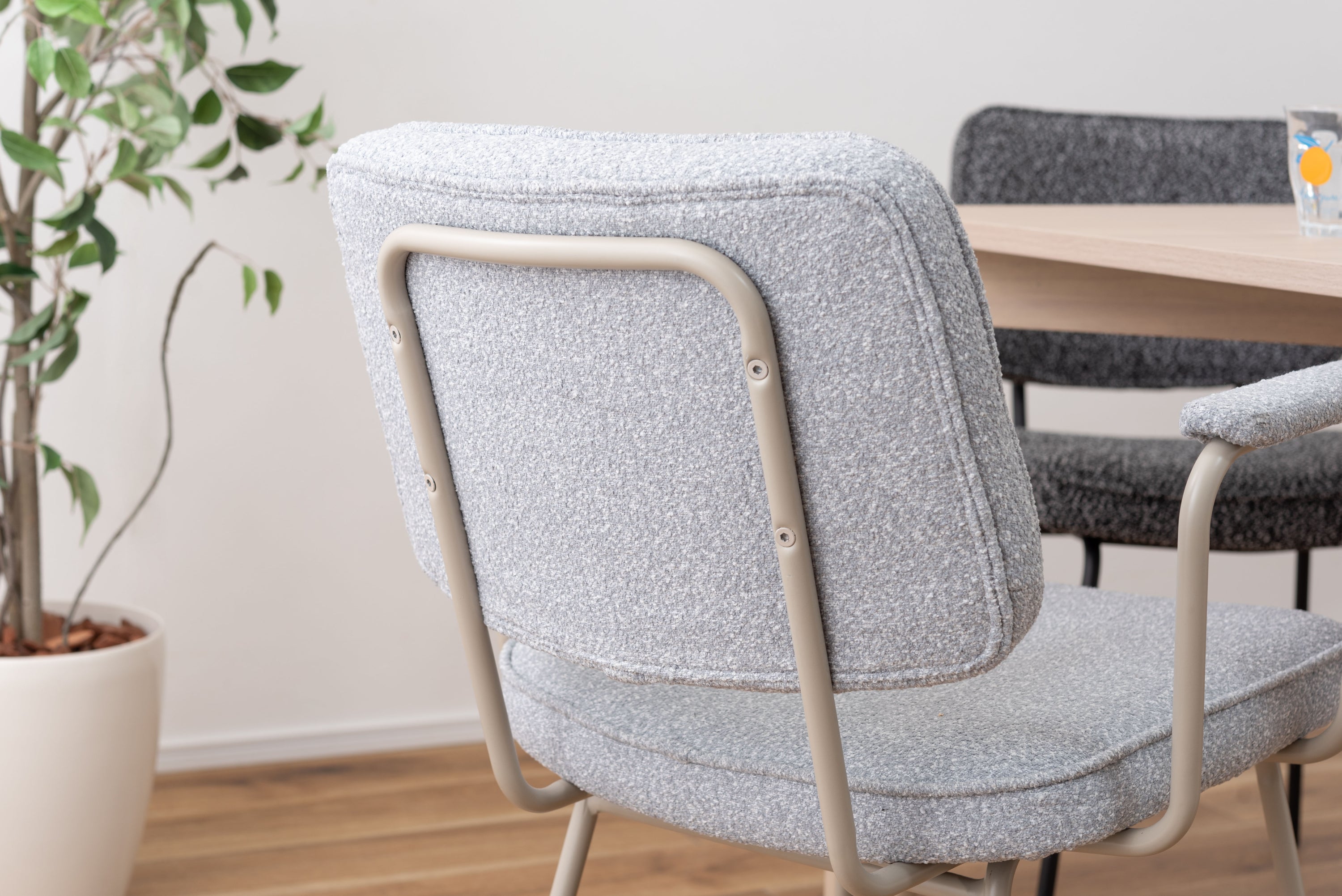 アーム部分に特徴的なデザインを施したチェア。ファブリックには混色のブークレ生地を使用し、表情のあるデザインに仕上げました。デザイン性と使いやすさ、快適さを兼ね備えたアイテムです。