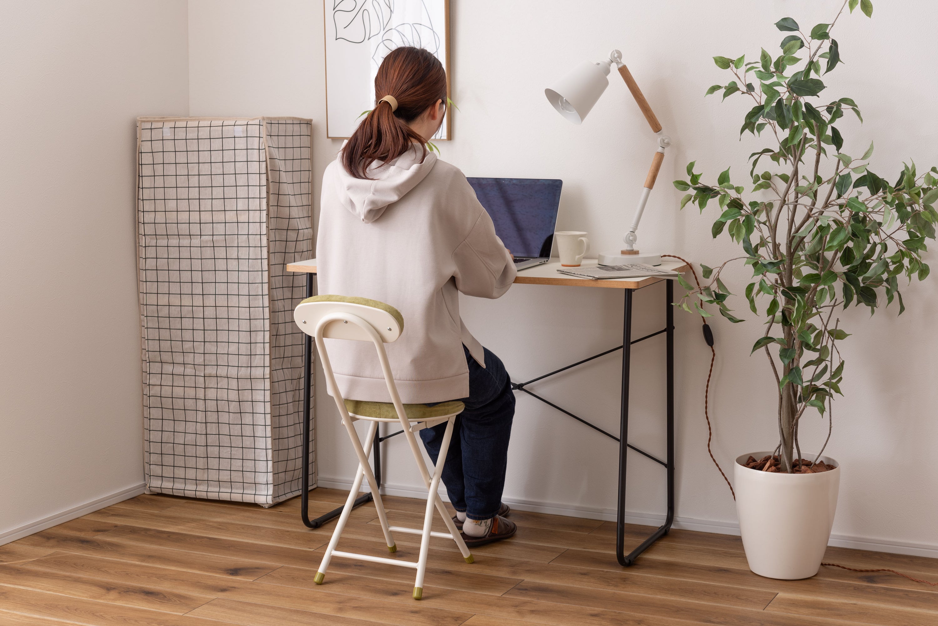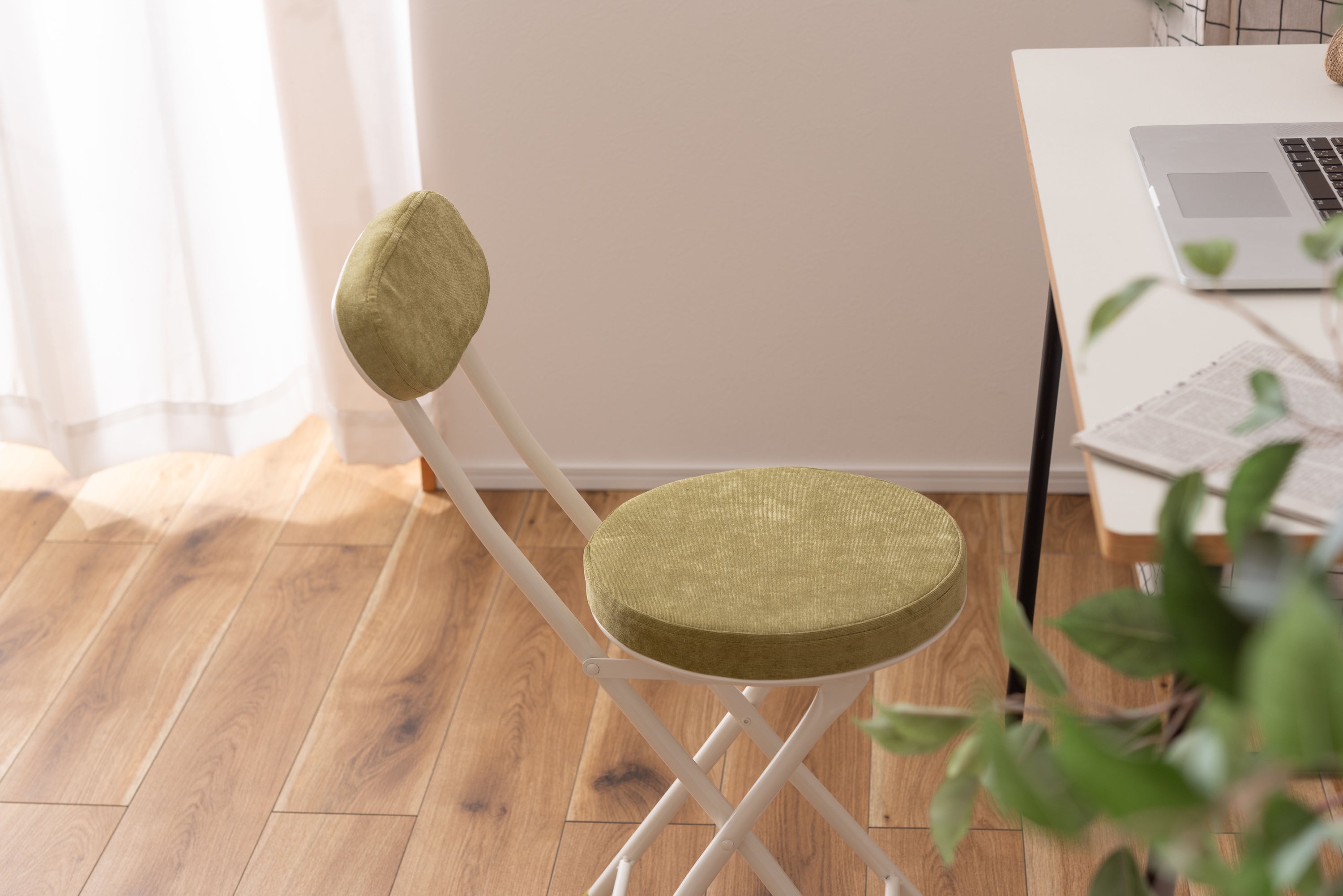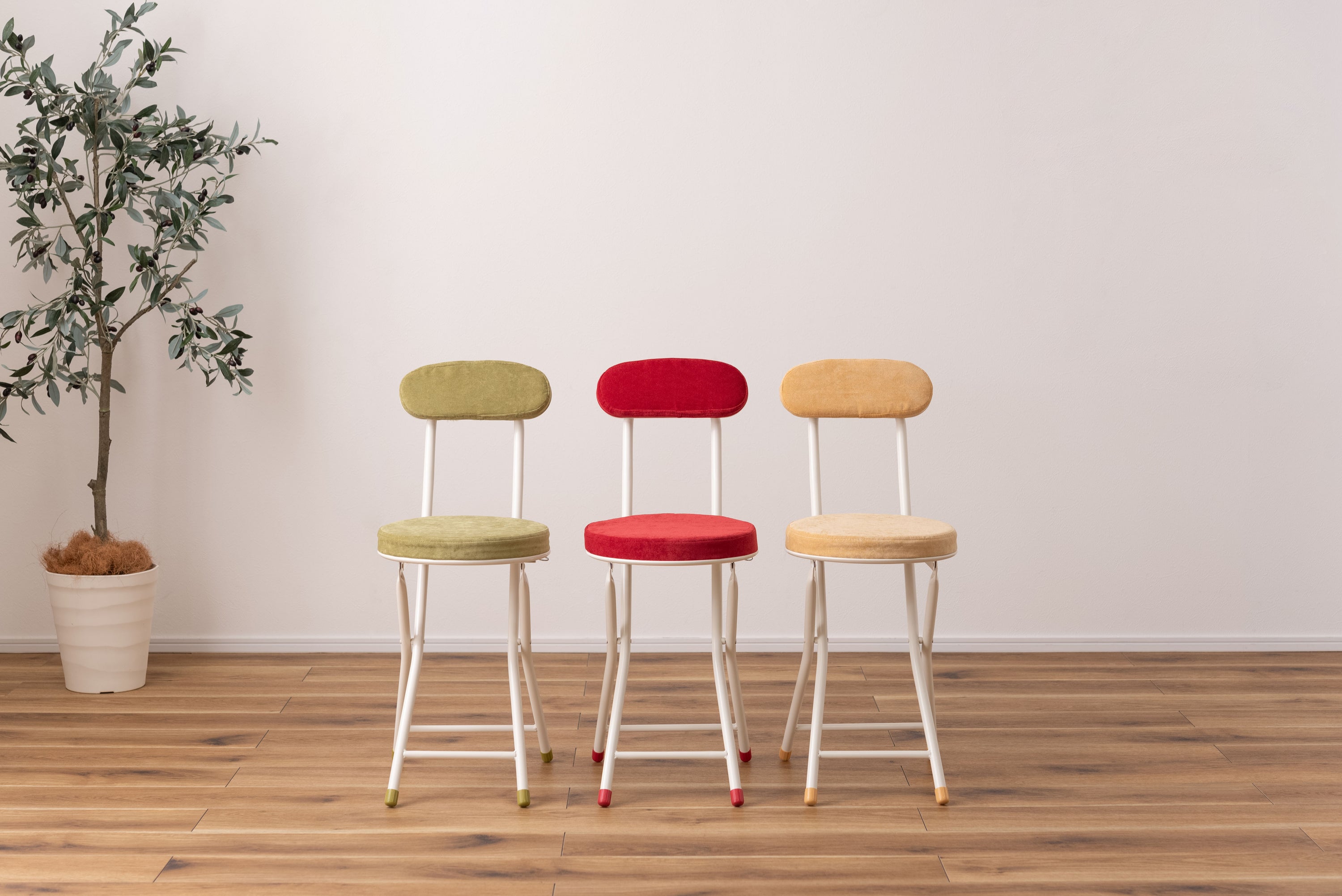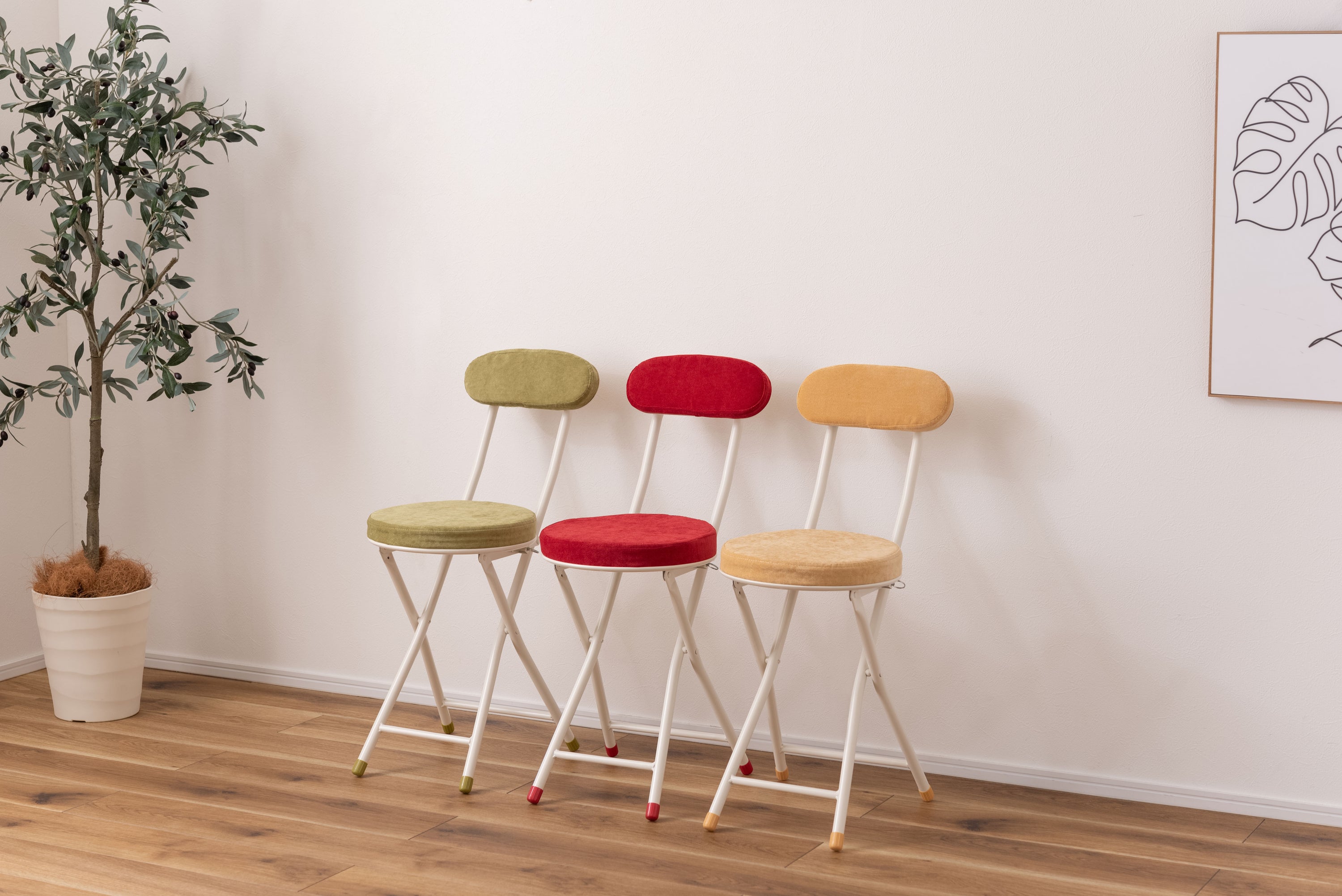 座り心地の良い厚みのある座面と背もたれ。程よく弾力があるので、いつまでも座っていられる座り心地。脚を広げた状態で持ち上げても脚が閉じないよう、座面下にバネ式のロック付き。折りたたみ式なので使わない時はすっきりとコンパクト収納。リビング、ダイニング、キッチン、洗面所、玄関周りのちょっとした隙間に収納可能。軽量仕様なのでお掃除の時の移動や持ち運びもらくらく。座面には手触りが良く高級感のあるベロア調生地を使用。座面サイズは30cmと使いやすいサイズ。来客用に、作業用に、ちょっと休憩用に便利なサイズ。脚先キャップが付いているので床への傷防止にもなり安心。