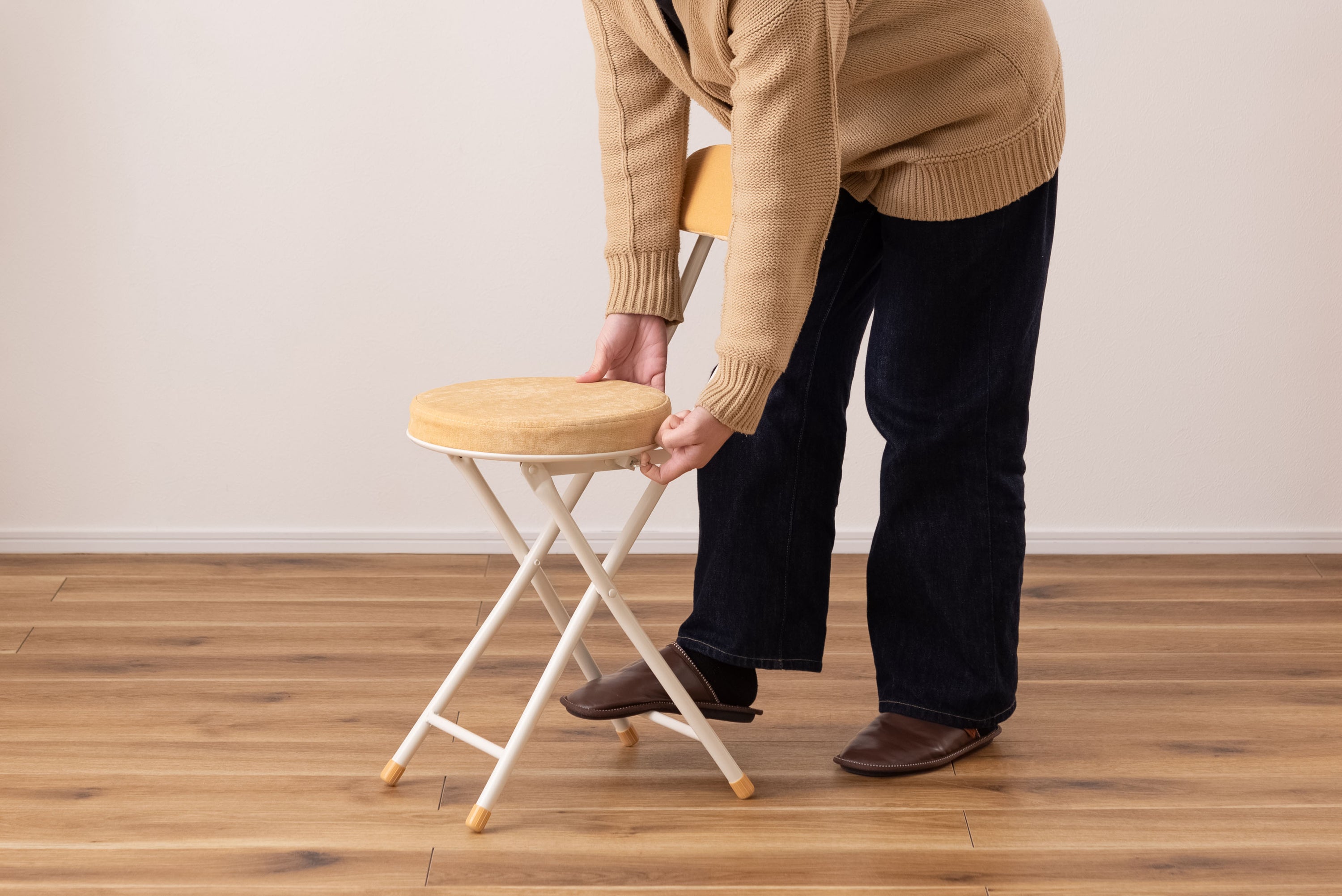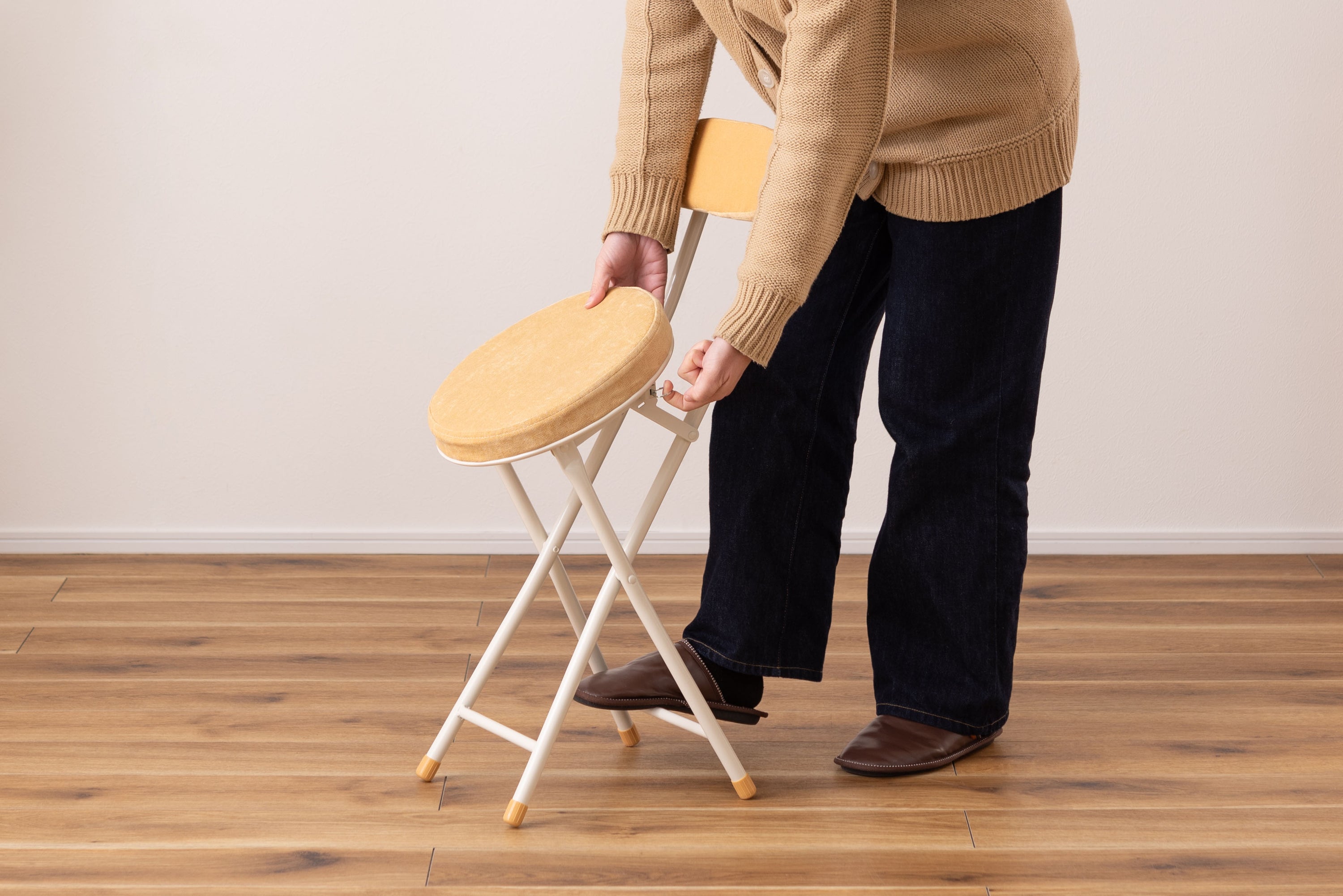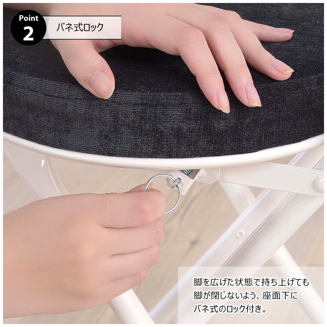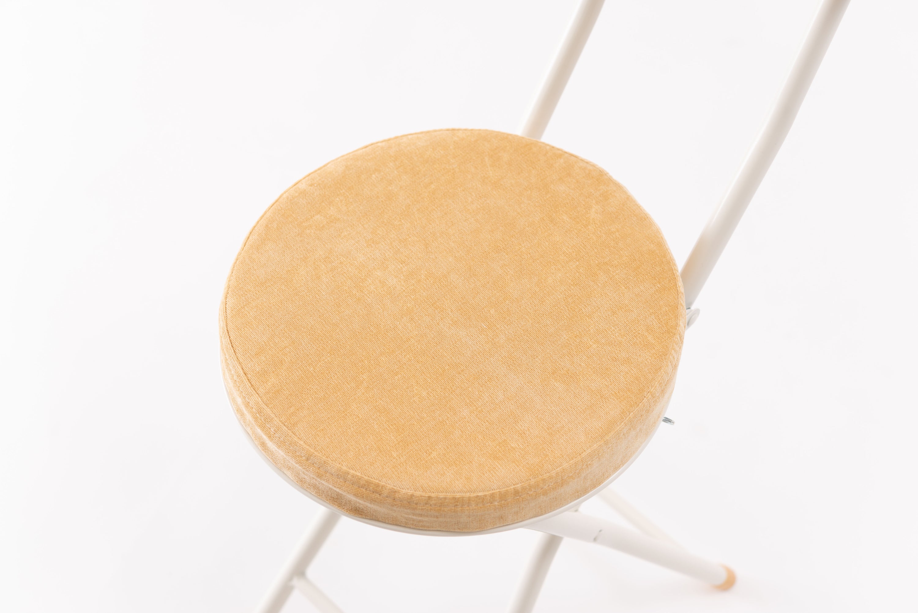 座り心地の良い厚みのある座面と背もたれ。程よく弾力があるので、いつまでも座っていられる座り心地。脚を広げた状態で持ち上げても脚が閉じないよう、座面下にバネ式のロック付き。折りたたみ式なので使わない時はすっきりとコンパクト収納。リビング、ダイニング、キッチン、洗面所、玄関周りのちょっとした隙間に収納可能。軽量仕様なのでお掃除の時の移動や持ち運びもらくらく。座面には手触りが良く高級感のあるベロア調生地を使用。座面サイズは30cmと使いやすいサイズ。来客用に、作業用に、ちょっと休憩用に便利なサイズ。脚先キャップが付いているので床への傷防止にもなり安心。