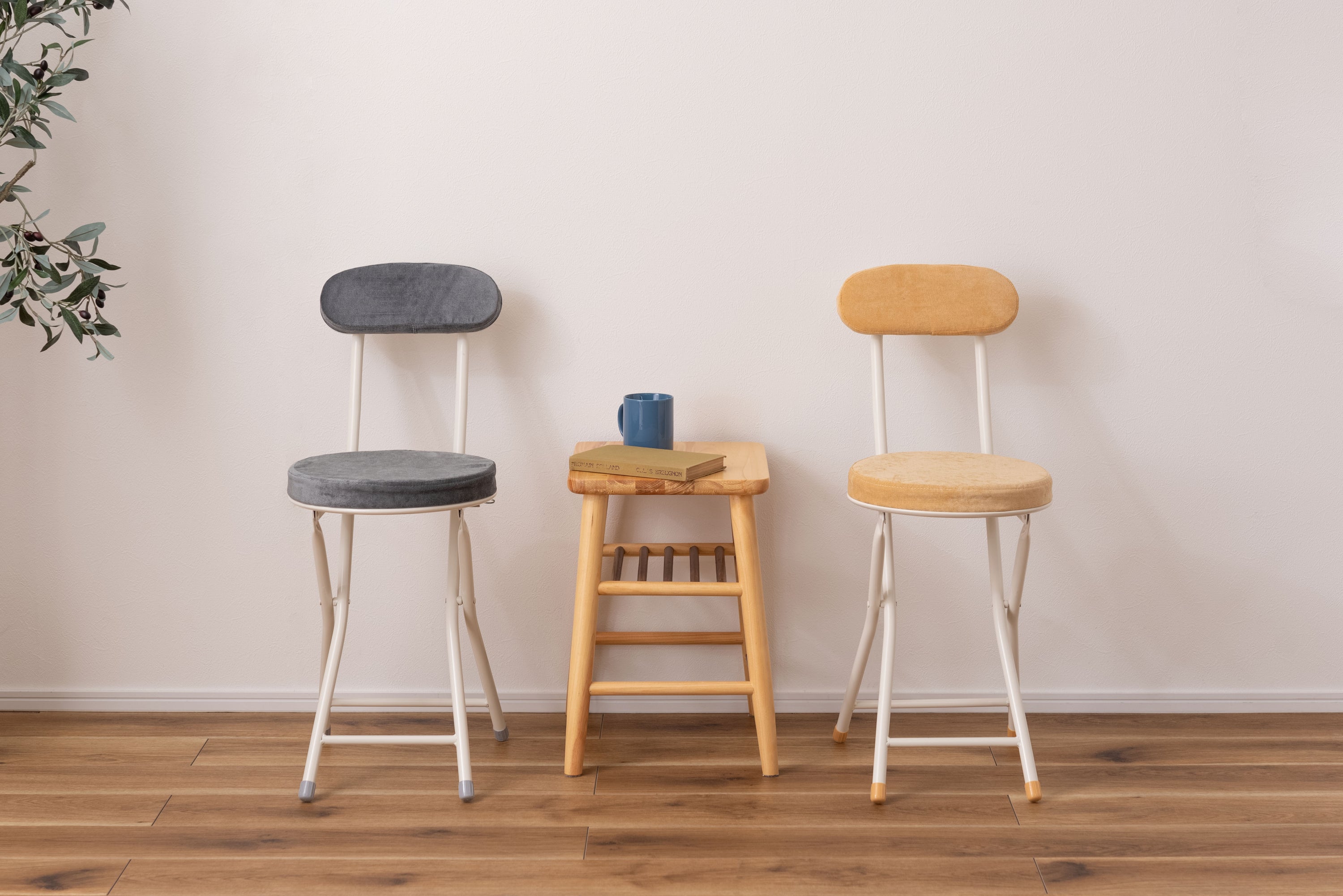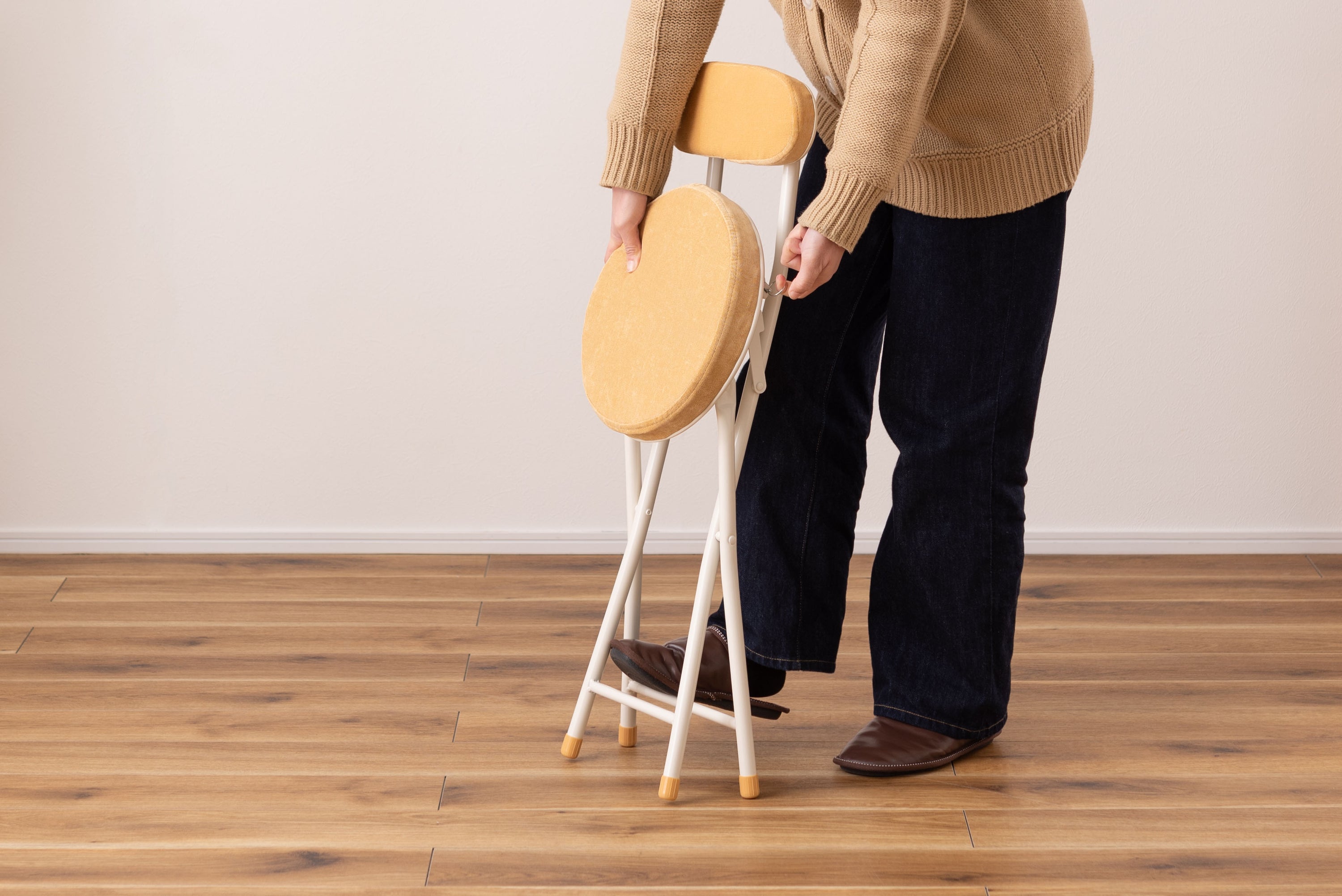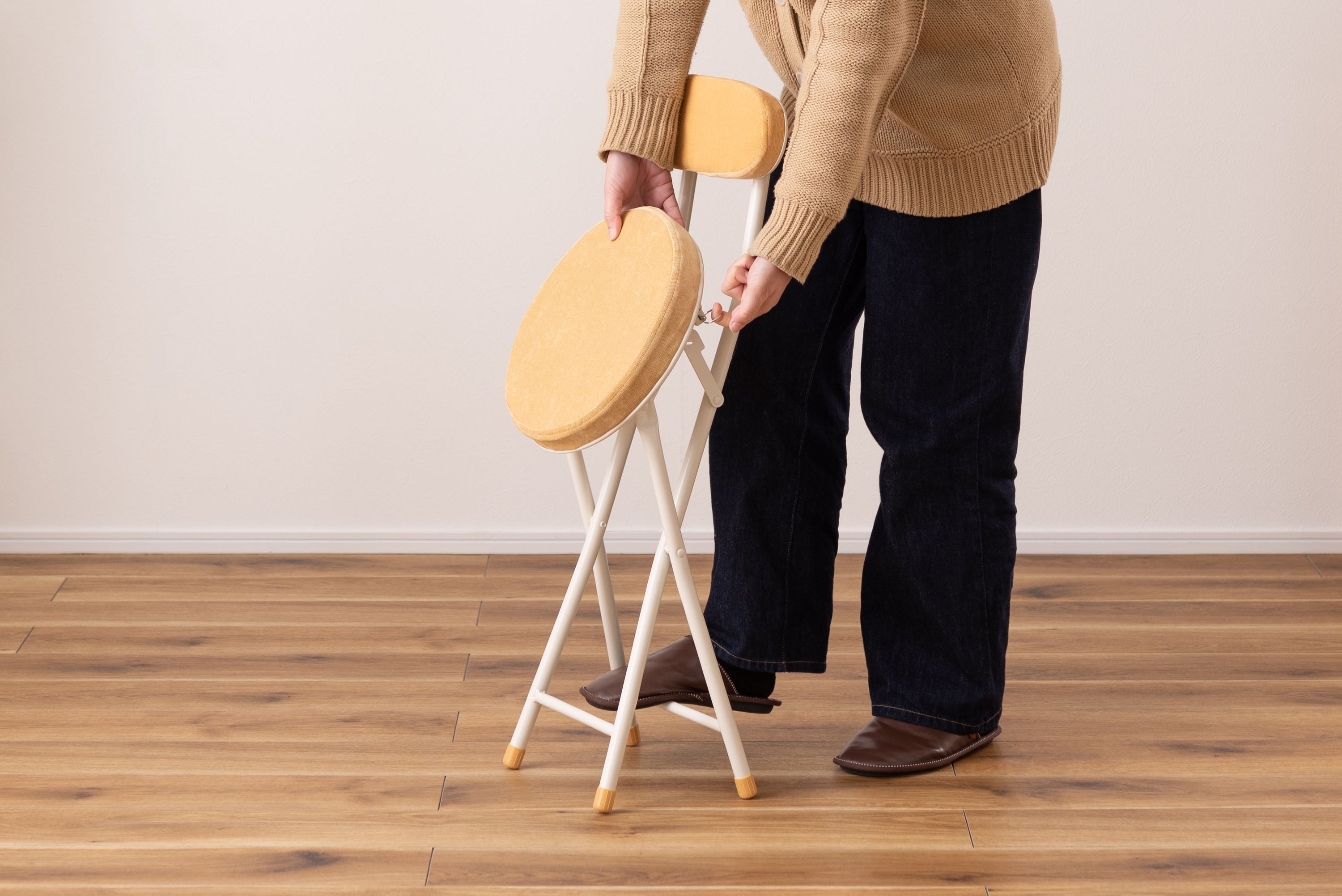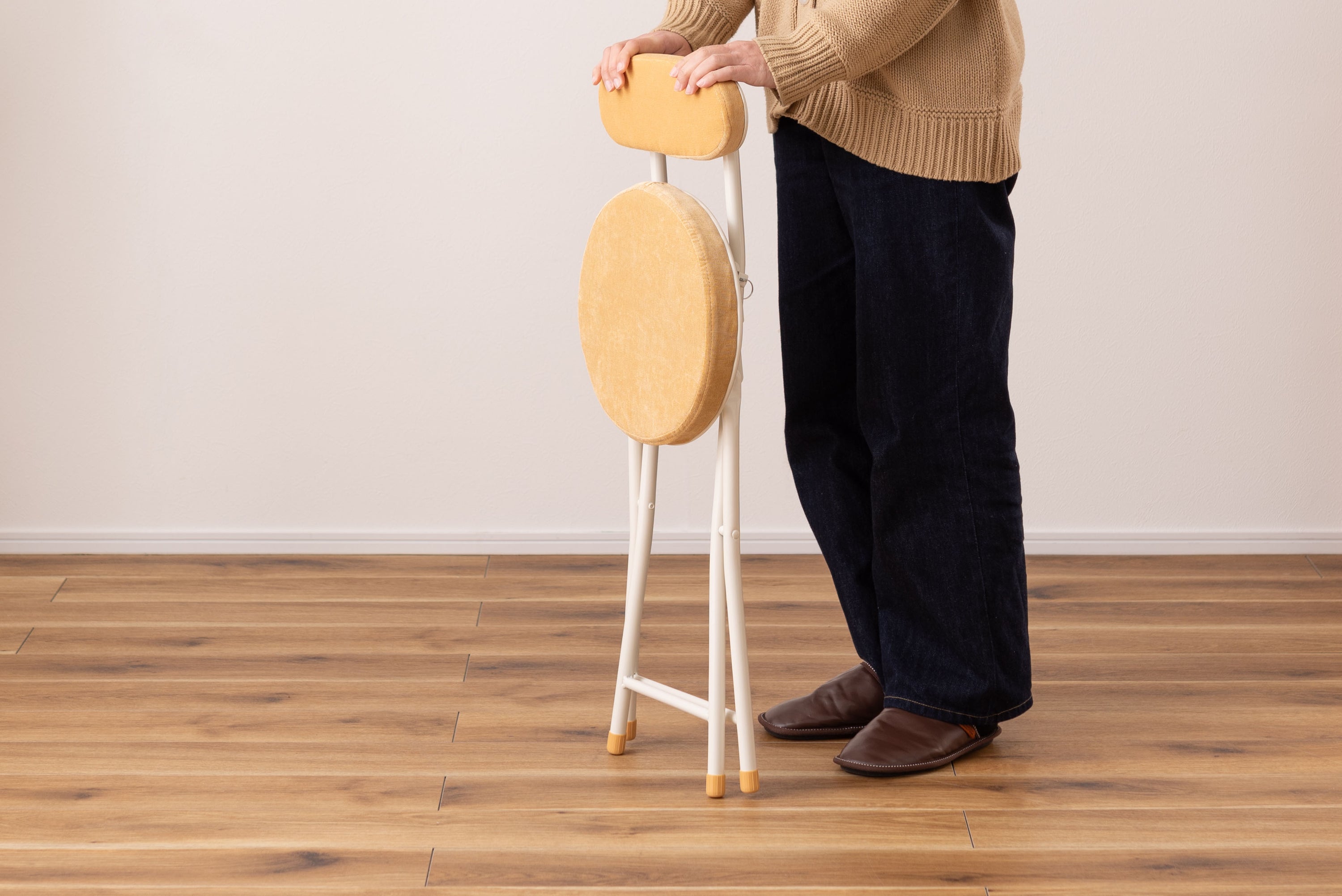 座り心地の良い厚みのある座面と背もたれ。程よく弾力があるので、いつまでも座っていられる座り心地。脚を広げた状態で持ち上げても脚が閉じないよう、座面下にバネ式のロック付き。折りたたみ式なので使わない時はすっきりとコンパクト収納。リビング、ダイニング、キッチン、洗面所、玄関周りのちょっとした隙間に収納可能。軽量仕様なのでお掃除の時の移動や持ち運びもらくらく。座面には手触りが良く高級感のあるベロア調生地を使用。座面サイズは30cmと使いやすいサイズ。来客用に、作業用に、ちょっと休憩用に便利なサイズ。脚先キャップが付いているので床への傷防止にもなり安心。