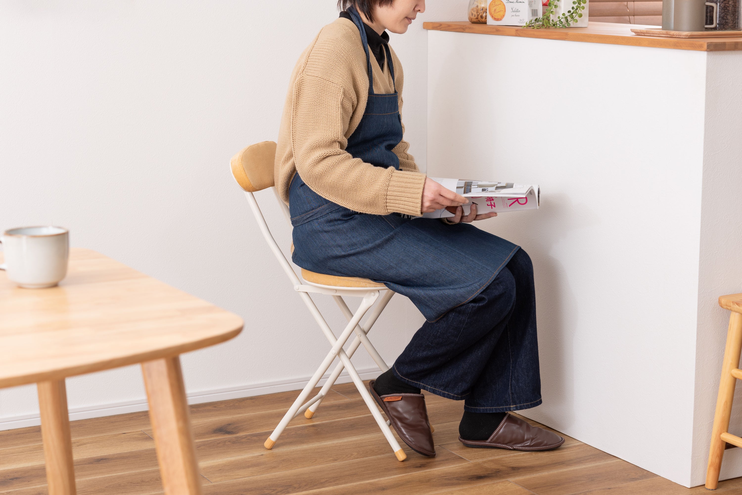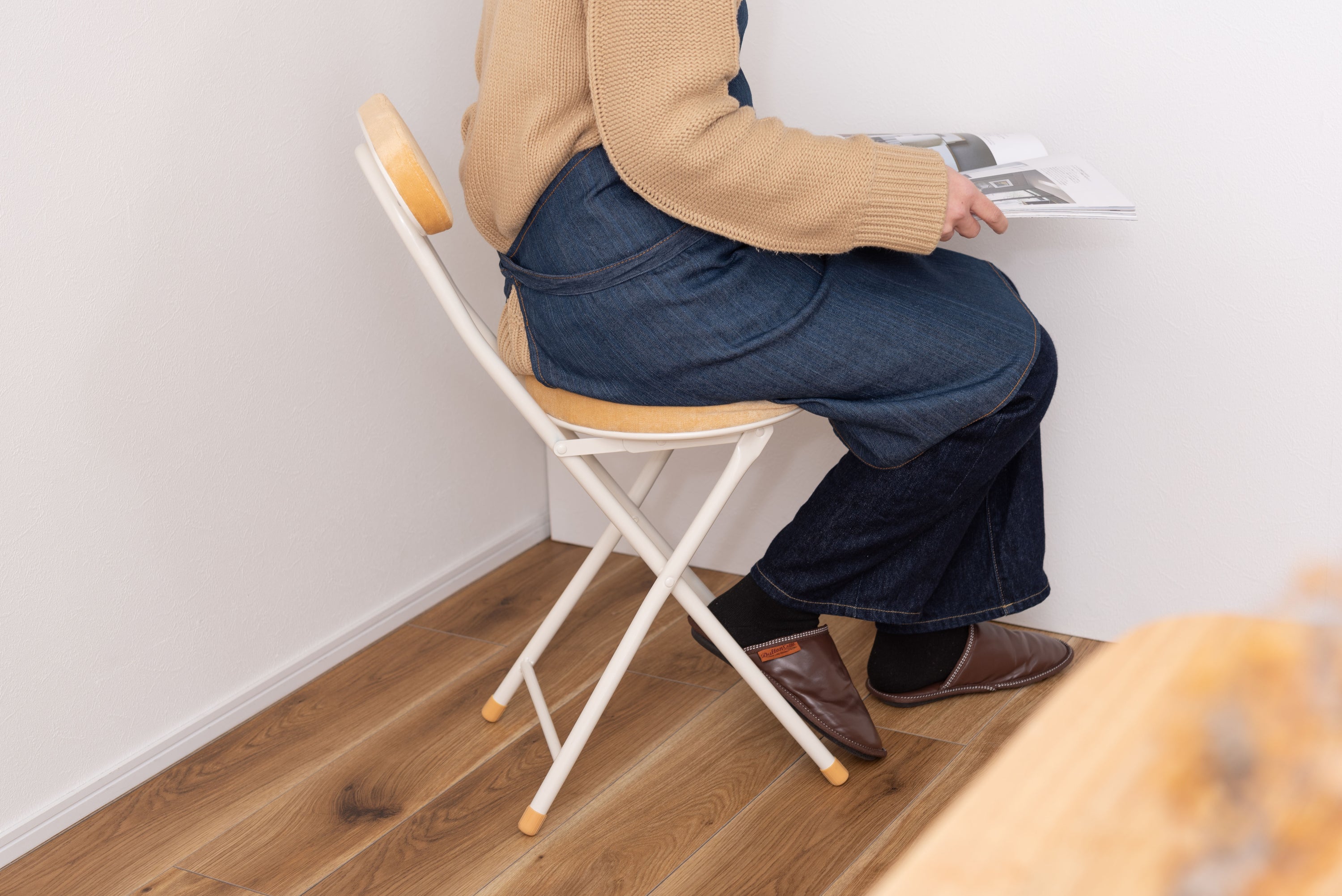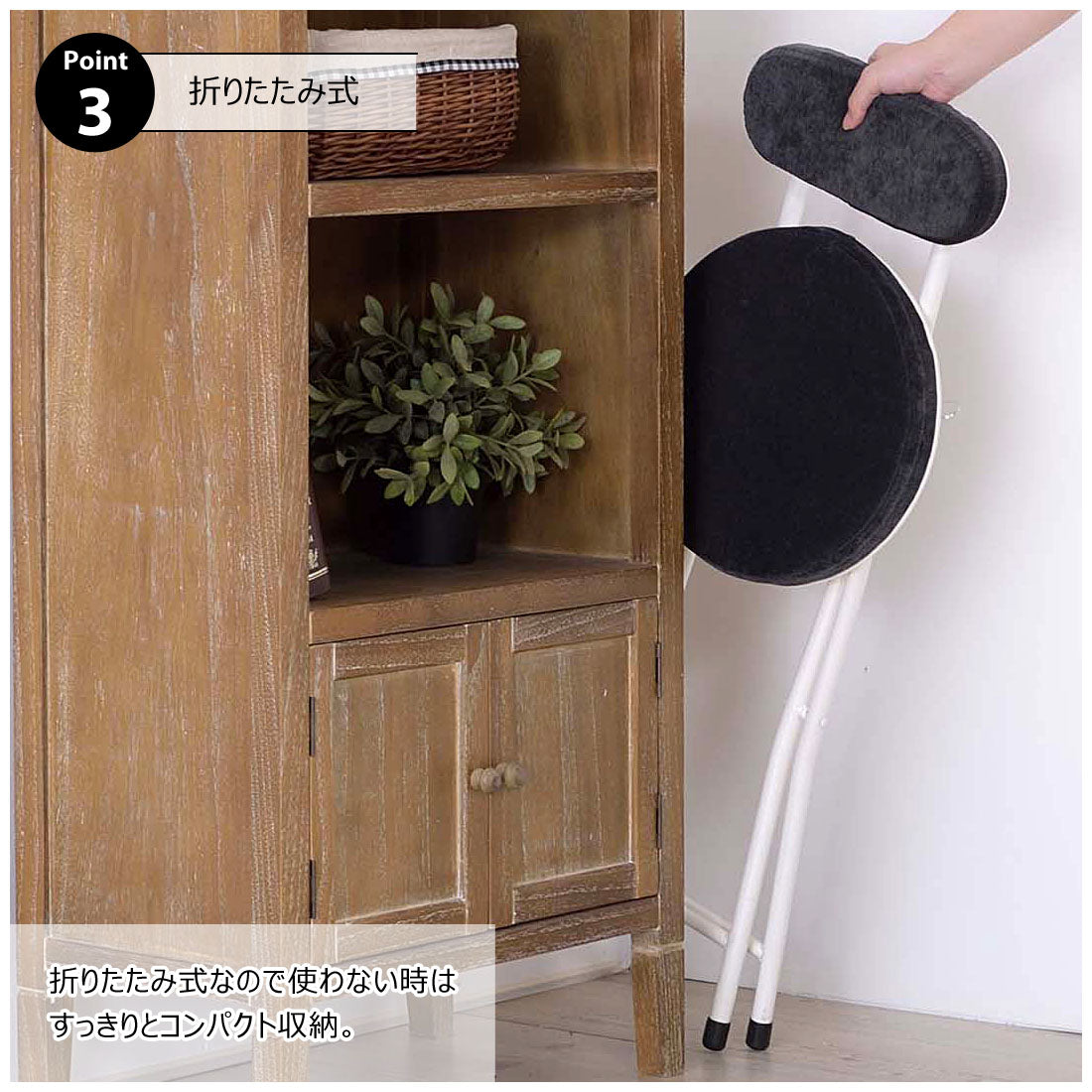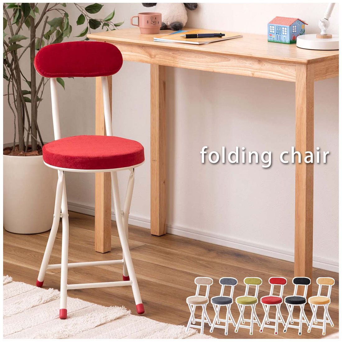 座り心地の良い厚みのある座面と背もたれ。程よく弾力があるので、いつまでも座っていられる座り心地。脚を広げた状態で持ち上げても脚が閉じないよう、座面下にバネ式のロック付き。折りたたみ式なので使わない時はすっきりとコンパクト収納。リビング、ダイニング、キッチン、洗面所、玄関周りのちょっとした隙間に収納可能。軽量仕様なのでお掃除の時の移動や持ち運びもらくらく。座面には手触りが良く高級感のあるベロア調生地を使用。座面サイズは30cmと使いやすいサイズ。来客用に、作業用に、ちょっと休憩用に便利なサイズ。脚先キャップが付いているので床への傷防止にもなり安心。