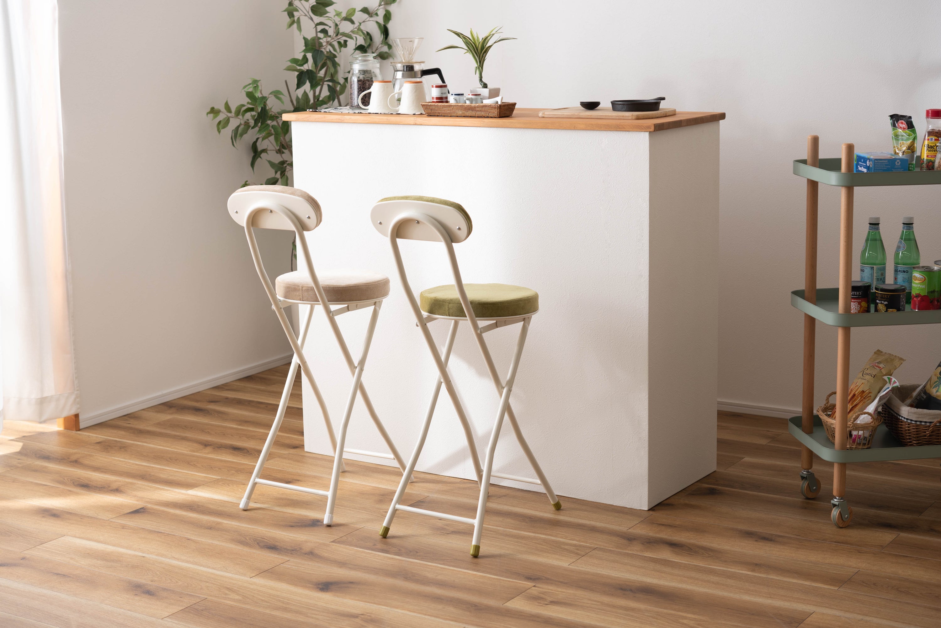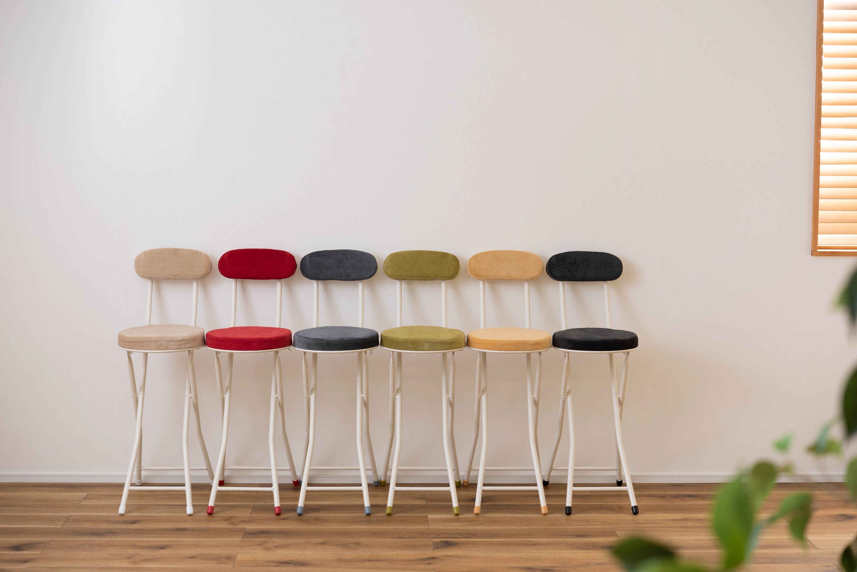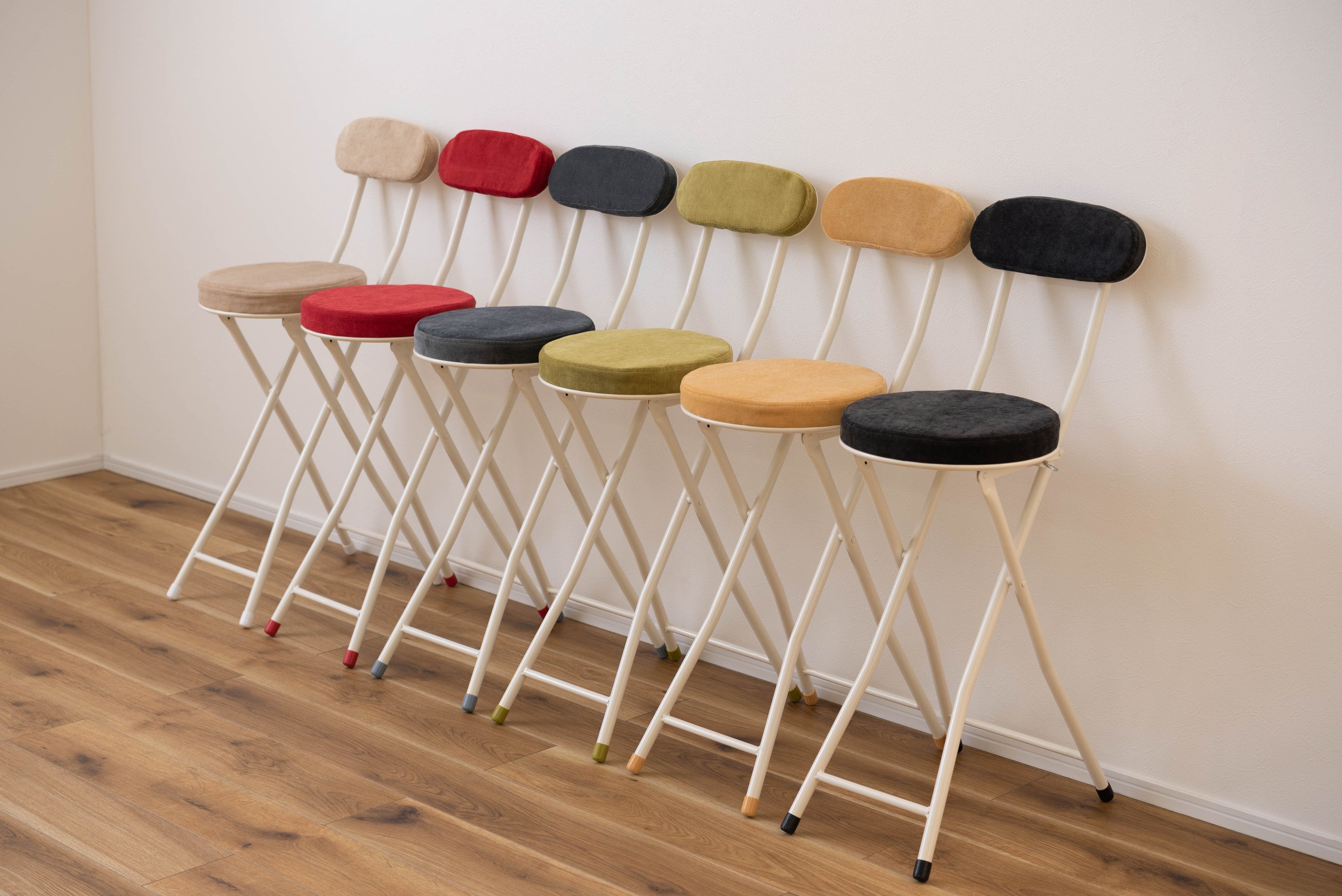人気の折りたたみチェアにハイバージョンが登場。コンパクト感はそのままに、カウンターや高めのテーブルなどにピッタリのサイズ。クッション性抜群で座り心地の良い分厚い座面。安心のロック付き。軽量なので持ち運びもラクラク。折りたたみ式(フォールディング式)なので、隙間収納に最適。ベロア生地のように細かく起毛した手触りの良い生地。脚先キャップは座面の色と同色に揃えたデザイン。床への傷防止にもなり安心です