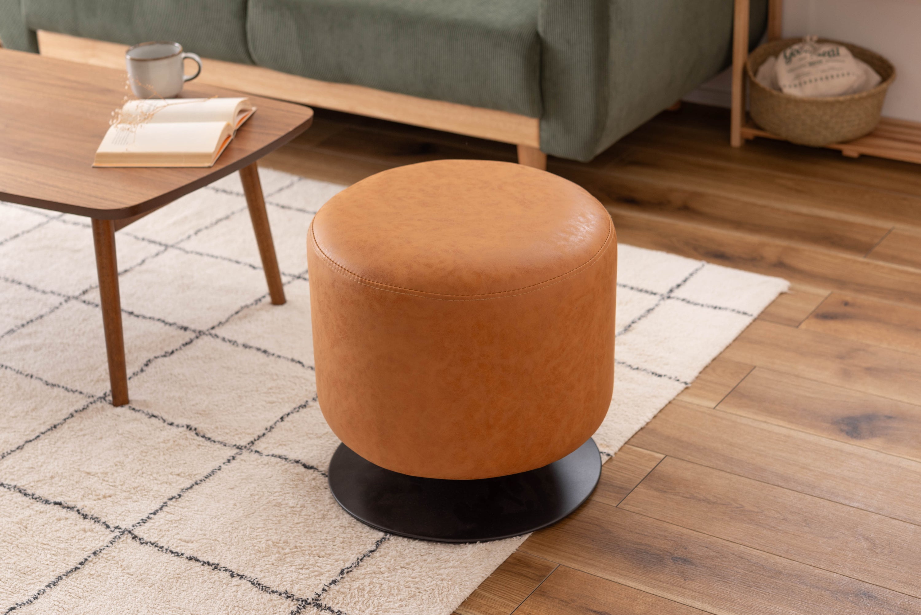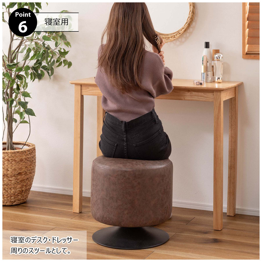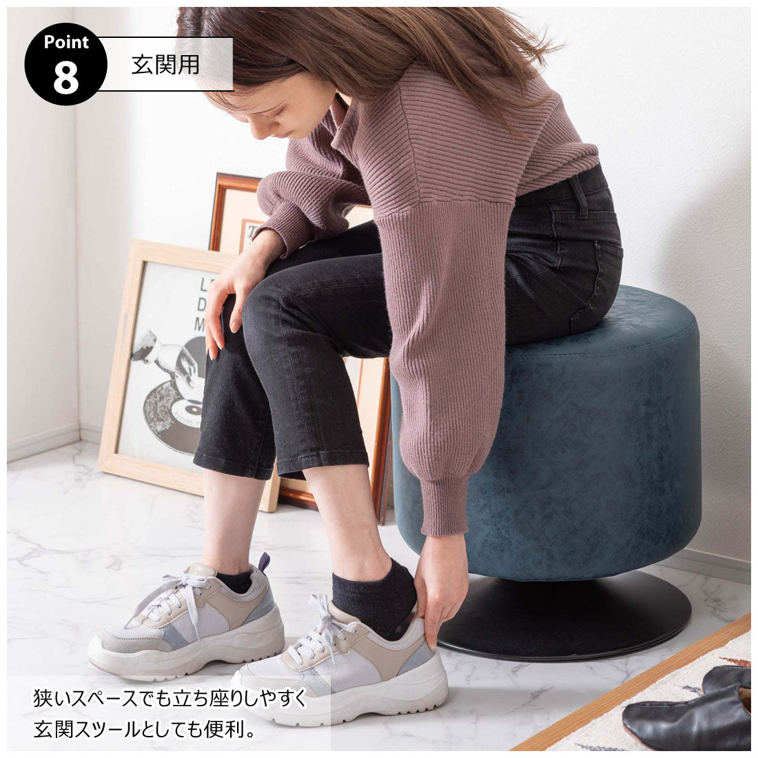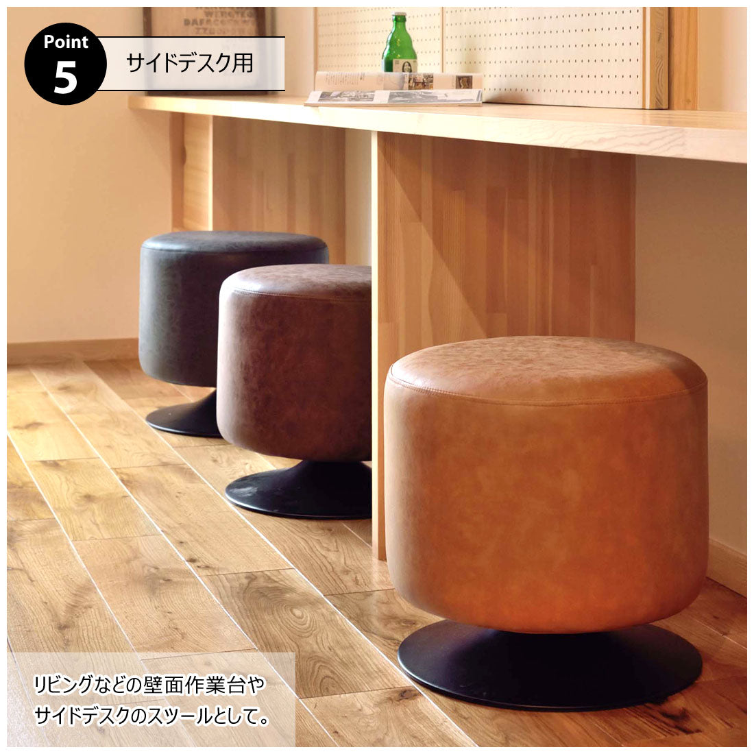本革のような風合いのソフトレザーを使用した360°回転するスツール。 座面が直径40cm/本体重量約5kgと安定感のあるスツール。 土台となるスチールの裏面には保護材が付いた仕様。 ウレタン入り座面のしっかりとした座り心地。 座面高40cmとチェアに近い高さなので様々なシーンで使える丁度良いサイズ。 リビングなどの壁面作業台やサイドデスクのスツールとして。 寝室のデスク・ドレッサー周りのスツールとして。 ダイニング周りの予備スツールとして。 狭いスペースでも立ち座りしやすく玄関スツールとしても便利。 ソファ前に置いてオットマンとして。 ソファ横に置いてちょっとした小物置きスペースとしても。 直径40×高さ40cmの持ち運べるサイズ。