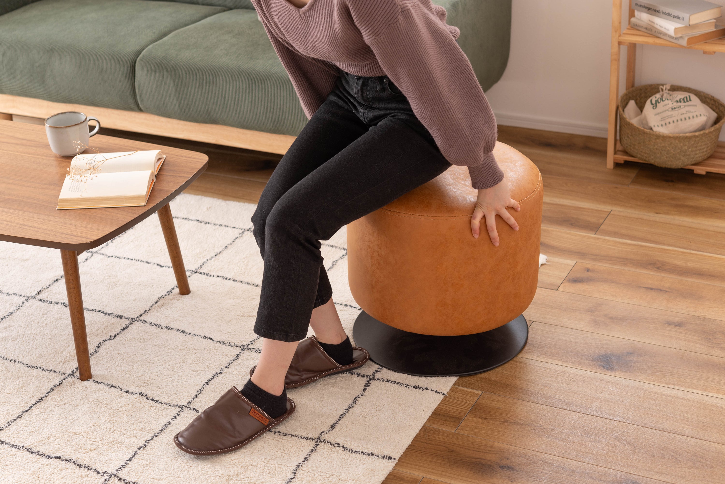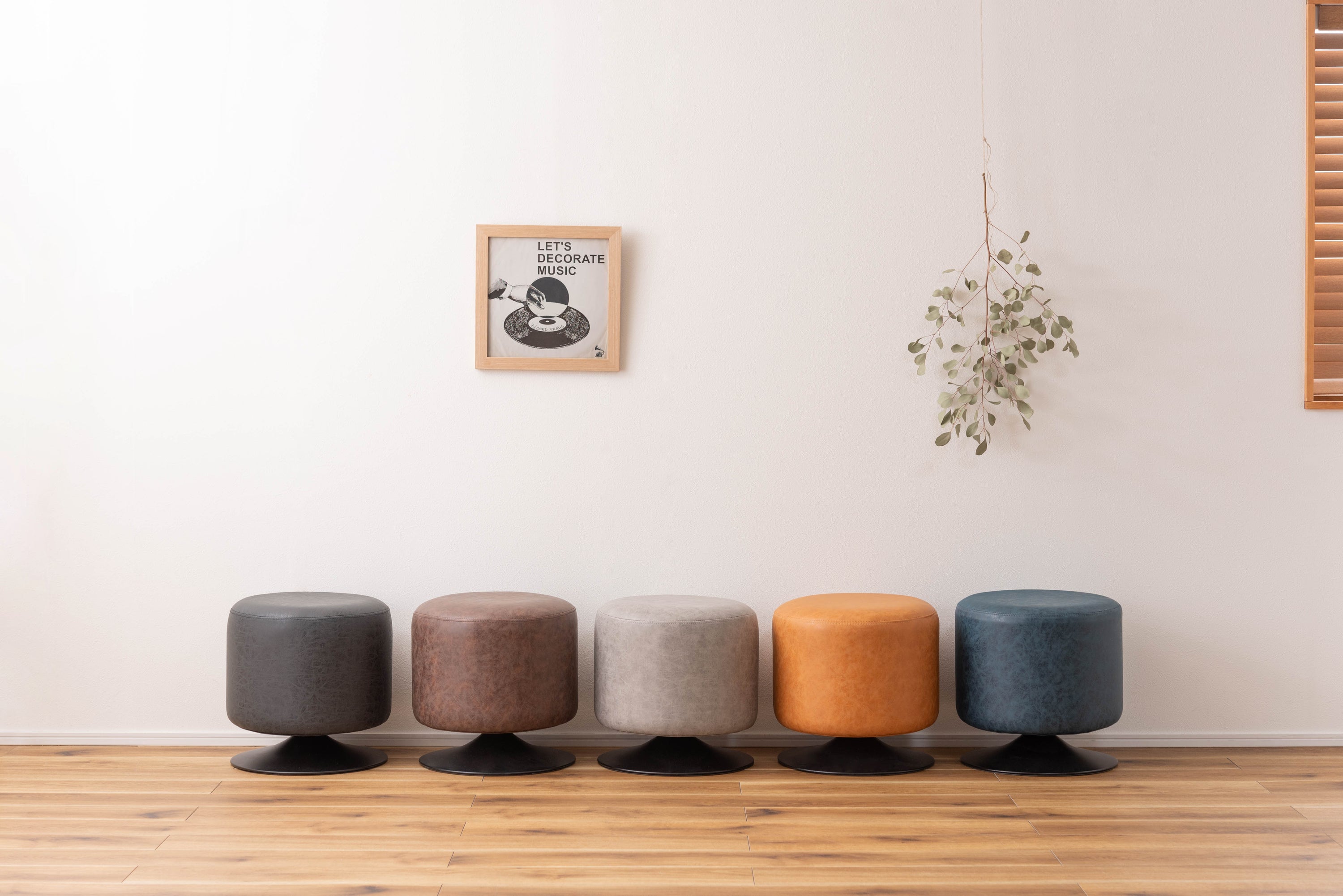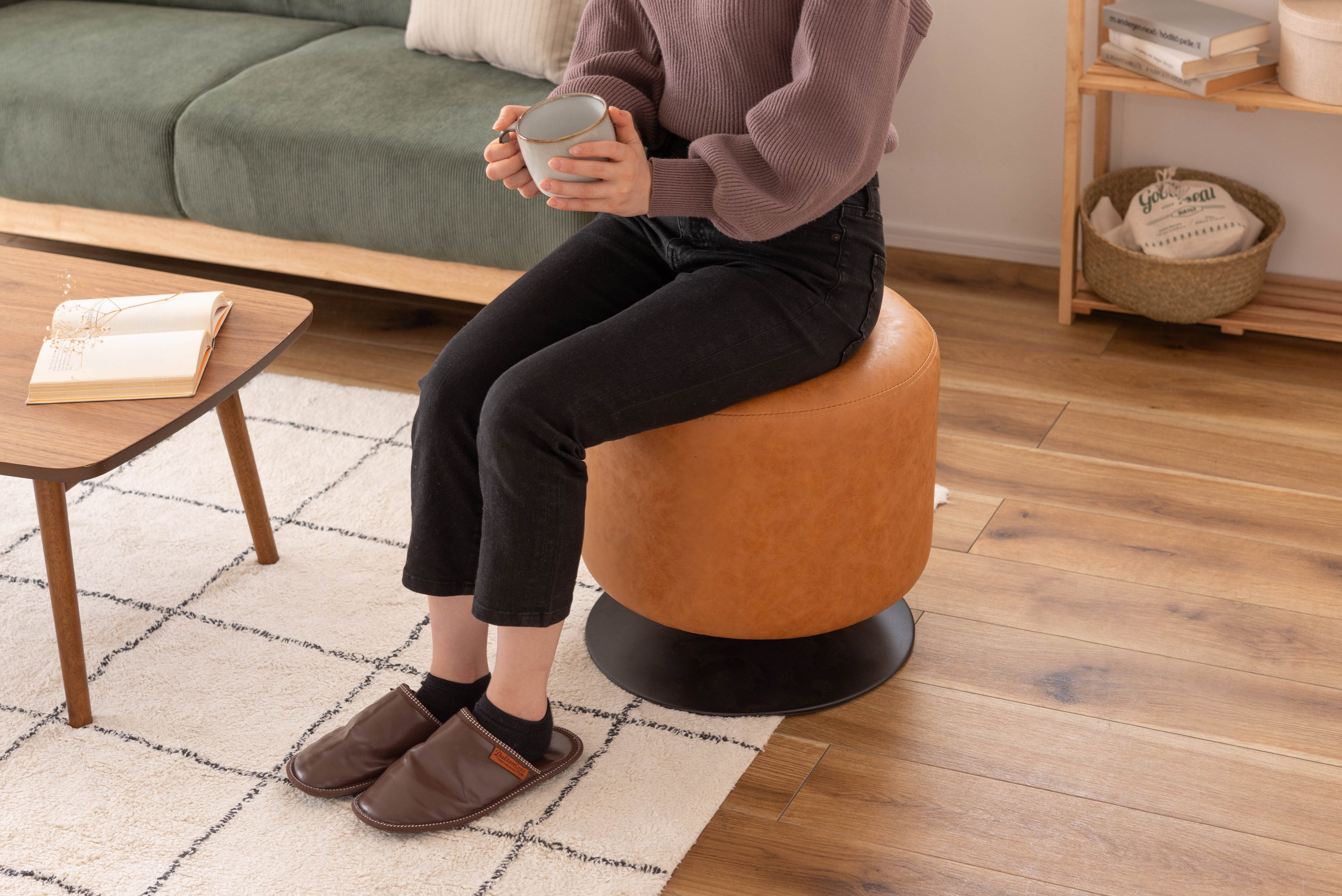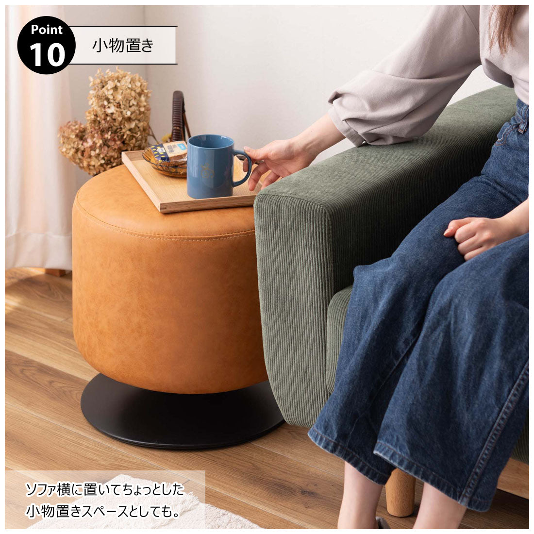 本革のような風合いのソフトレザーを使用した360°回転するスツール。 座面が直径40cm/本体重量約5kgと安定感のあるスツール。 土台となるスチールの裏面には保護材が付いた仕様。 ウレタン入り座面のしっかりとした座り心地。 座面高40cmとチェアに近い高さなので様々なシーンで使える丁度良いサイズ。 リビングなどの壁面作業台やサイドデスクのスツールとして。 寝室のデスク・ドレッサー周りのスツールとして。 ダイニング周りの予備スツールとして。 狭いスペースでも立ち座りしやすく玄関スツールとしても便利。 ソファ前に置いてオットマンとして。 ソファ横に置いてちょっとした小物置きスペースとしても。 直径40×高さ40cmの持ち運べるサイズ。