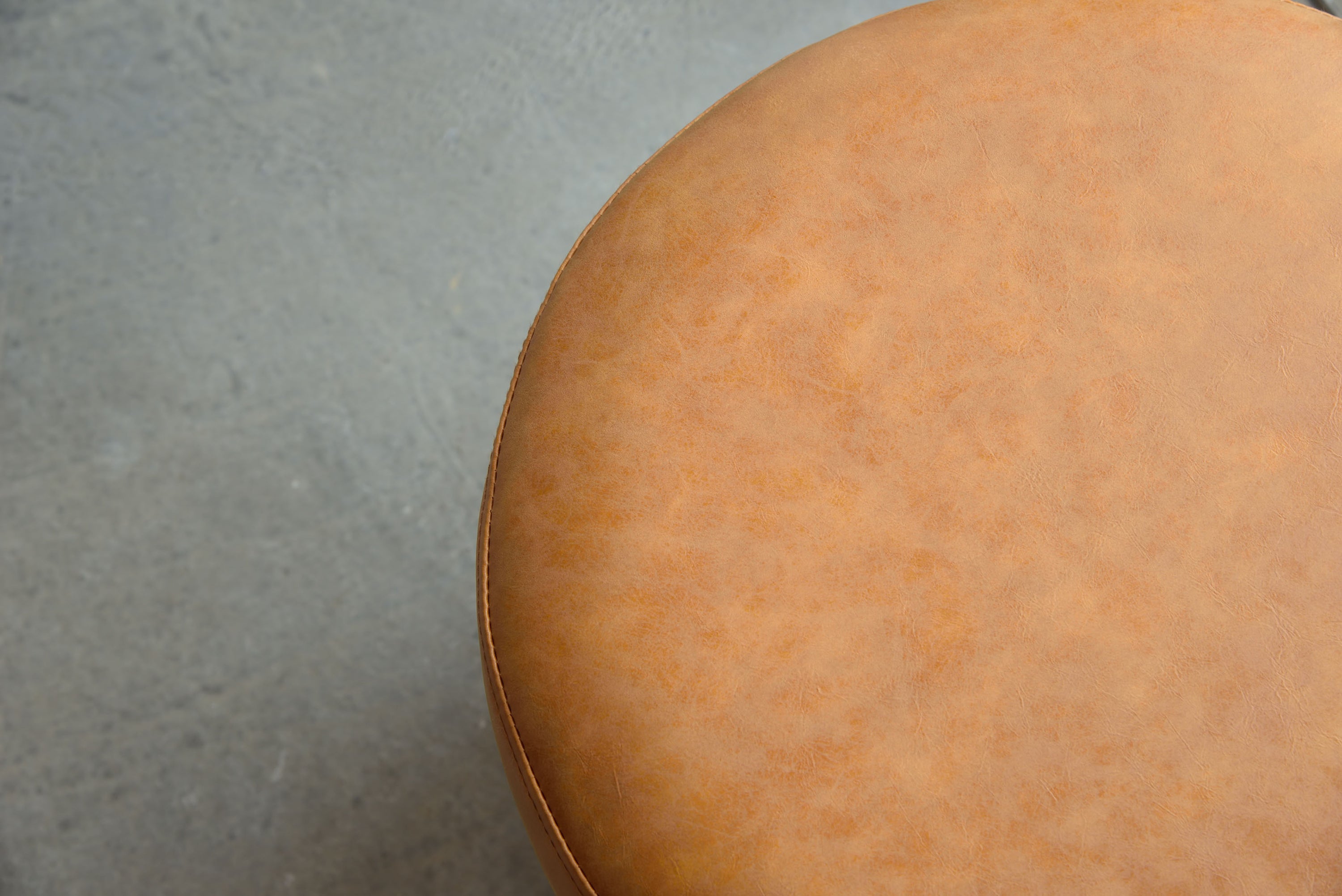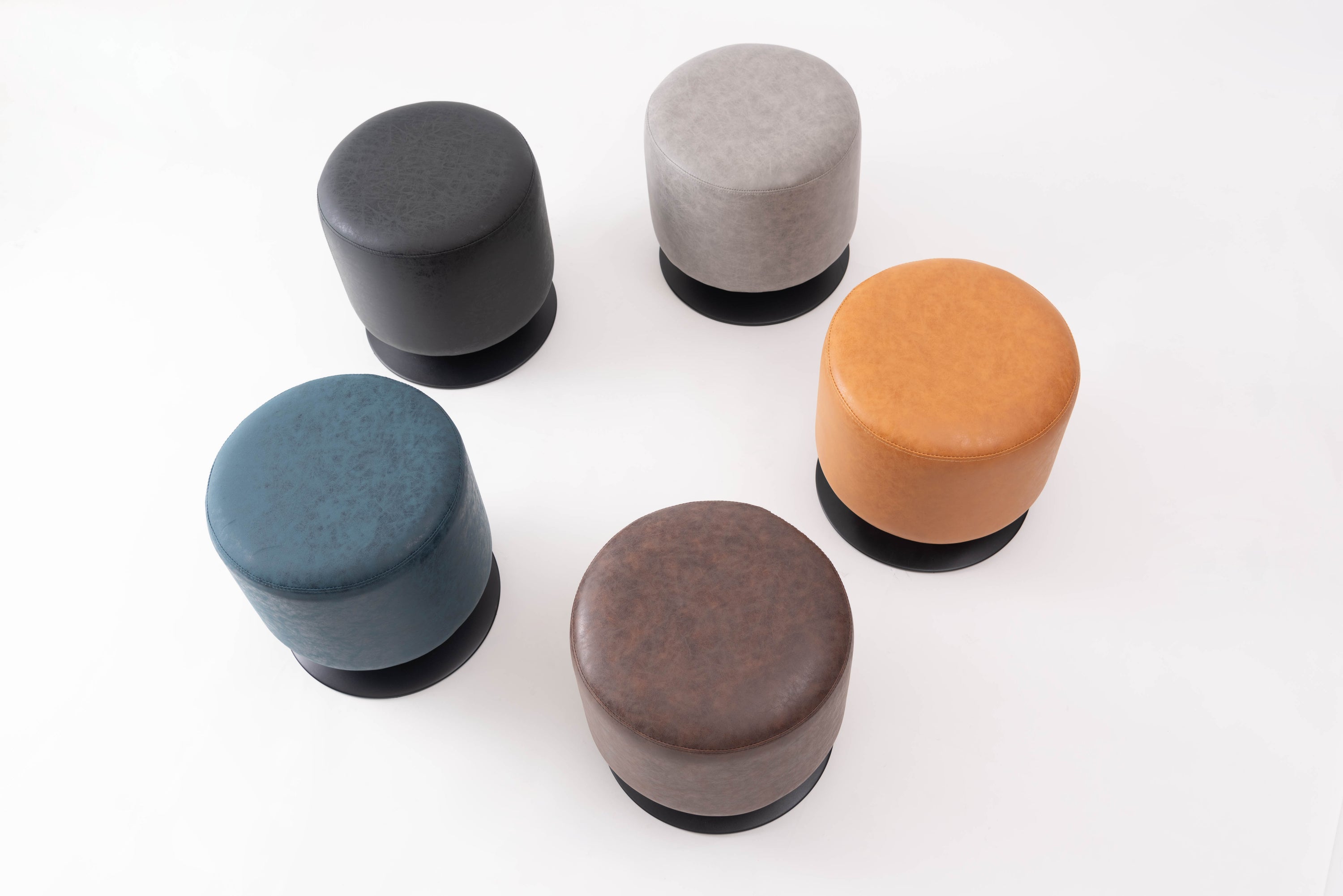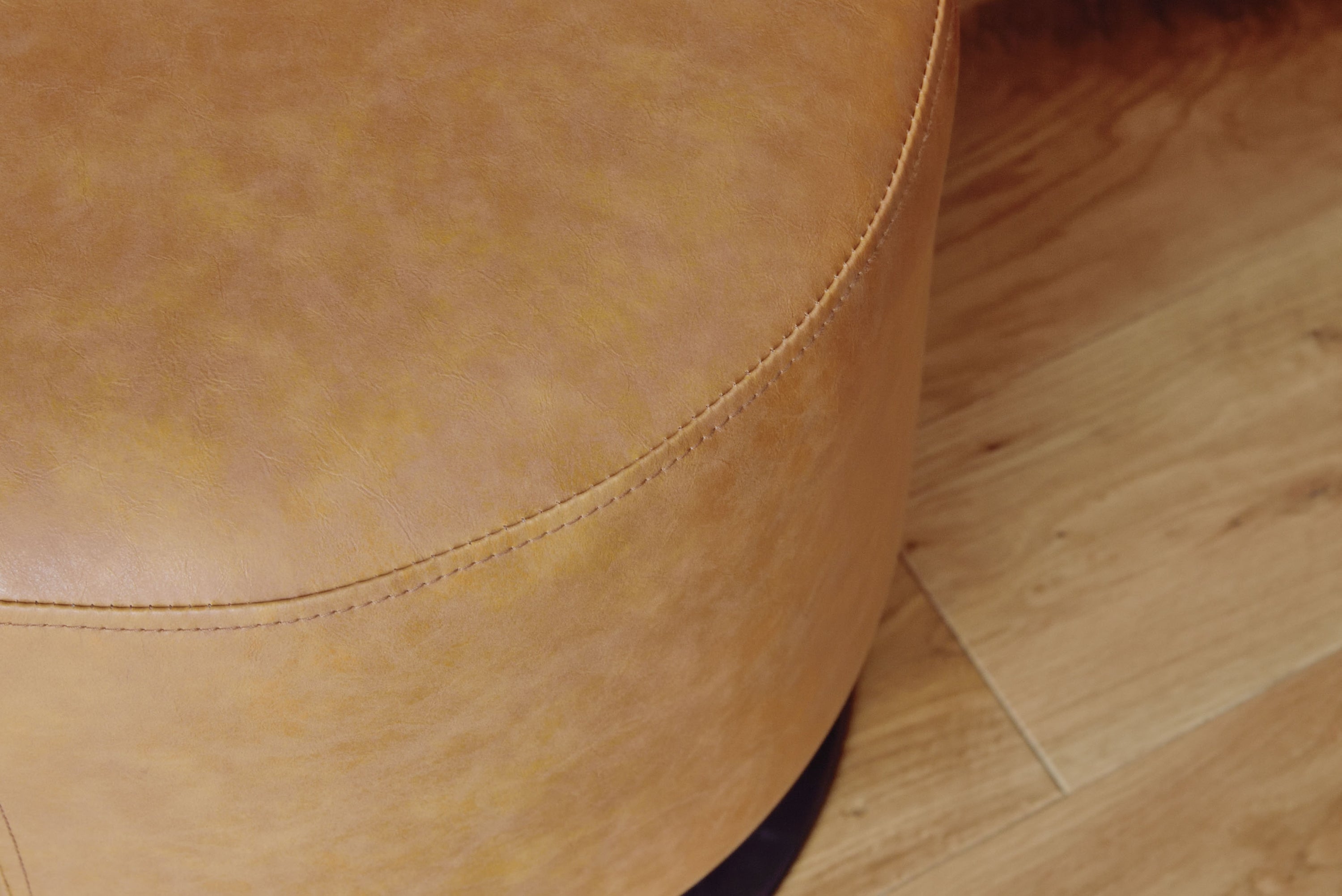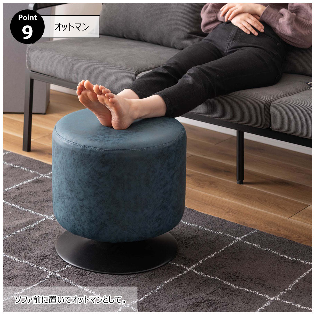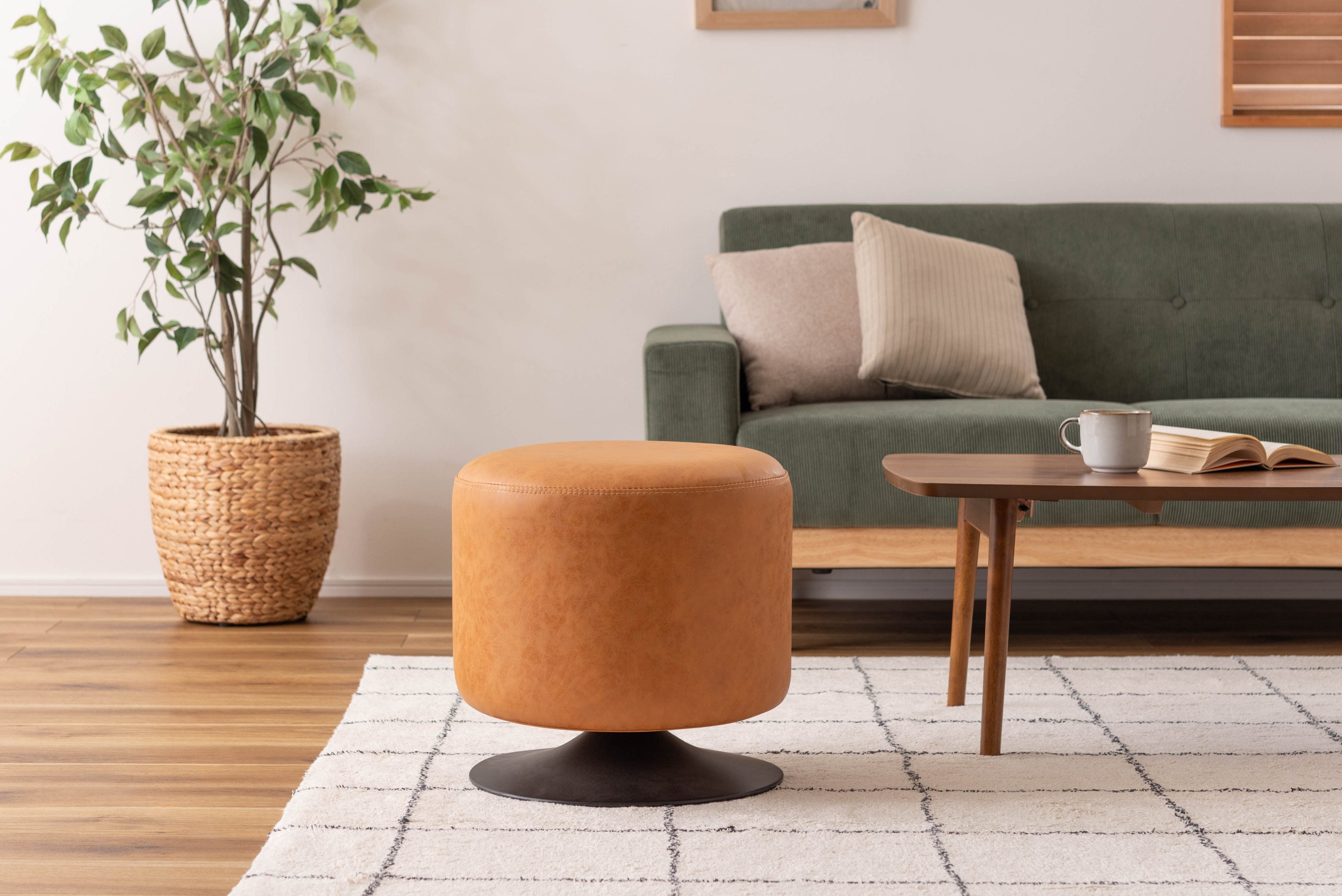 本革のような風合いのソフトレザーを使用した360°回転するスツール。 座面が直径40cm/本体重量約5kgと安定感のあるスツール。 土台となるスチールの裏面には保護材が付いた仕様。 ウレタン入り座面のしっかりとした座り心地。 座面高40cmとチェアに近い高さなので様々なシーンで使える丁度良いサイズ。 リビングなどの壁面作業台やサイドデスクのスツールとして。 寝室のデスク・ドレッサー周りのスツールとして。 ダイニング周りの予備スツールとして。 狭いスペースでも立ち座りしやすく玄関スツールとしても便利。 ソファ前に置いてオットマンとして。 ソファ横に置いてちょっとした小物置きスペースとしても。 直径40×高さ40cmの持ち運べるサイズ。