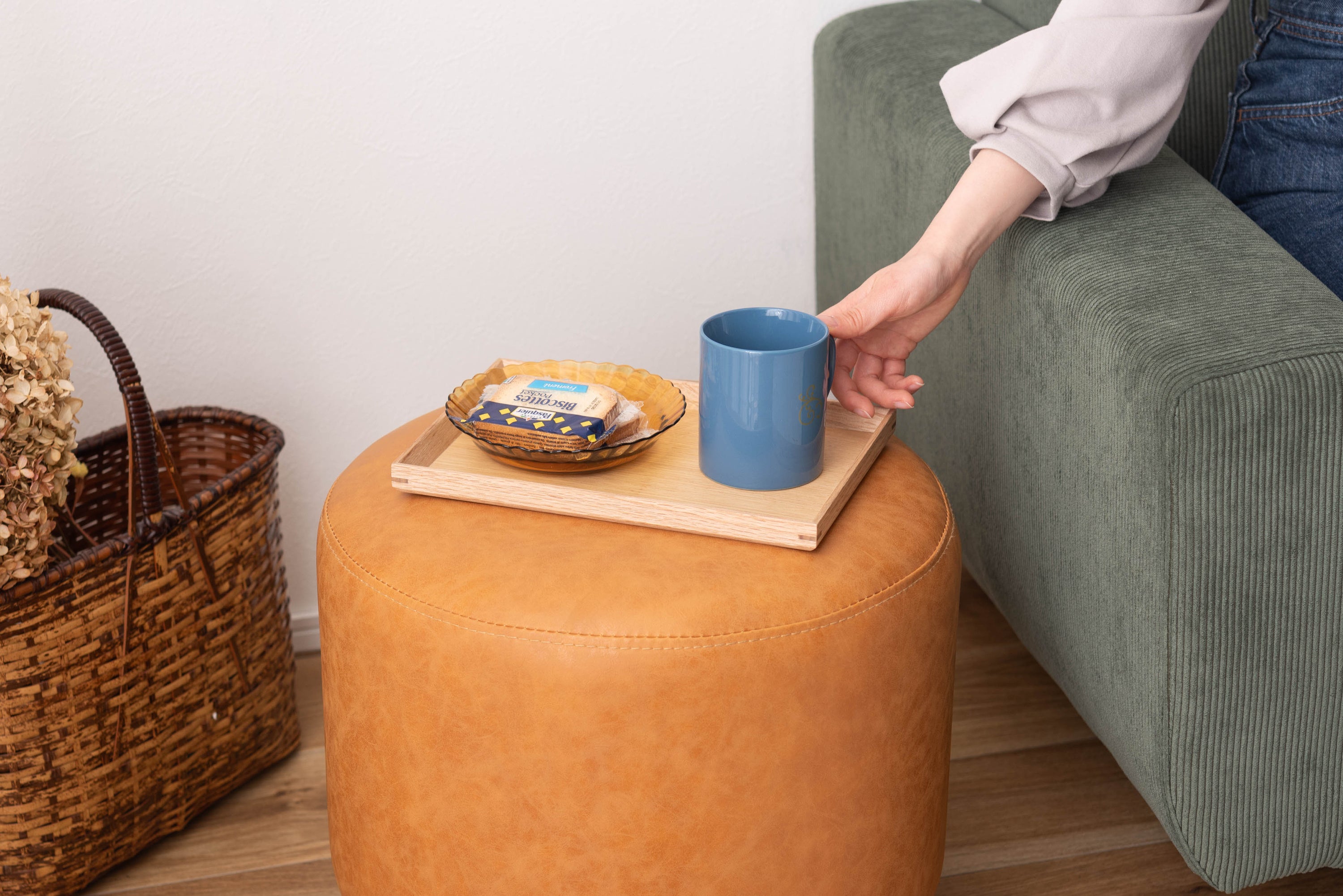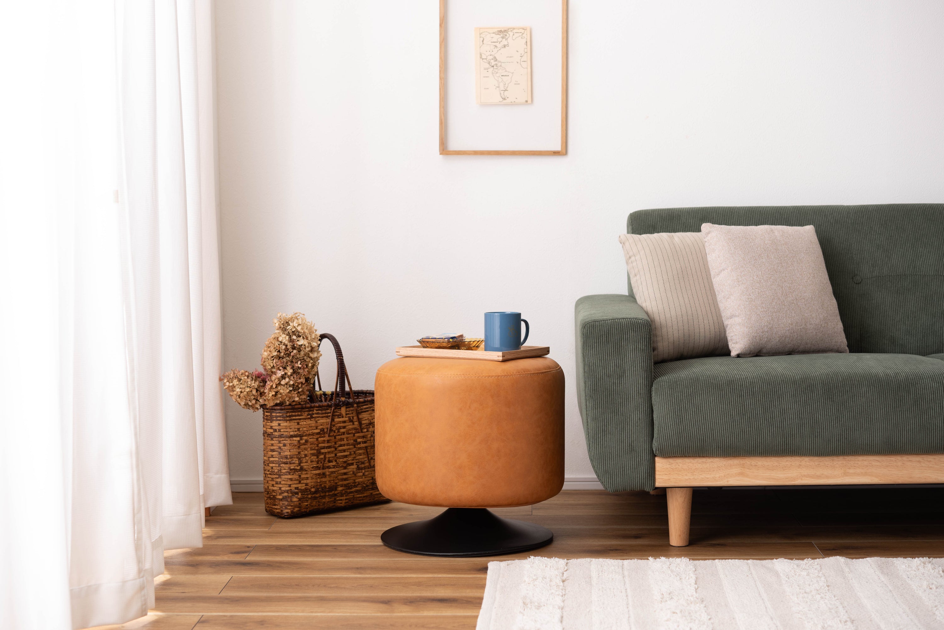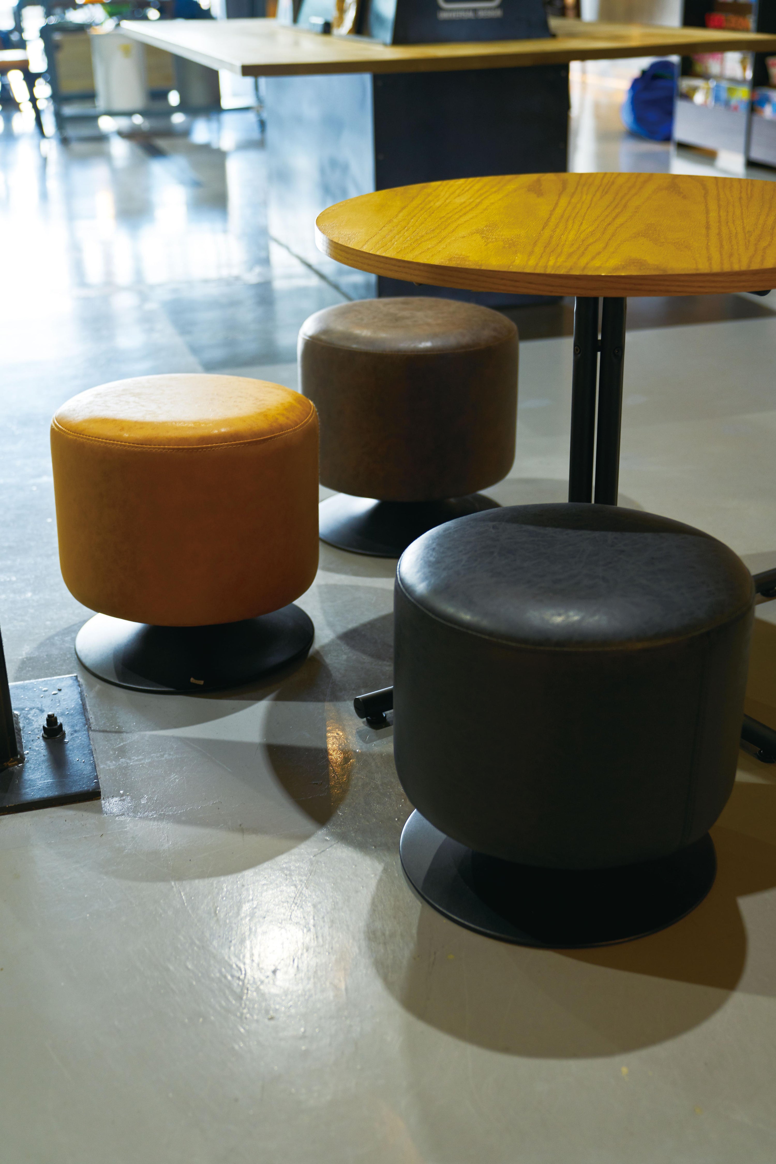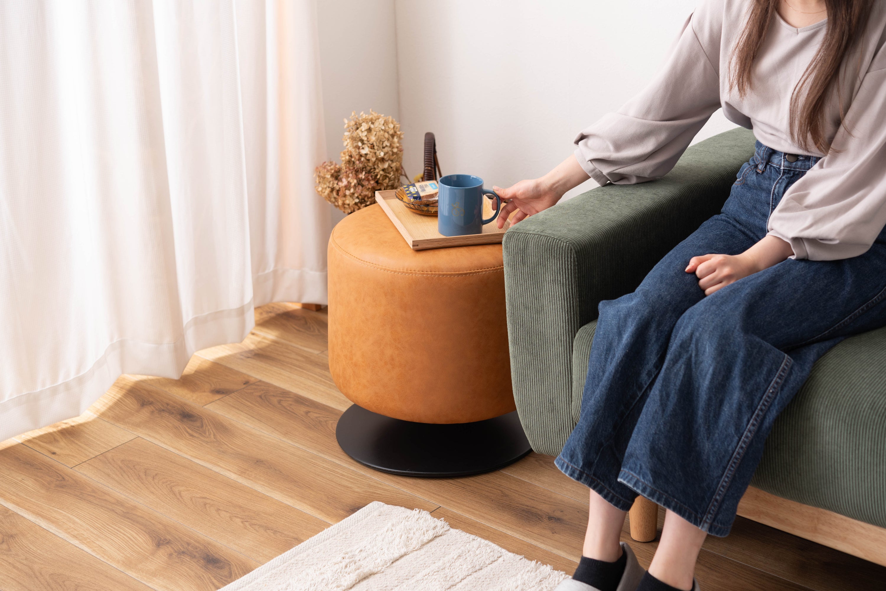 本革のような風合いのソフトレザーを使用した360°回転するスツール。 座面が直径40cm/本体重量約5kgと安定感のあるスツール。 土台となるスチールの裏面には保護材が付いた仕様。 ウレタン入り座面のしっかりとした座り心地。 座面高40cmとチェアに近い高さなので様々なシーンで使える丁度良いサイズ。 リビングなどの壁面作業台やサイドデスクのスツールとして。 寝室のデスク・ドレッサー周りのスツールとして。 ダイニング周りの予備スツールとして。 狭いスペースでも立ち座りしやすく玄関スツールとしても便利。 ソファ前に置いてオットマンとして。 ソファ横に置いてちょっとした小物置きスペースとしても。 直径40×高さ40cmの持ち運べるサイズ。
