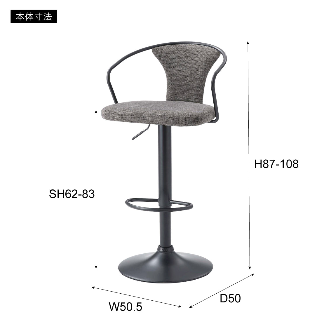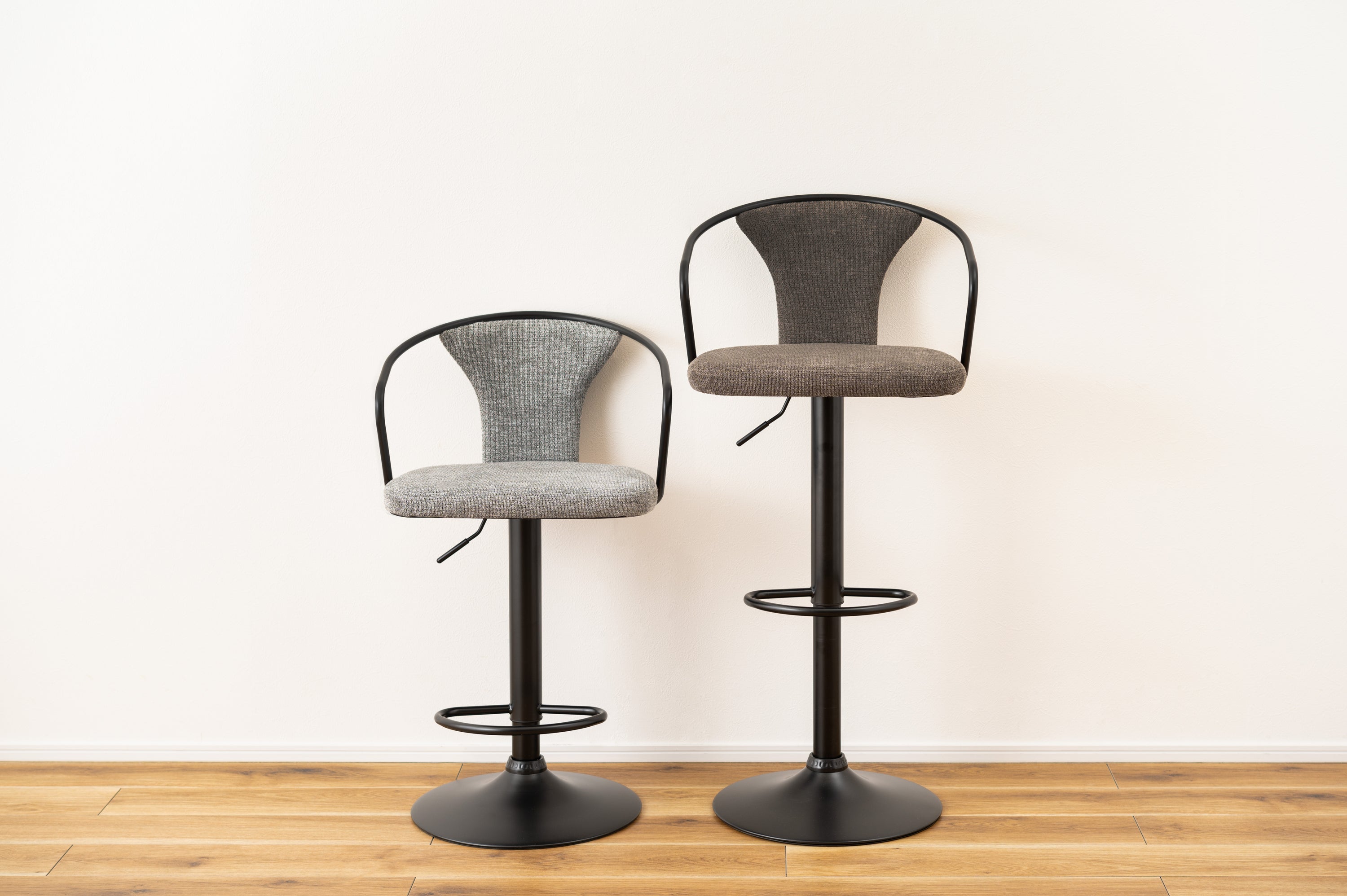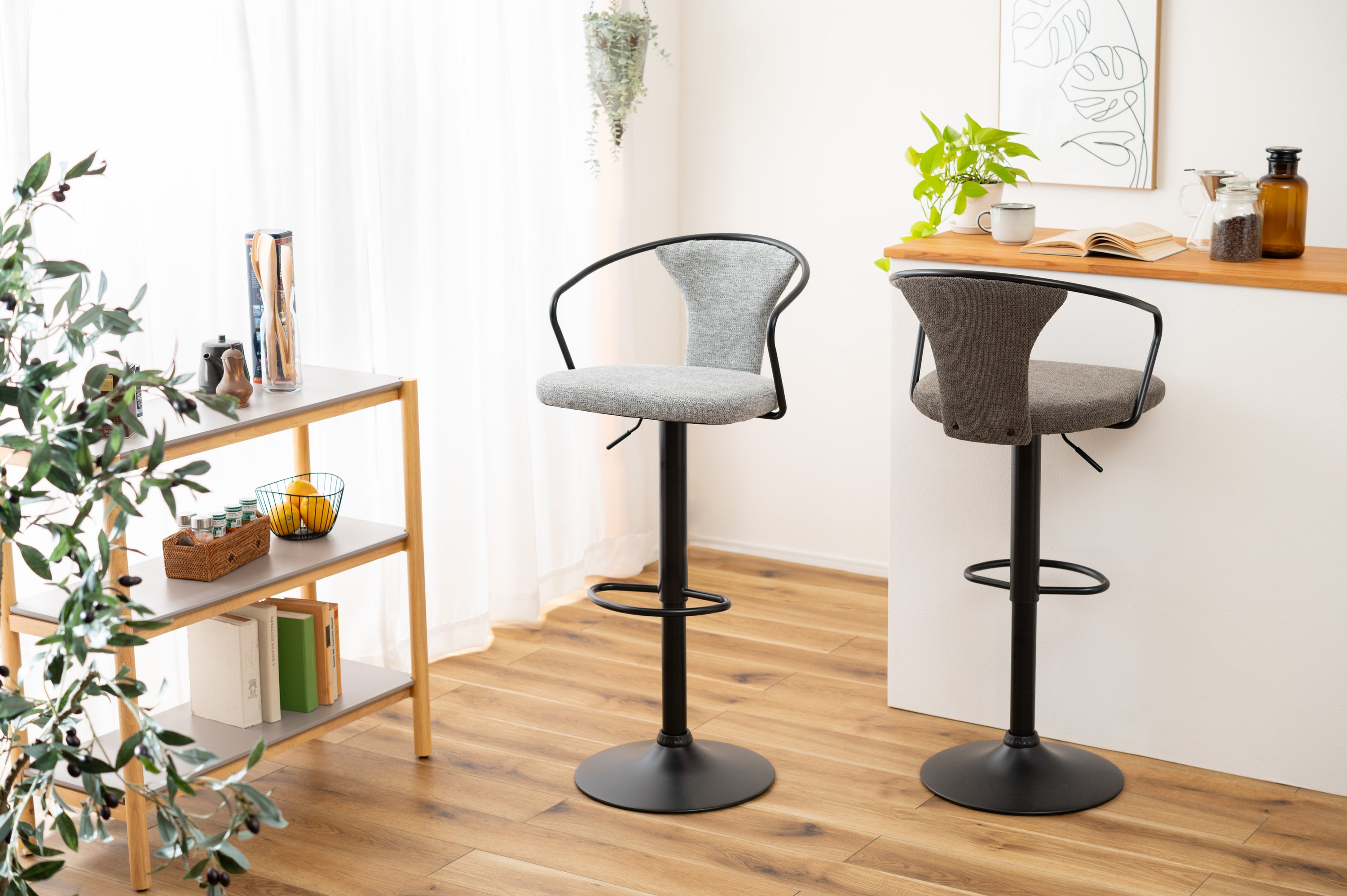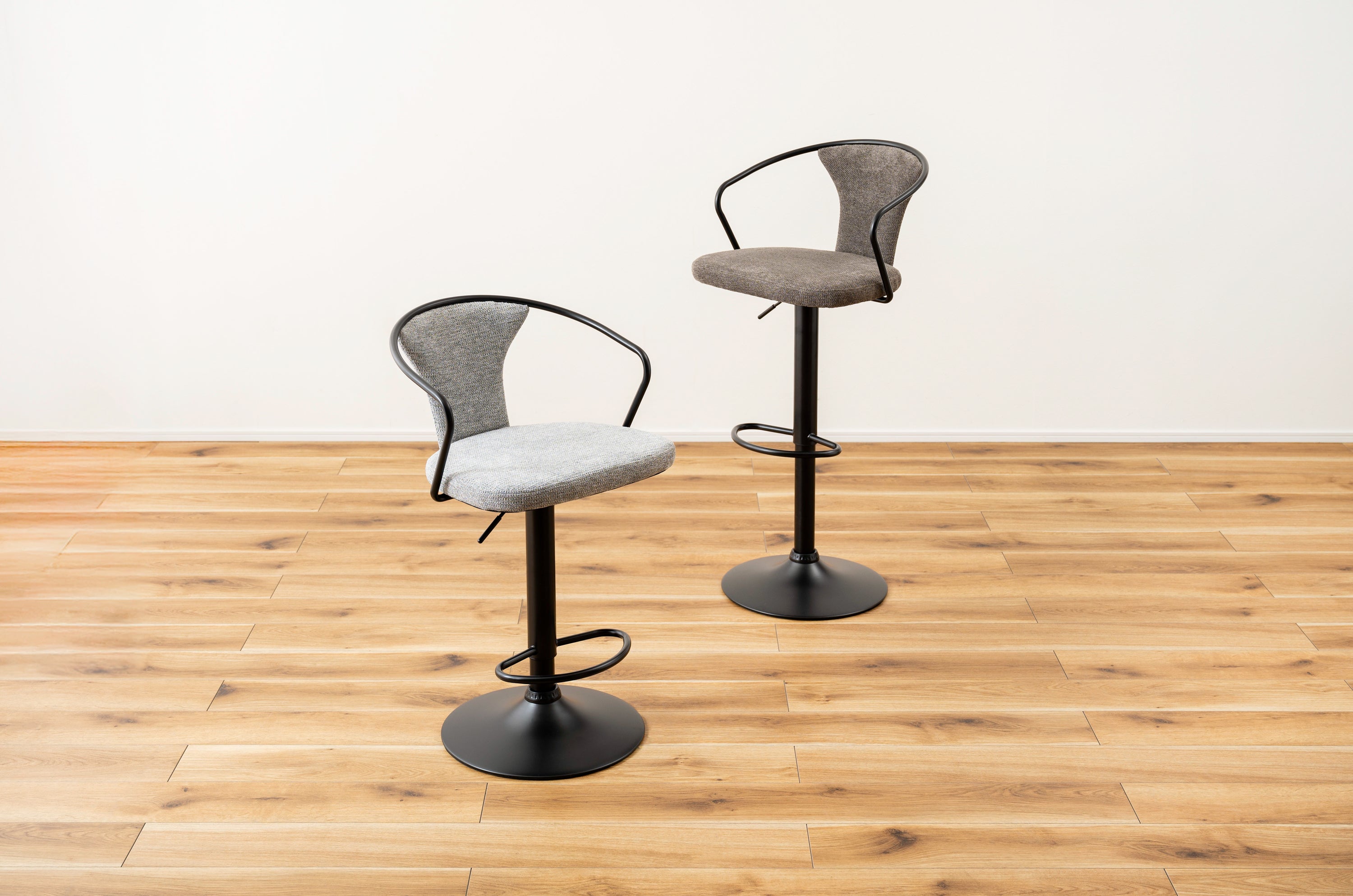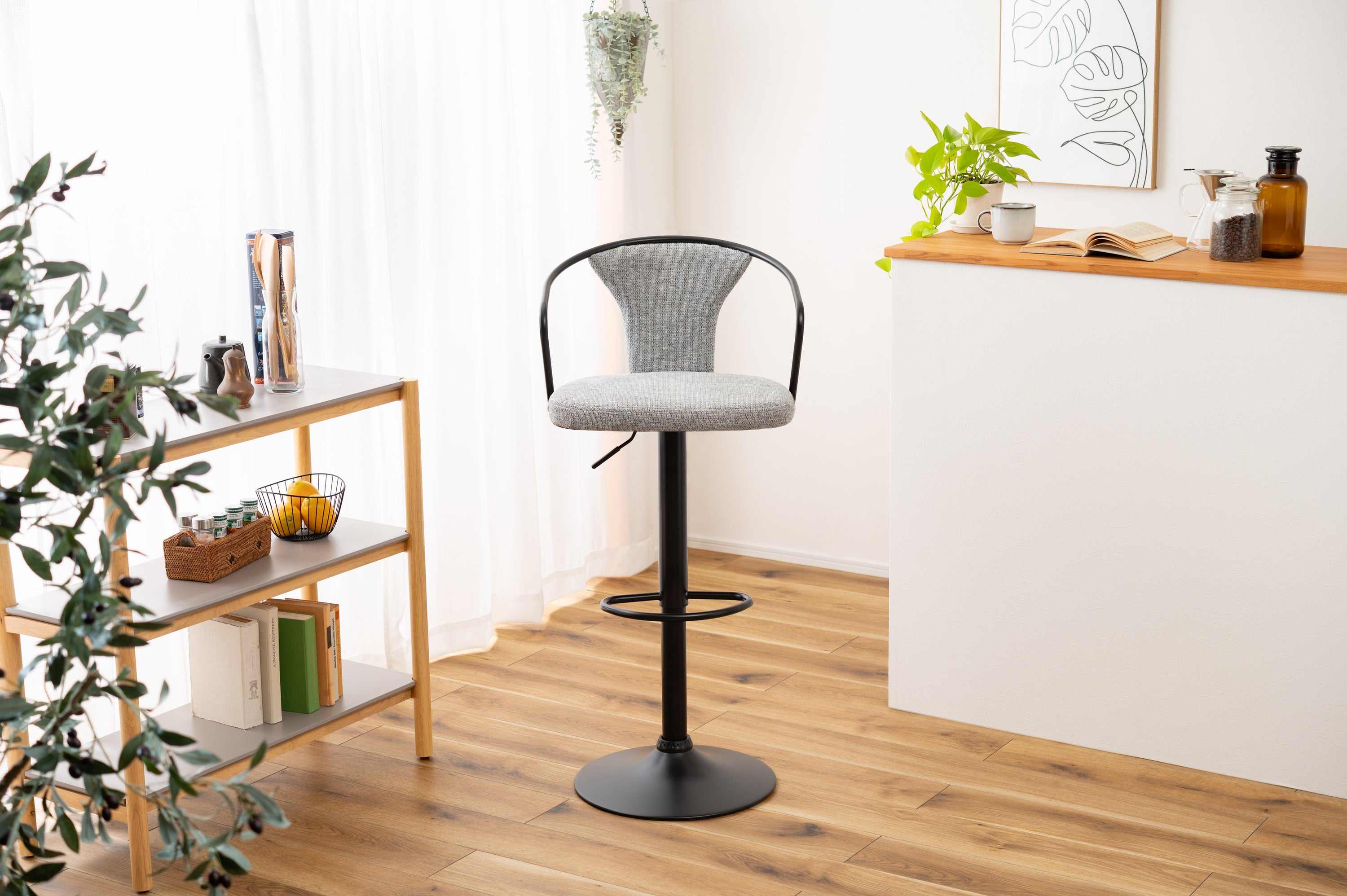 アームチェアタイプでゆったりと身体を預けられるカウンターチェア。ブラックスチール×ファブリックのシンプルでスタイリッシュなデザイン。座面は回転式で昇降可能な機能性も備えた優れたアイテム。座面高は62~83cmなので、高めのカウンターとも合わせられるサイズ。使う人の身長やテーブルの高さに合わせて無段階に昇降して調整が可能。乗り降りの際に動きがスムーズ&楽に行える回転式。程よい硬さのクッション性がある座面で、長時間座っても疲れにくい仕様。足元にはフットレストが付いているので、座面を高めに設定しても安定して座れます。ゆったりと座れるアームレスト付きのチェア。