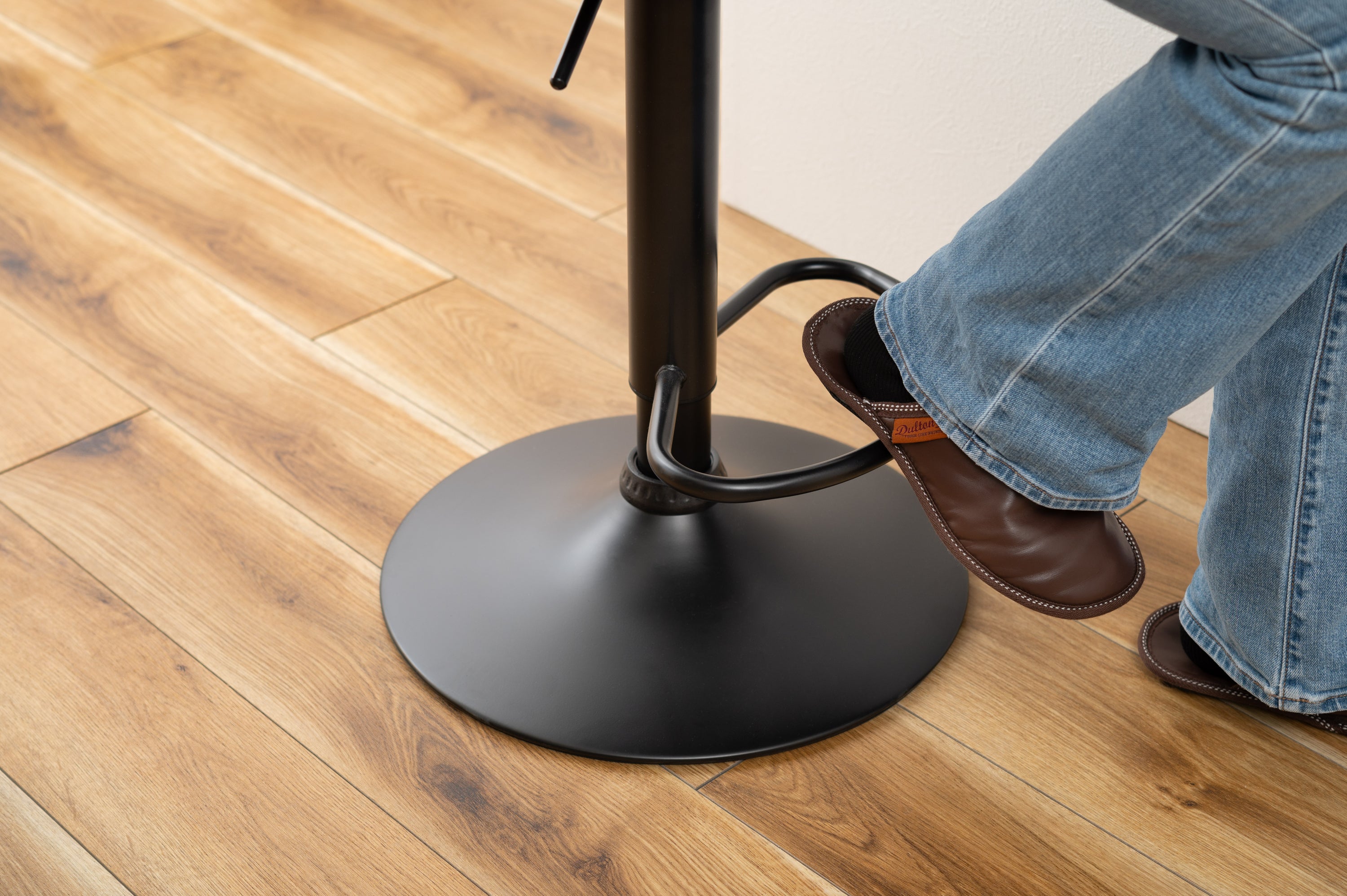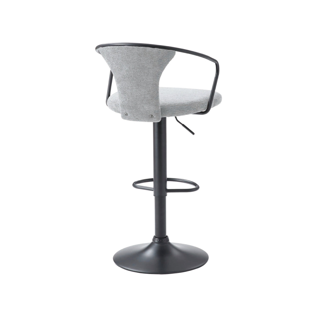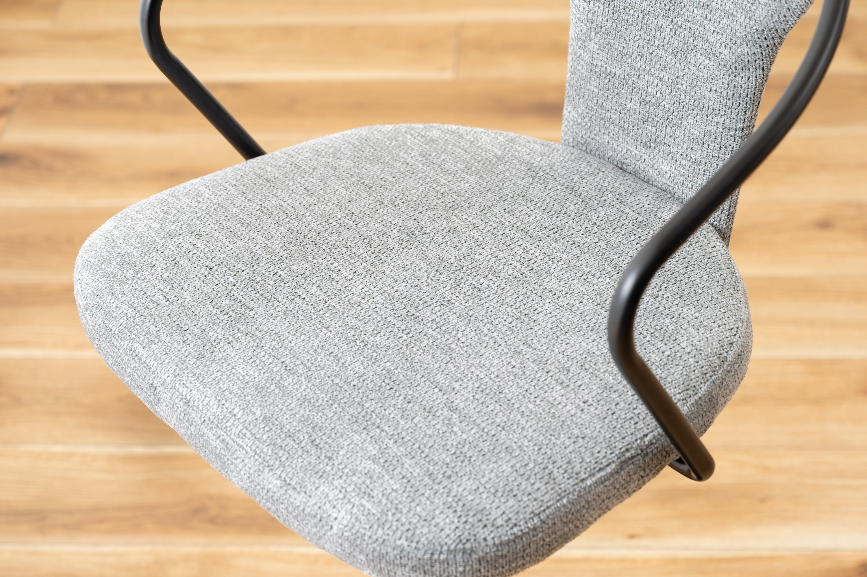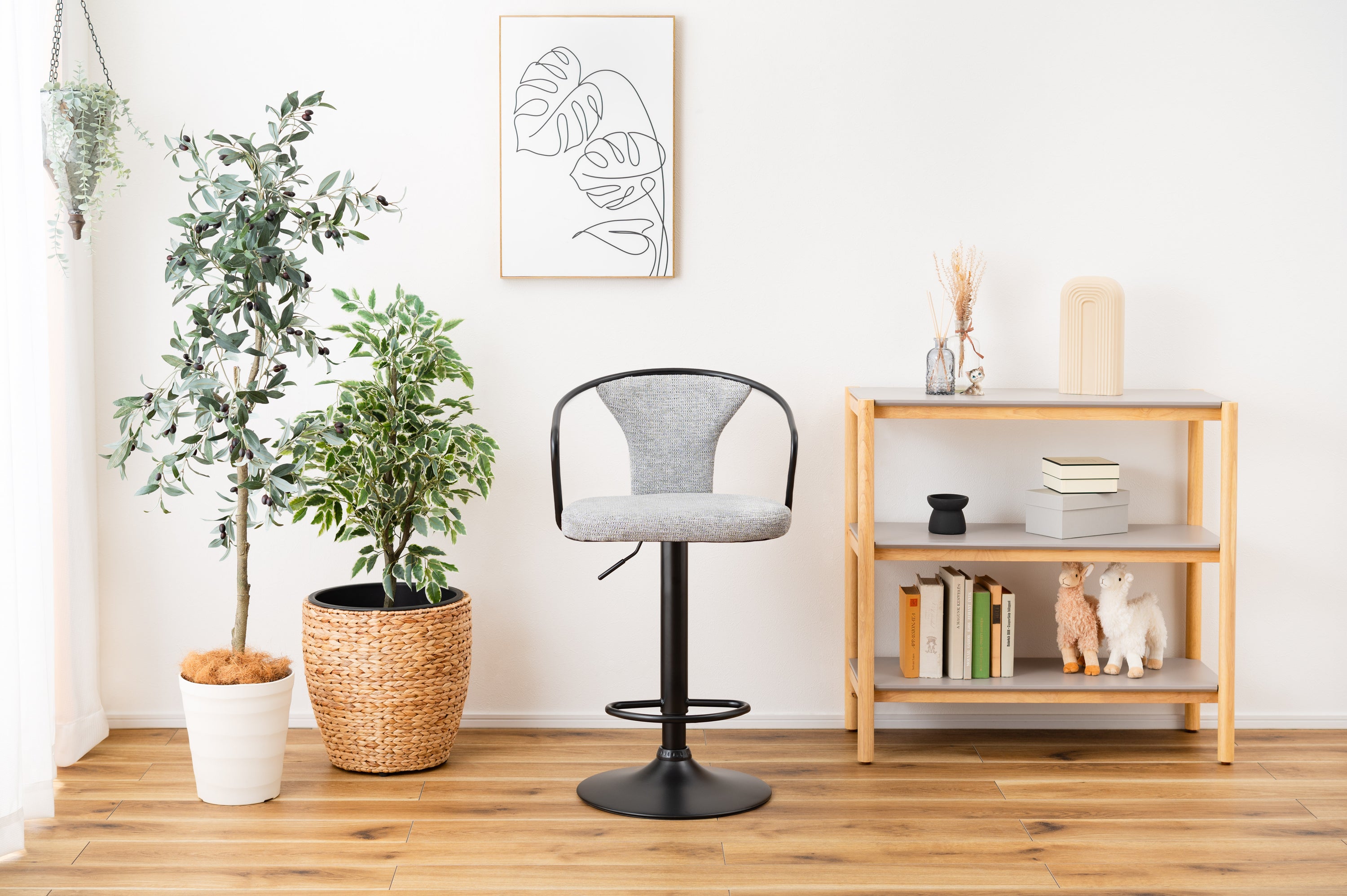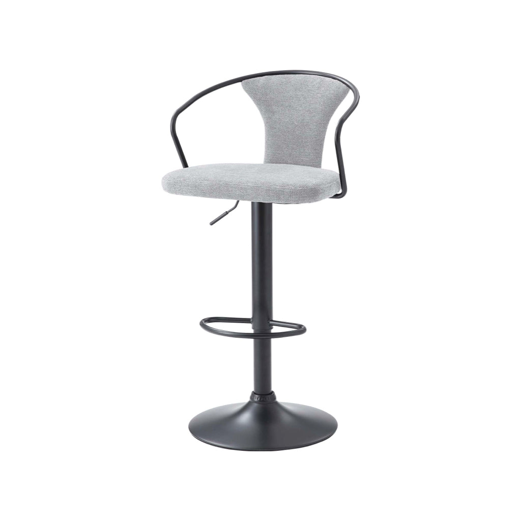 アームチェアタイプでゆったりと身体を預けられるカウンターチェア。ブラックスチール×ファブリックのシンプルでスタイリッシュなデザイン。座面は回転式で昇降可能な機能性も備えた優れたアイテム。座面高は62~83cmなので、高めのカウンターとも合わせられるサイズ。使う人の身長やテーブルの高さに合わせて無段階に昇降して調整が可能。乗り降りの際に動きがスムーズ&楽に行える回転式。程よい硬さのクッション性がある座面で、長時間座っても疲れにくい仕様。足元にはフットレストが付いているので、座面を高めに設定しても安定して座れます。ゆったりと座れるアームレスト付きのチェア。