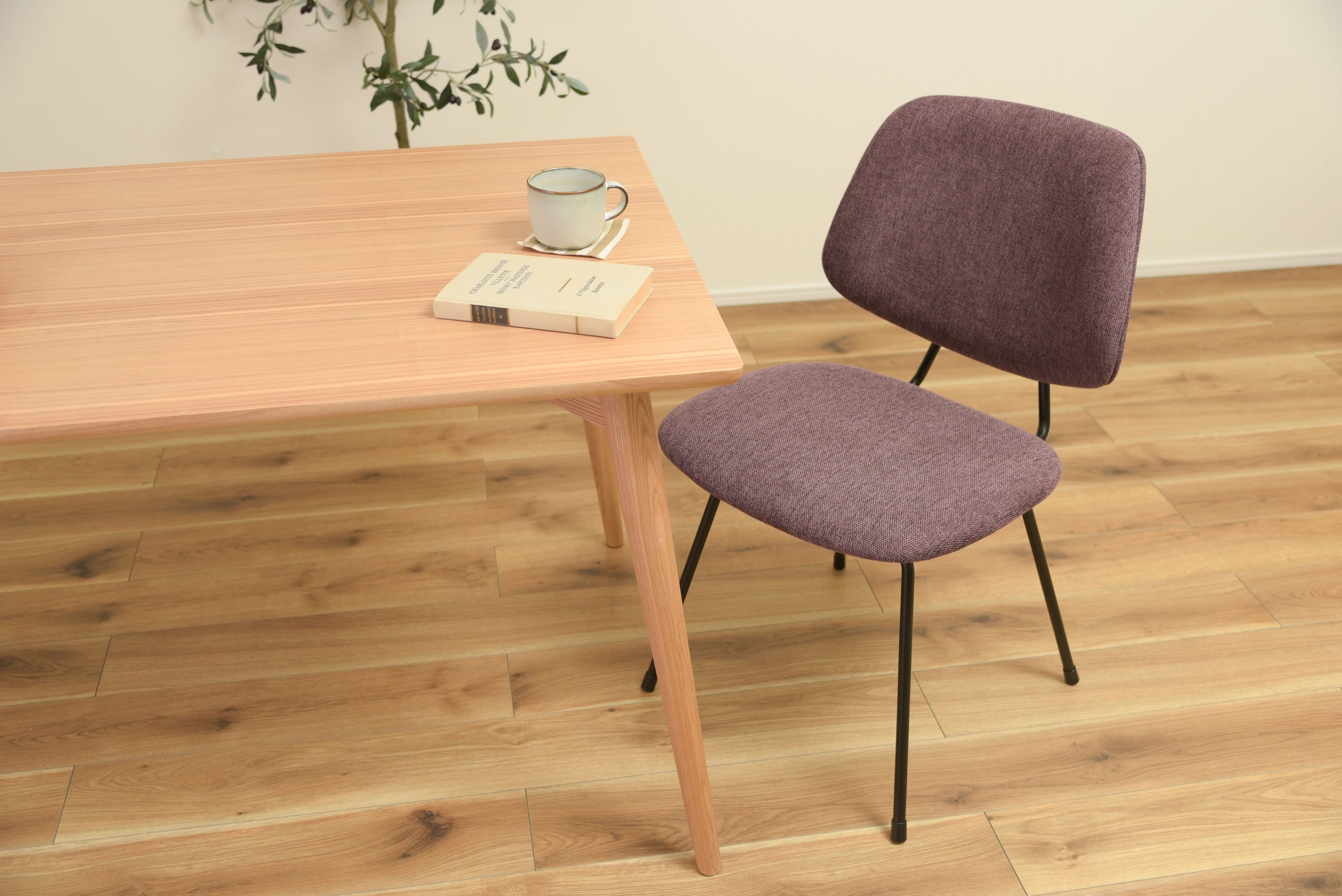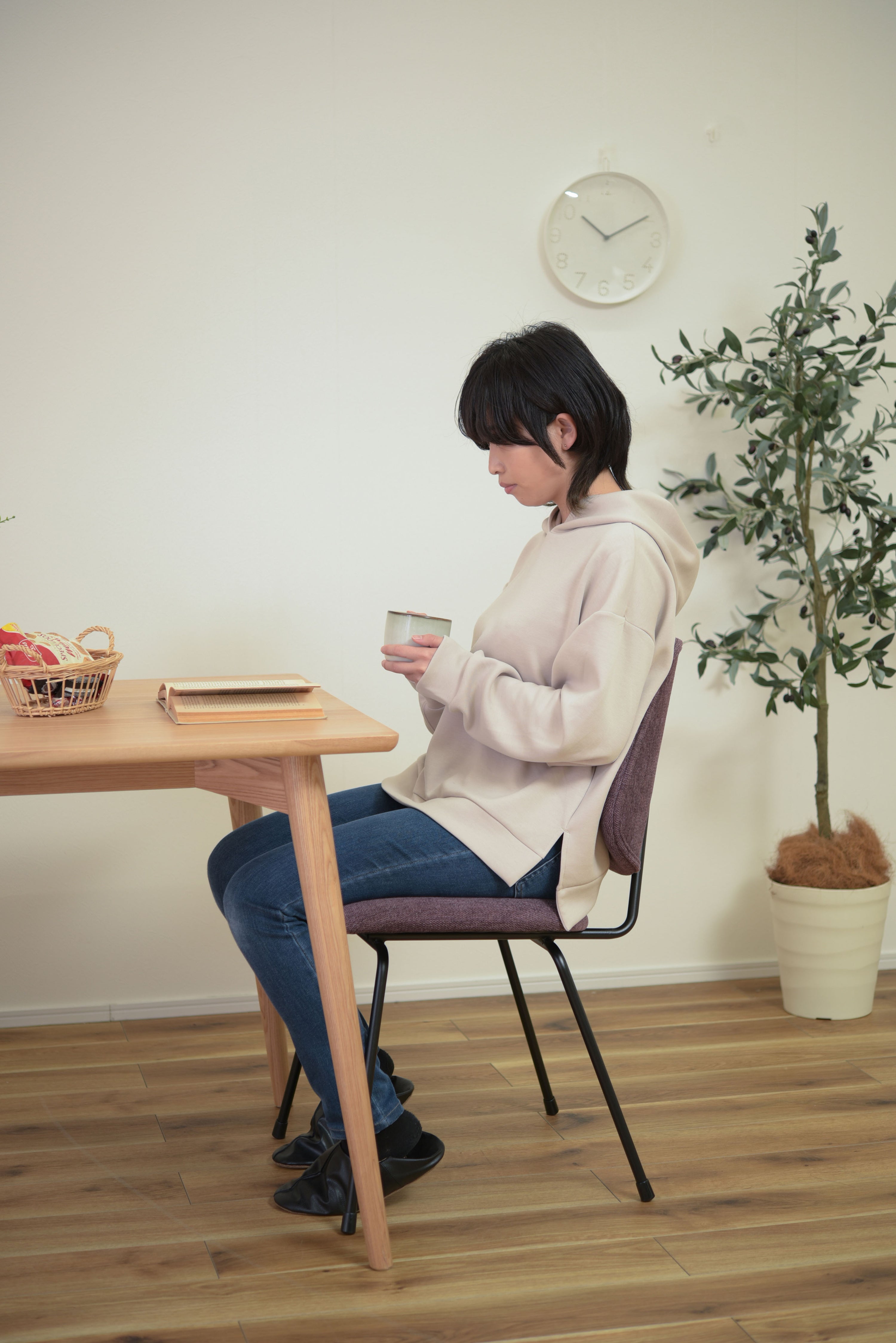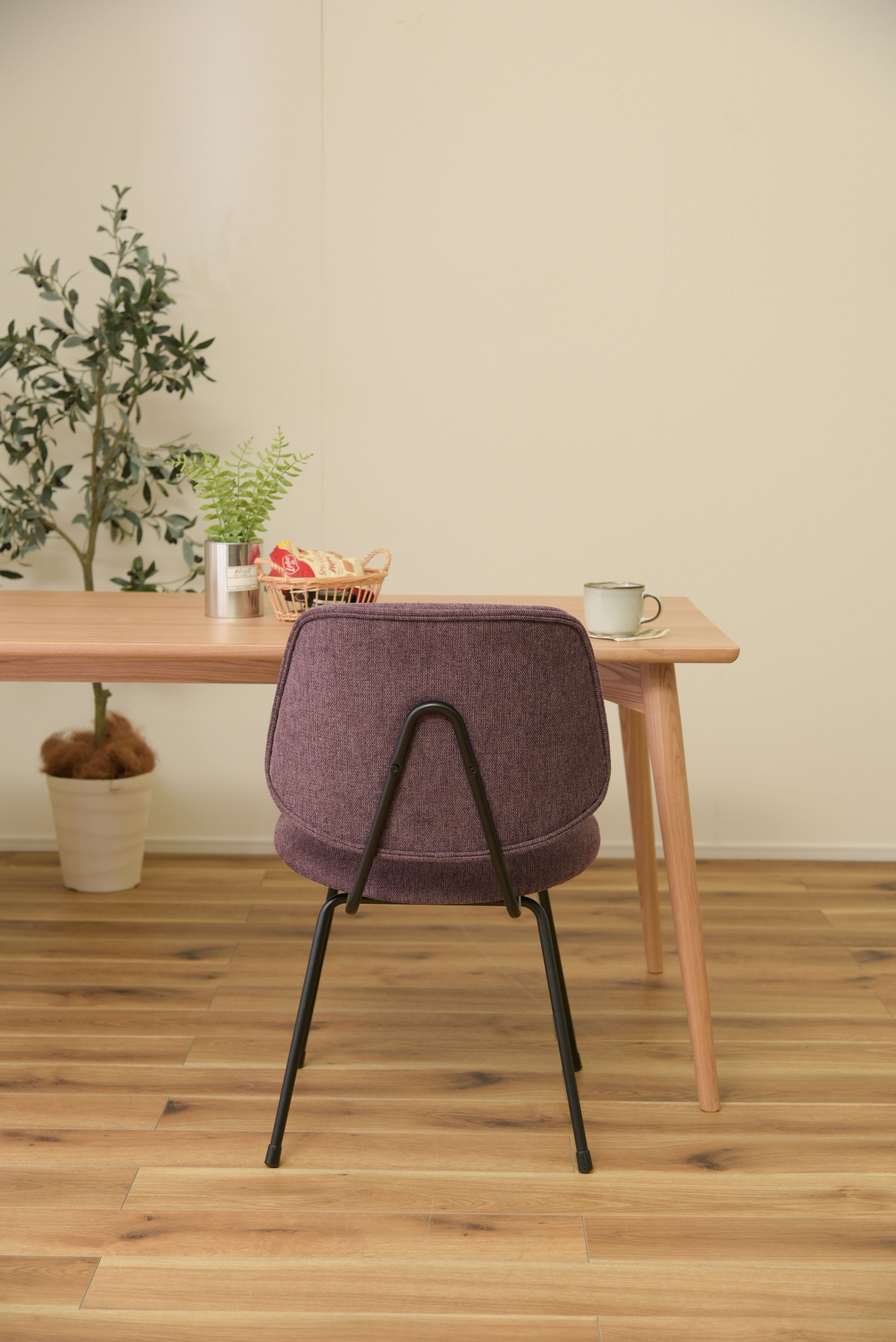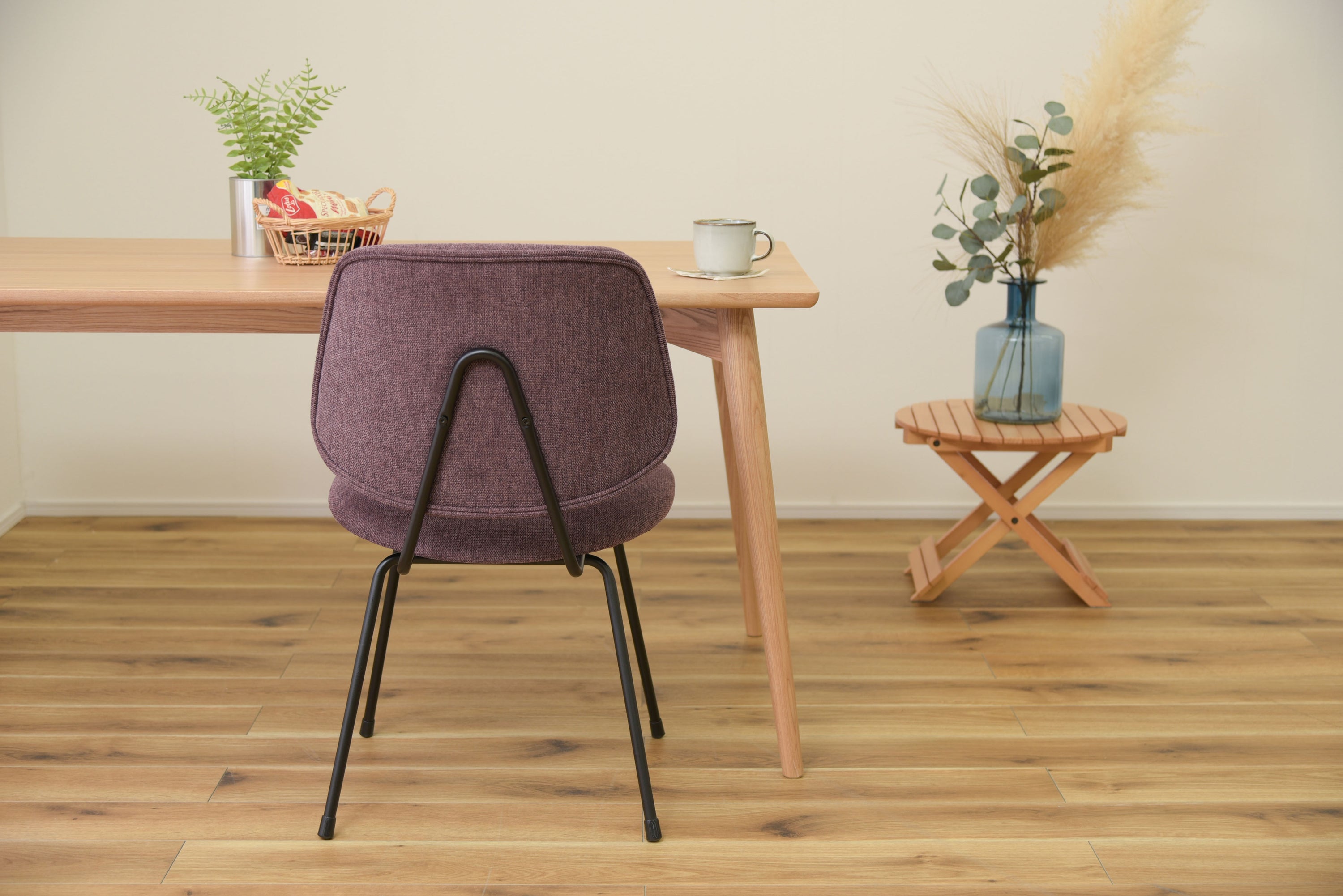 ボリュームのある背もたれでからだをしっかりと支え、広い座面はゆったりとした座り心地。座面、背もたれの厚み、幅をしっかり取っているのでゆったりと座ることができ、ダイニングチェアだけではなくリビングでくつろぐ際に使用する椅子としてもおすすめ。BK(ブラック)にはクロスレザー(レザーのような風合いのポリエステル生地)を採用。本革や合皮と違い通気性もよいため、暑い時に汗でベタついたり、寒いときの冷たくひんやりという不快感がありません。GY(グレー)とPP(パープル)は手触りの良いファブリック生地を使用。新色のパープルカラーは華やかで落ち着いた高級感と存在感があり、インテリアコーディネートでも使えるカラーの一つ。空間を大人の雰囲気に演出するだけではなくリゾート感を演出させる効果もあります。脚先には床への傷防止にもなる保護キャップが付いているので安心です。