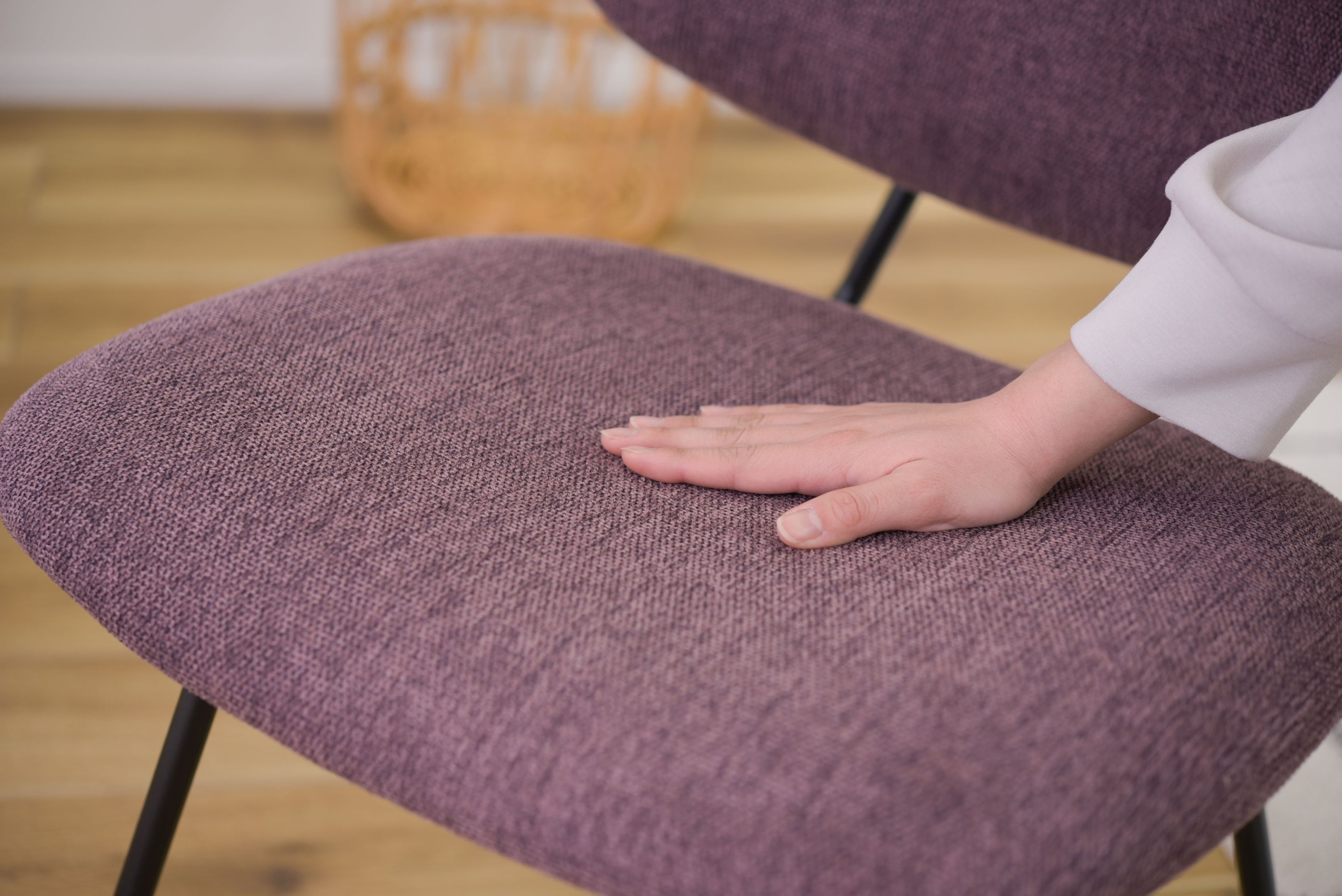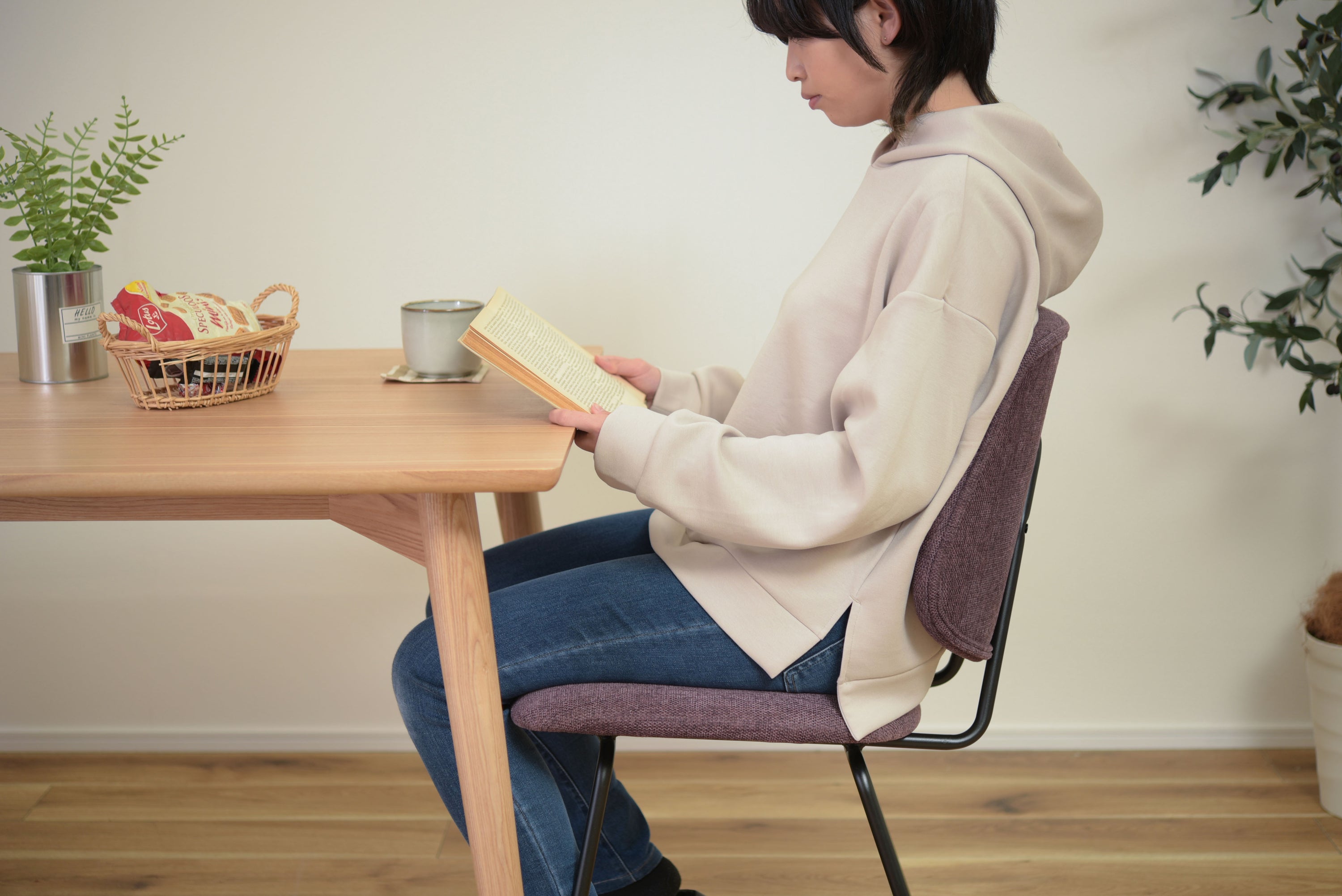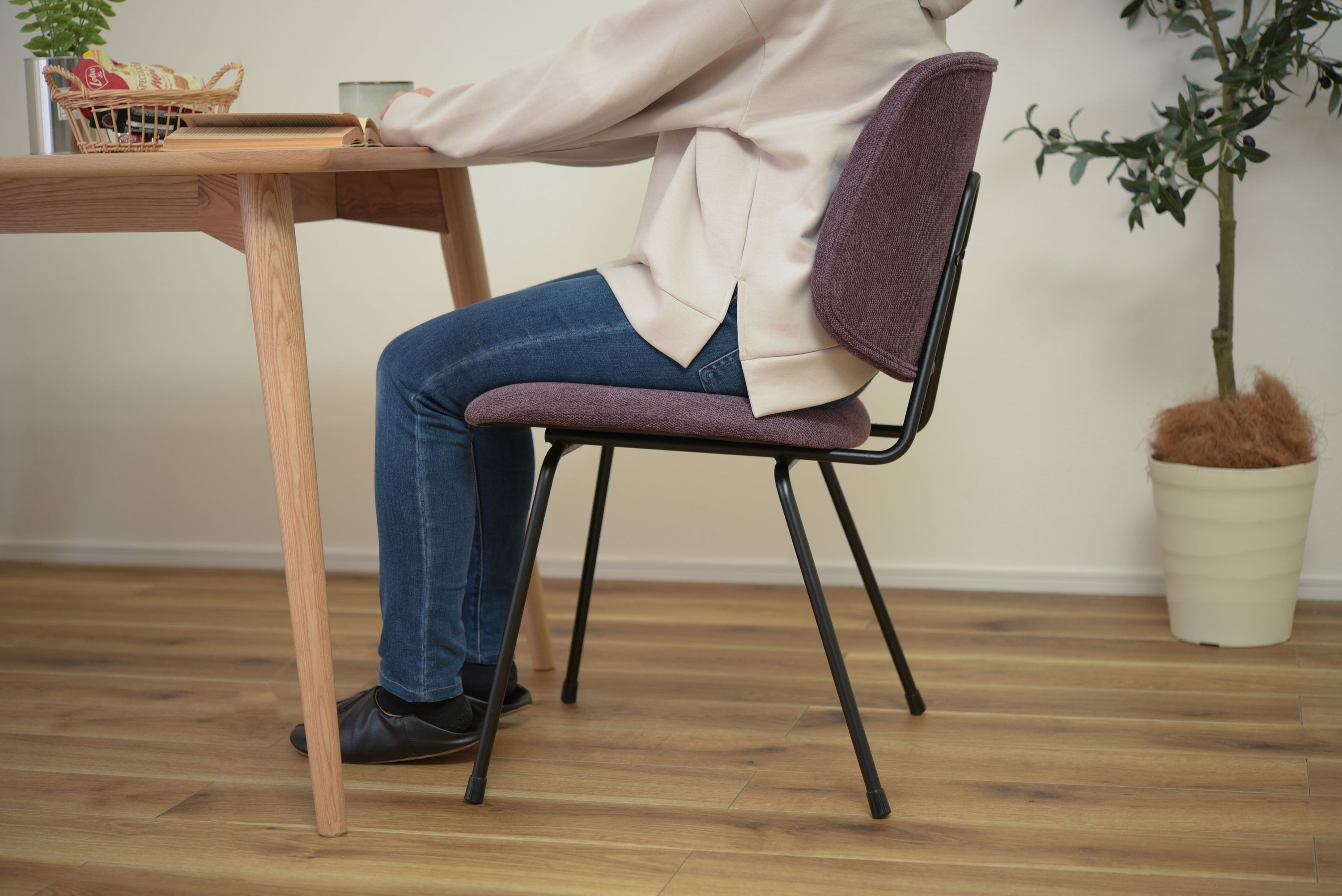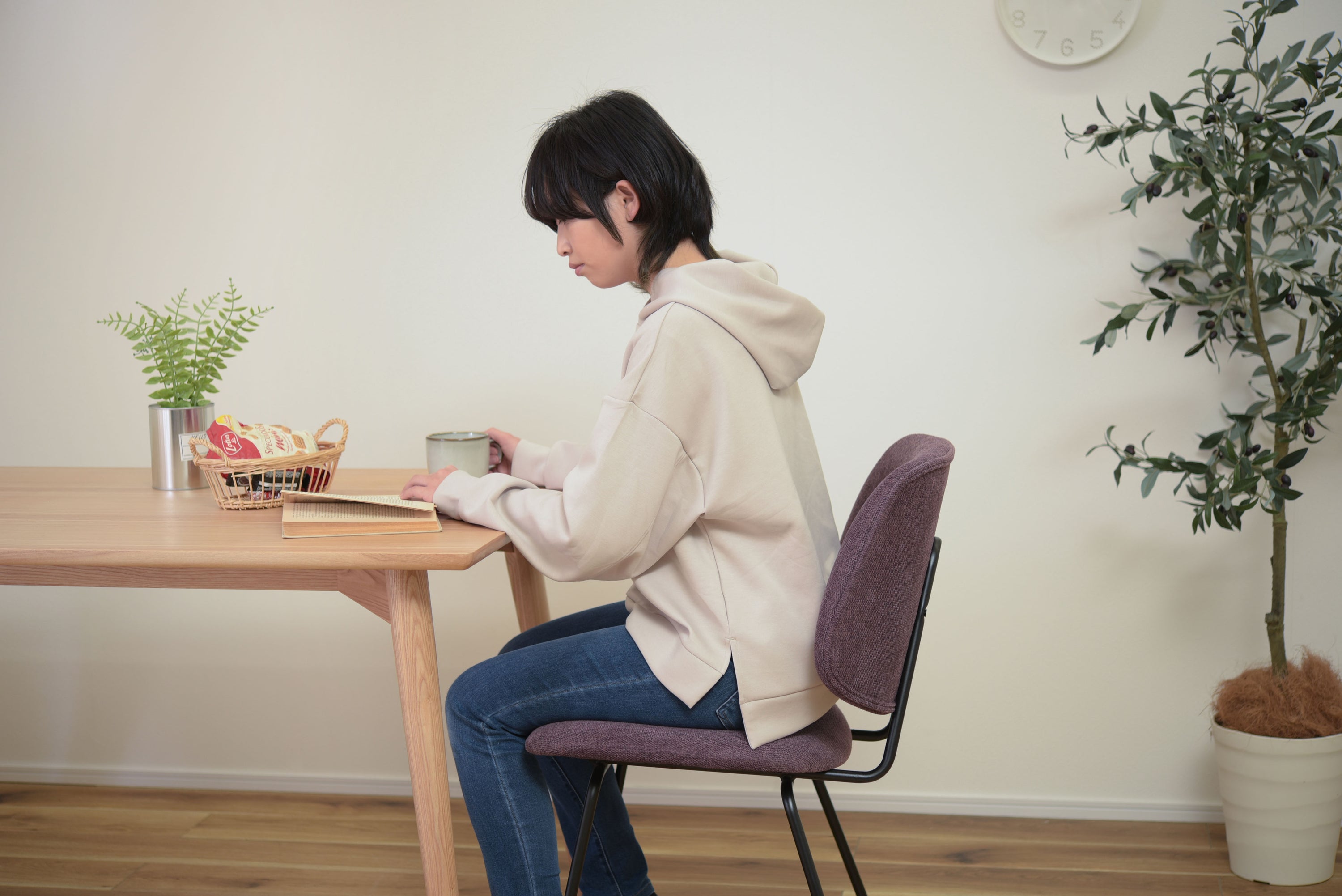 ボリュームのある背もたれでからだをしっかりと支え、広い座面はゆったりとした座り心地。座面、背もたれの厚み、幅をしっかり取っているのでゆったりと座ることができ、ダイニングチェアだけではなくリビングでくつろぐ際に使用する椅子としてもおすすめ。BK(ブラック)にはクロスレザー(レザーのような風合いのポリエステル生地)を採用。本革や合皮と違い通気性もよいため、暑い時に汗でベタついたり、寒いときの冷たくひんやりという不快感がありません。GY(グレー)とPP(パープル)は手触りの良いファブリック生地を使用。新色のパープルカラーは華やかで落ち着いた高級感と存在感があり、インテリアコーディネートでも使えるカラーの一つ。空間を大人の雰囲気に演出するだけではなくリゾート感を演出させる効果もあります。脚先には床への傷防止にもなる保護キャップが付いているので安心です。