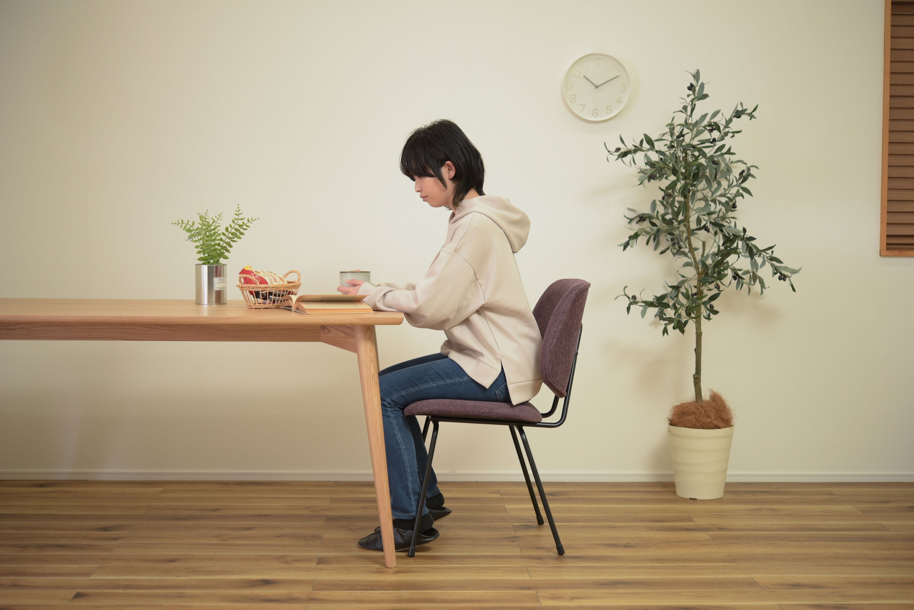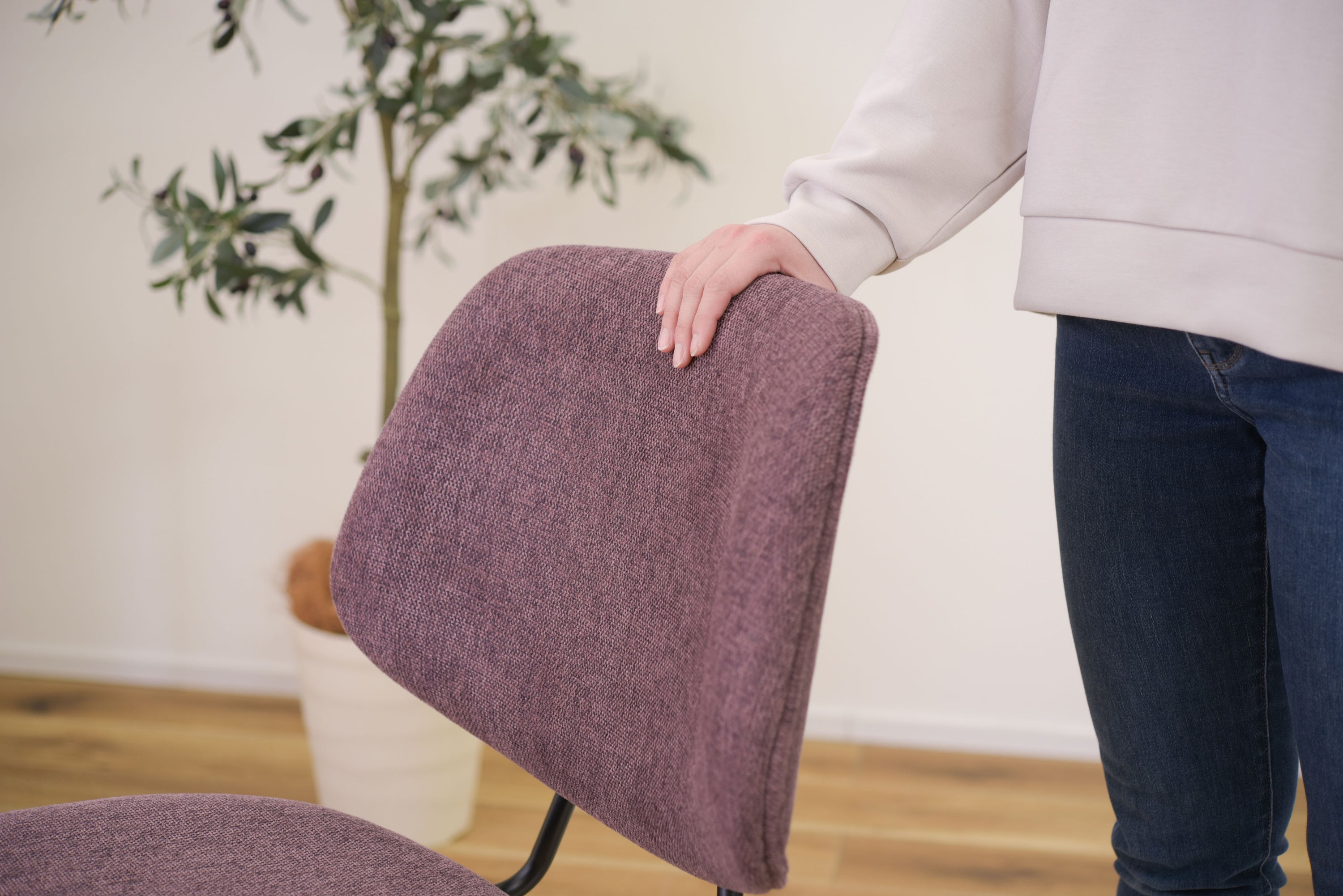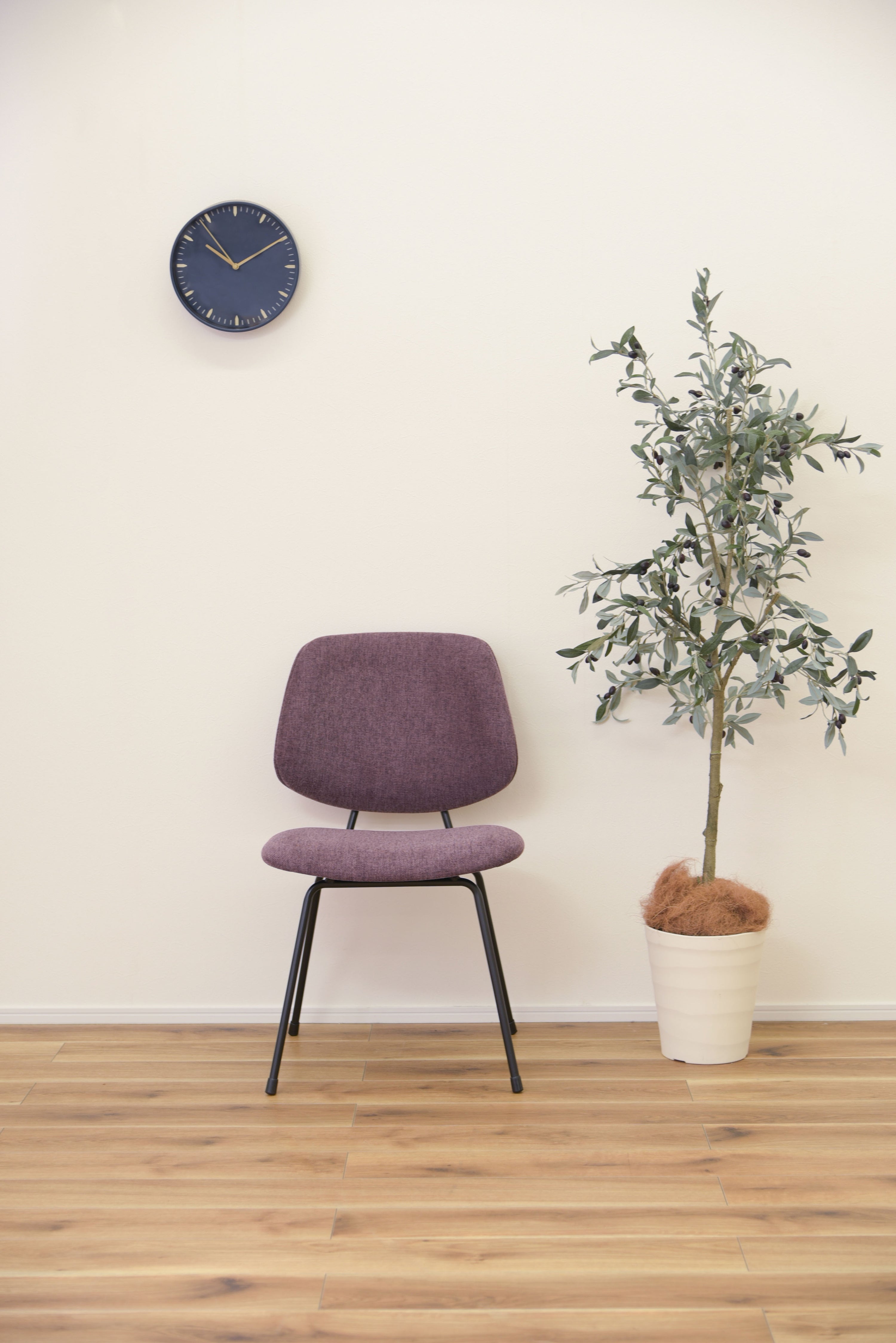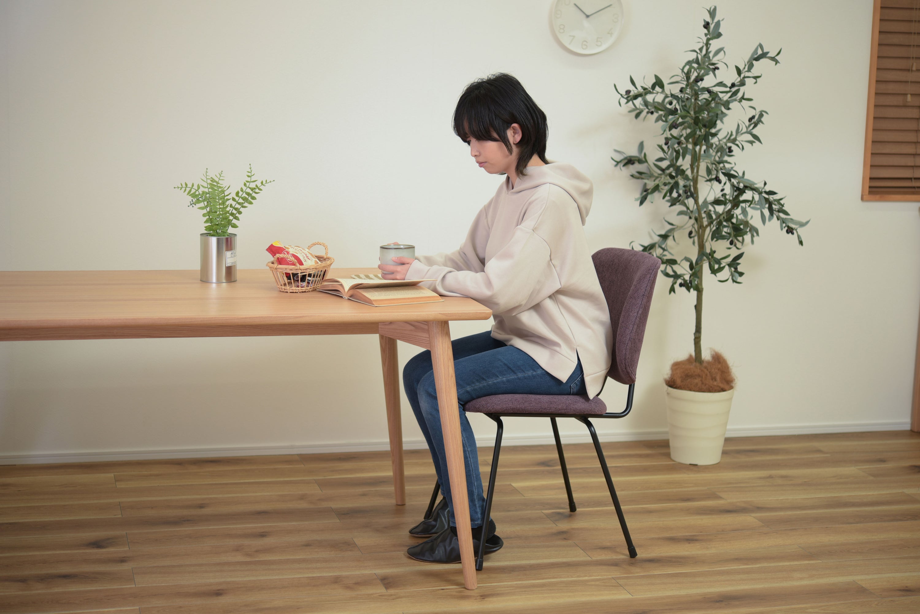 ボリュームのある背もたれでからだをしっかりと支え、広い座面はゆったりとした座り心地。座面、背もたれの厚み、幅をしっかり取っているのでゆったりと座ることができ、ダイニングチェアだけではなくリビングでくつろぐ際に使用する椅子としてもおすすめ。BK(ブラック)にはクロスレザー(レザーのような風合いのポリエステル生地)を採用。本革や合皮と違い通気性もよいため、暑い時に汗でベタついたり、寒いときの冷たくひんやりという不快感がありません。GY(グレー)とPP(パープル)は手触りの良いファブリック生地を使用。新色のパープルカラーは華やかで落ち着いた高級感と存在感があり、インテリアコーディネートでも使えるカラーの一つ。空間を大人の雰囲気に演出するだけではなくリゾート感を演出させる効果もあります。脚先には床への傷防止にもなる保護キャップが付いているので安心です。