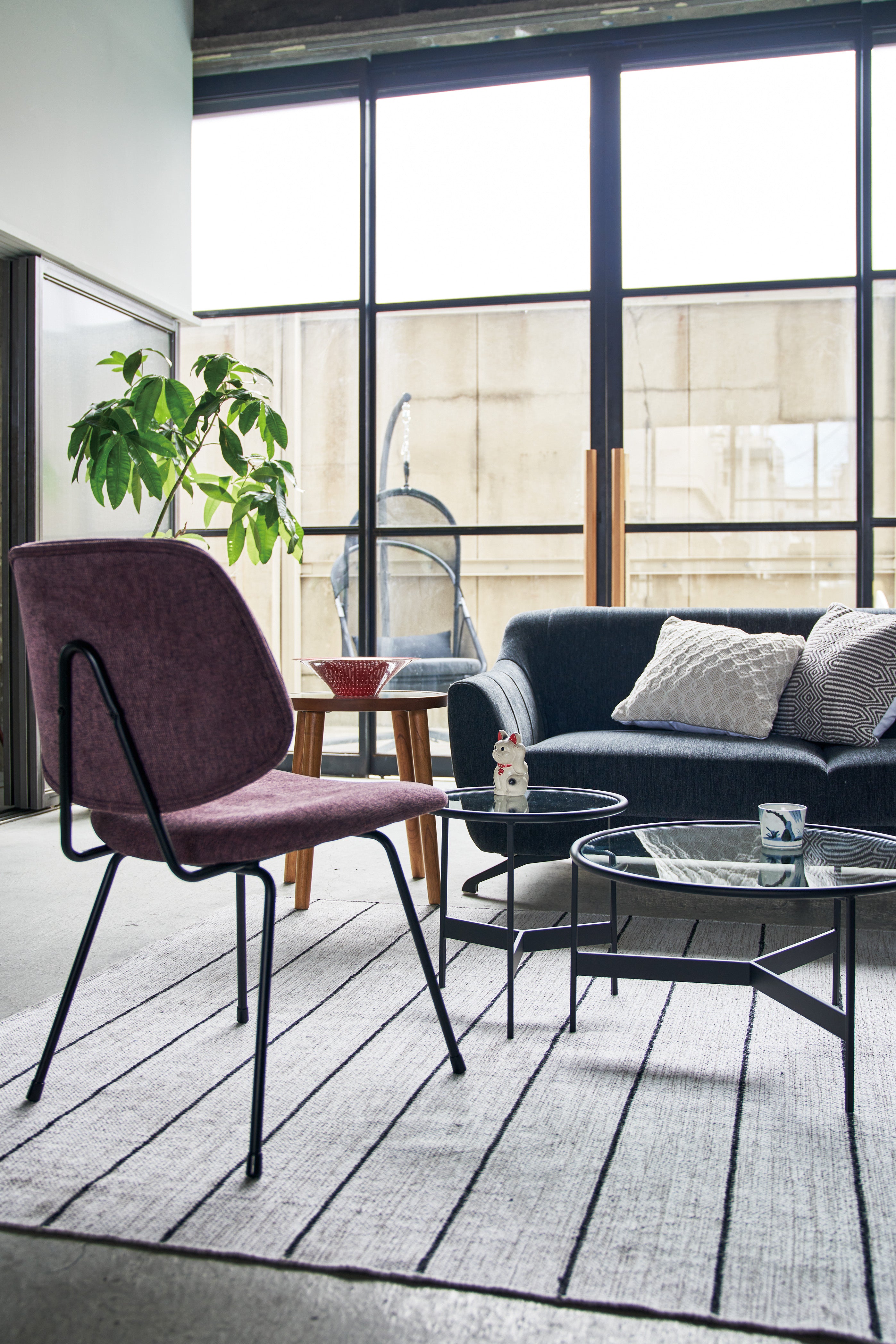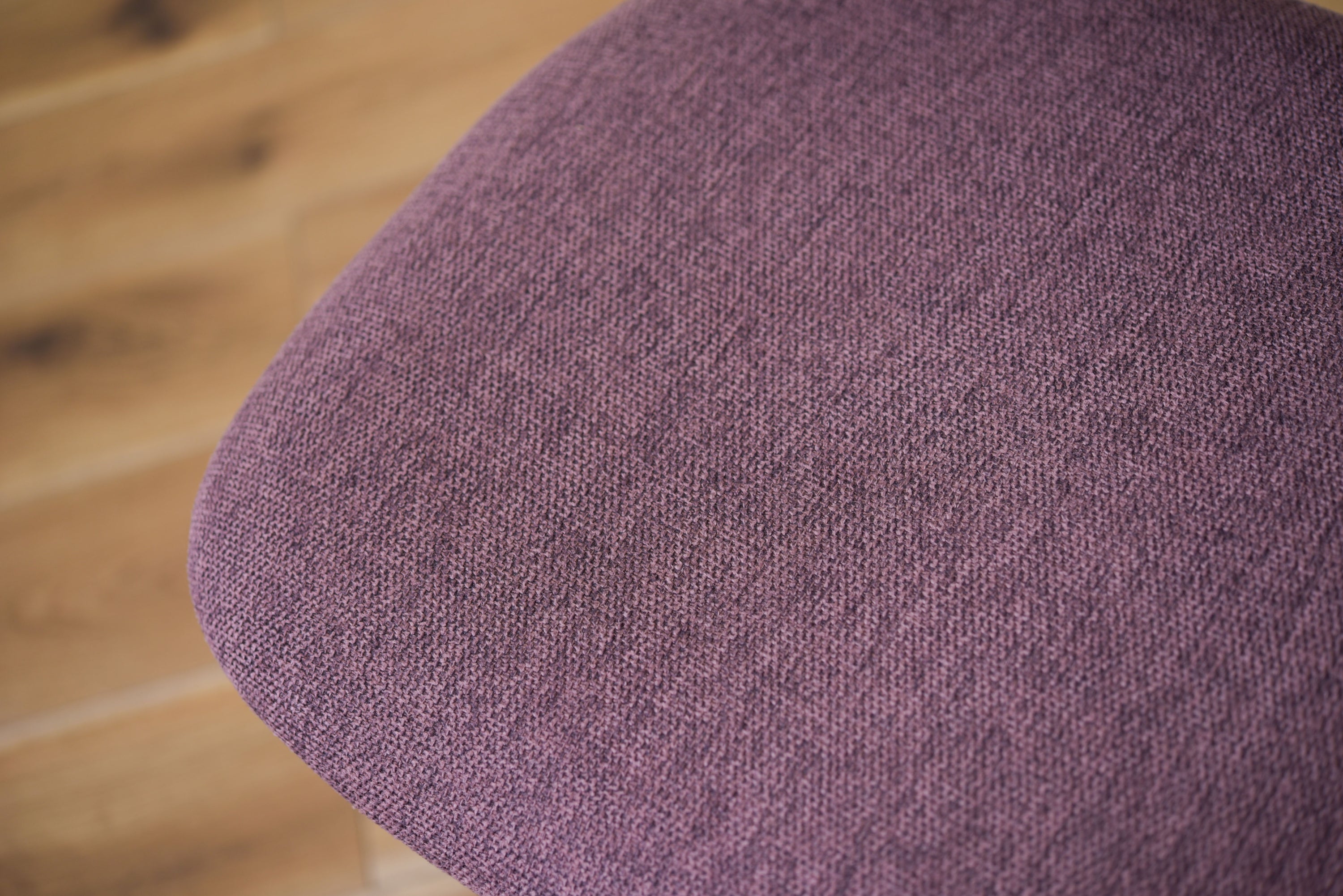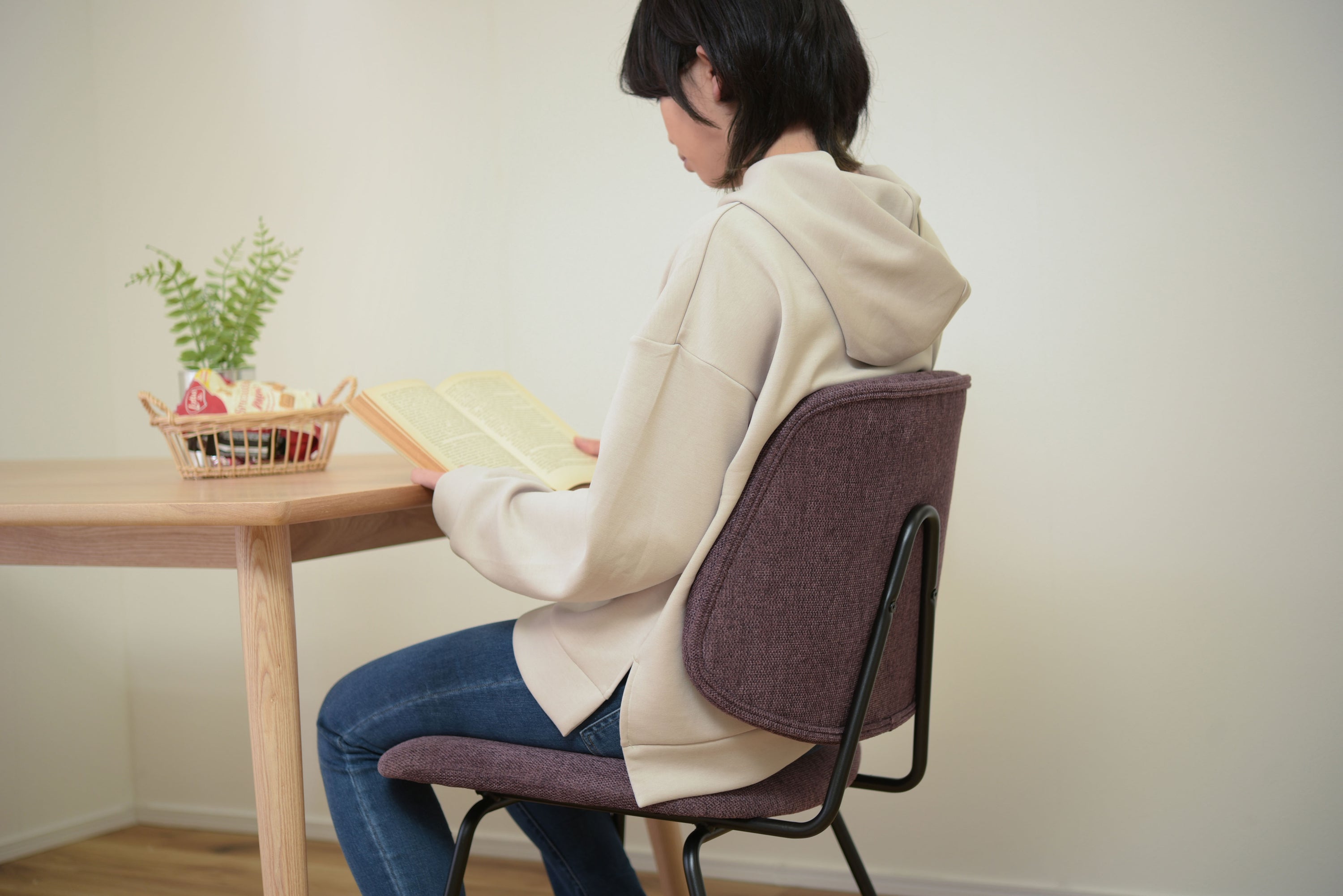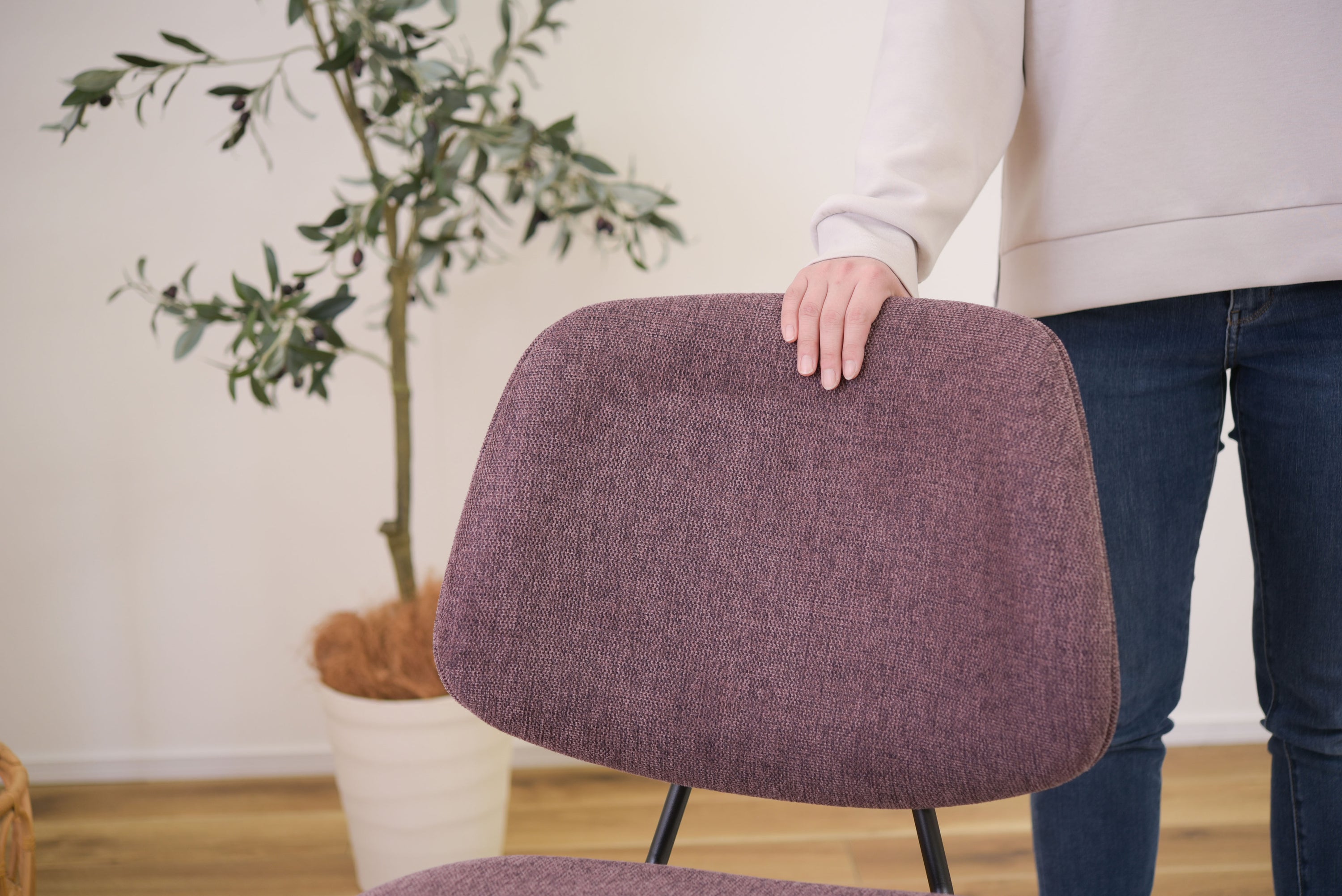 ボリュームのある背もたれでからだをしっかりと支え、広い座面はゆったりとした座り心地。座面、背もたれの厚み、幅をしっかり取っているのでゆったりと座ることができ、ダイニングチェアだけではなくリビングでくつろぐ際に使用する椅子としてもおすすめ。BK(ブラック)にはクロスレザー(レザーのような風合いのポリエステル生地)を採用。本革や合皮と違い通気性もよいため、暑い時に汗でベタついたり、寒いときの冷たくひんやりという不快感がありません。GY(グレー)とPP(パープル)は手触りの良いファブリック生地を使用。新色のパープルカラーは華やかで落ち着いた高級感と存在感があり、インテリアコーディネートでも使えるカラーの一つ。空間を大人の雰囲気に演出するだけではなくリゾート感を演出させる効果もあります。脚先には床への傷防止にもなる保護キャップが付いているので安心です。