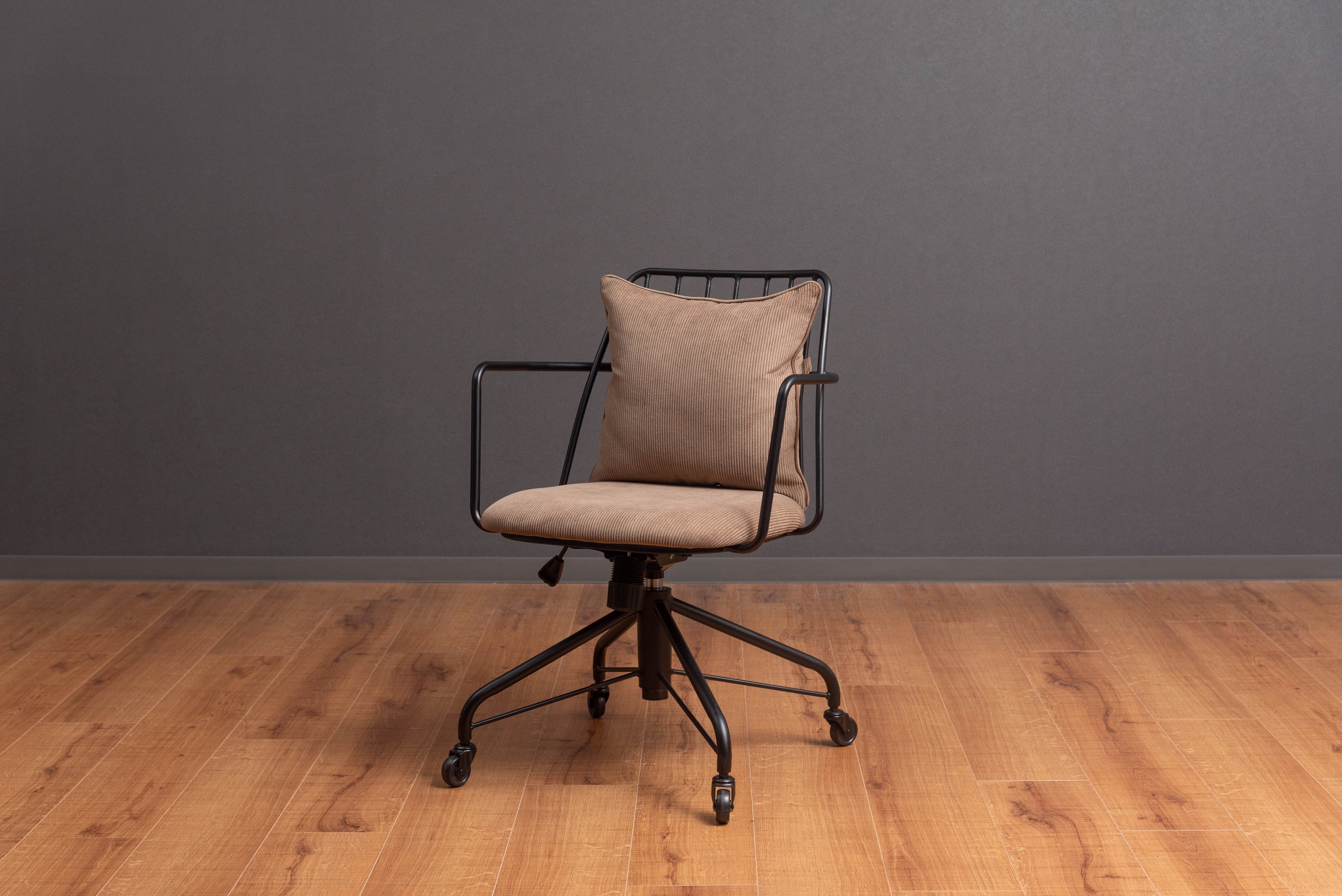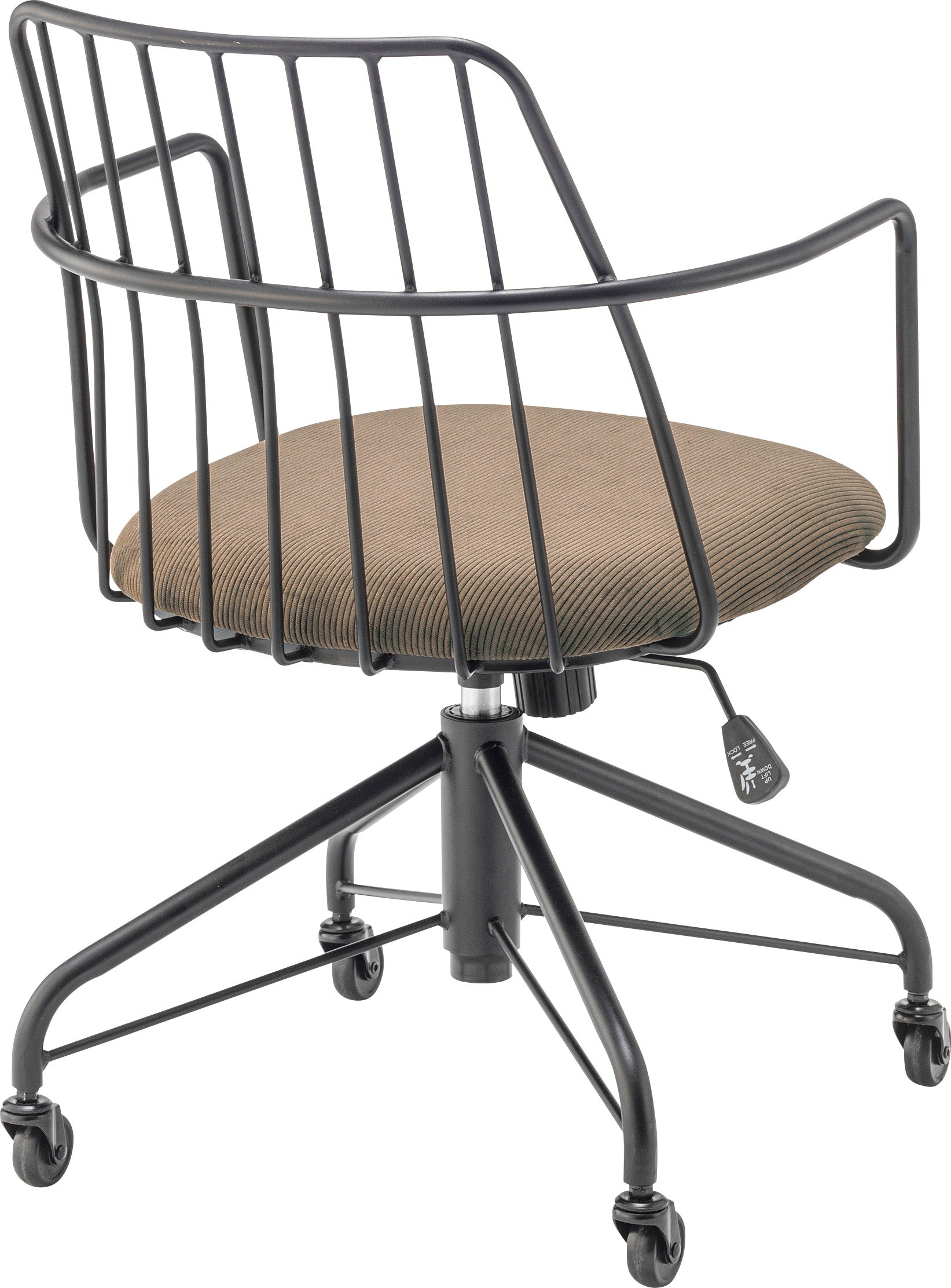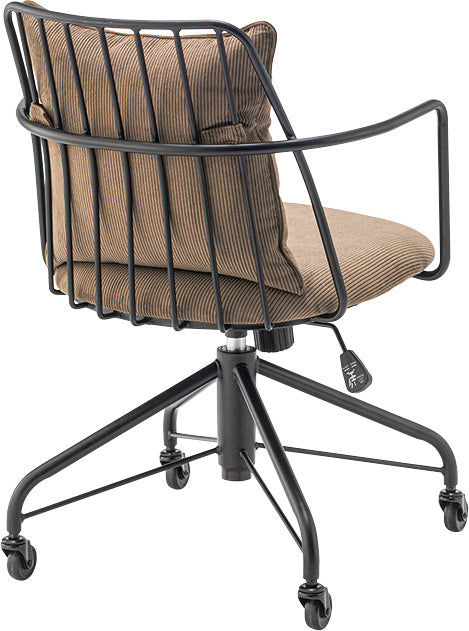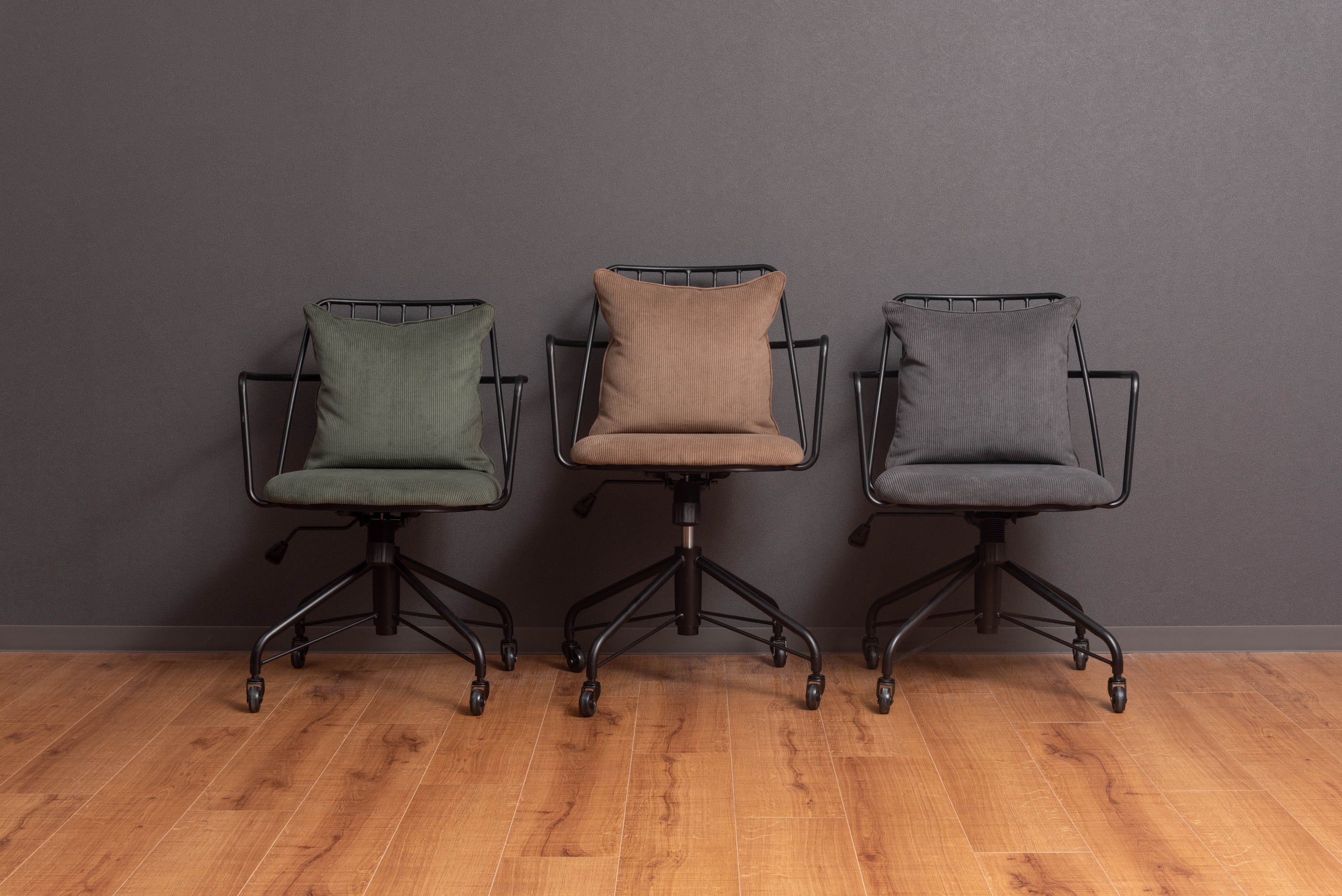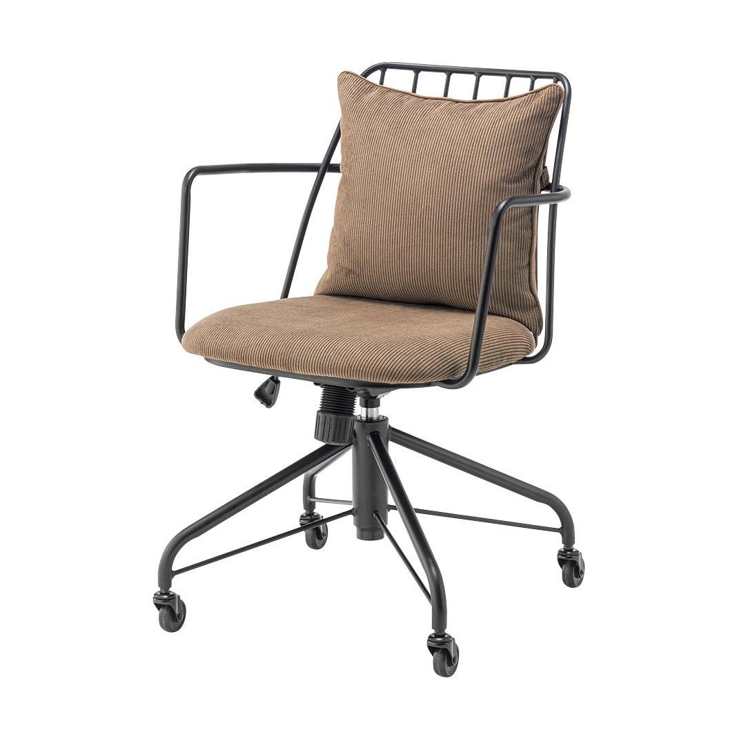 インテリア性の高いコーデュロイ生地を使用した、ヴィンテージテイストのデスクチェア。フレームには強度のあるシャープな印象のスチールを使用。座面の高さは47~54cmまで高さ調整が可能な昇降式。シリンダーを使用しているので、手元のレバーを操作するだけの簡単仕様。キャスター付きなので移動もらくらく。機能性と共にデザイン性も兼ね備えたデスクチェアなので、書斎はもちろんリビング・ダイニングルームでも使えるデザイン。ロッキング機能が付いているので、座面の前後の動きを時々の使用状況に合わせてロック・フリーどちらにも使い分けることができます。座面下にはロッキングの強さを調整できるダイヤル付き。