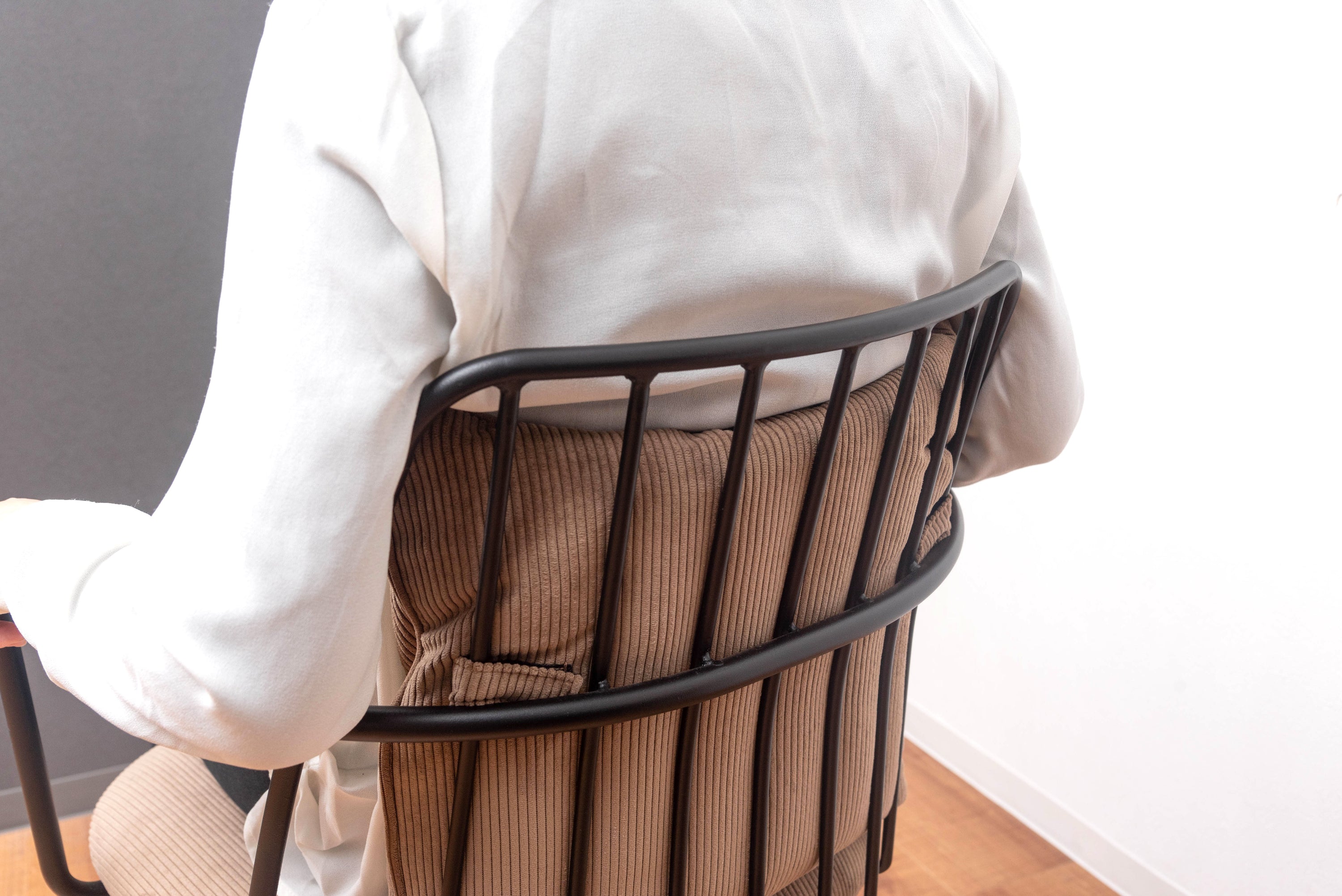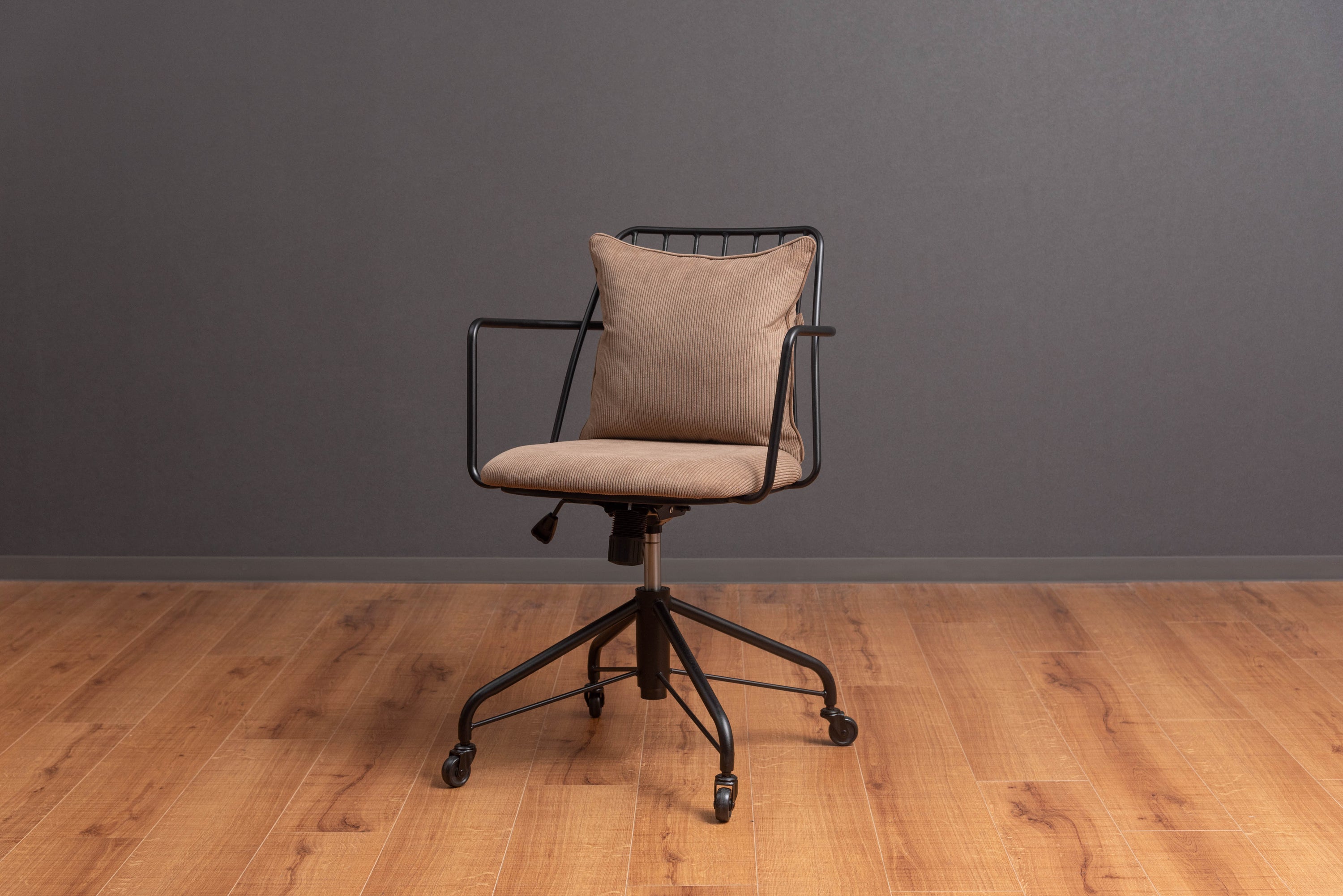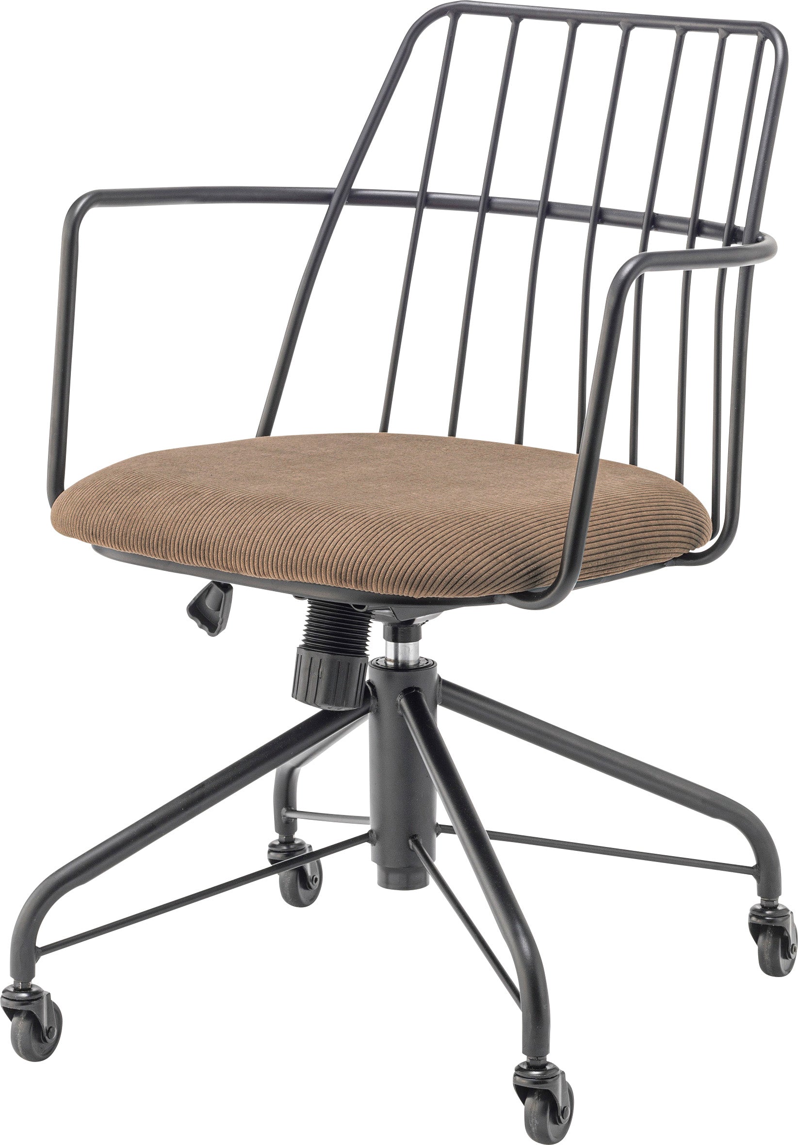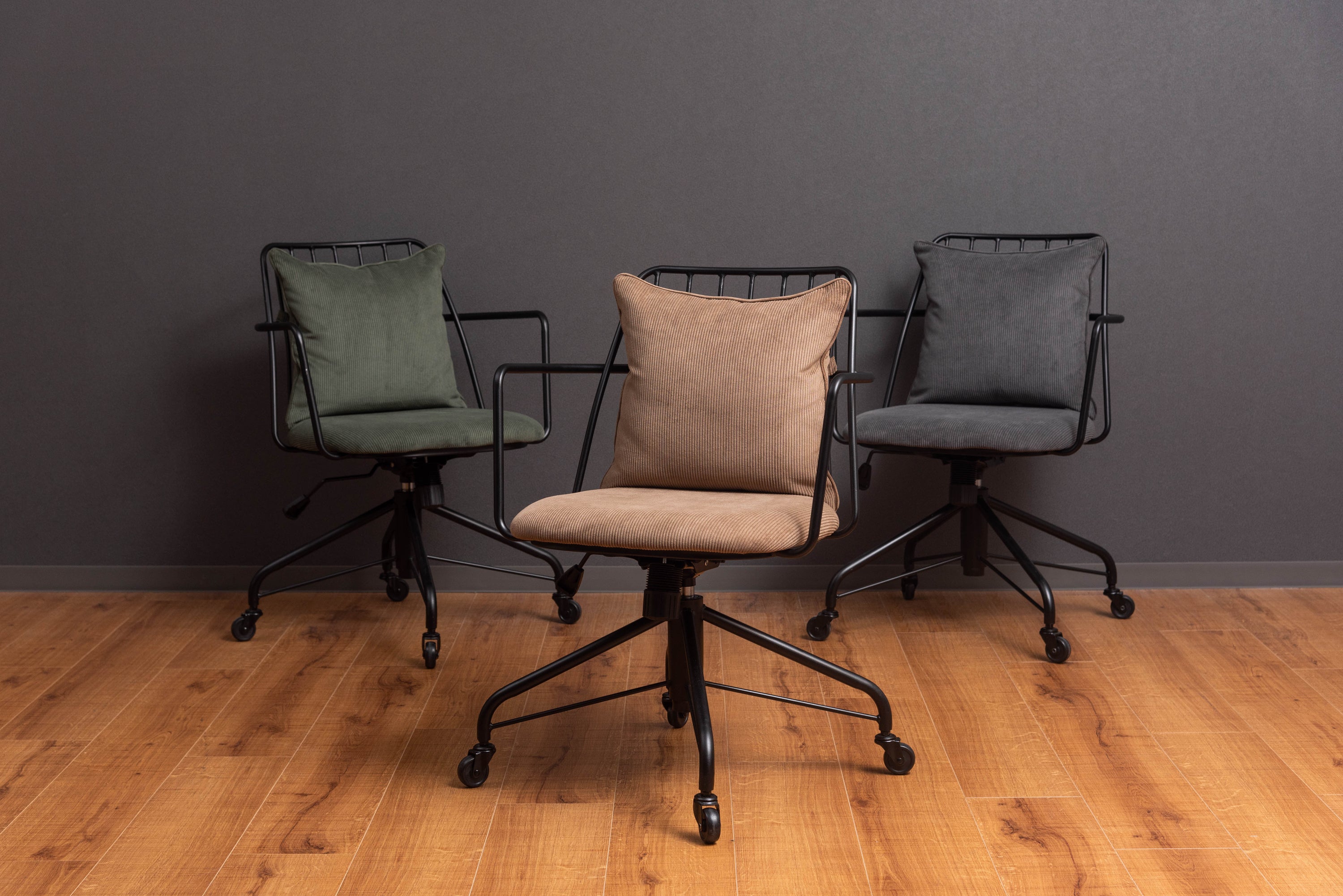 インテリア性の高いコーデュロイ生地を使用した、ヴィンテージテイストのデスクチェア。フレームには強度のあるシャープな印象のスチールを使用。座面の高さは47~54cmまで高さ調整が可能な昇降式。シリンダーを使用しているので、手元のレバーを操作するだけの簡単仕様。キャスター付きなので移動もらくらく。機能性と共にデザイン性も兼ね備えたデスクチェアなので、書斎はもちろんリビング・ダイニングルームでも使えるデザイン。ロッキング機能が付いているので、座面の前後の動きを時々の使用状況に合わせてロック・フリーどちらにも使い分けることができます。座面下にはロッキングの強さを調整できるダイヤル付き。