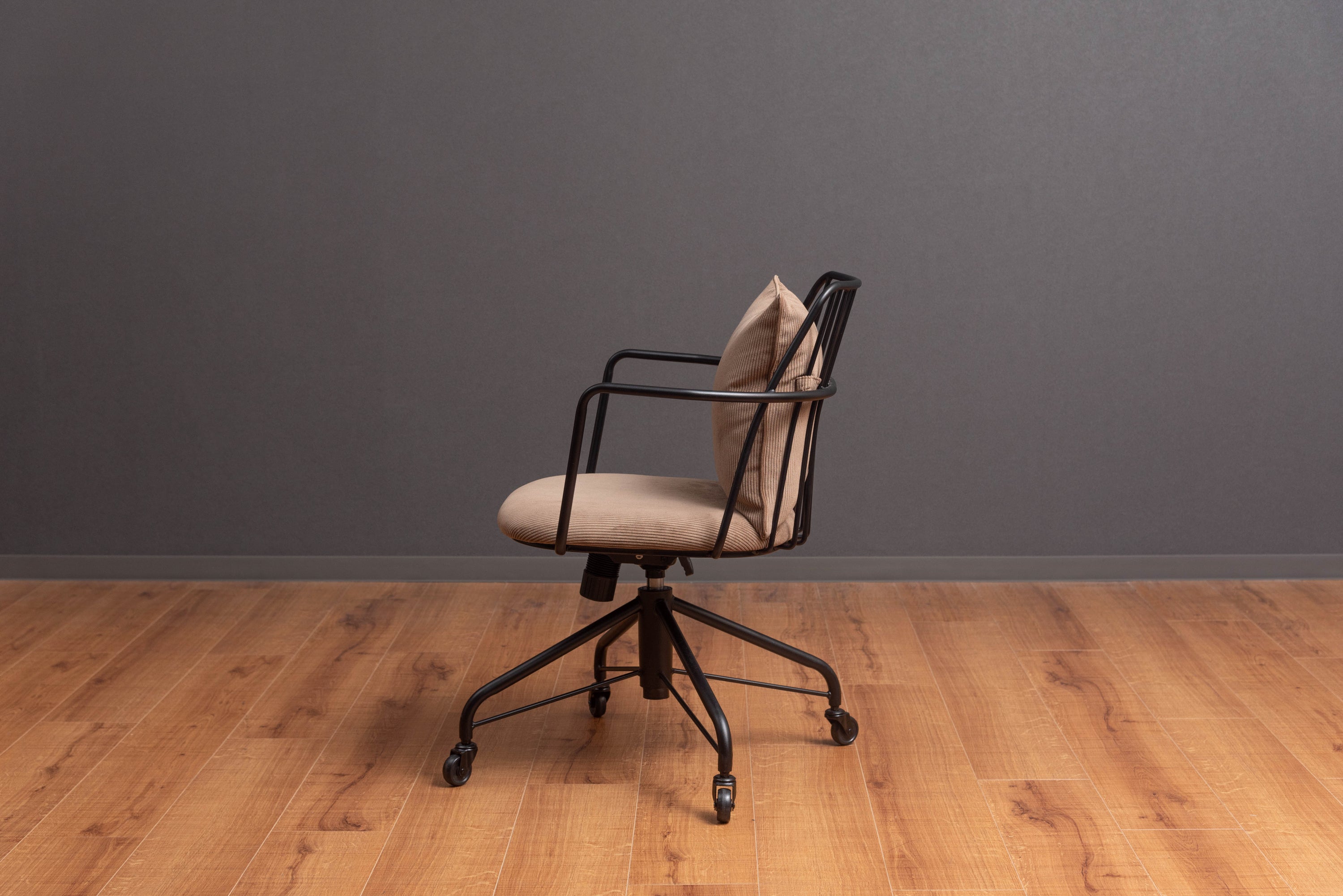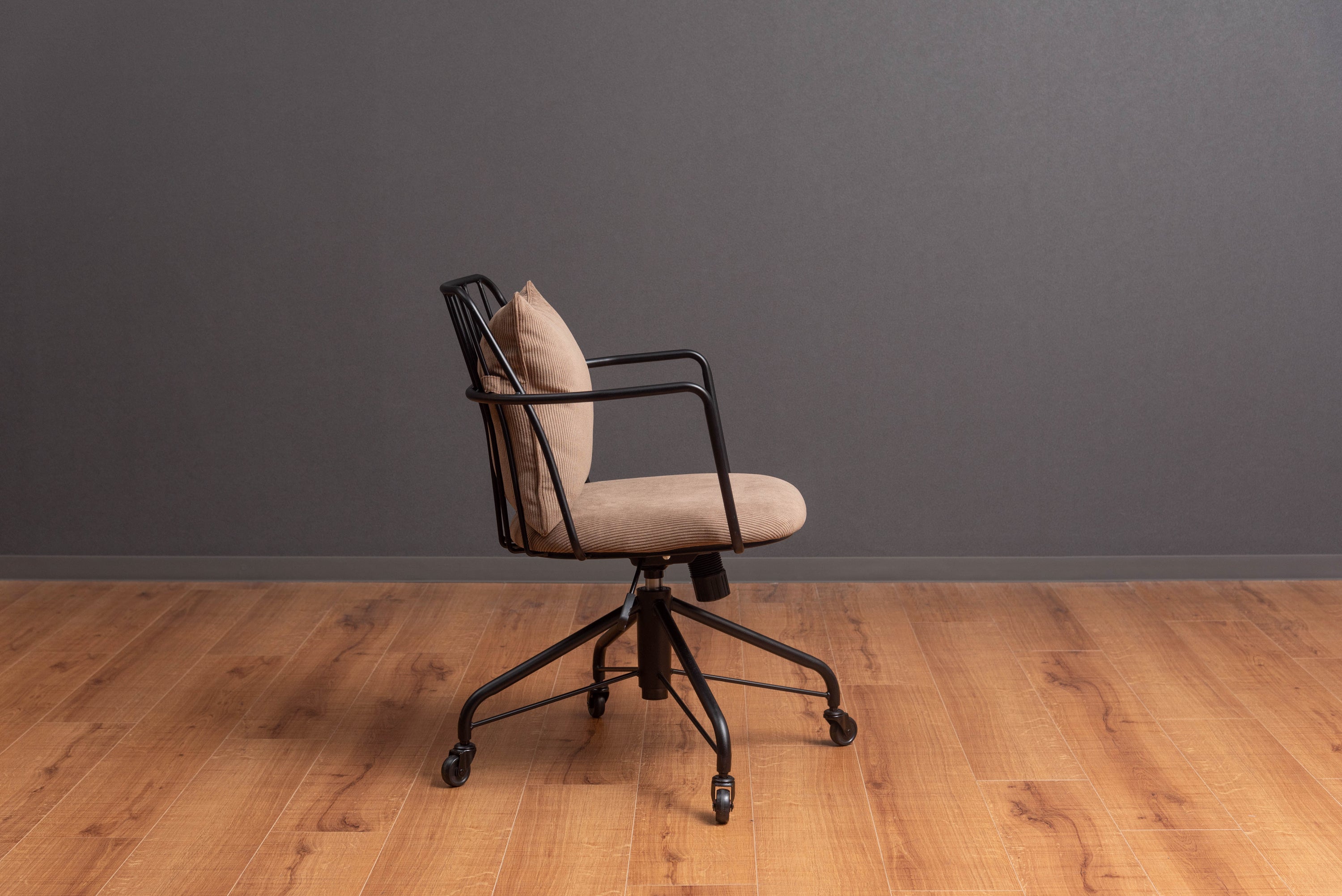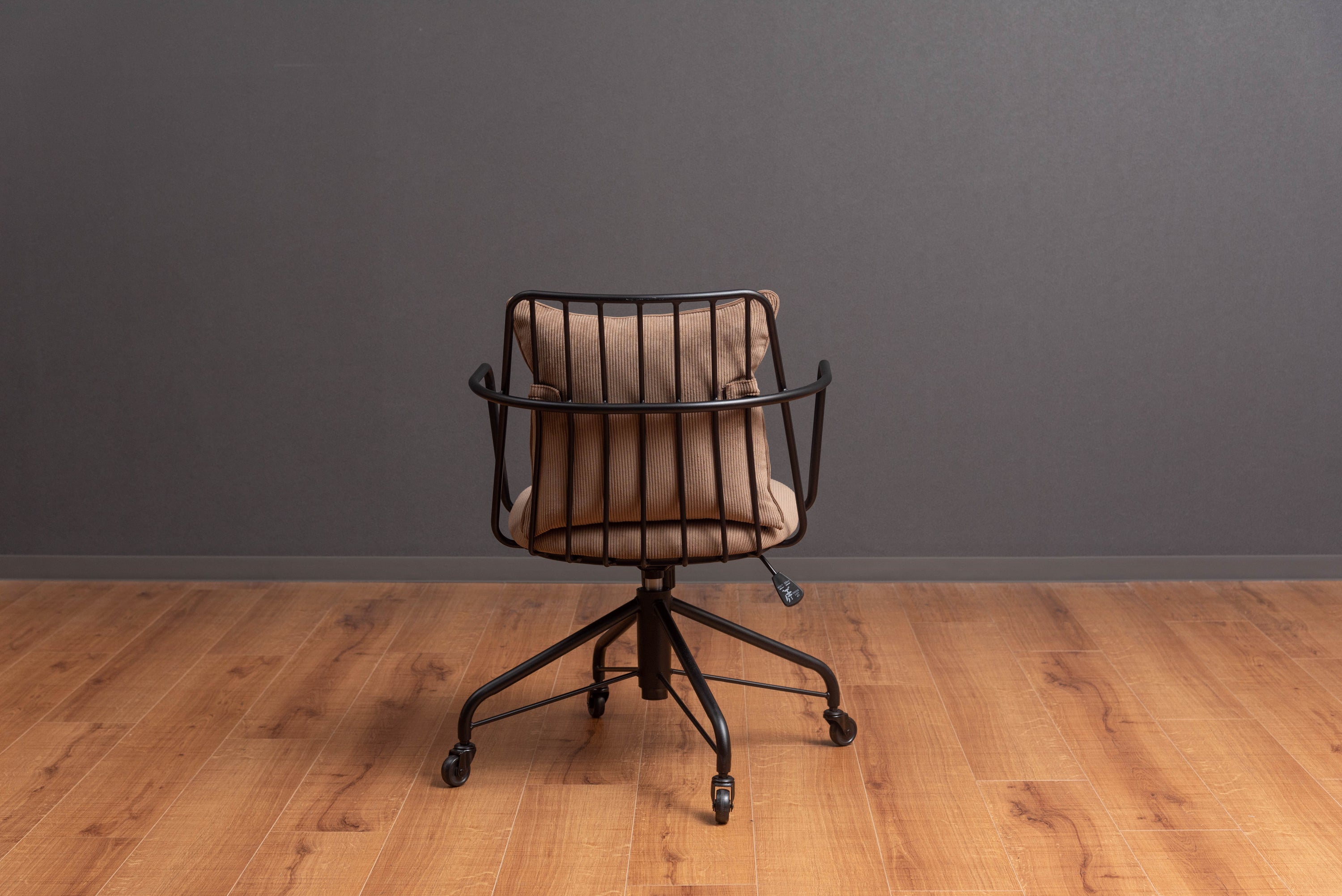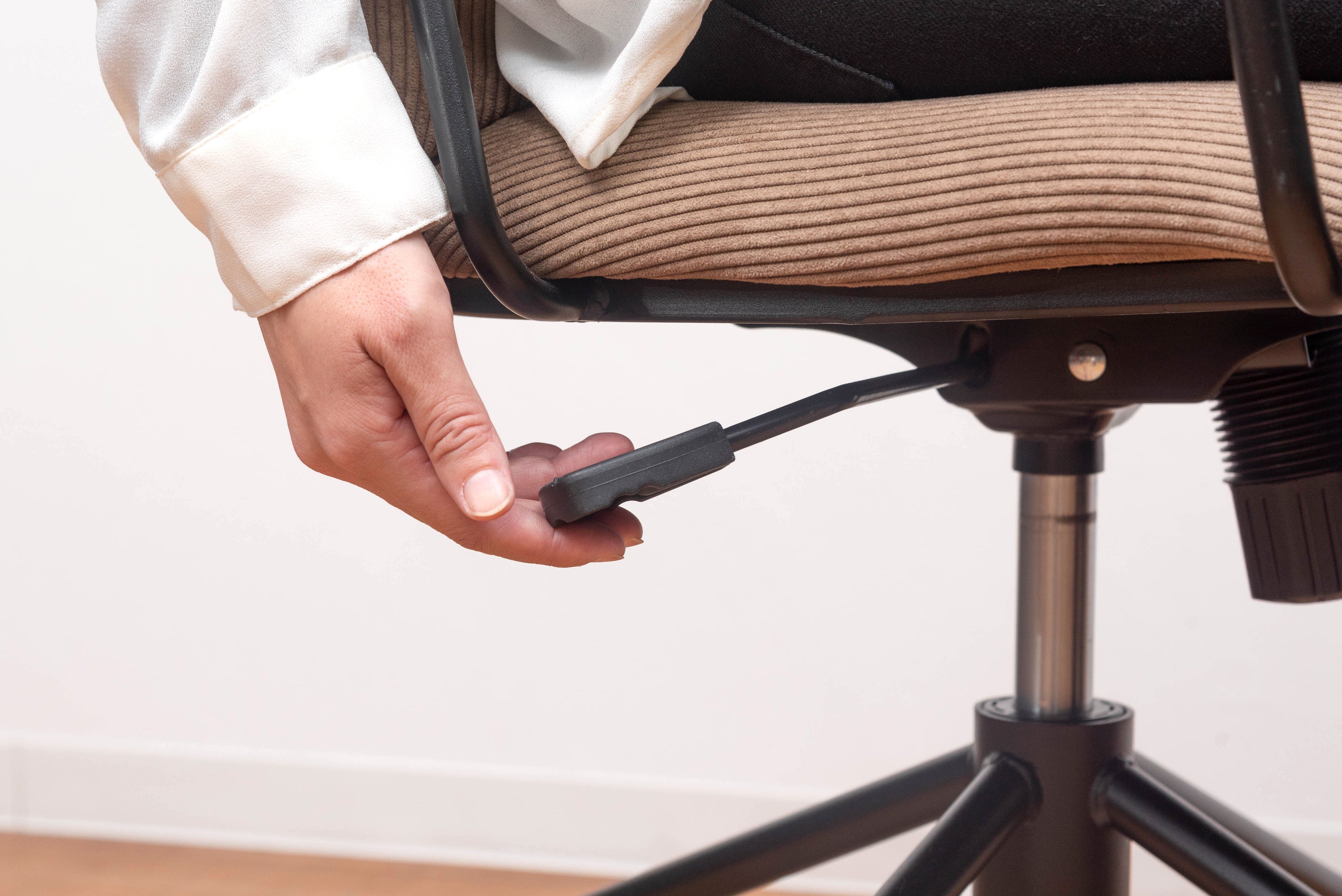 インテリア性の高いコーデュロイ生地を使用した、ヴィンテージテイストのデスクチェア。フレームには強度のあるシャープな印象のスチールを使用。座面の高さは47~54cmまで高さ調整が可能な昇降式。シリンダーを使用しているので、手元のレバーを操作するだけの簡単仕様。キャスター付きなので移動もらくらく。機能性と共にデザイン性も兼ね備えたデスクチェアなので、書斎はもちろんリビング・ダイニングルームでも使えるデザイン。ロッキング機能が付いているので、座面の前後の動きを時々の使用状況に合わせてロック・フリーどちらにも使い分けることができます。座面下にはロッキングの強さを調整できるダイヤル付き。