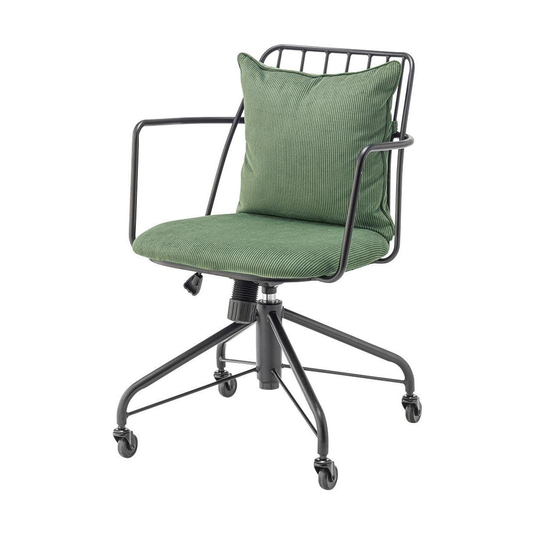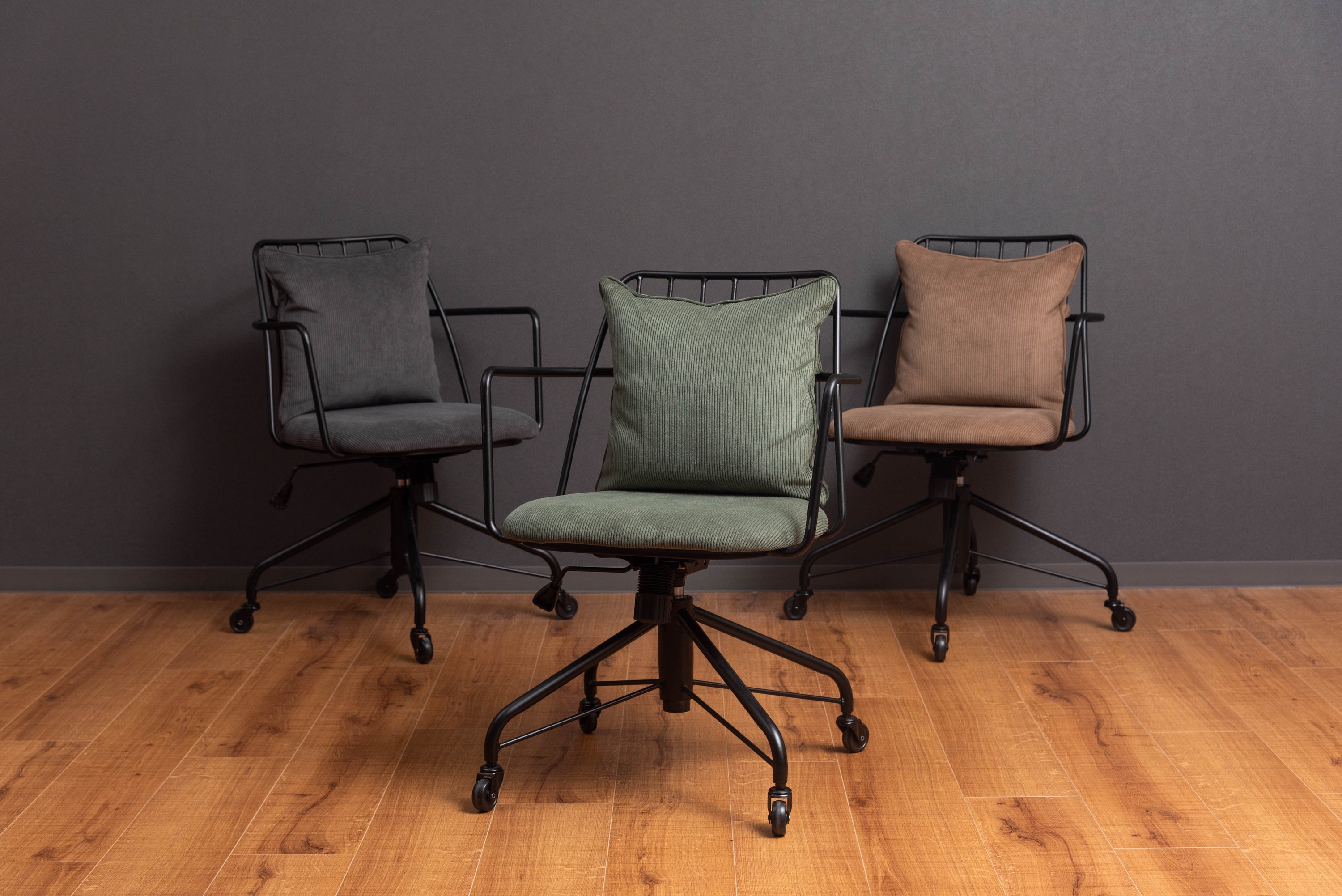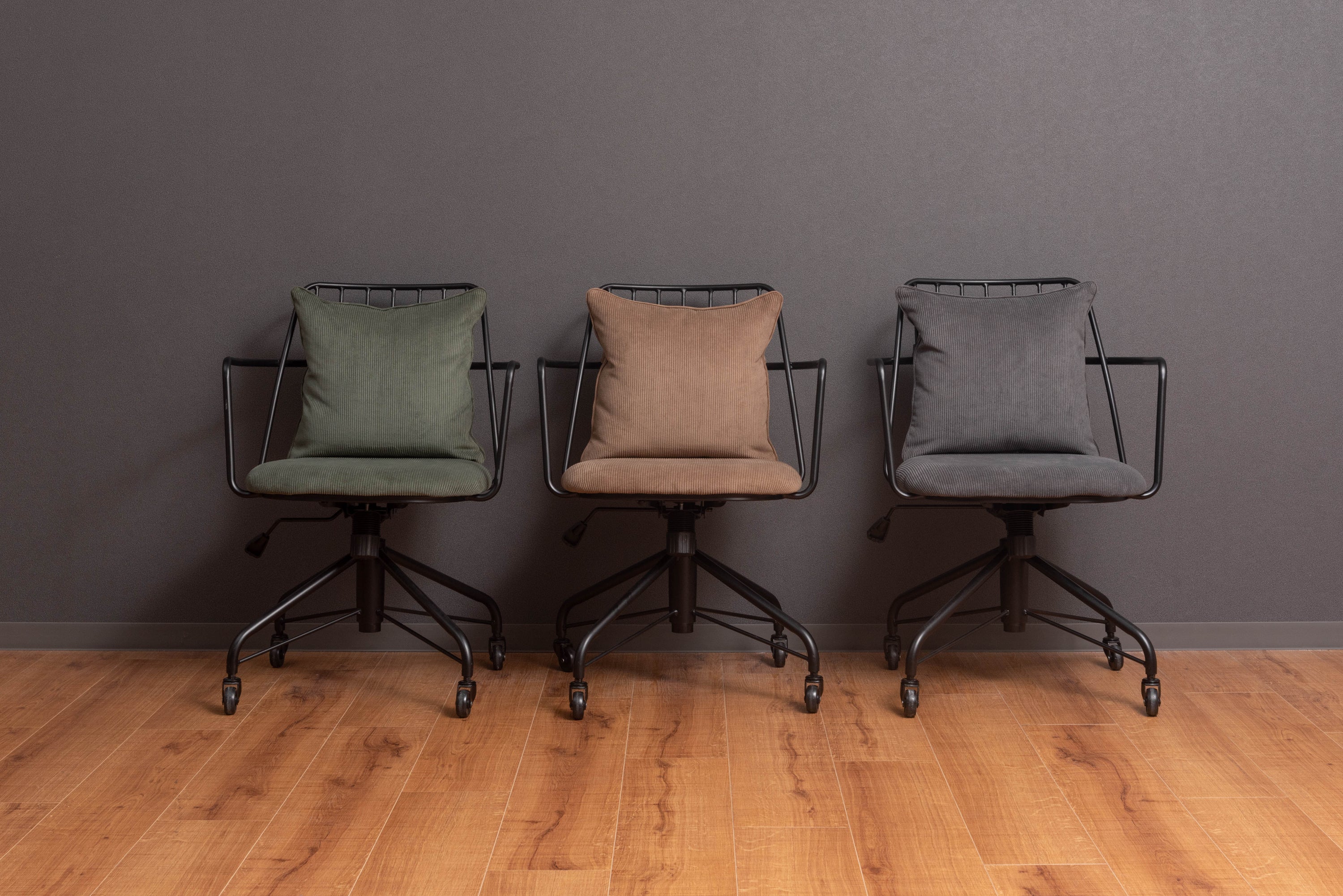 インテリア性の高いコーデュロイ生地を使用した、ヴィンテージテイストのデスクチェア。フレームには強度のあるシャープな印象のスチールを使用。座面の高さは47~54cmまで高さ調整が可能な昇降式。シリンダーを使用しているので、手元のレバーを操作するだけの簡単仕様。キャスター付きなので移動もらくらく。機能性と共にデザイン性も兼ね備えたデスクチェアなので、書斎はもちろんリビング・ダイニングルームでも使えるデザイン。ロッキング機能が付いているので、座面の前後の動きを時々の使用状況に合わせてロック・フリーどちらにも使い分けることができます。座面下にはロッキングの強さを調整できるダイヤル付き。