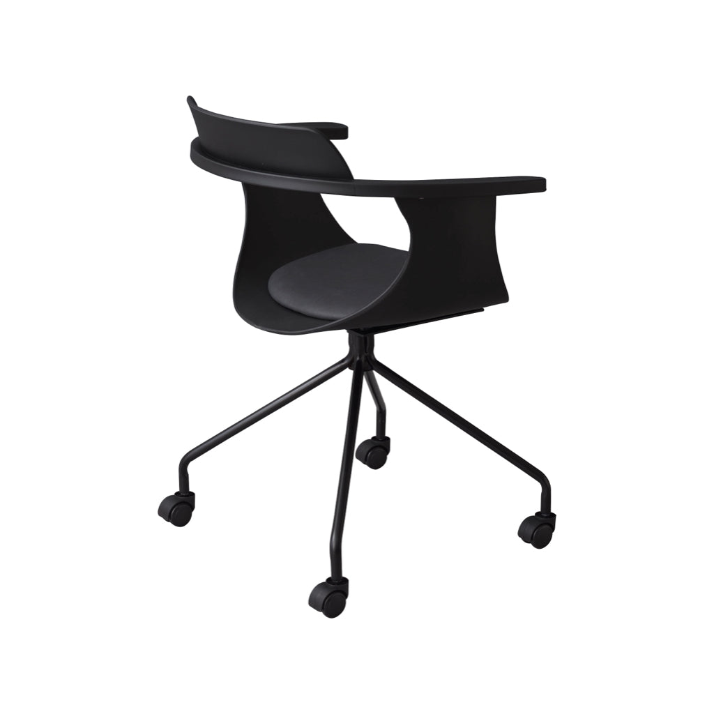 ROOMESSENCEのデスクチェアブラックです。長時間でも快適な座り心地を備え、ダイニングやワークスペースに活躍します。ブランドの美意識を感じる佇まいで、日常づかいから来客時まで幅広く対応。品番:PC-986BK。暮らしに上質なアクセントを添える一品です。